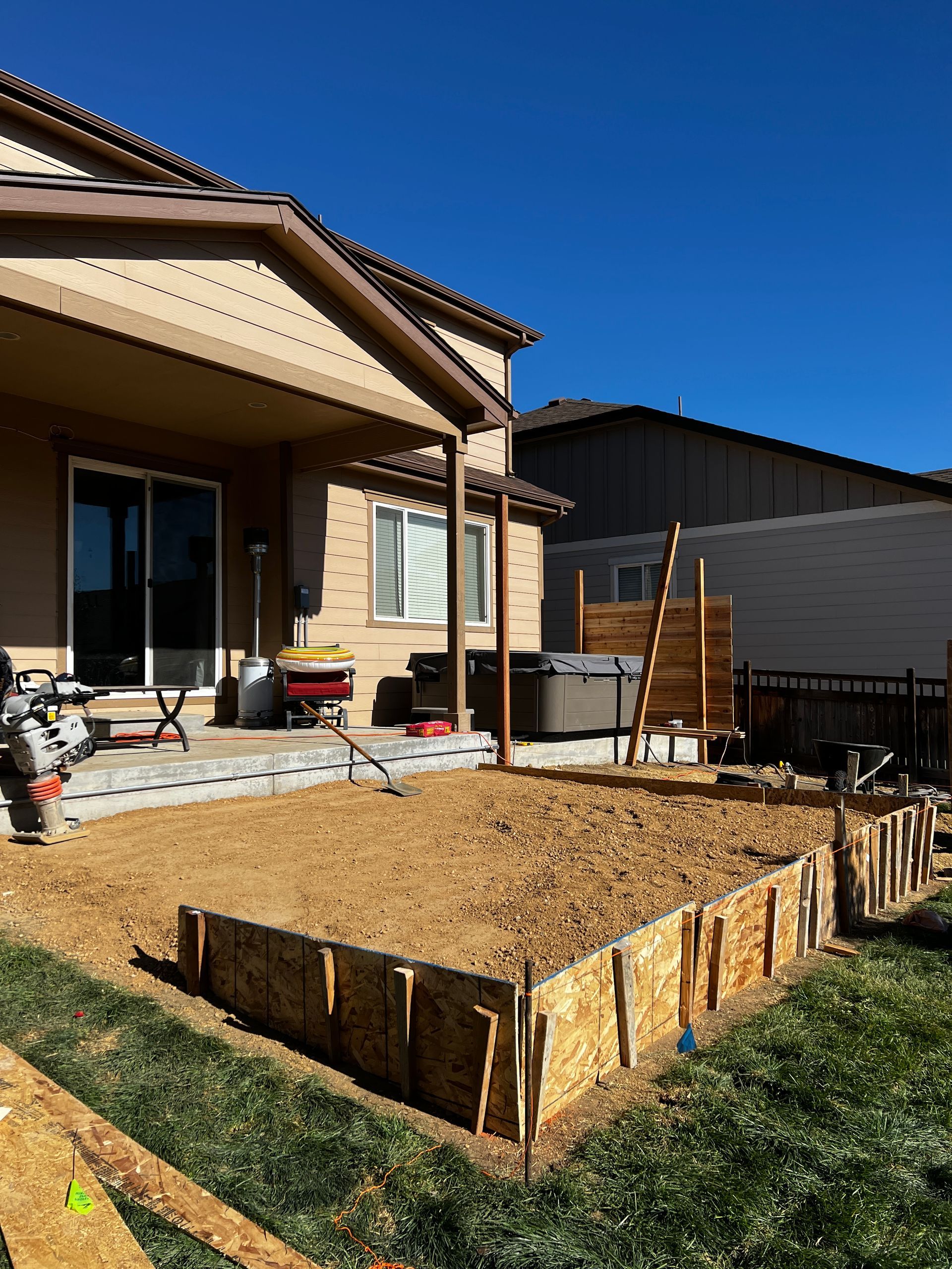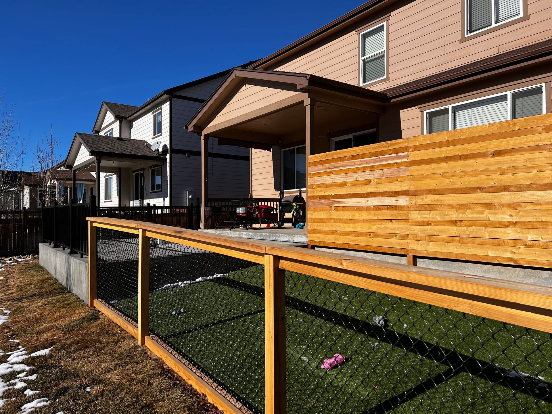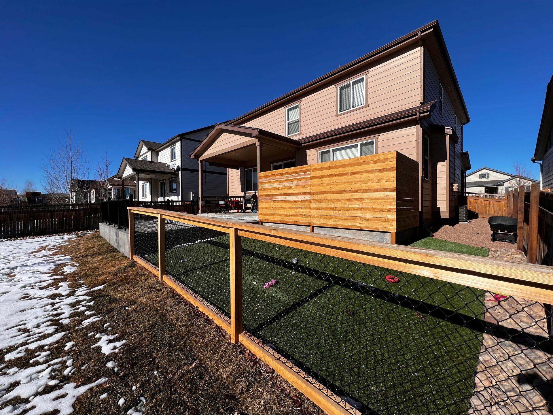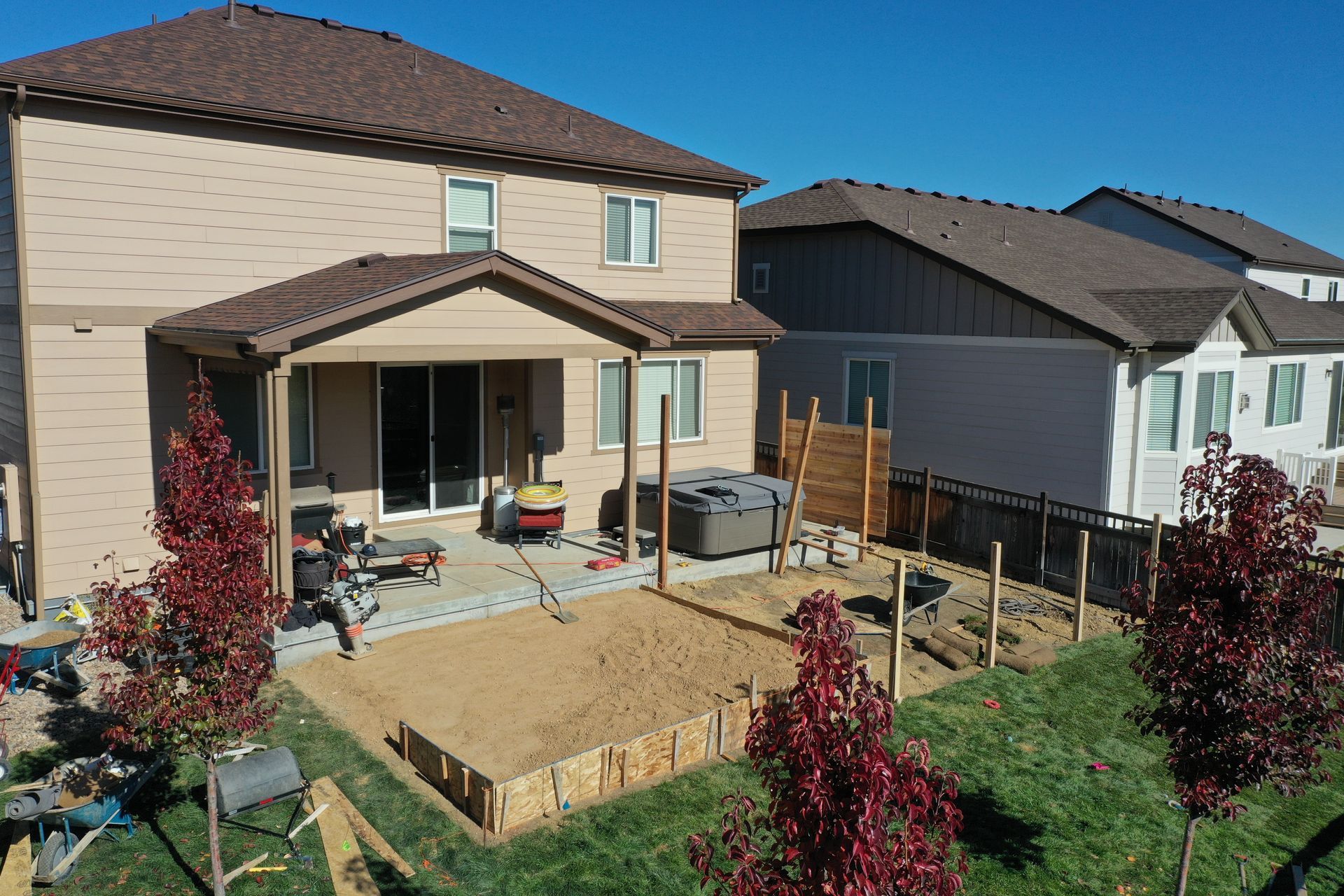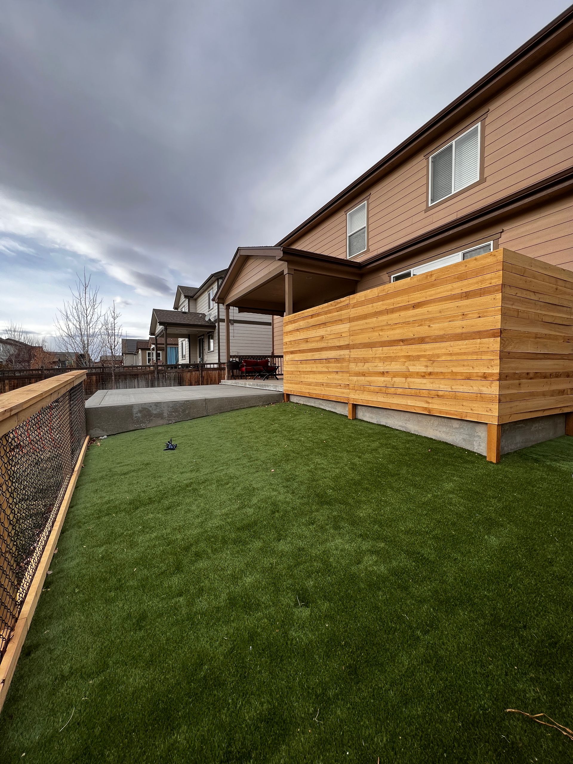 Remodel of back yard. New extension of concrete patio, privacy screen for their hot tub, artificial turf for dog run, new beautiful fence to enclose dog run. Erie, CO 2021