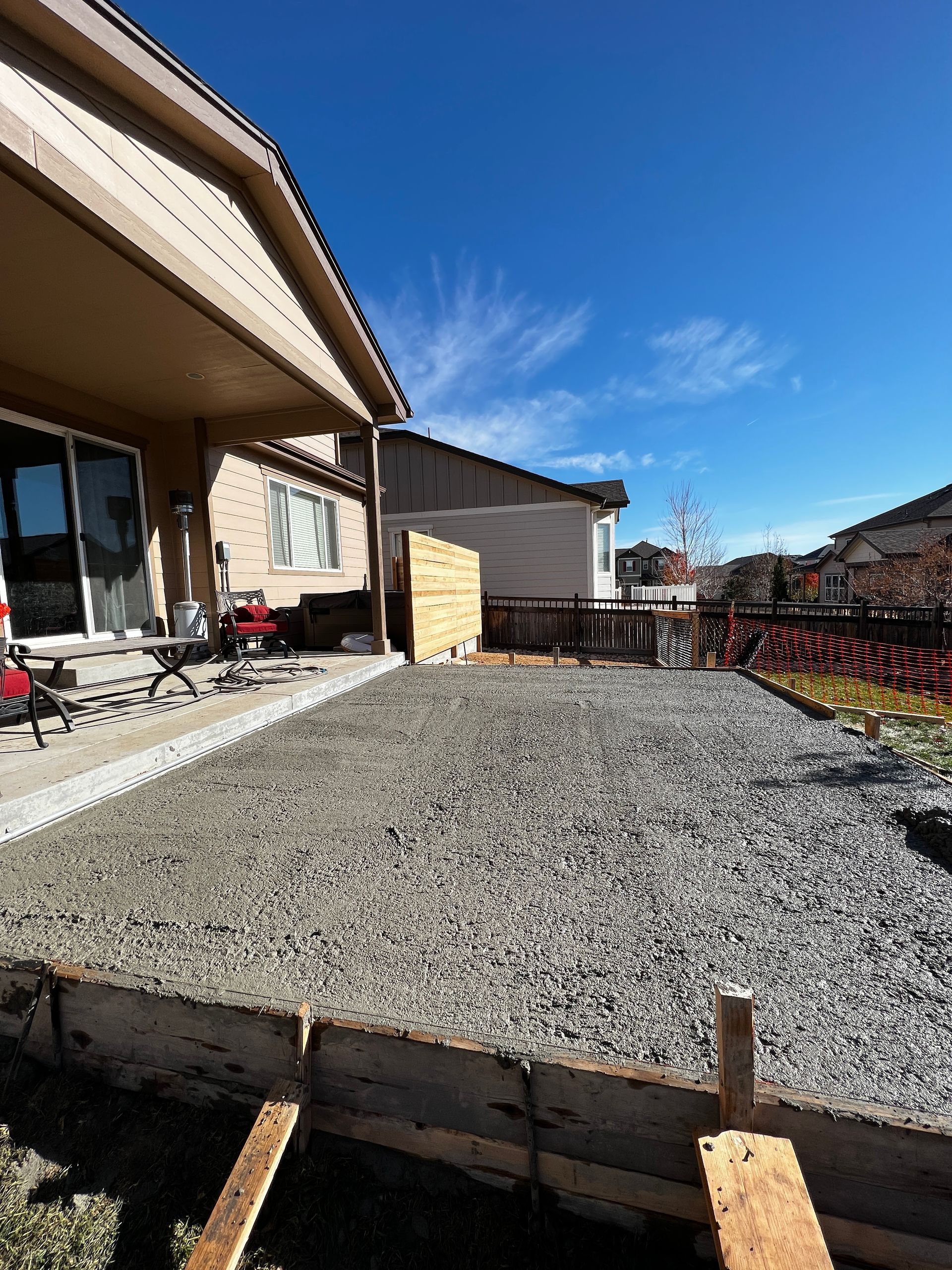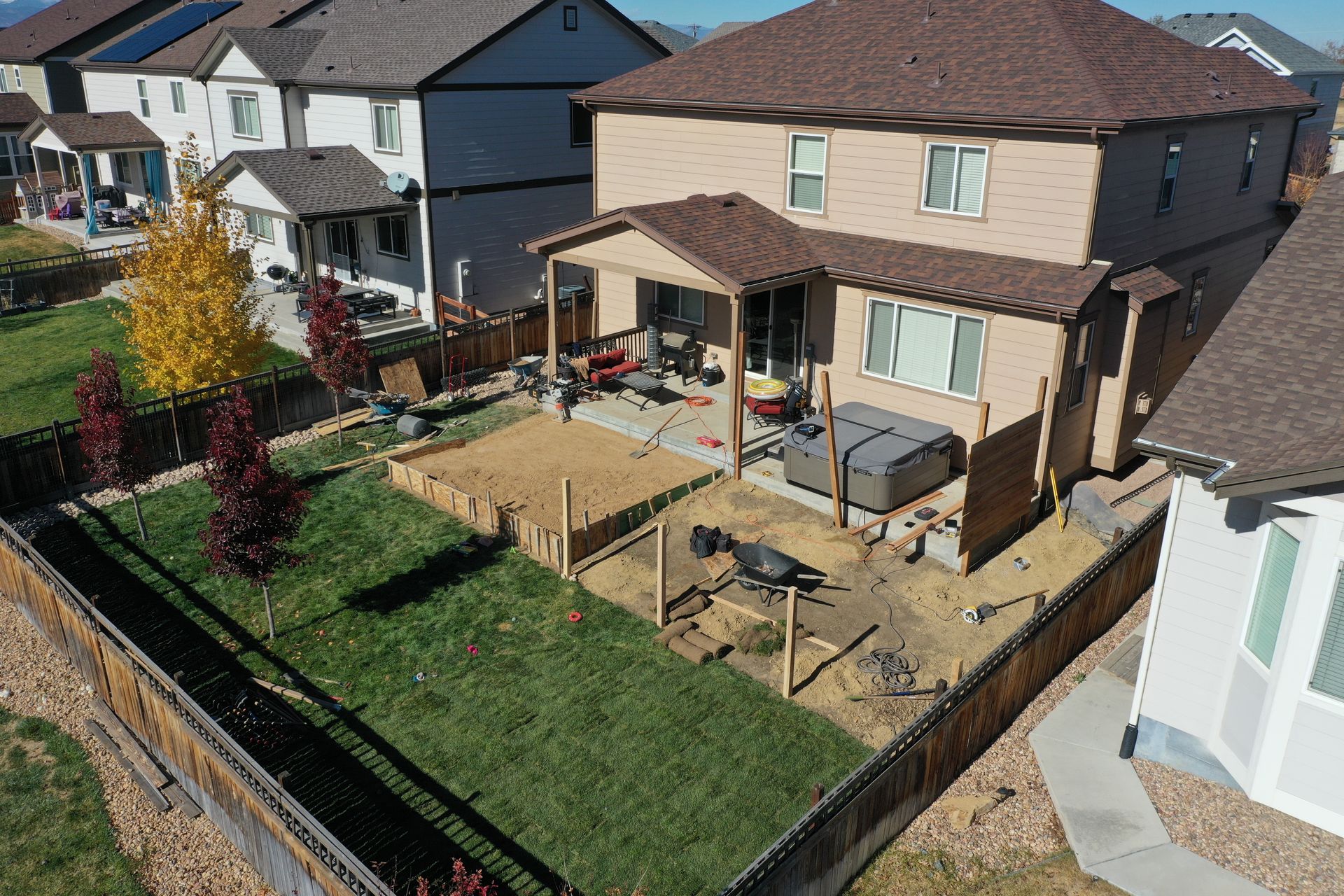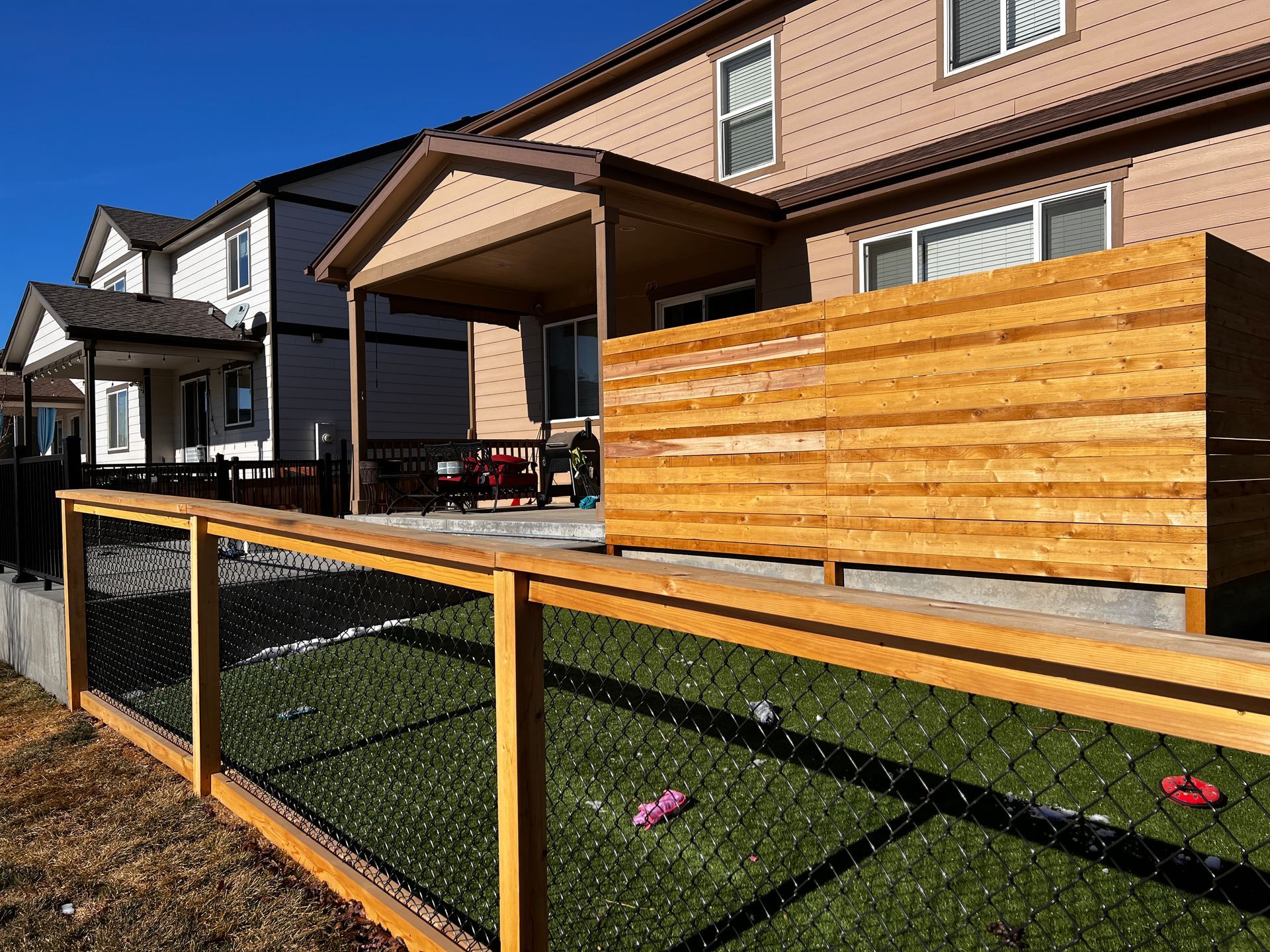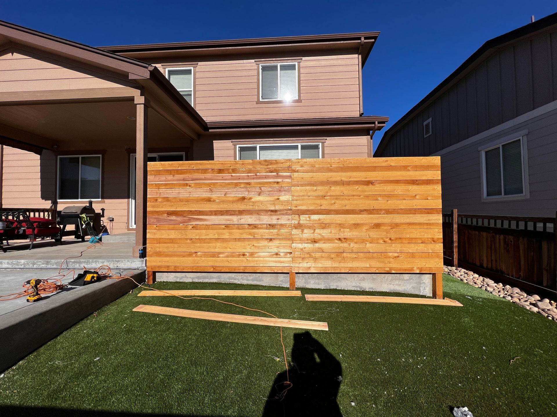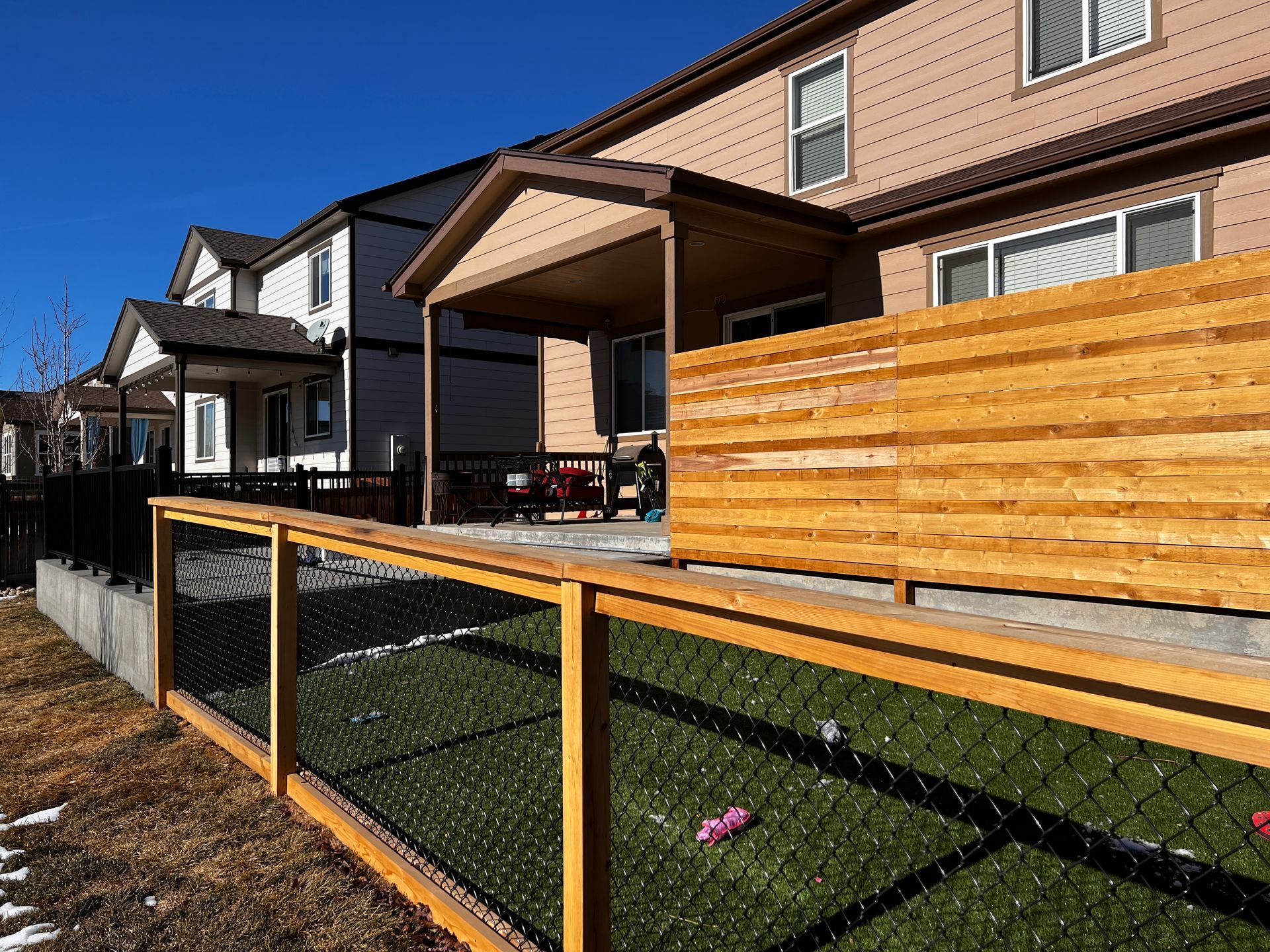 Remodel of back yard. New extension of concrete patio, privacy screen for their hot tub, artificial turf for dog run, new beautiful fence to enclose dog run. Erie, CO 2021