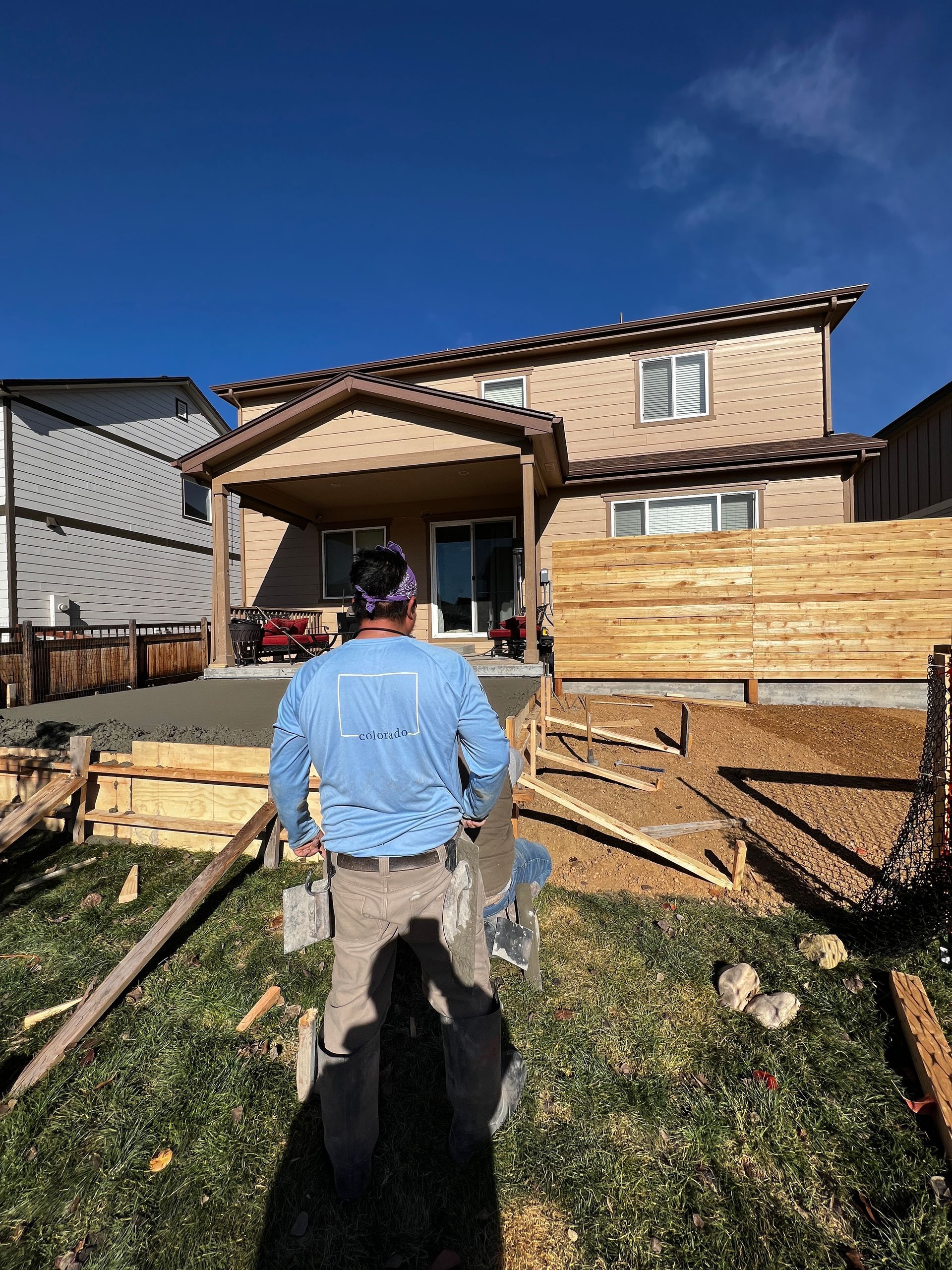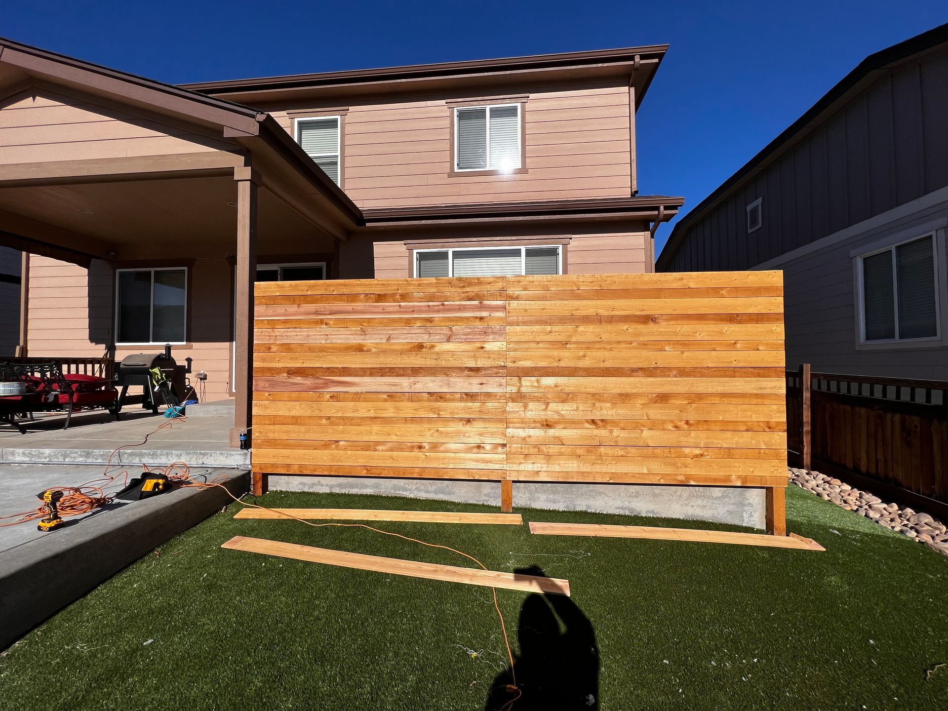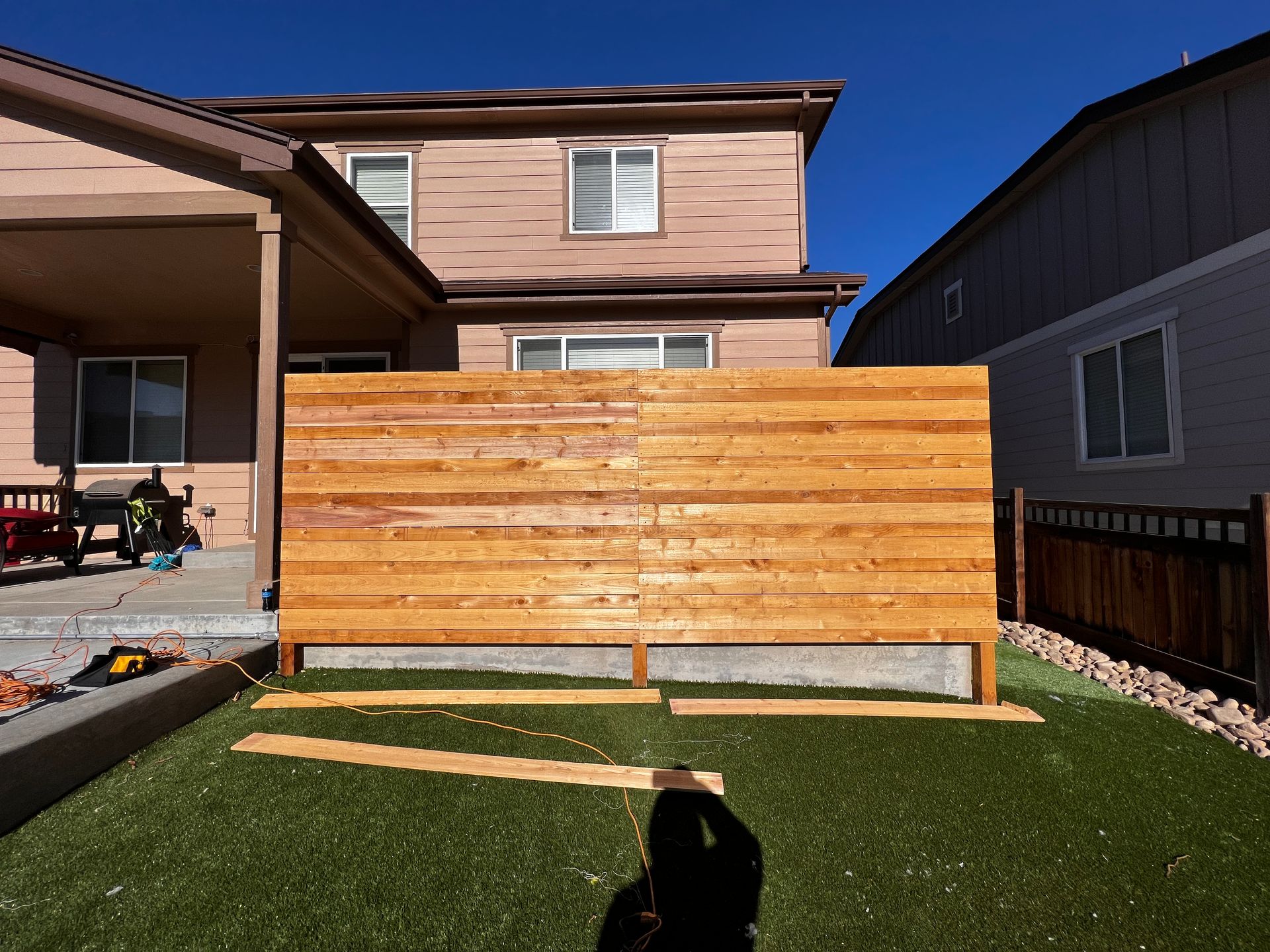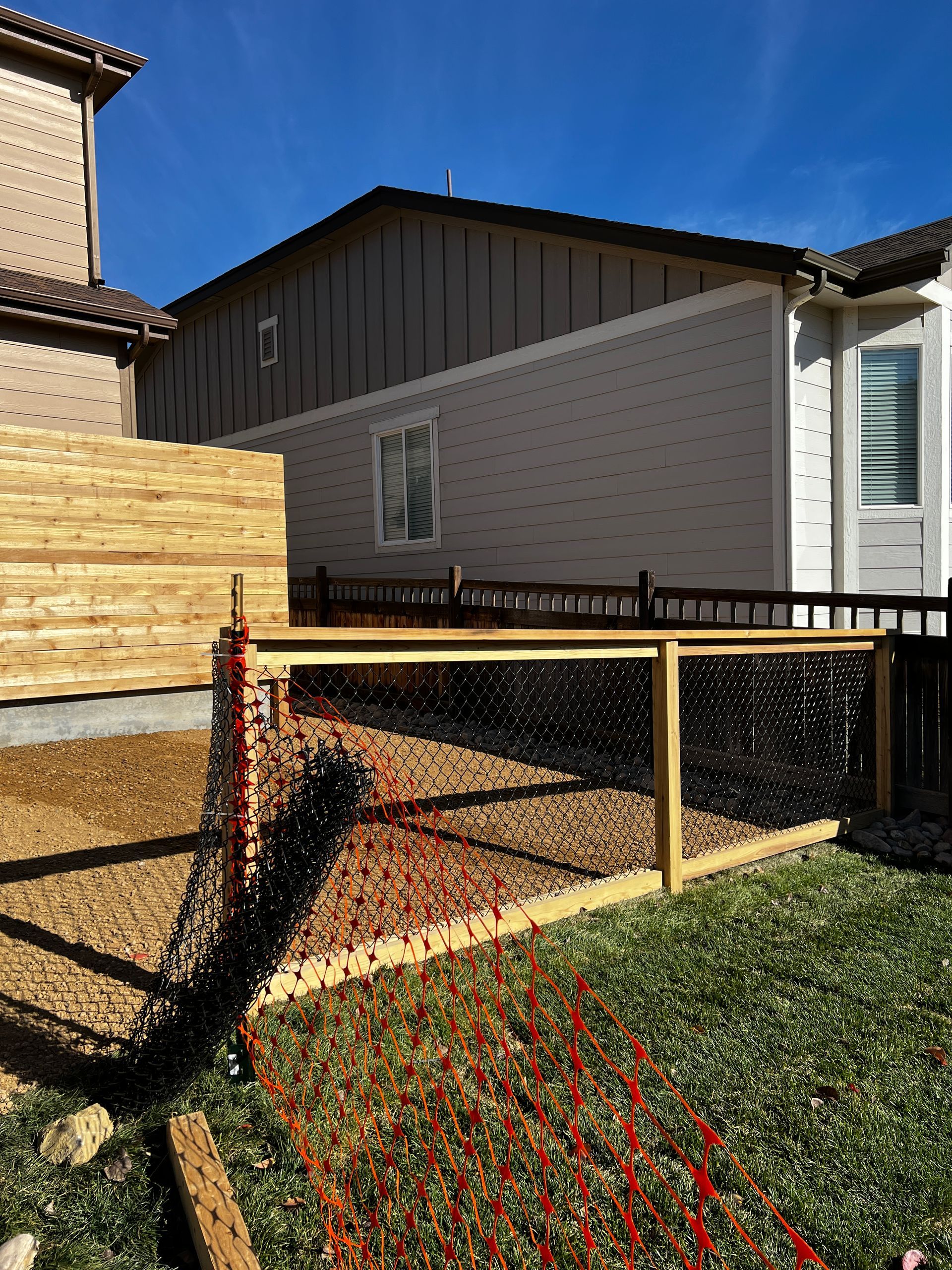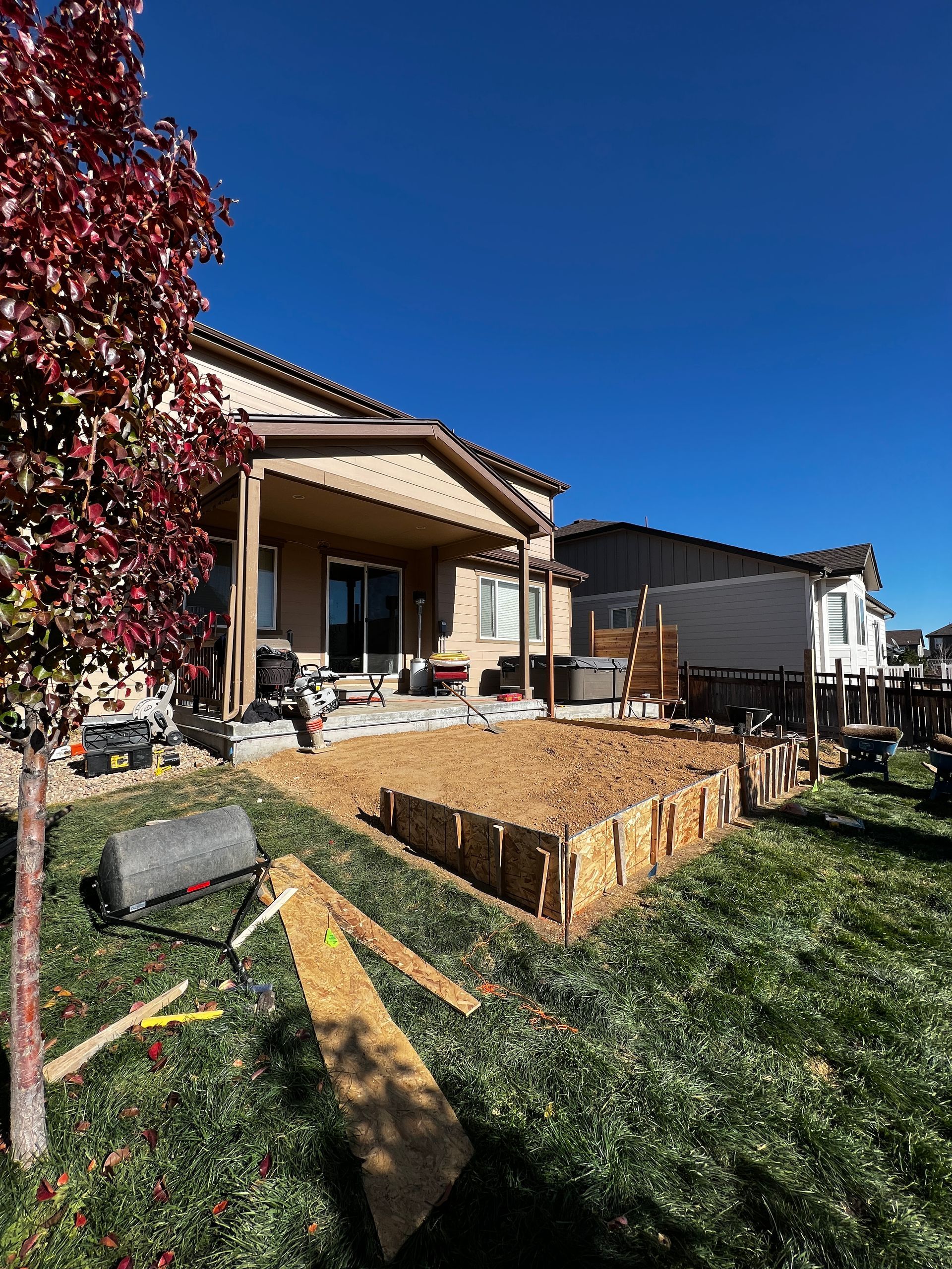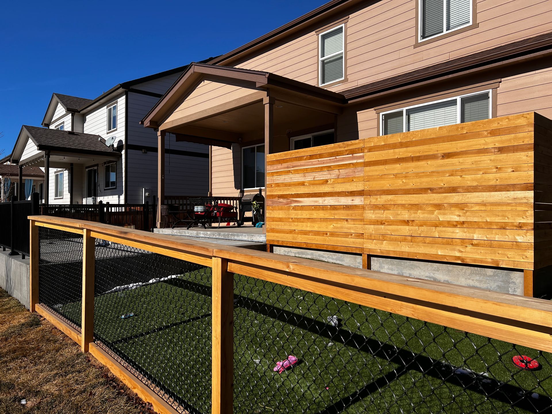 Remodel of back yard. New extension of concrete patio, privacy screen for their hot tub, artificial turf for dog run, new beautiful fence to enclose dog run. Erie, CO 2021