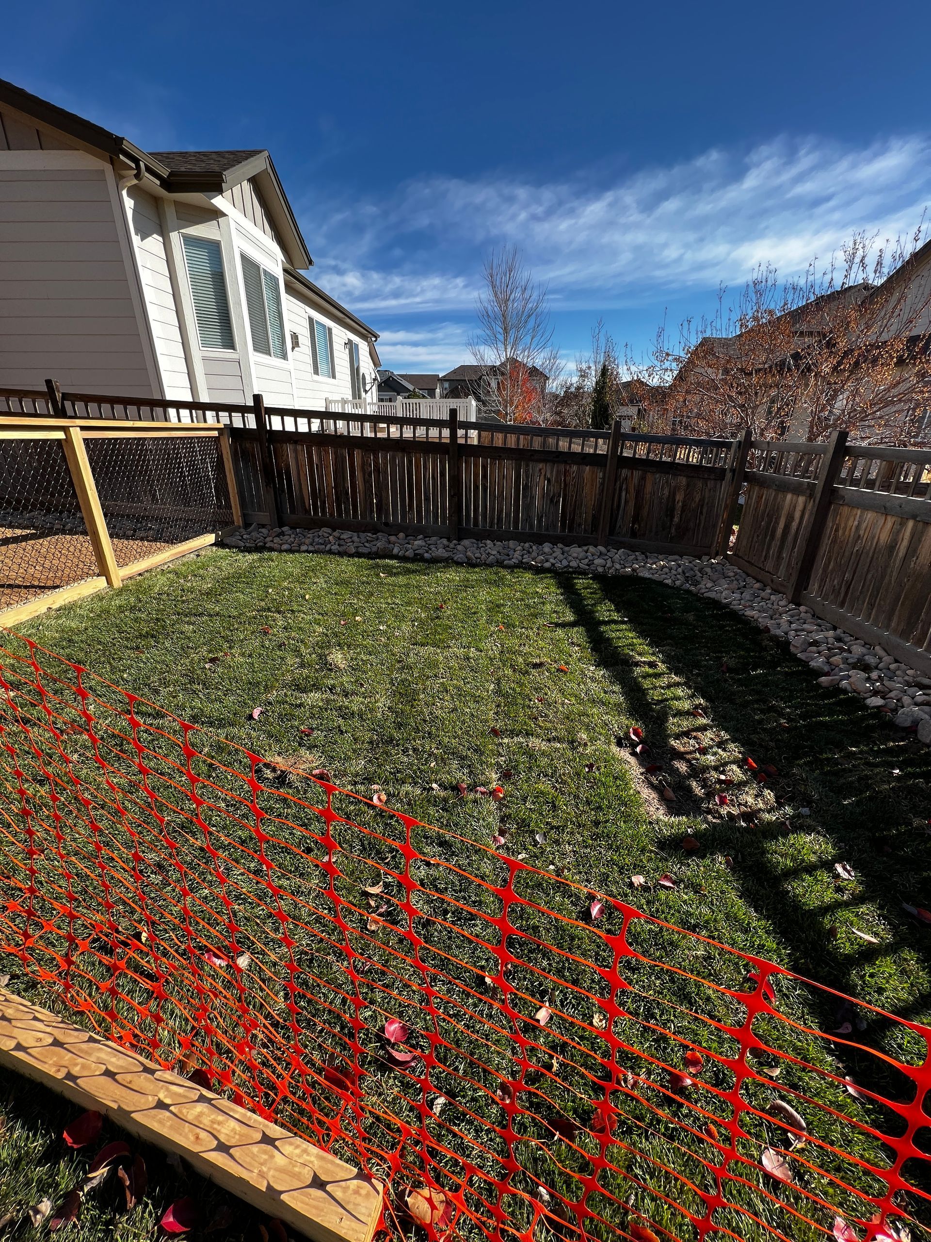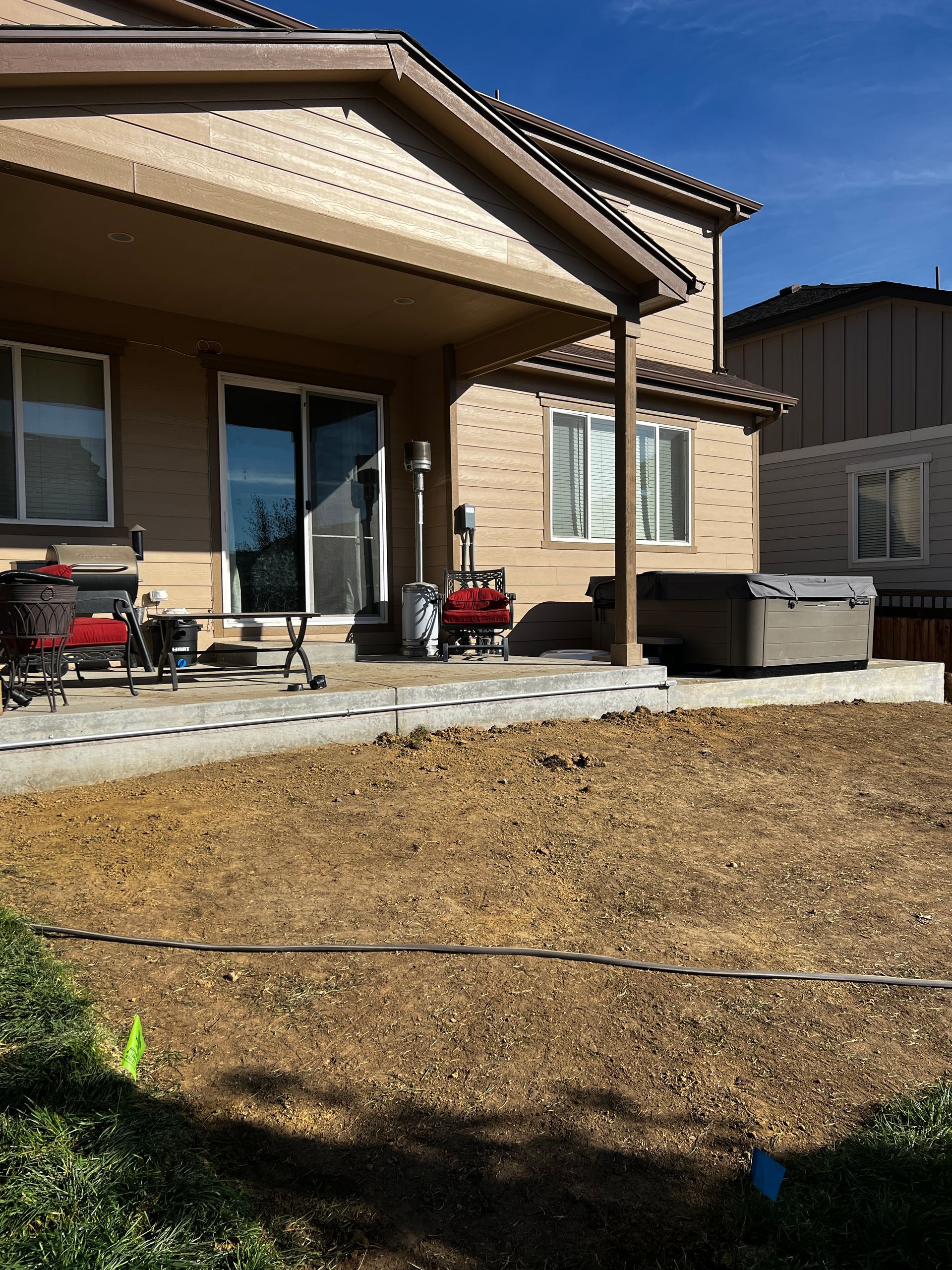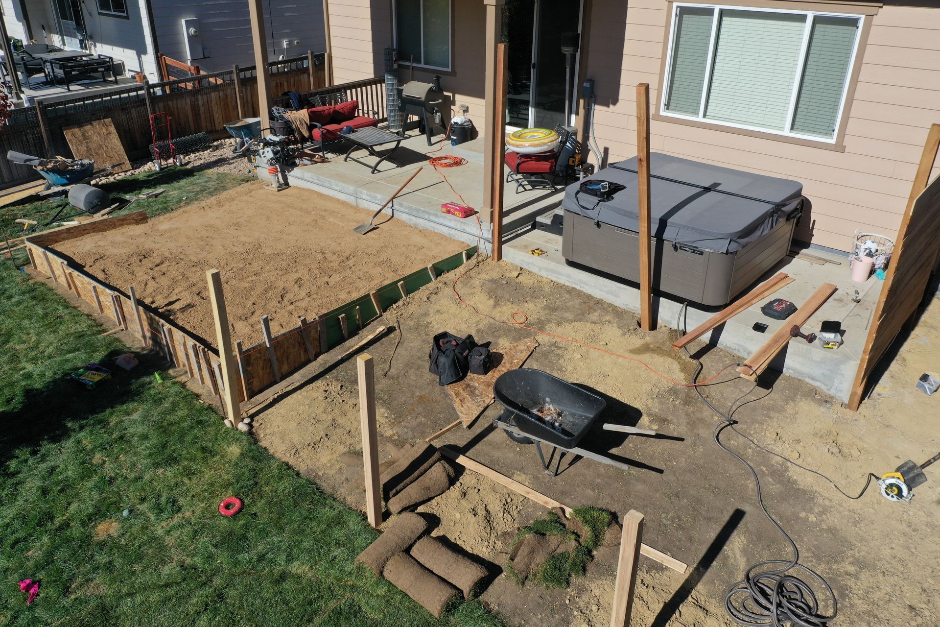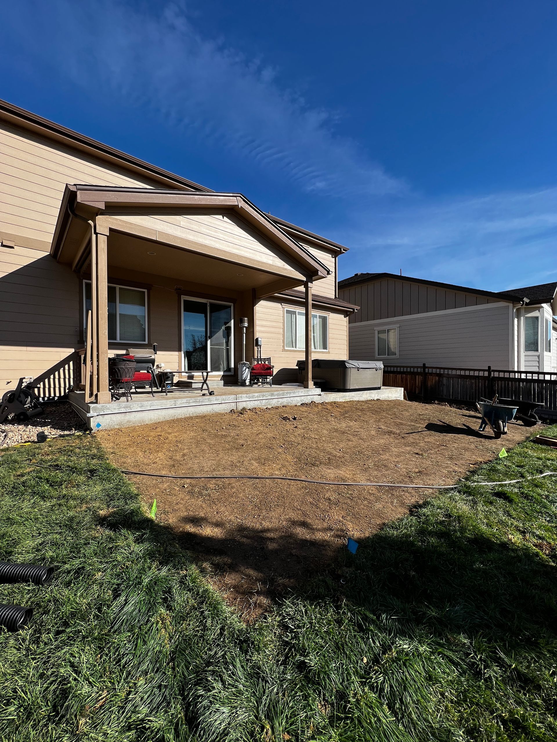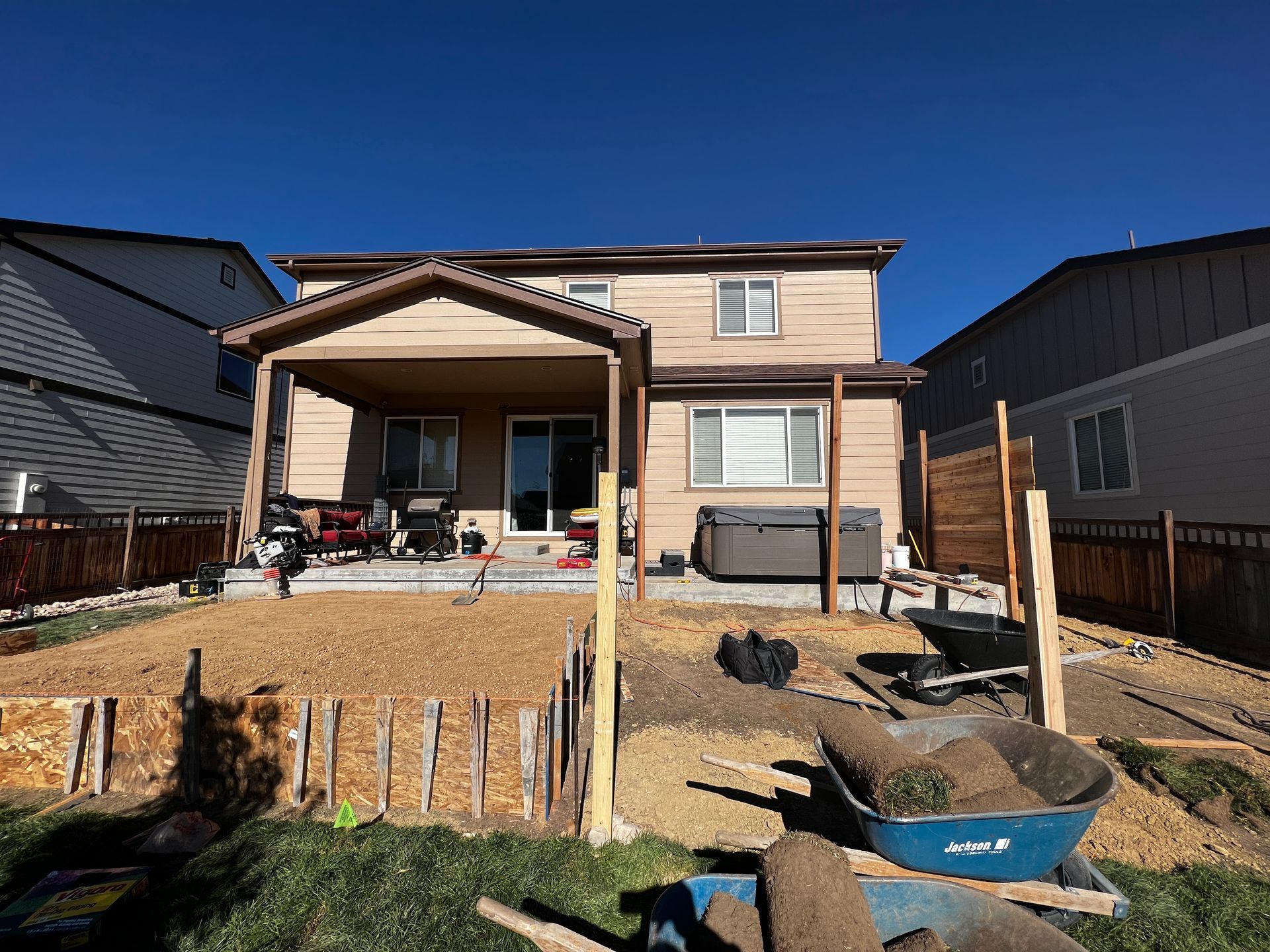 Remodel of back yard. New extension of concrete patio, privacy screen for their hot tub, artificial turf for dog run, new beautiful fence to enclose dog run. Erie, CO 2021