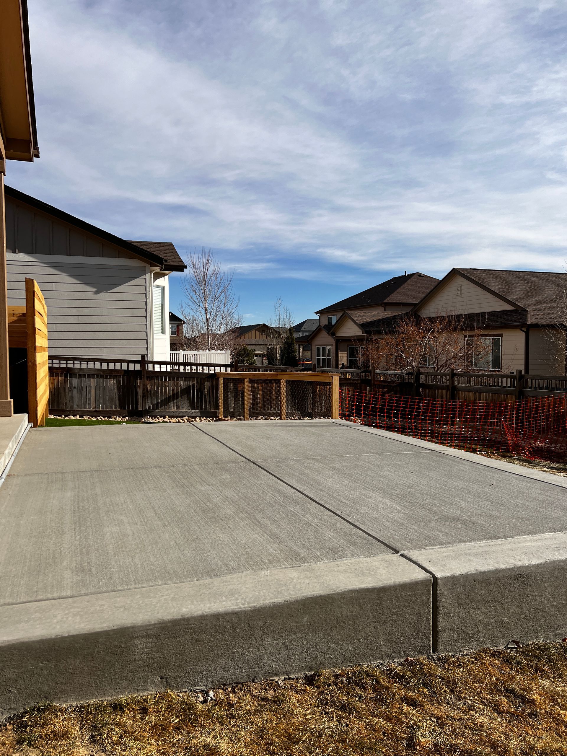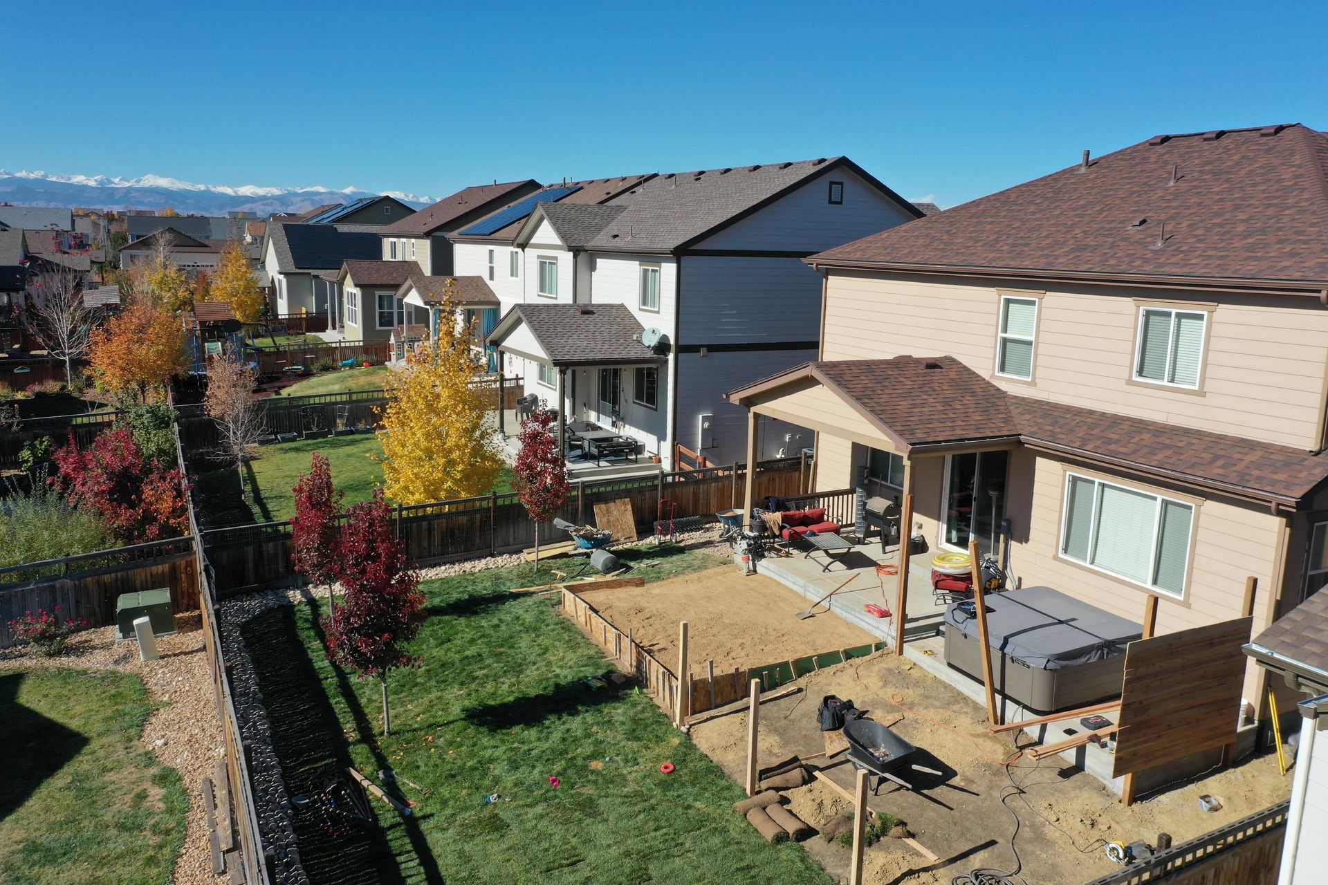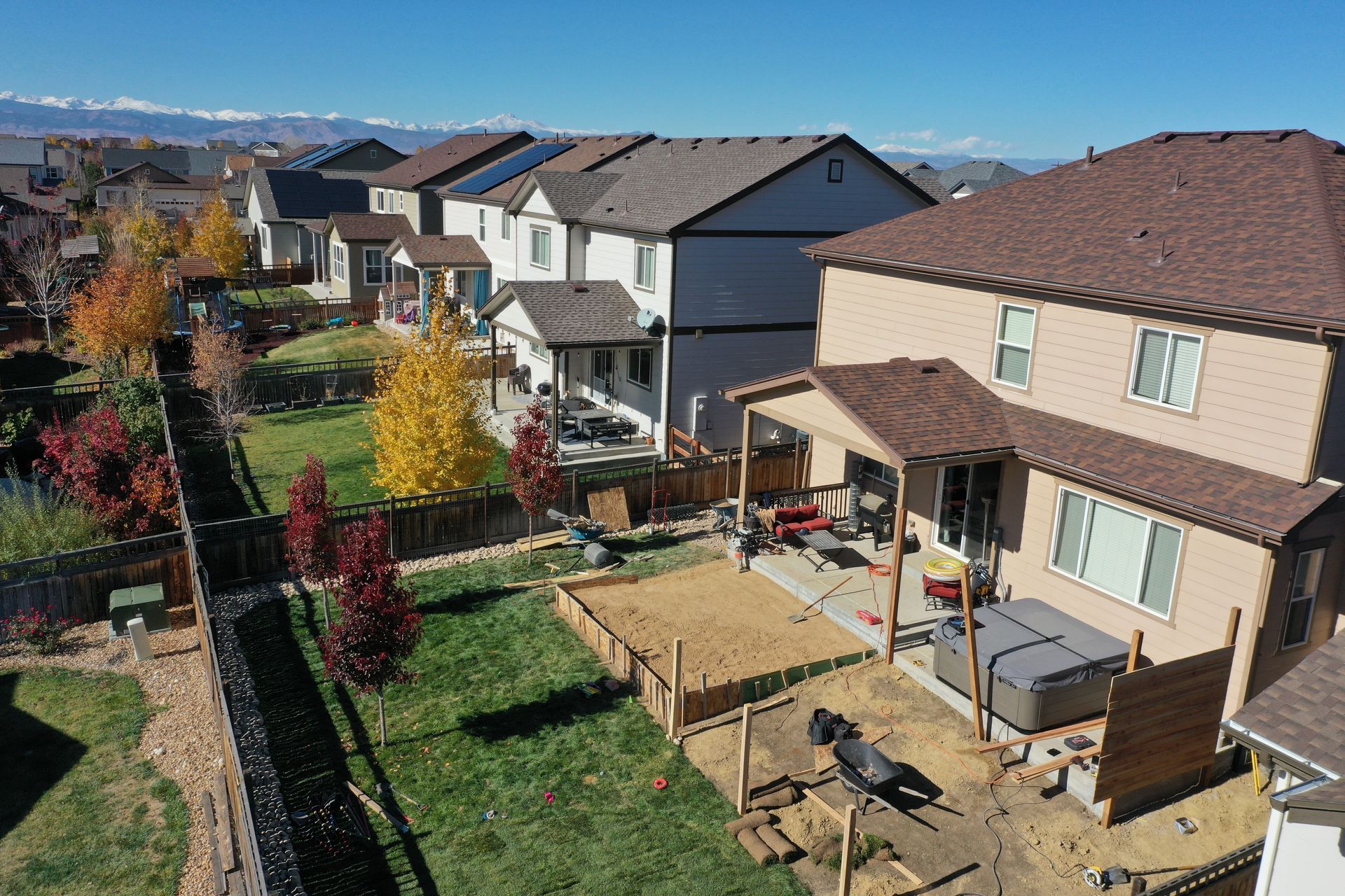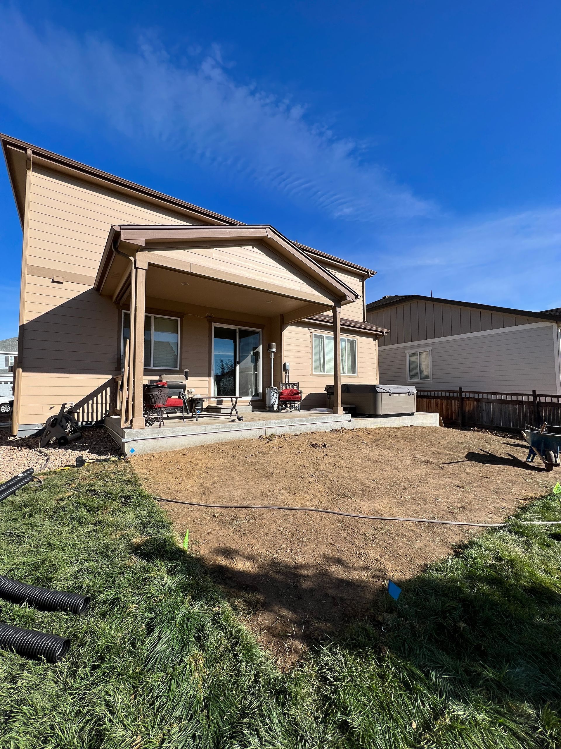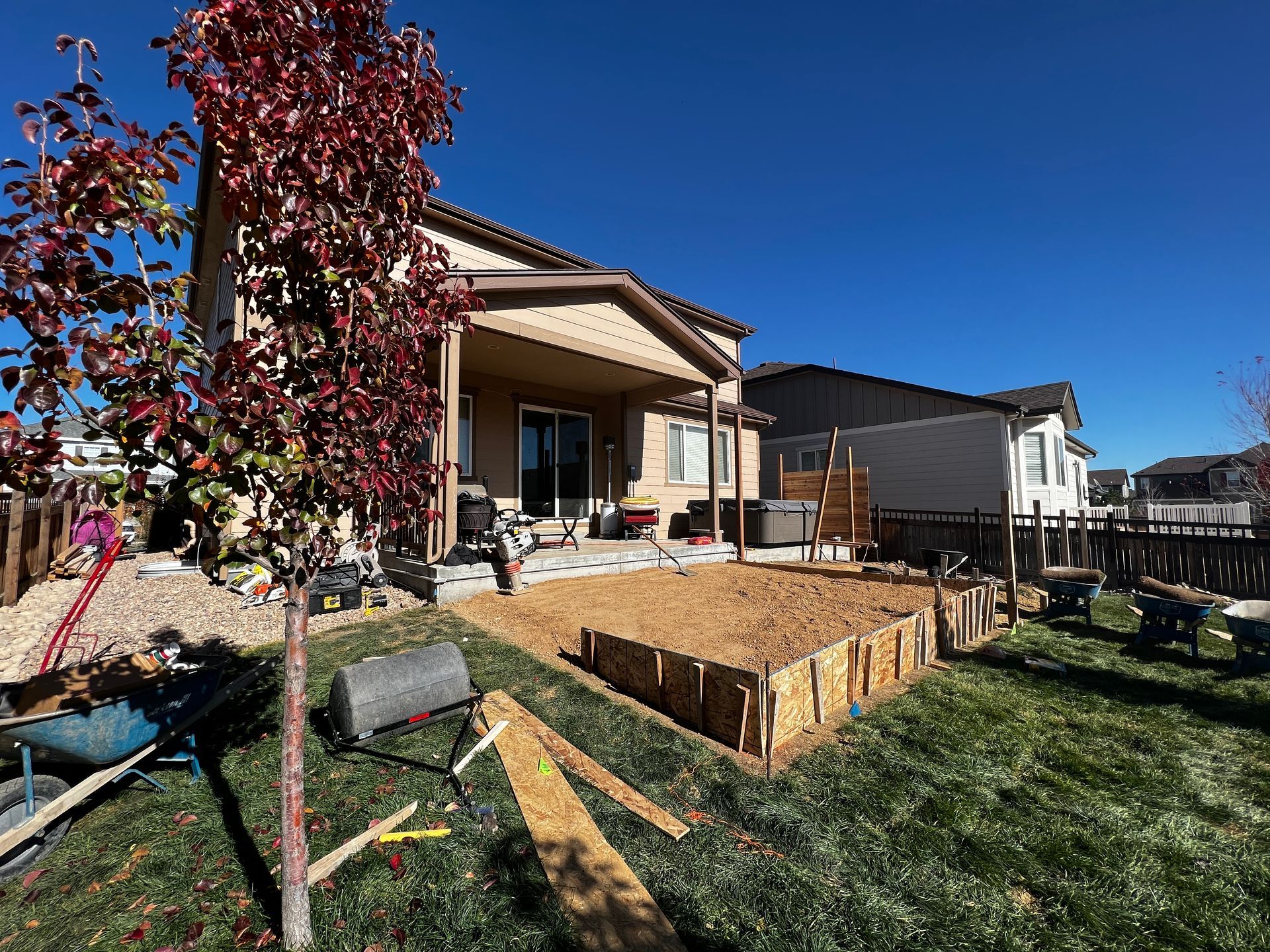Remodel of back yard. New extension of concrete patio, privacy screen for their hot tub, artificial turf for dog run, new beautiful fence to enclose dog run. Erie, CO 2021