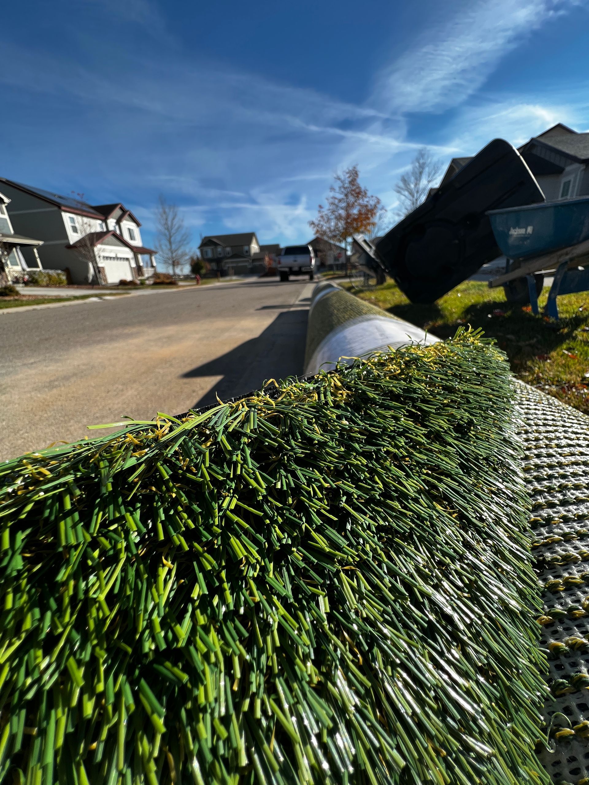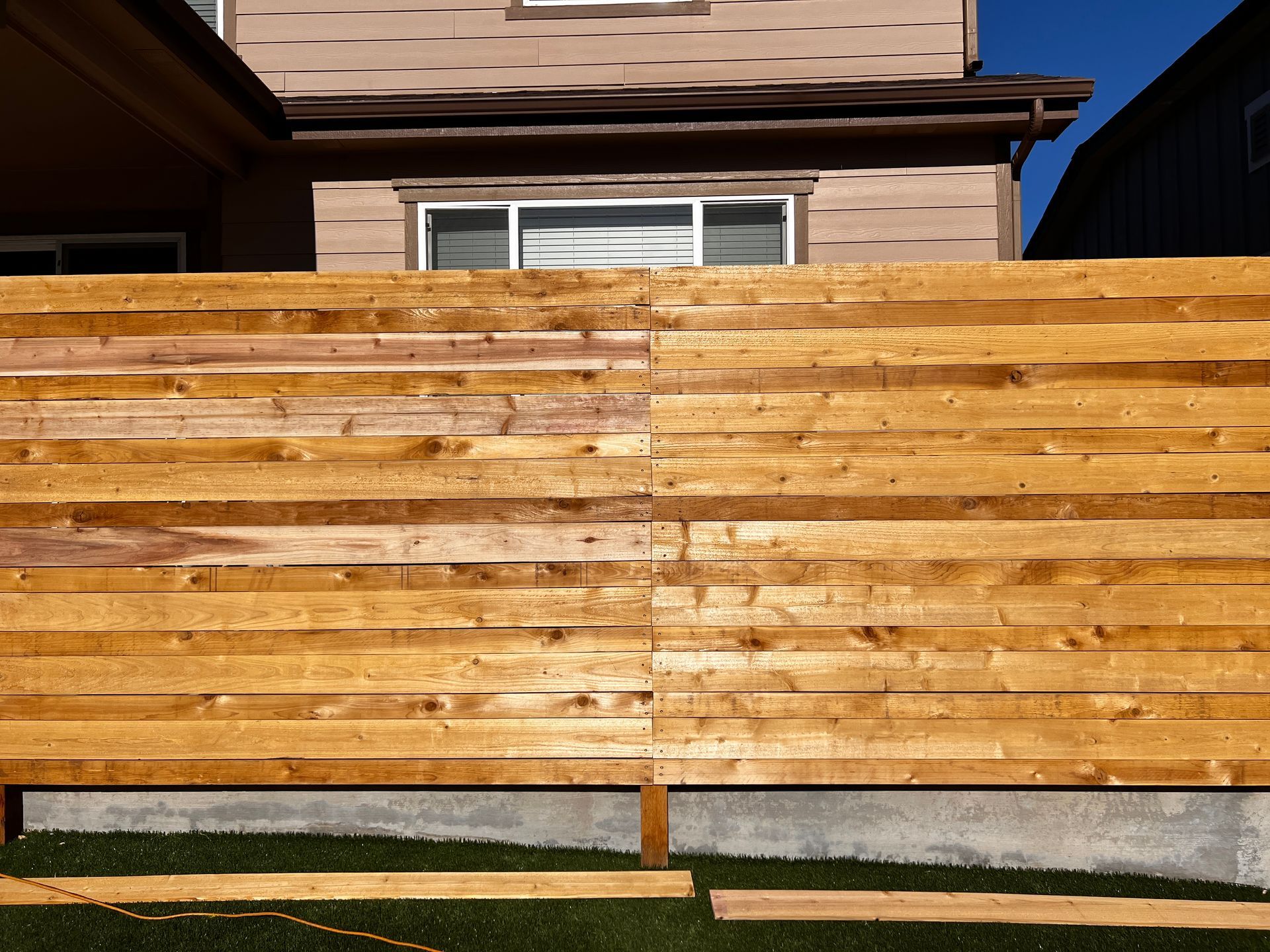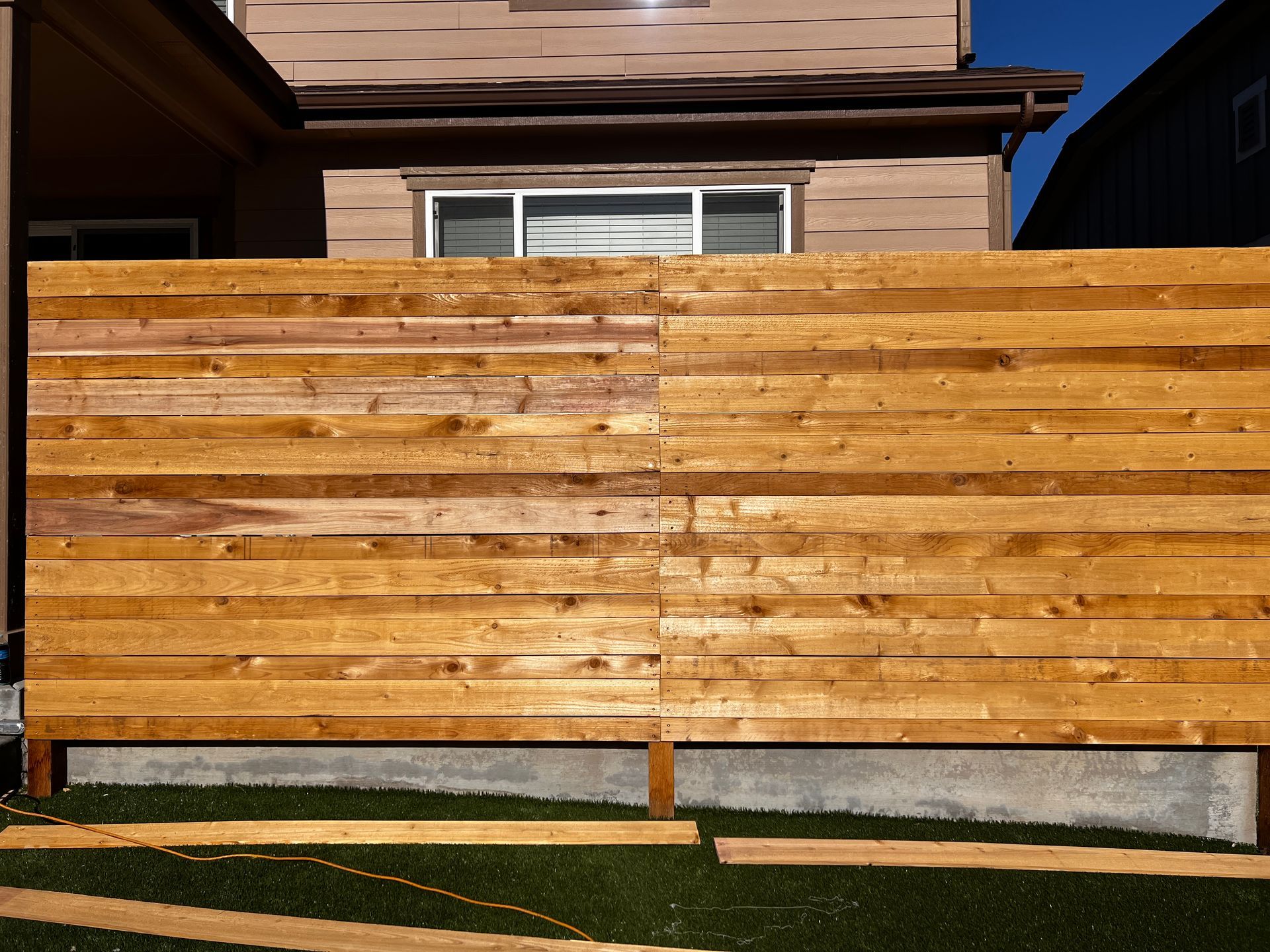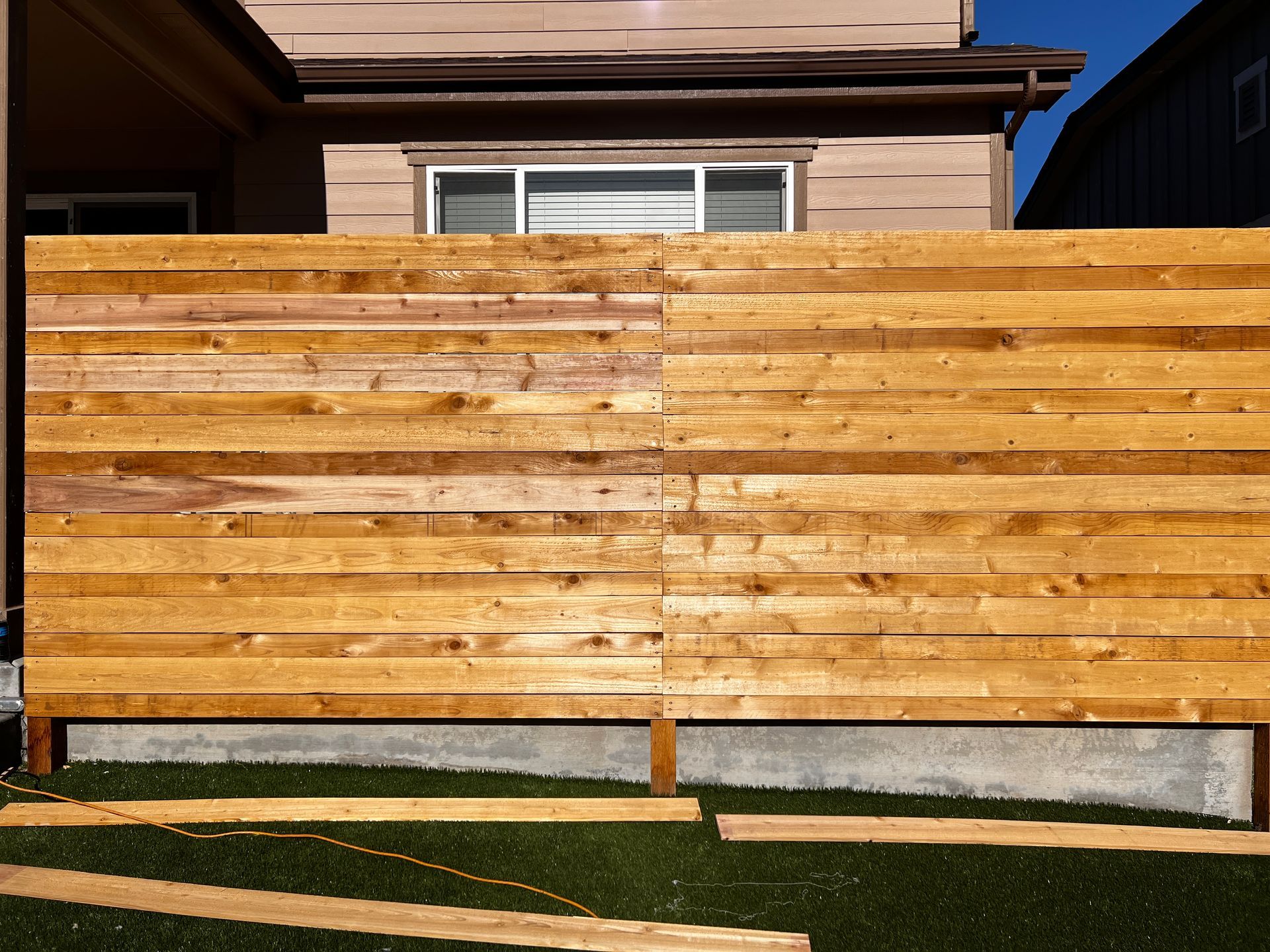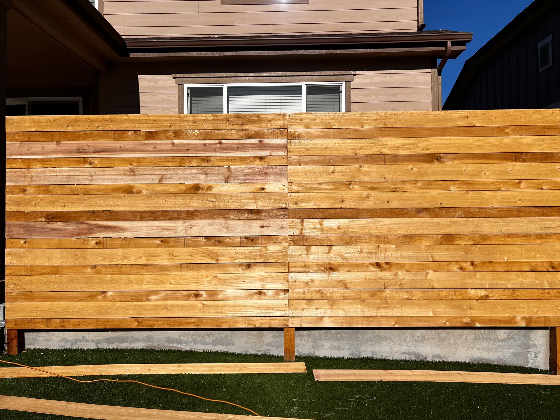 Remodel of back yard. New extension of concrete patio, privacy screen for their hot tub, artificial turf for dog run, new beautiful fence to enclose dog run. Erie, CO 2021