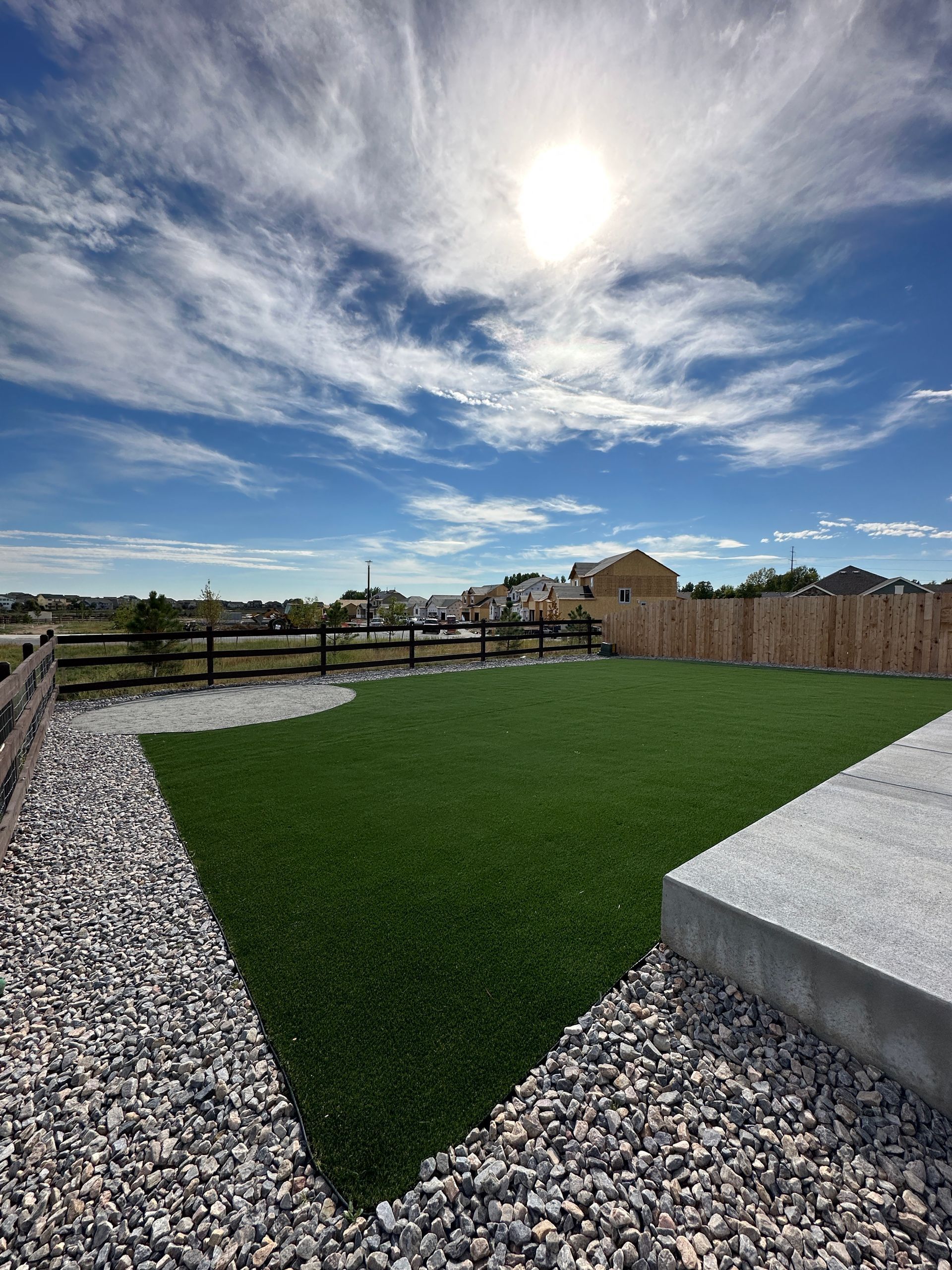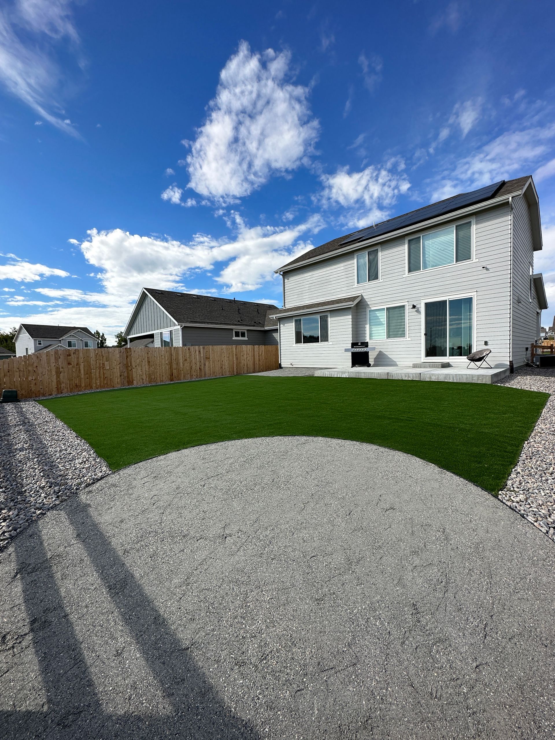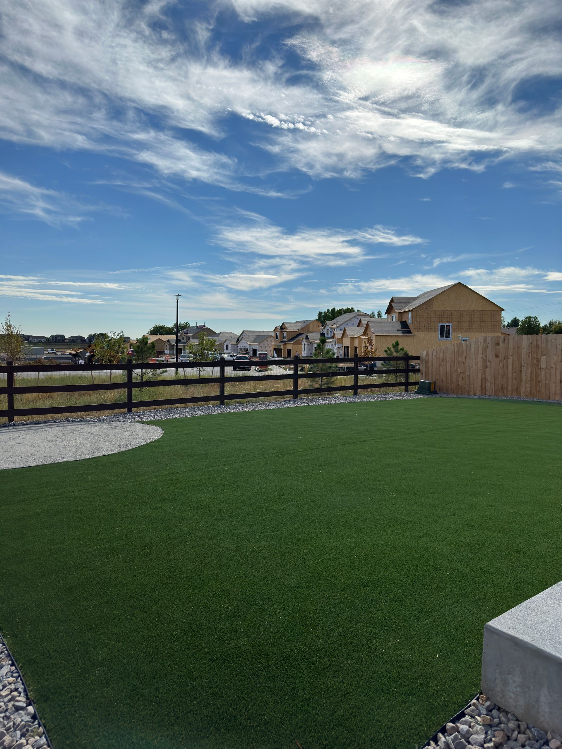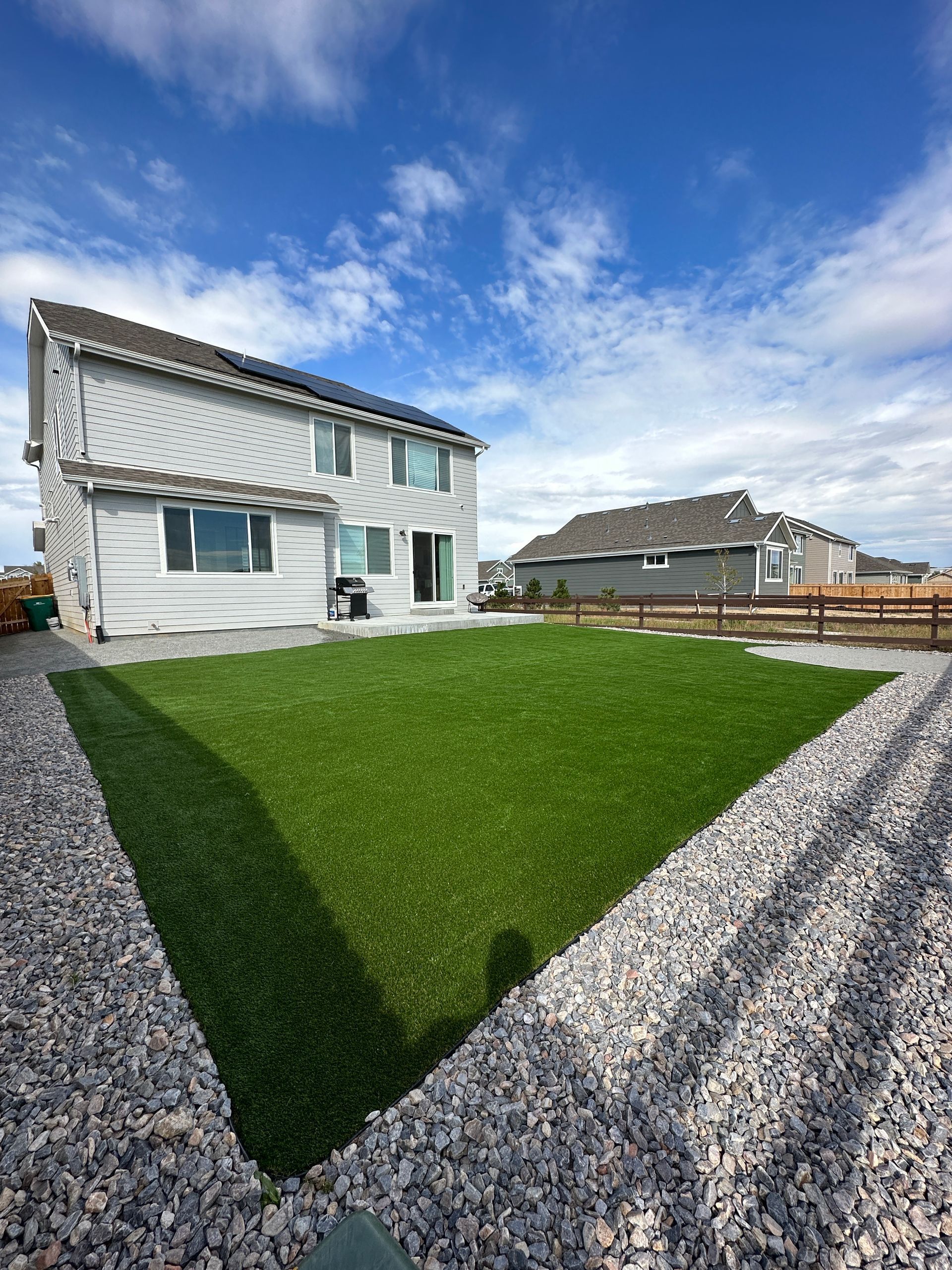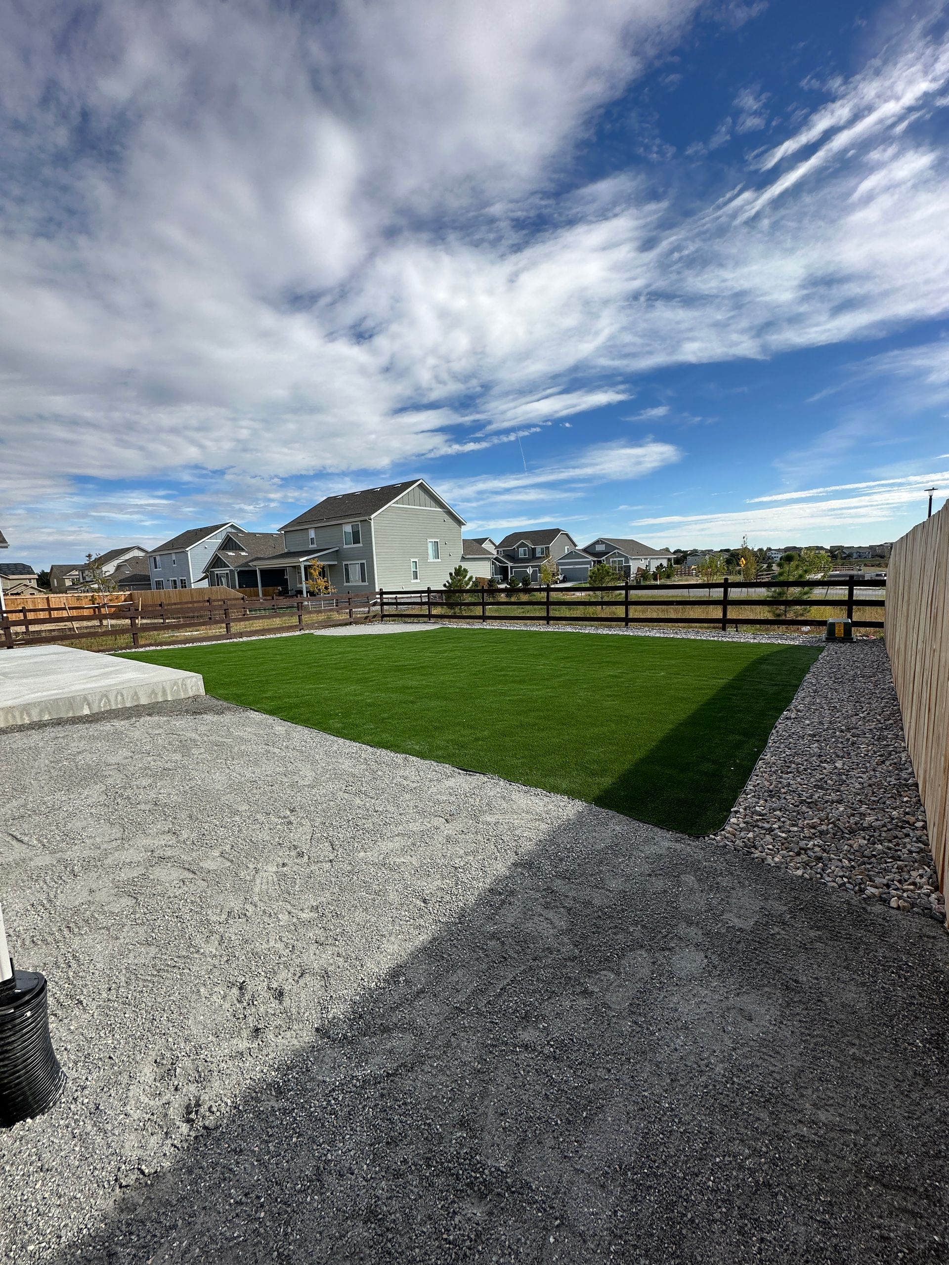 New build home with full landscaping in back yard. Artificial turf, crusher fines patio pad, decorative rock, and irrigation drip line. Mead, CO 2022