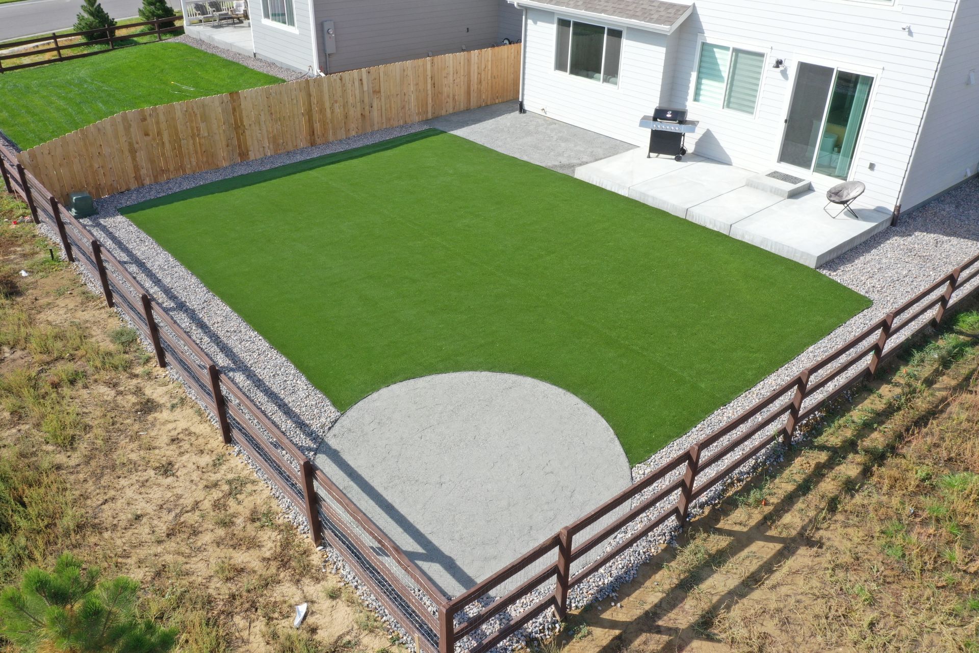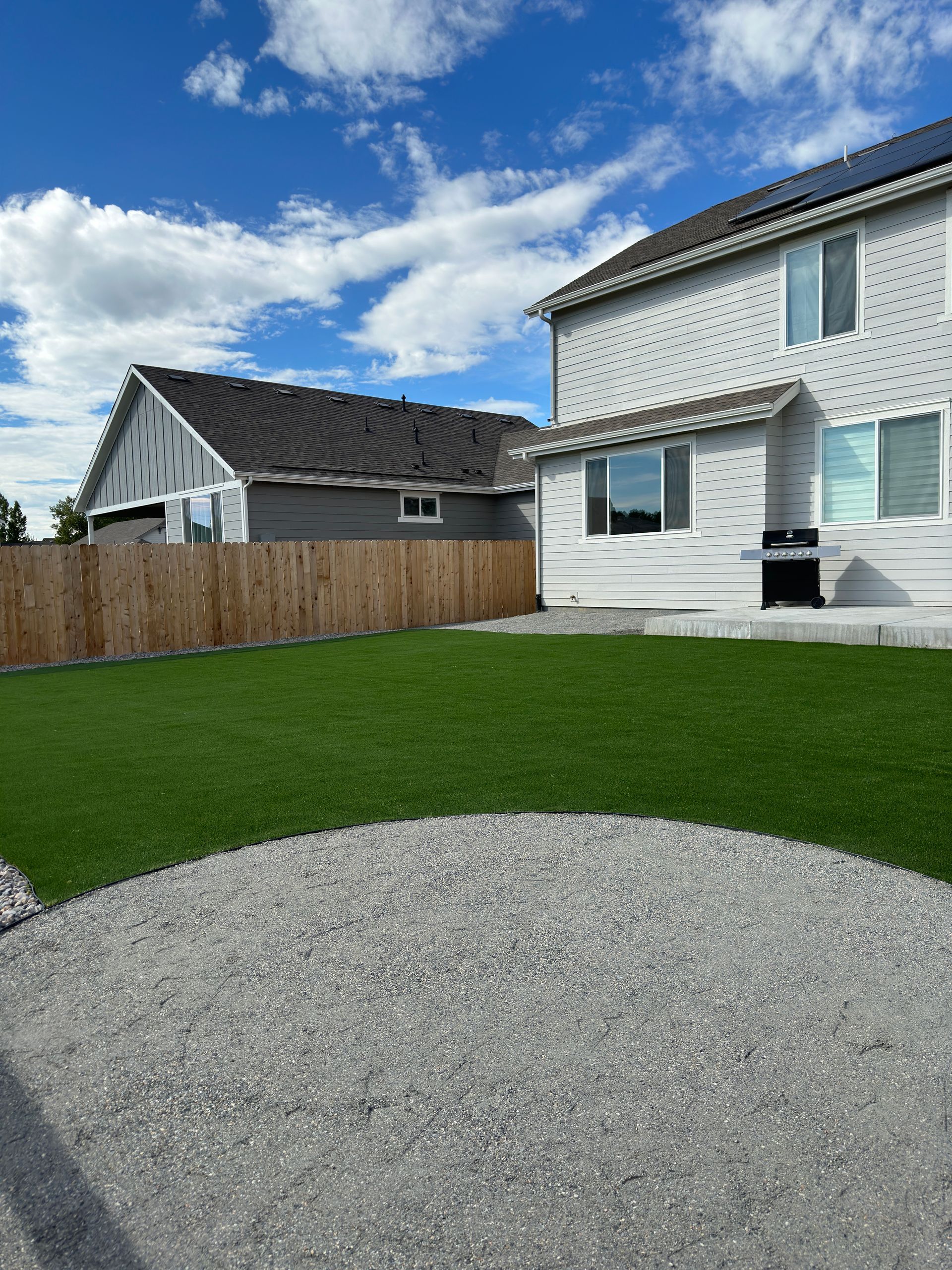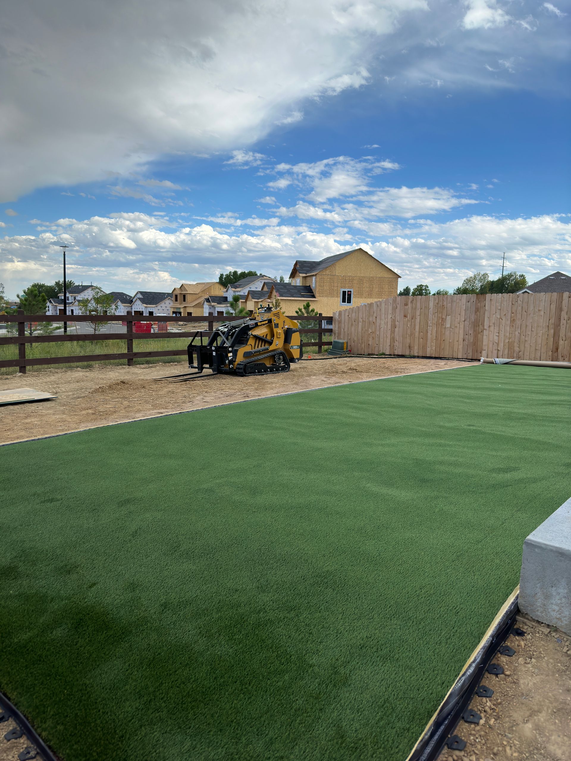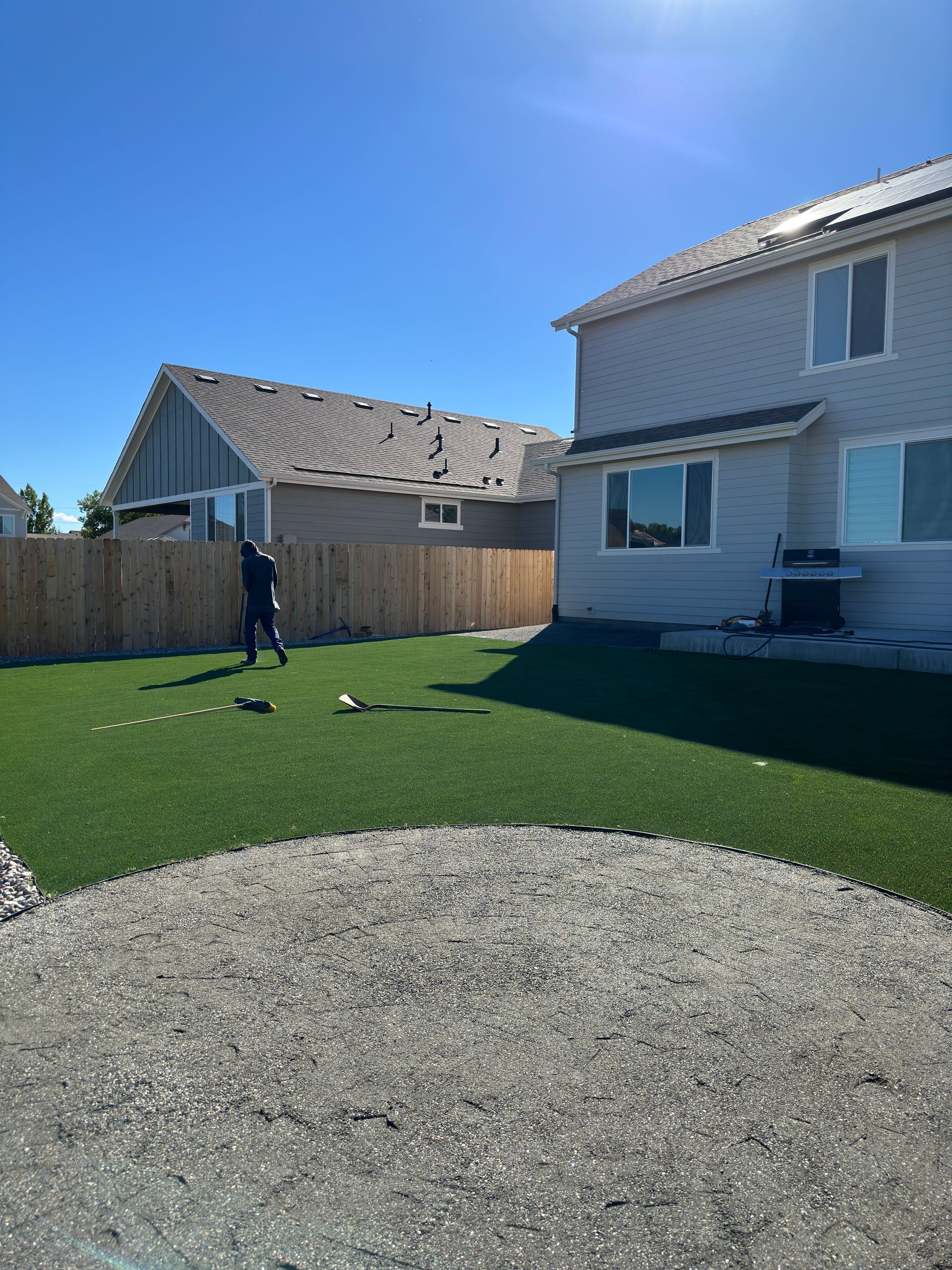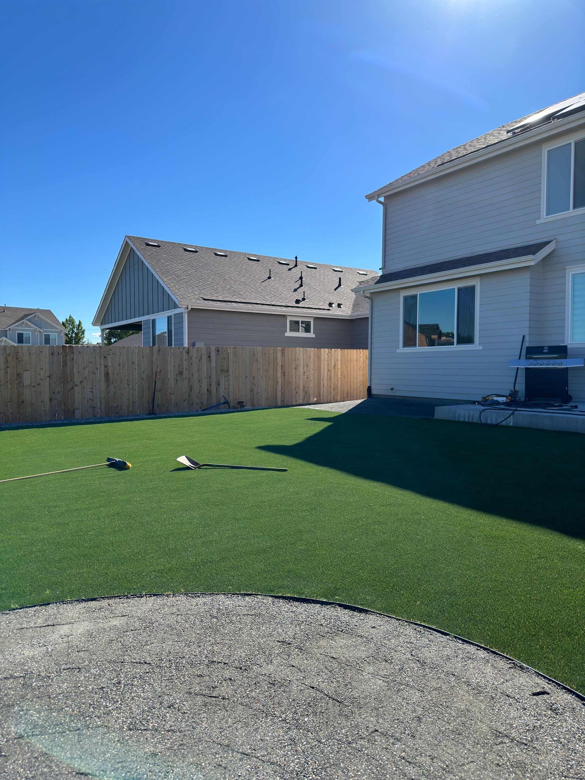 New build home with full landscaping in back yard. Artificial turf, crusher fines patio pad, decorative rock, and irrigation drip line. Mead, CO 2022