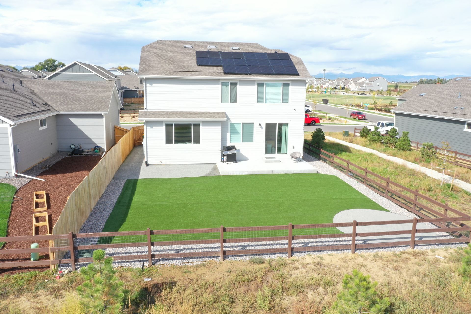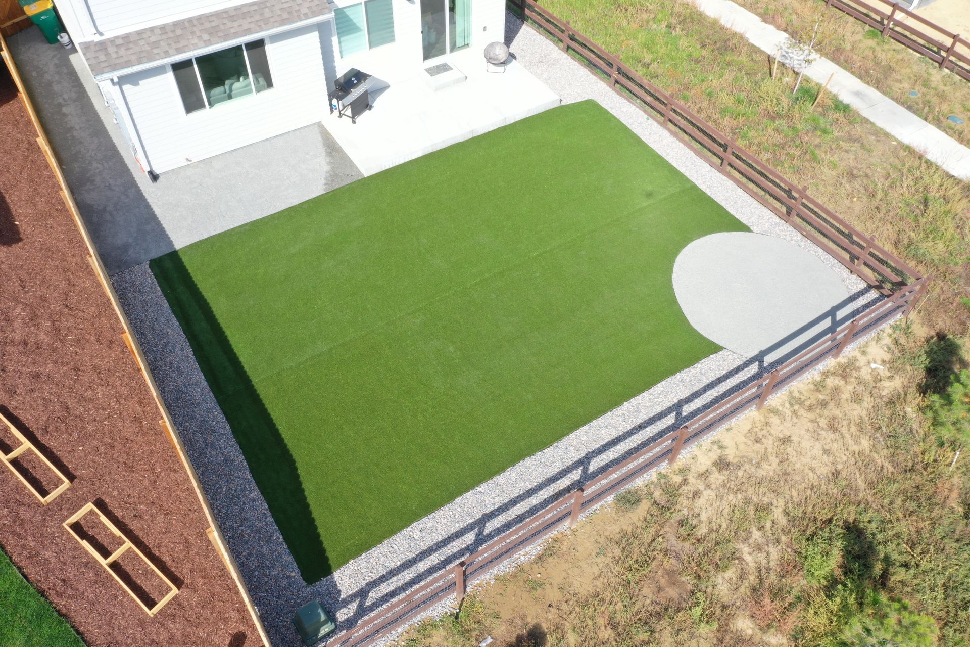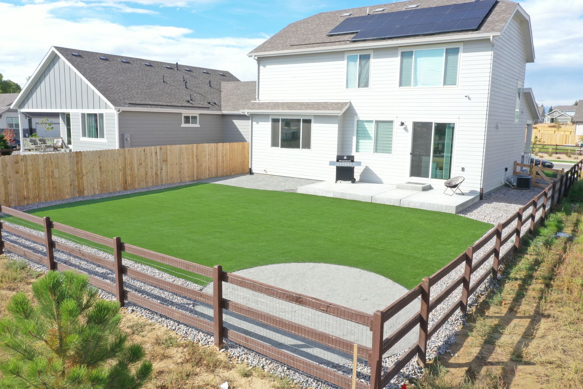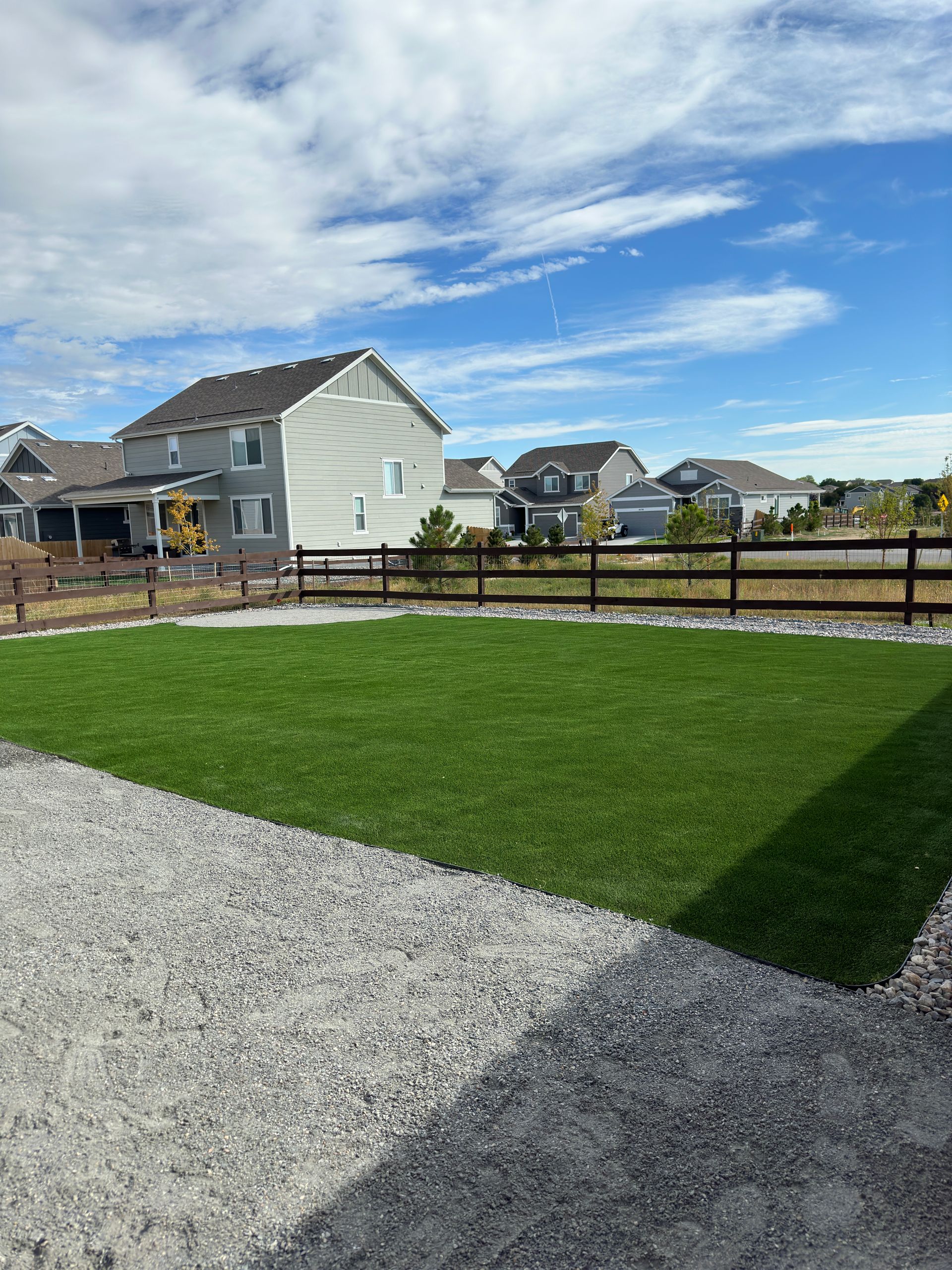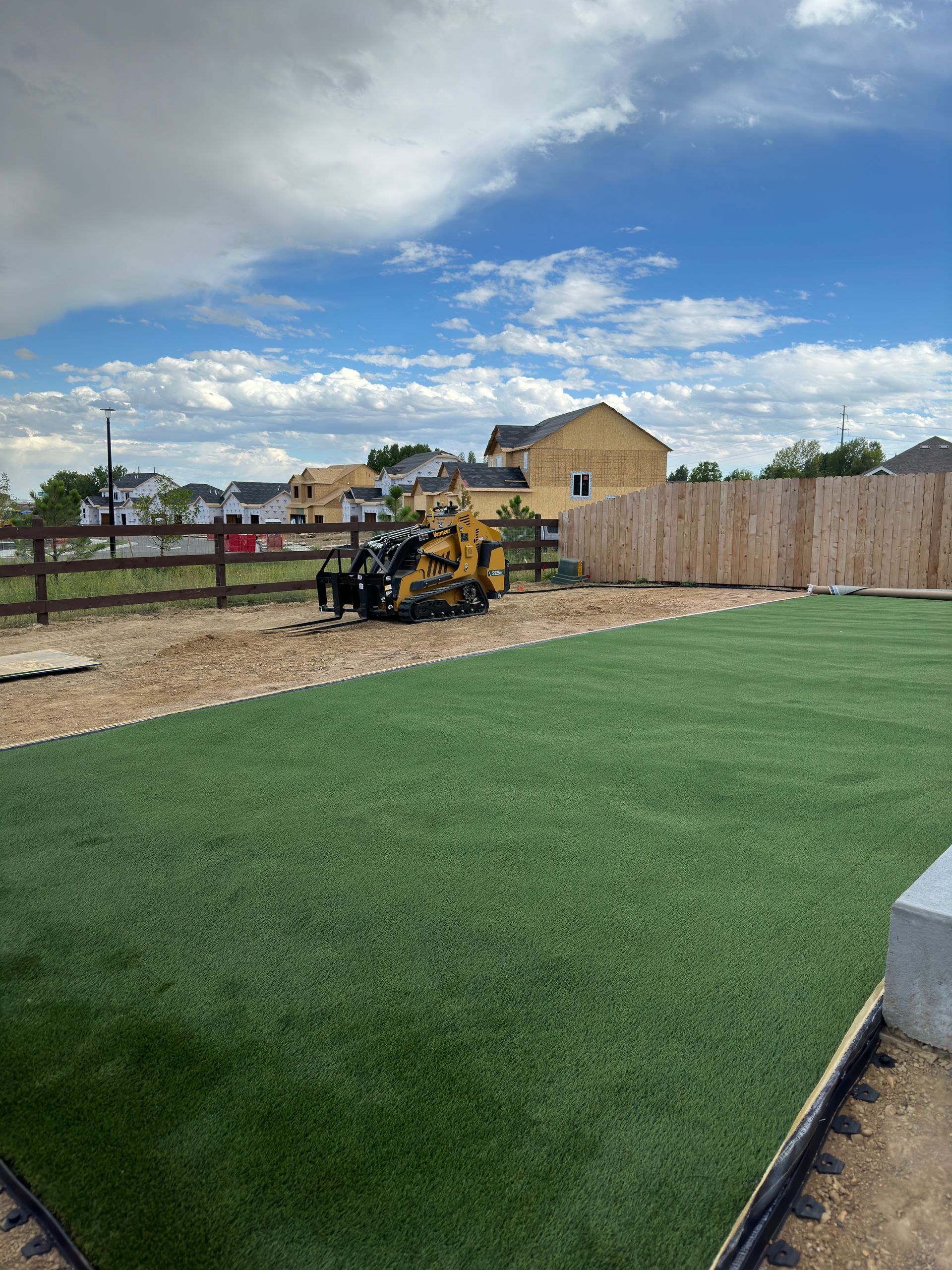 New build home with full landscaping in back yard. Artificial turf, crusher fines patio pad, decorative rock, and irrigation drip line. Mead, CO 2022