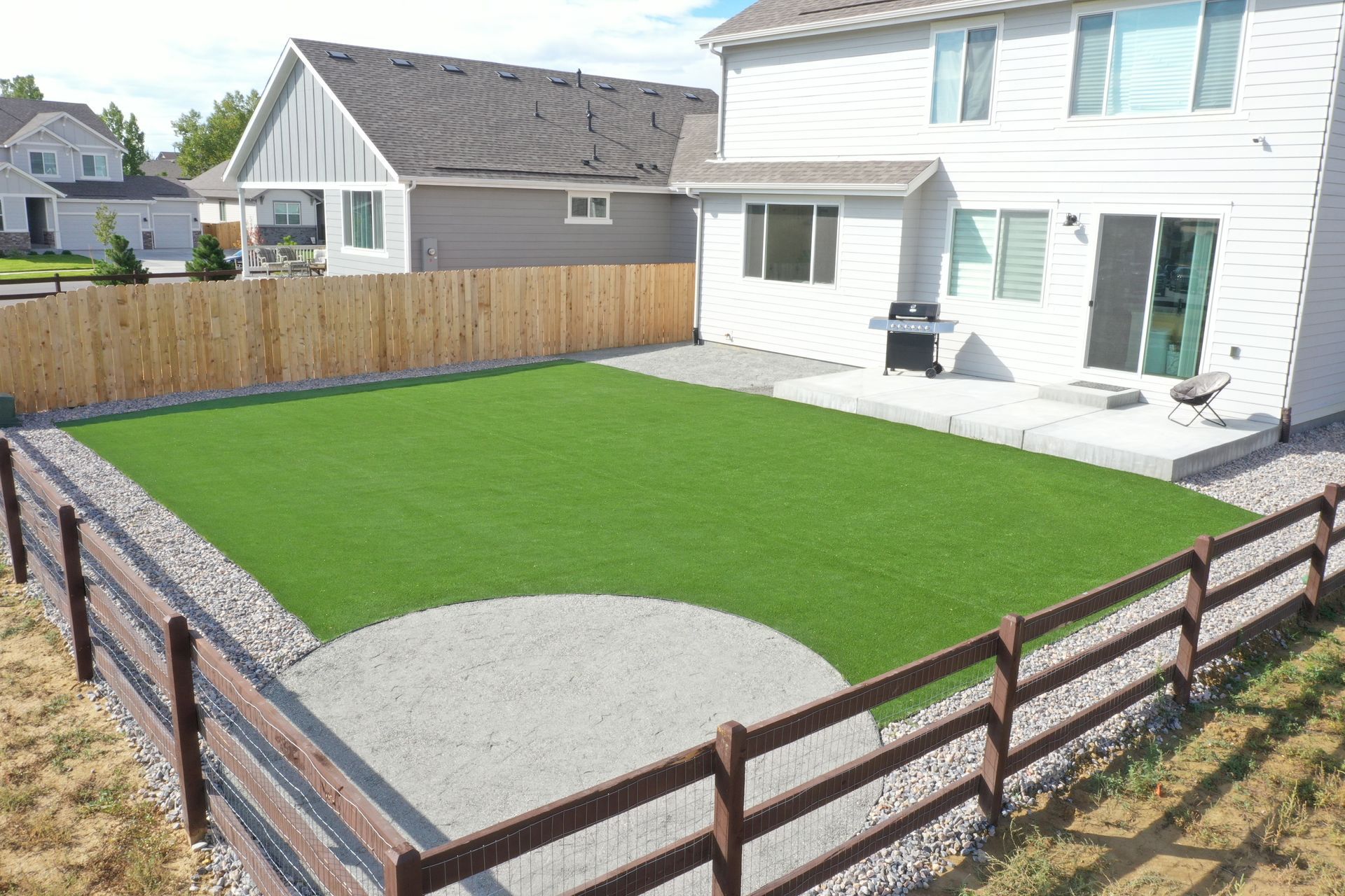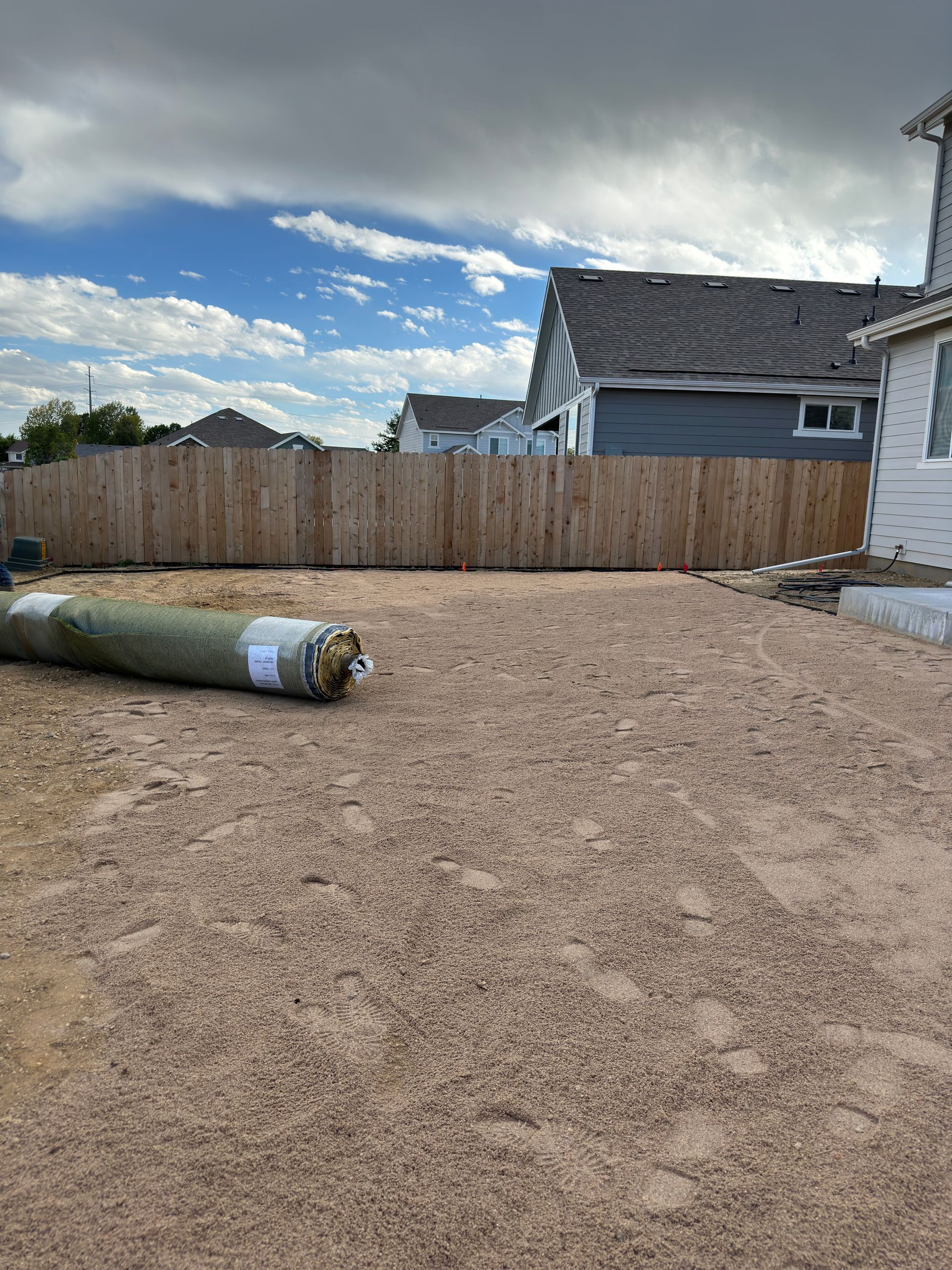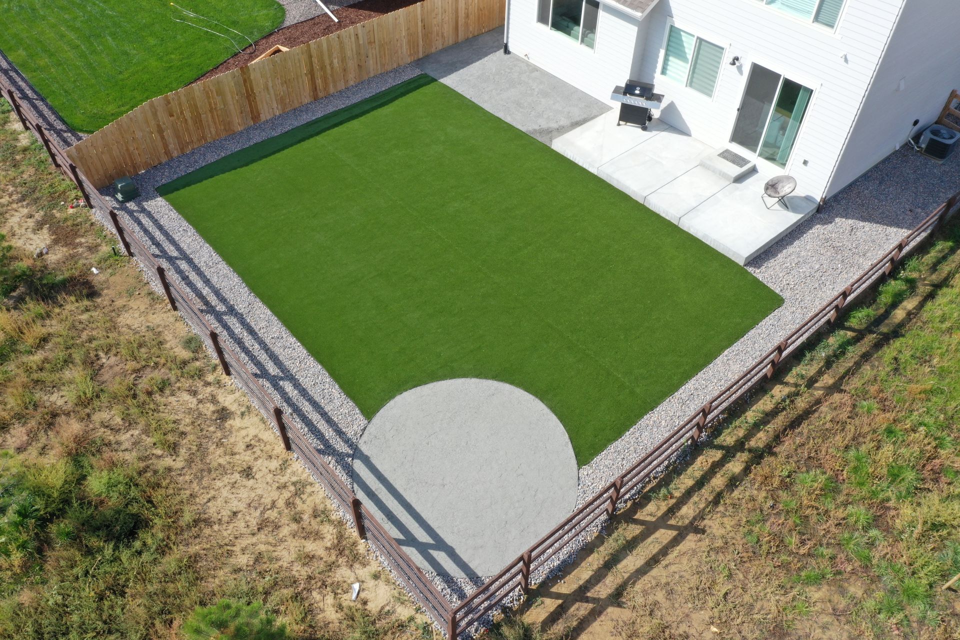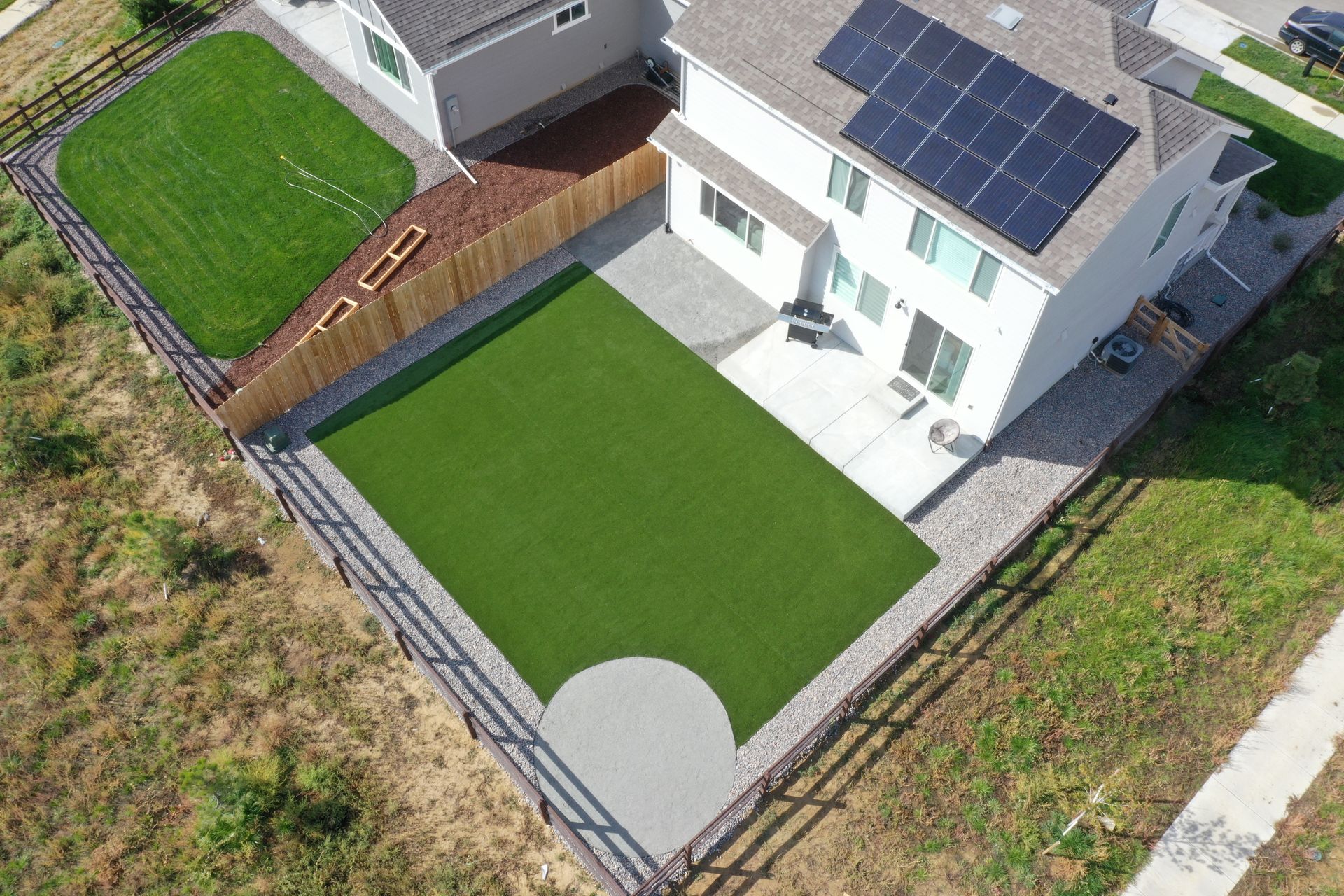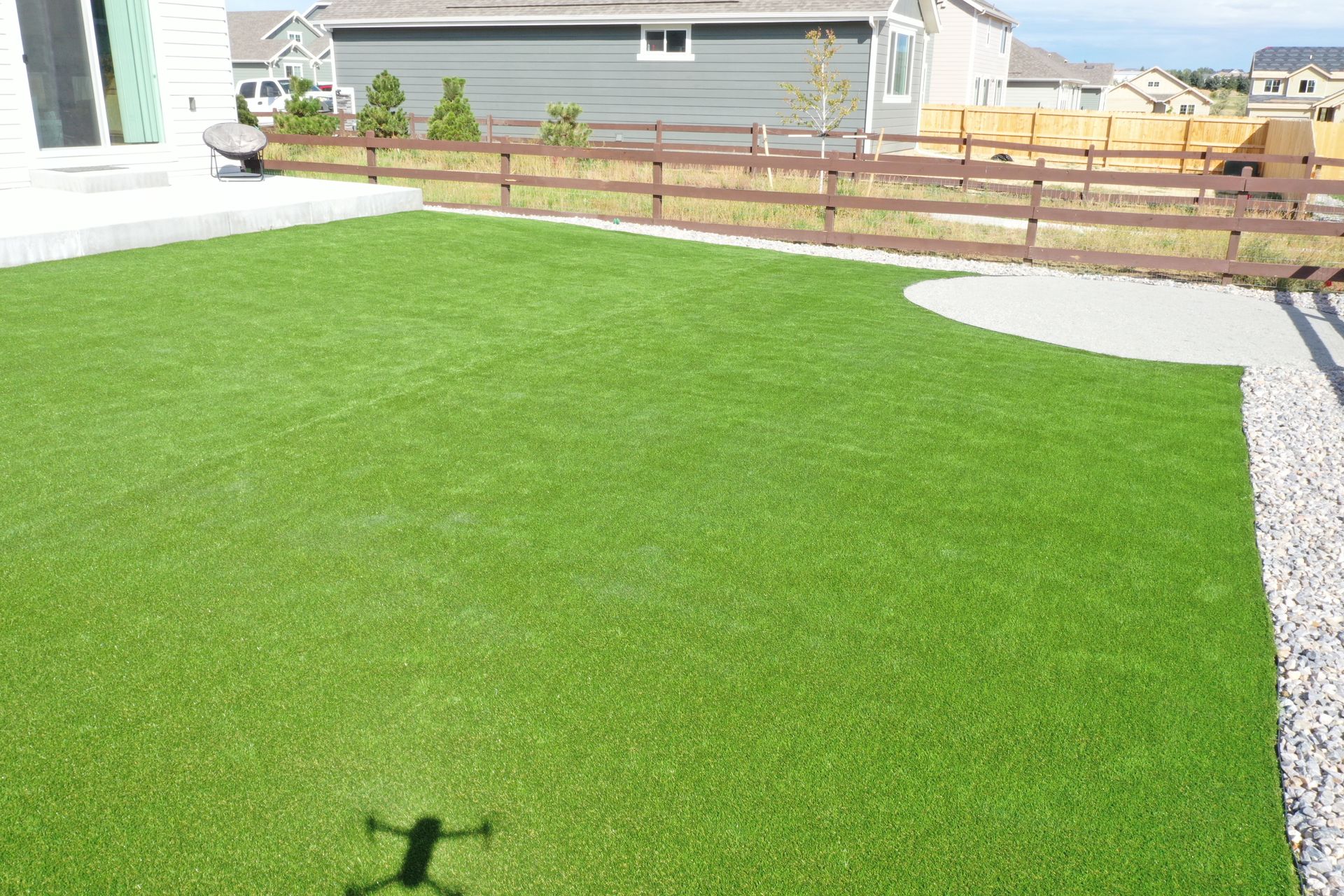 New build home with full landscaping in back yard. Artificial turf, crusher fines patio pad, decorative rock, and irrigation drip line. Mead, CO 2022