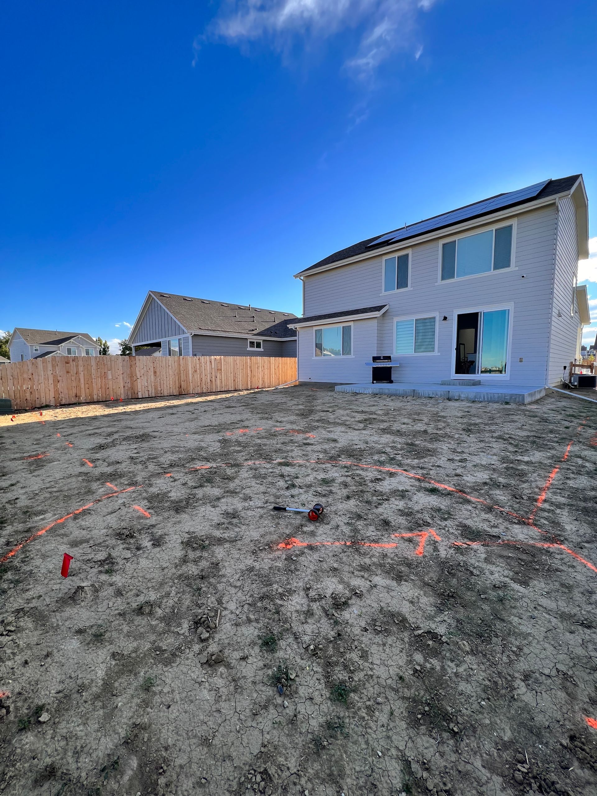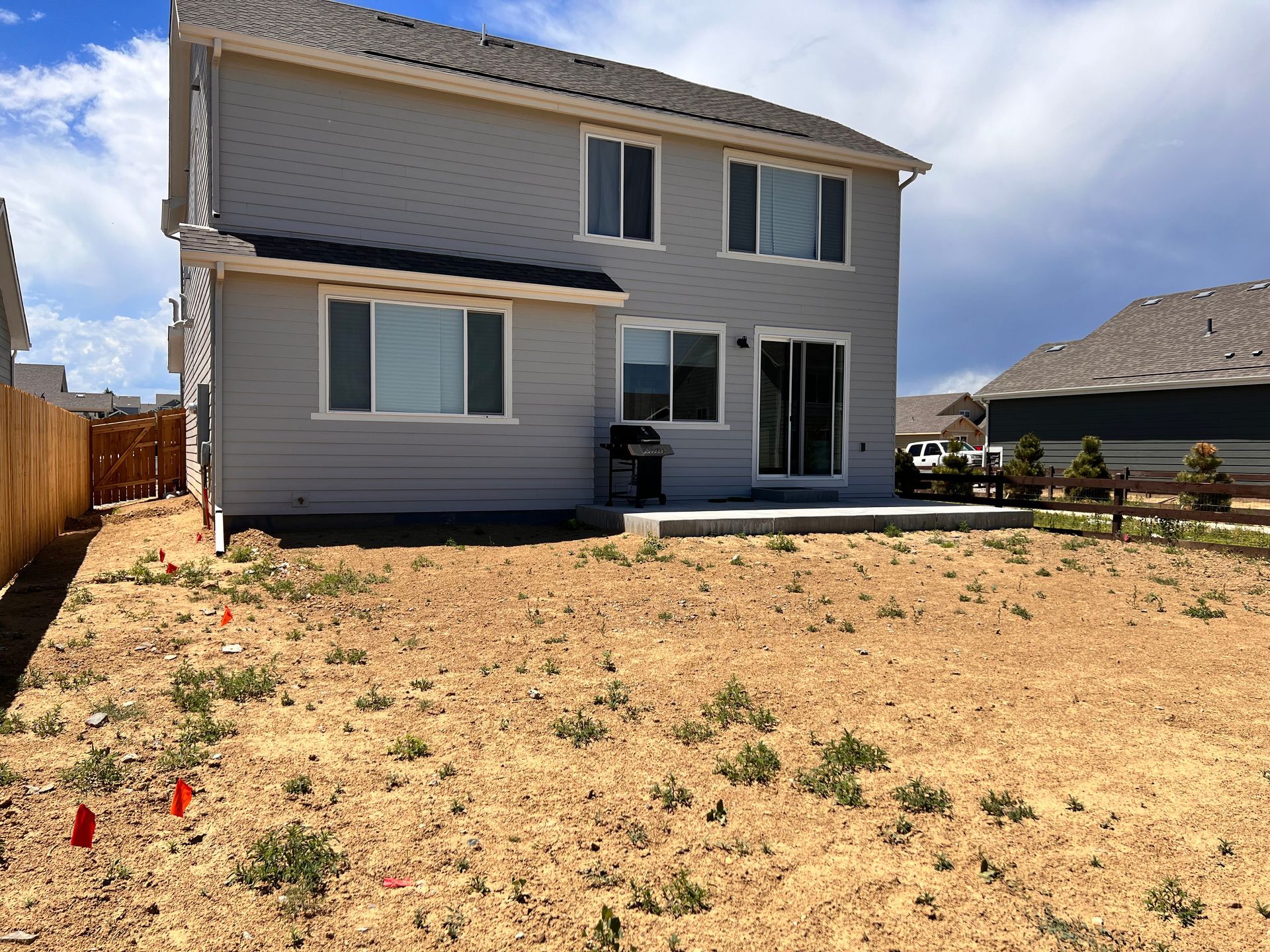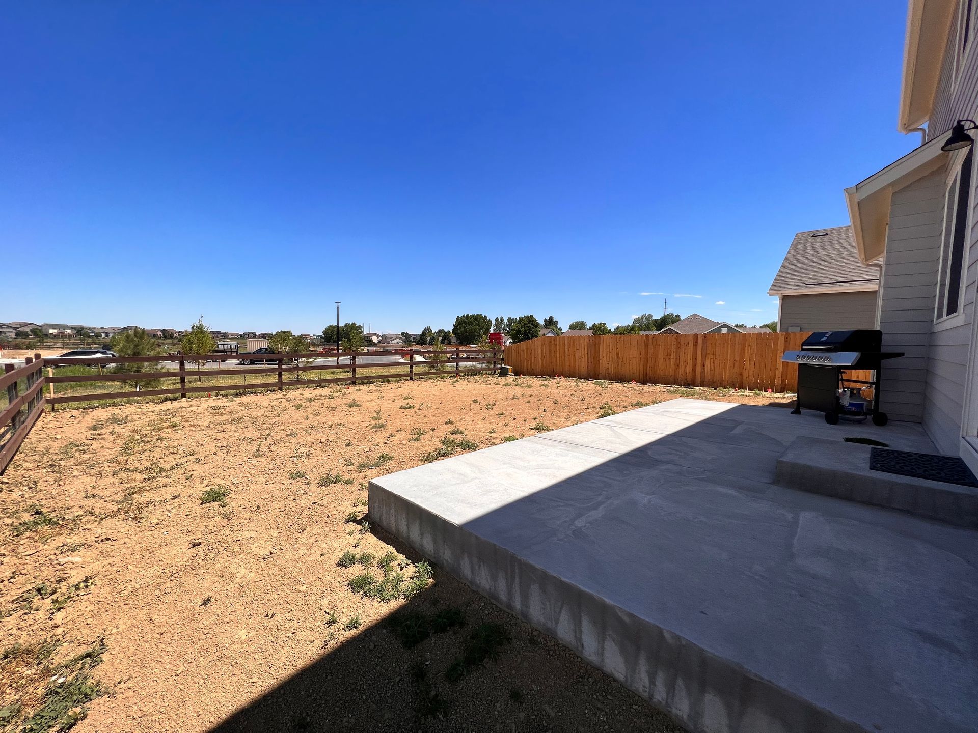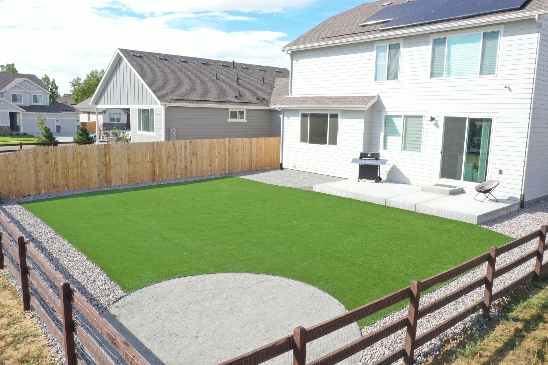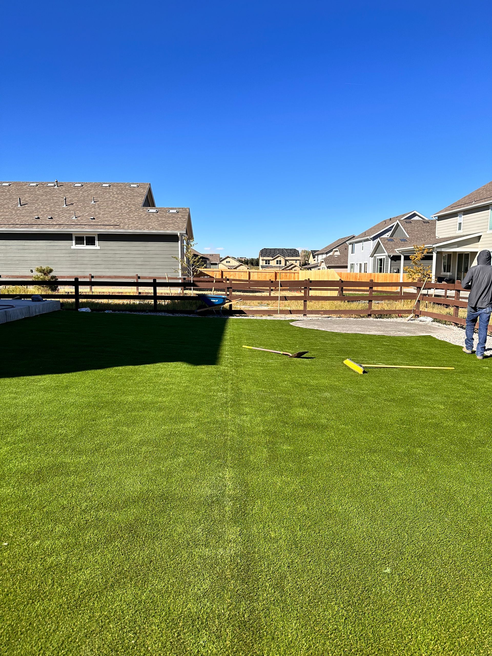New build home with full landscaping in back yard. Artificial turf, crusher fines patio pad, decorative rock, and irrigation drip line. Mead, CO 2022