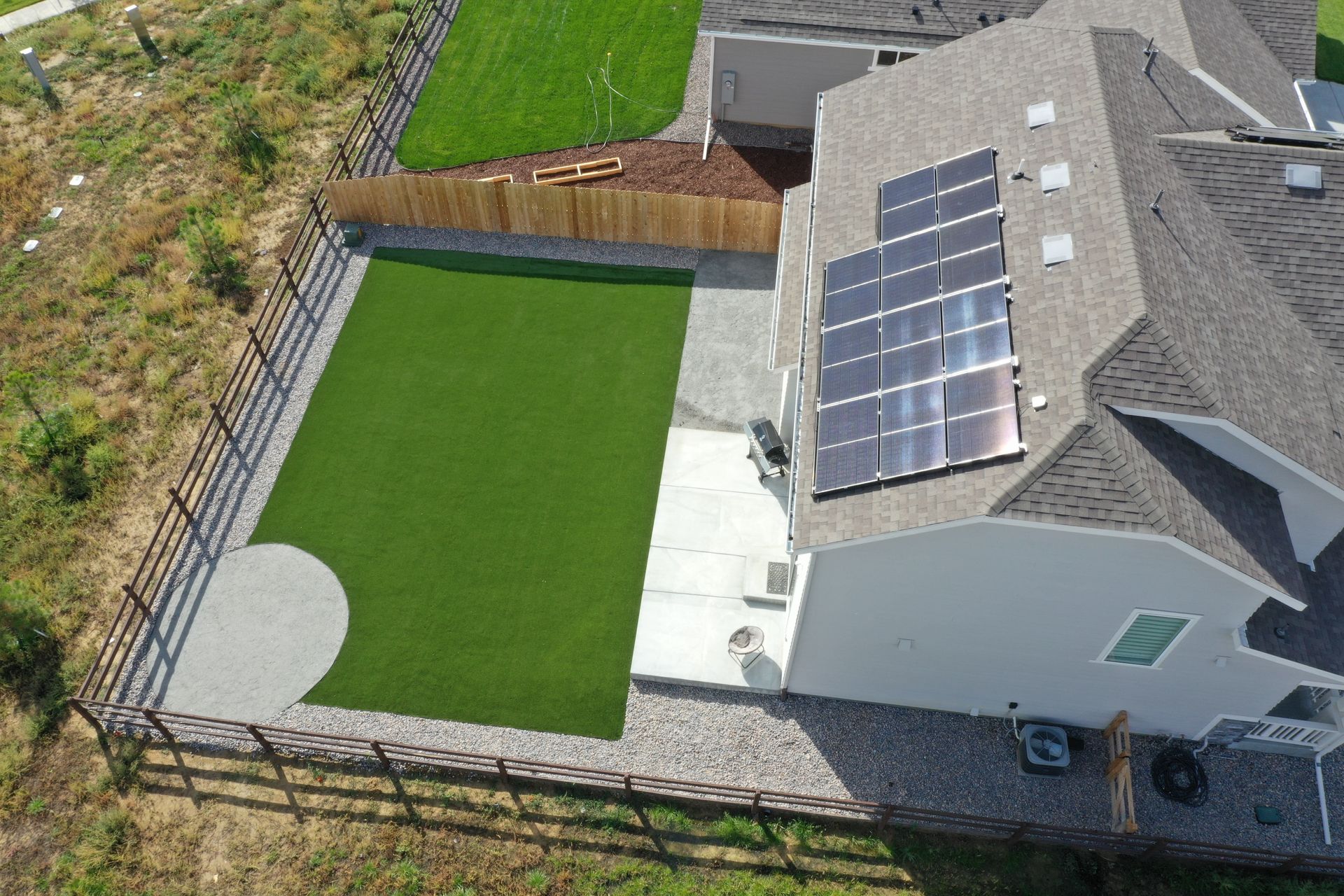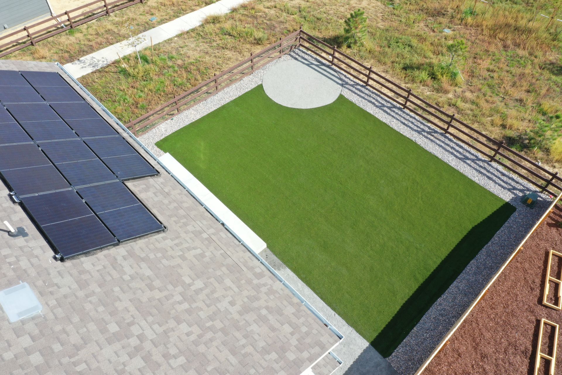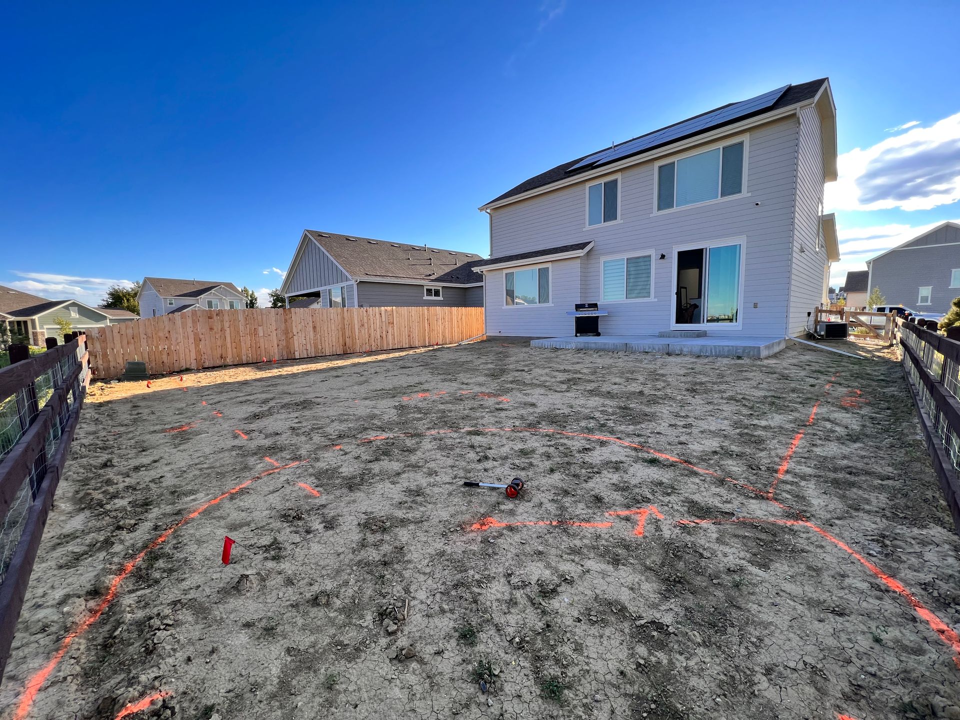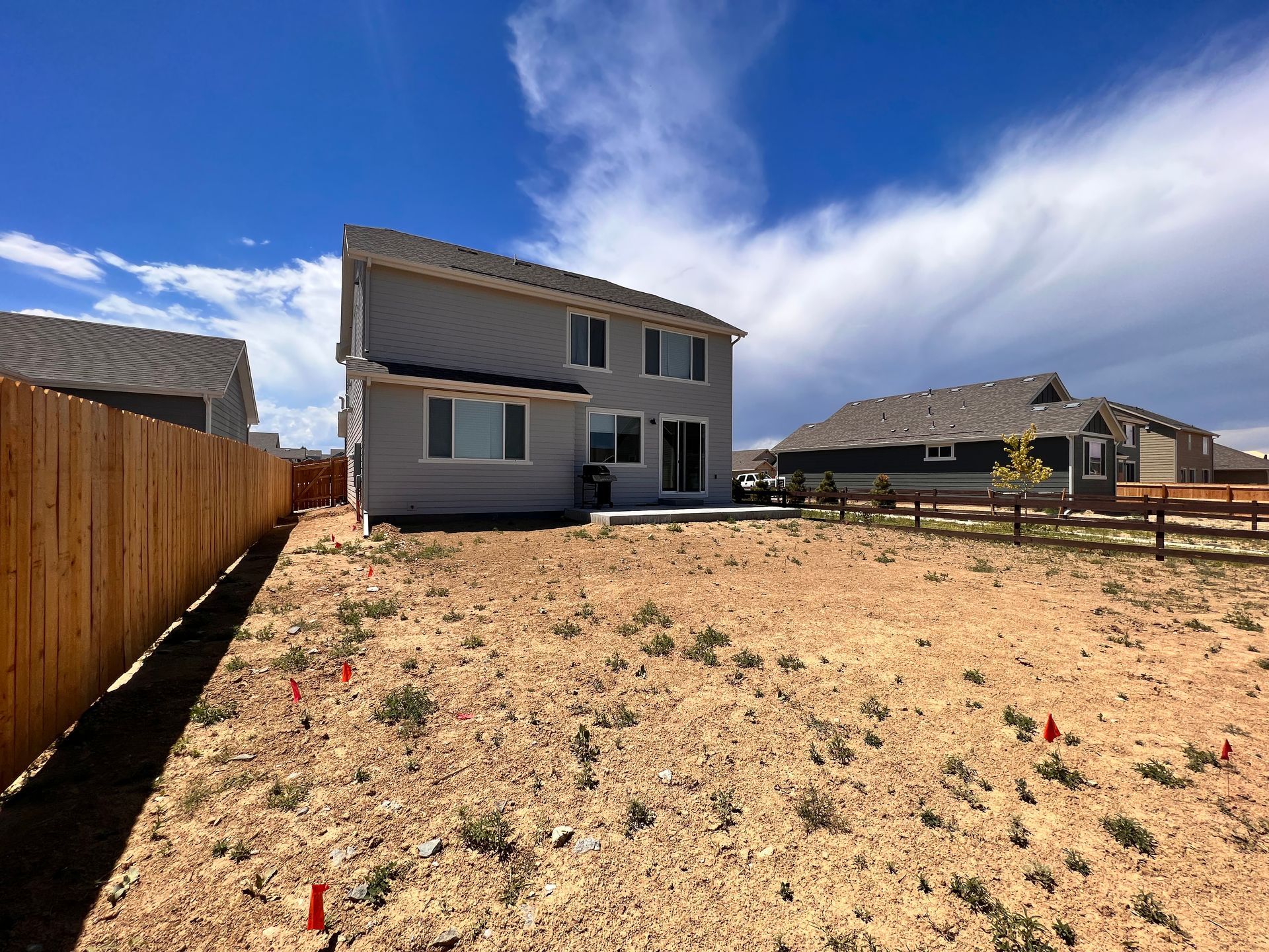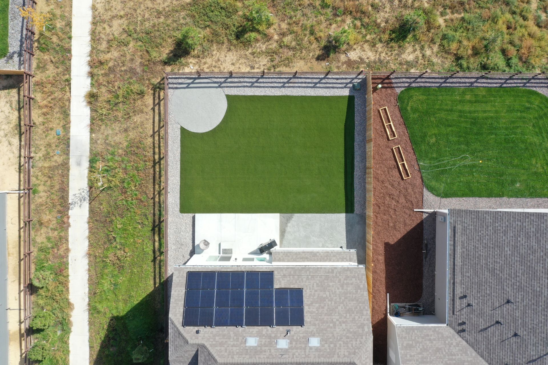 New build home with full landscaping in back yard. Artificial turf, crusher fines patio pad, decorative rock, and irrigation drip line. Mead, CO 2022