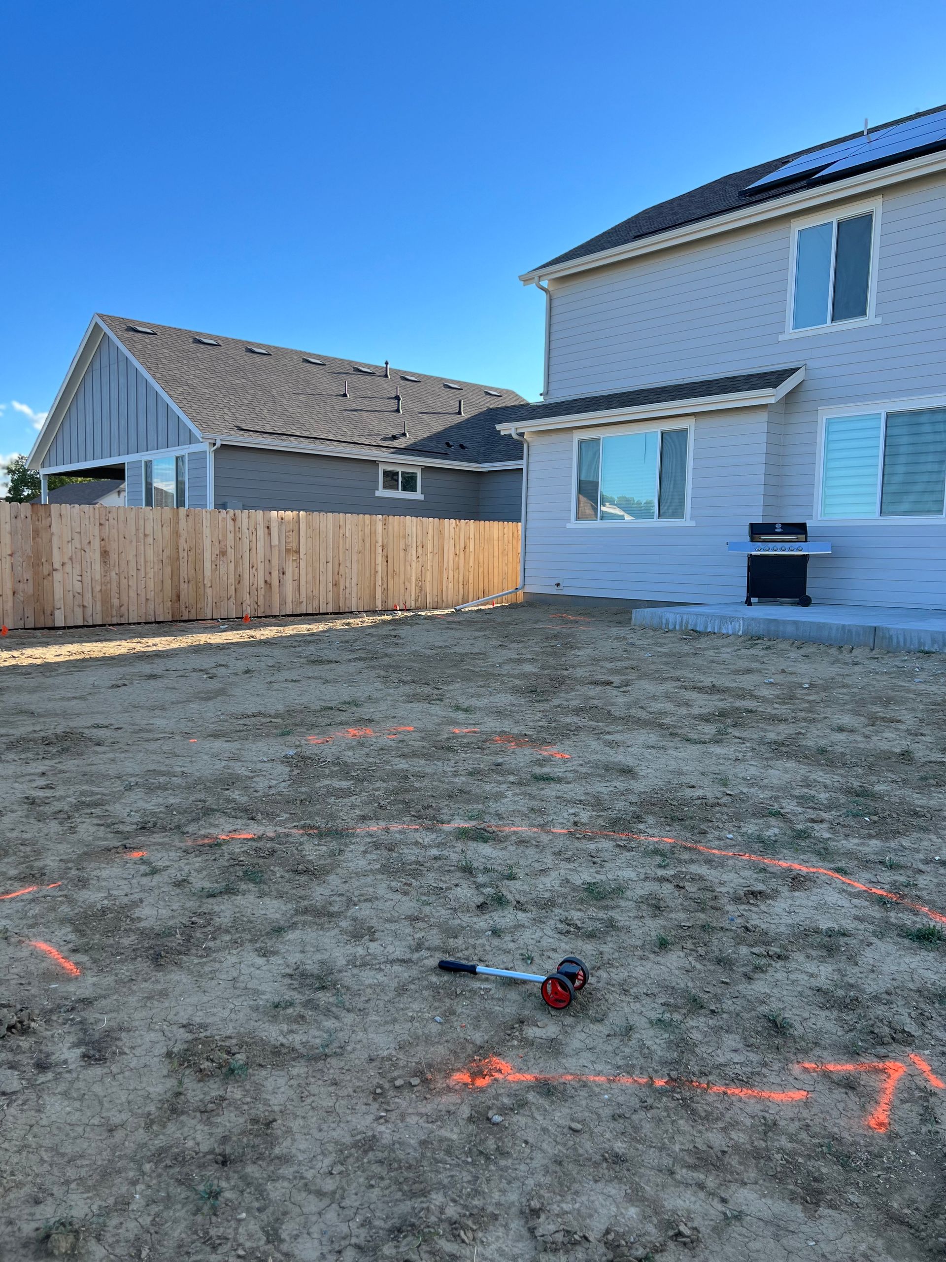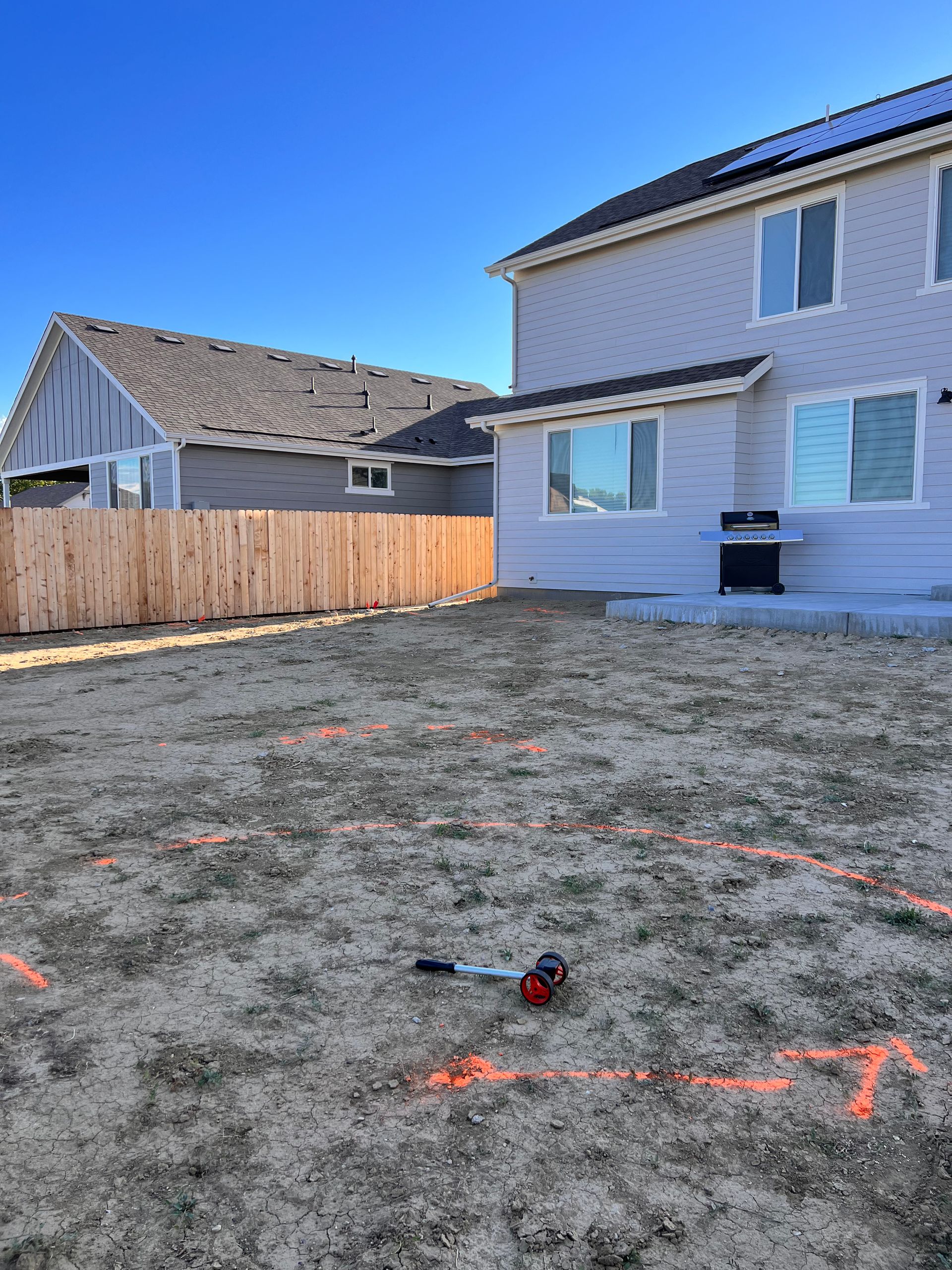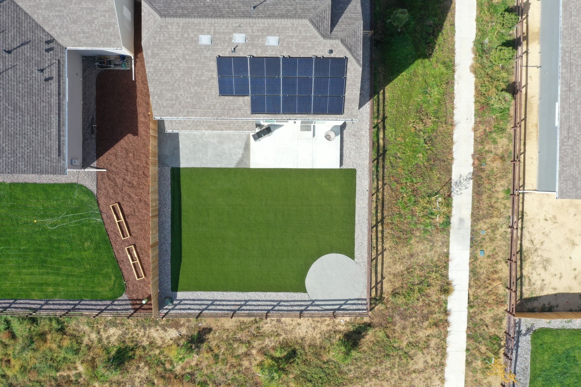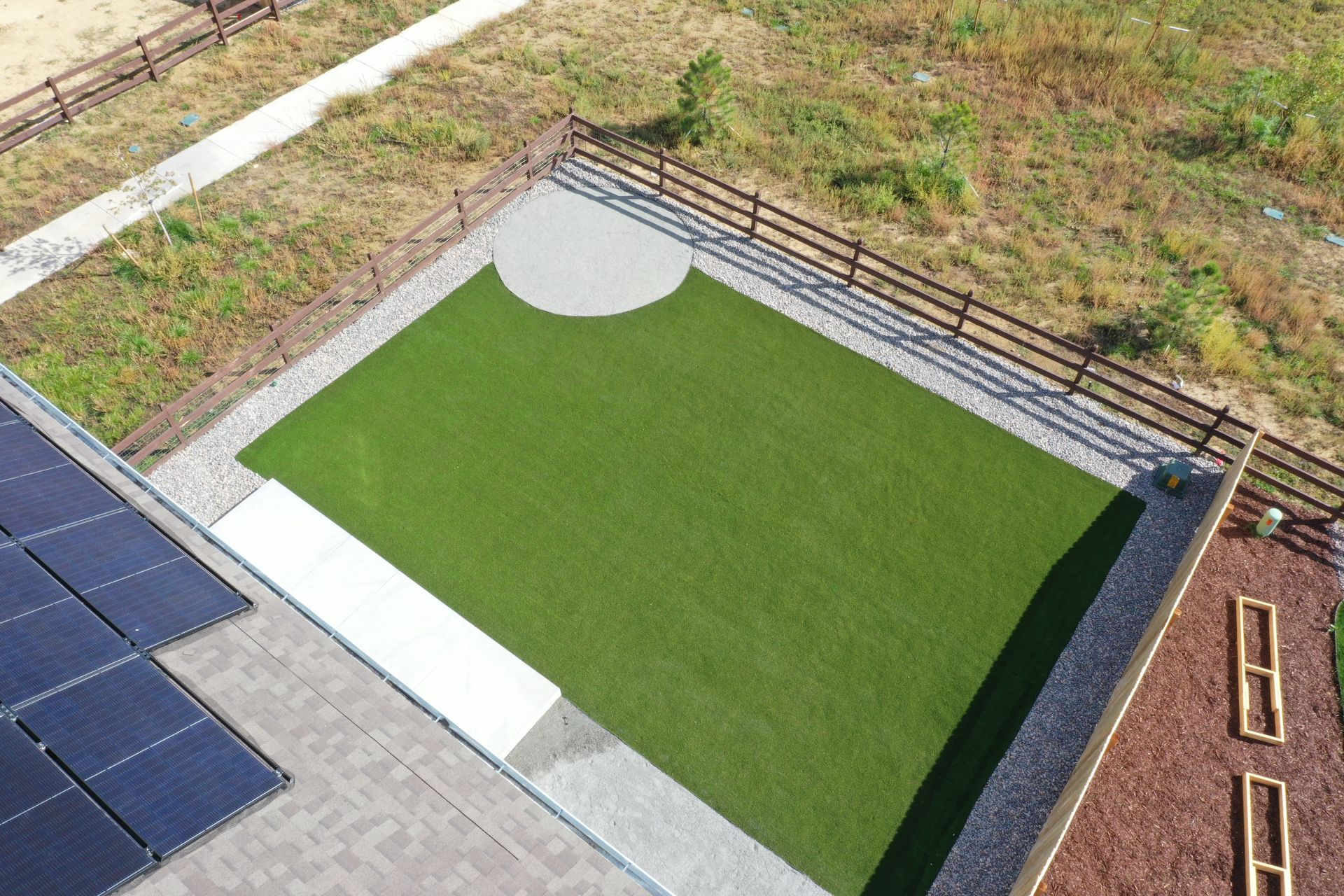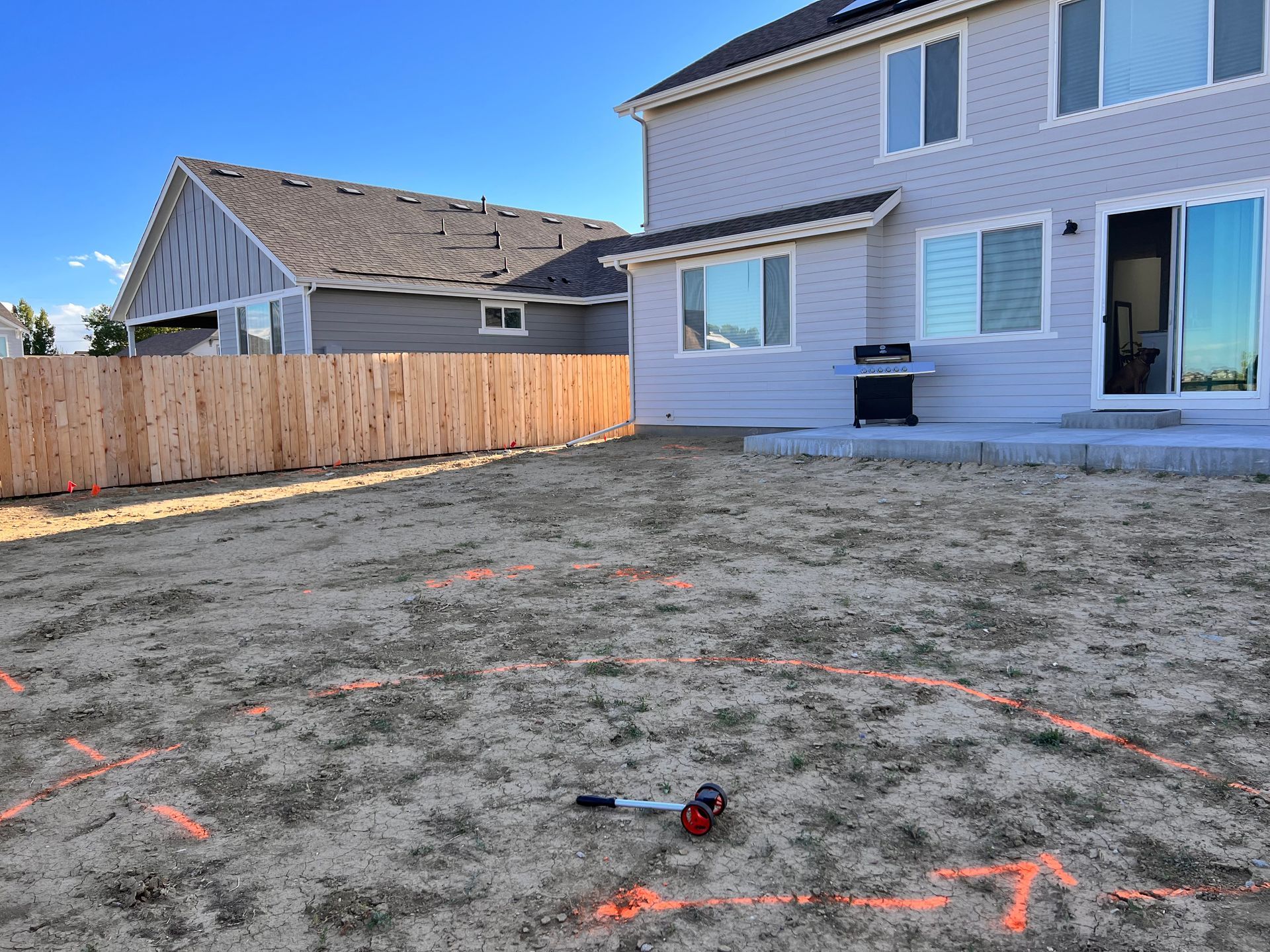 New build home with full landscaping in back yard. Artificial turf, crusher fines patio pad, decorative rock, and irrigation drip line. Mead, CO 2022