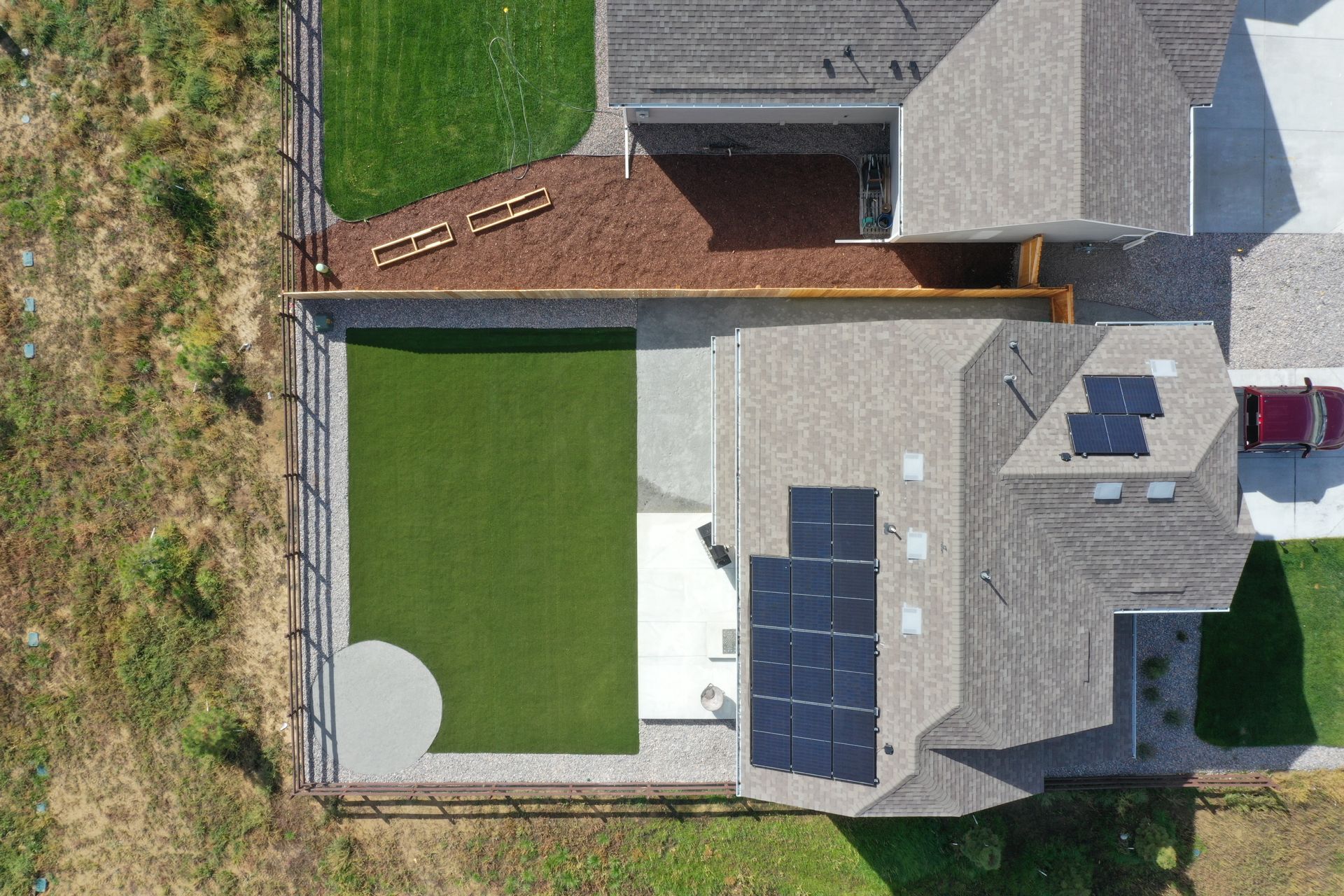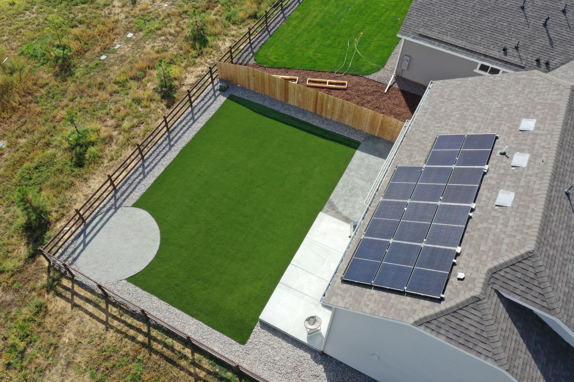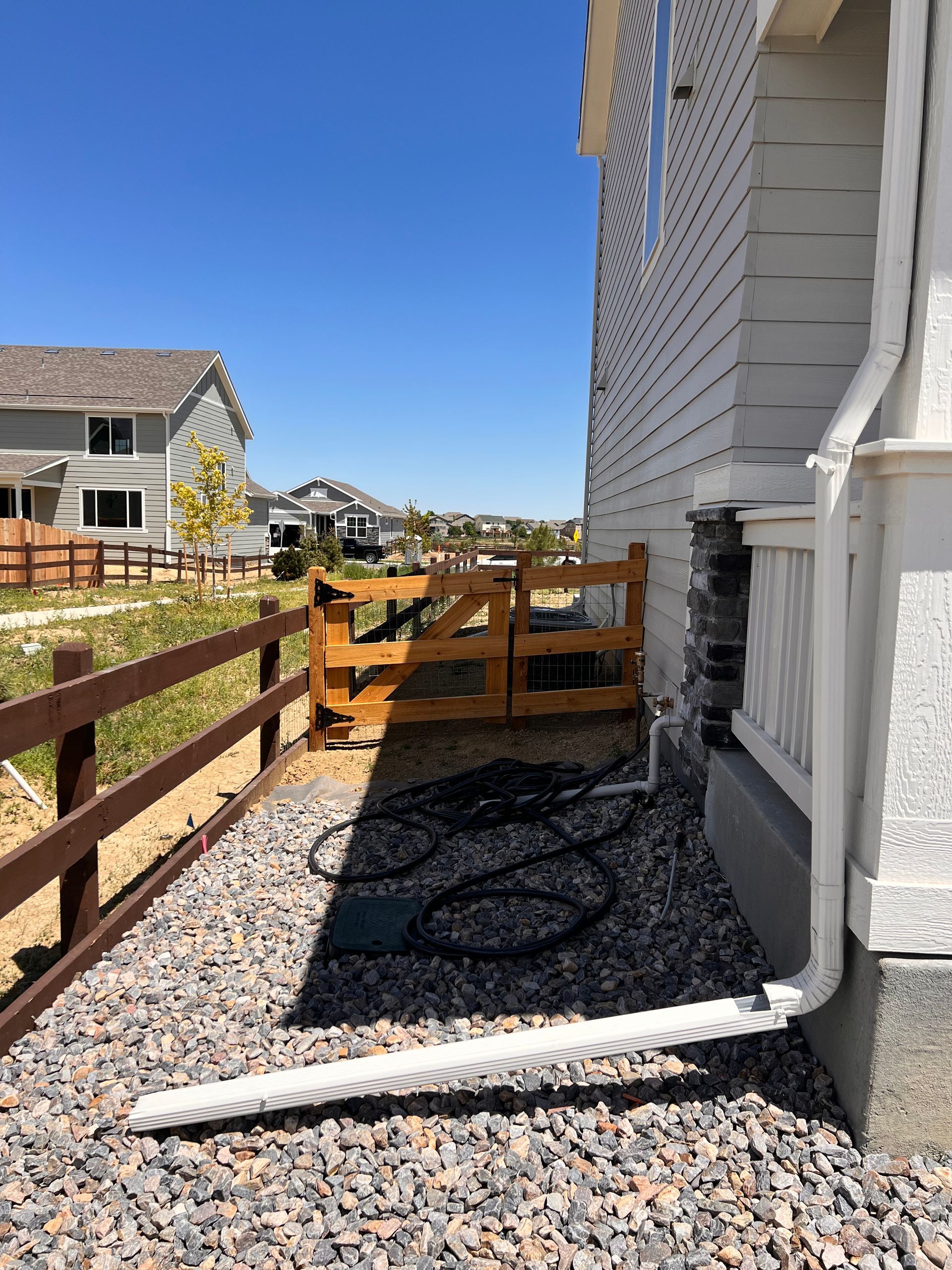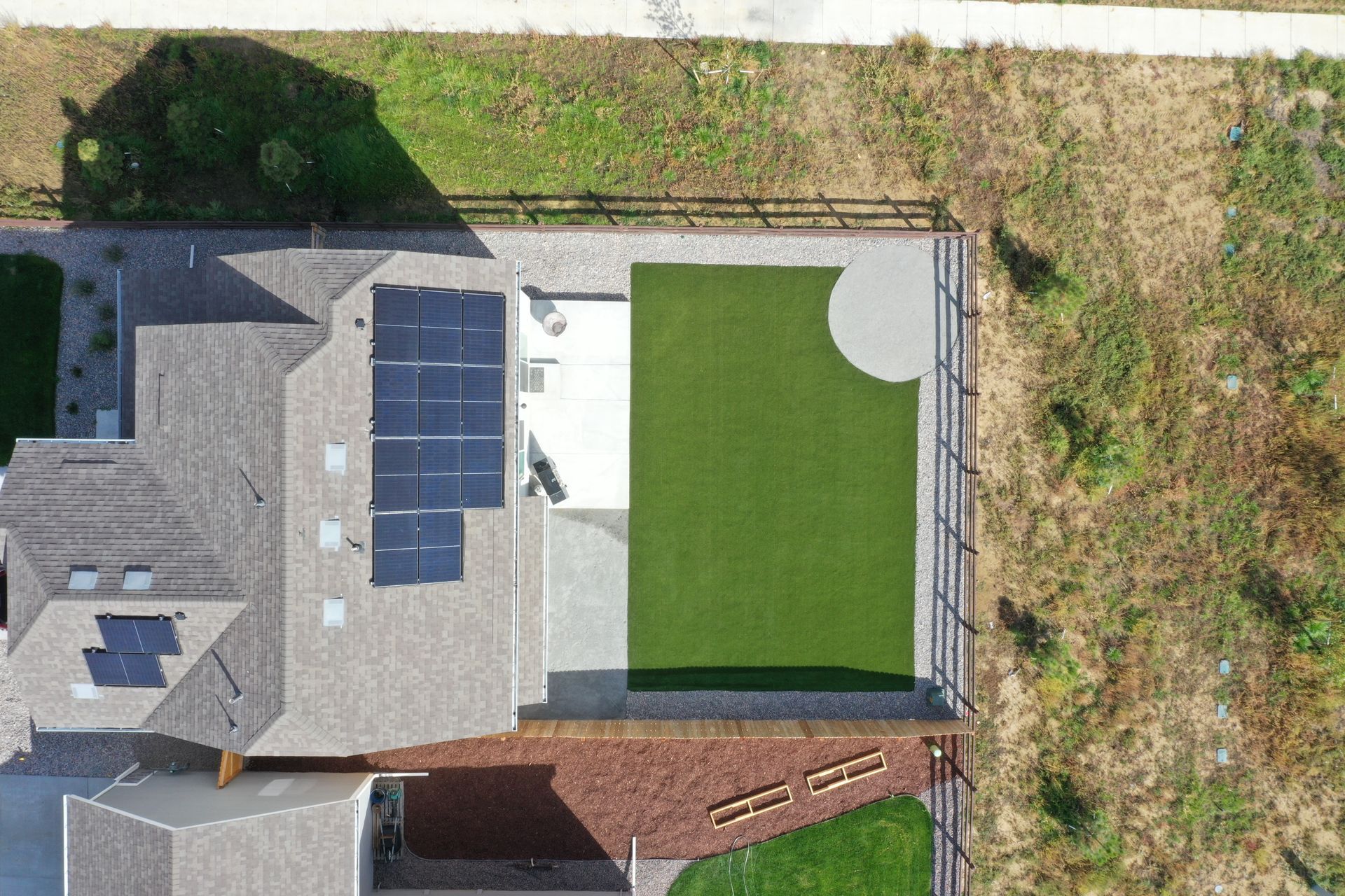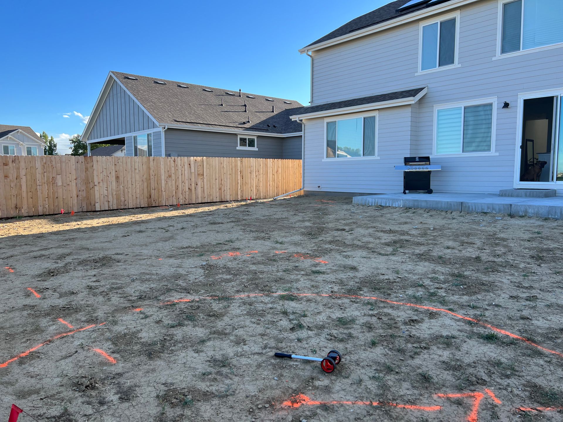 New build home with full landscaping in back yard. Artificial turf, crusher fines patio pad, decorative rock, and irrigation drip line. Mead, CO 2022