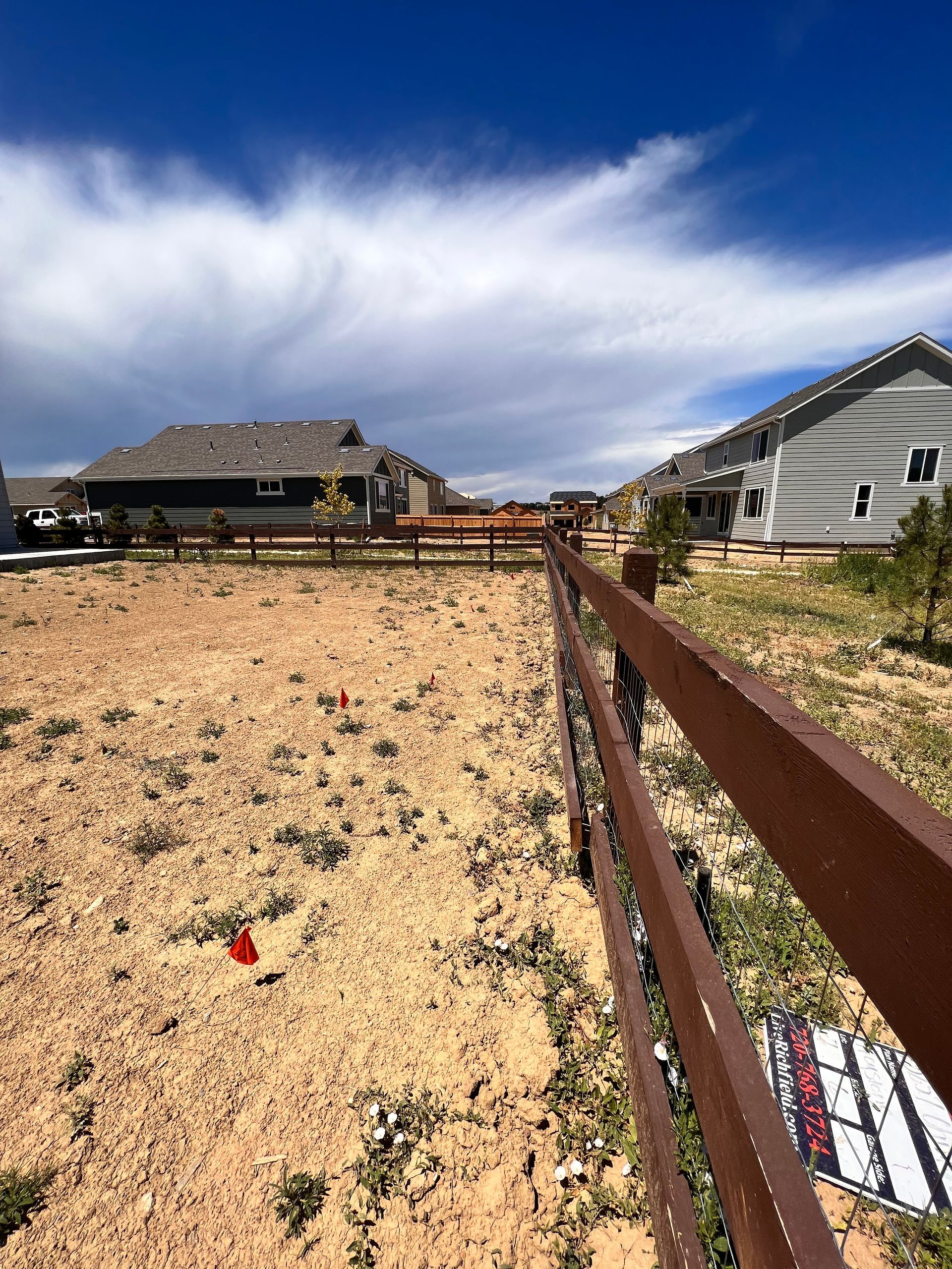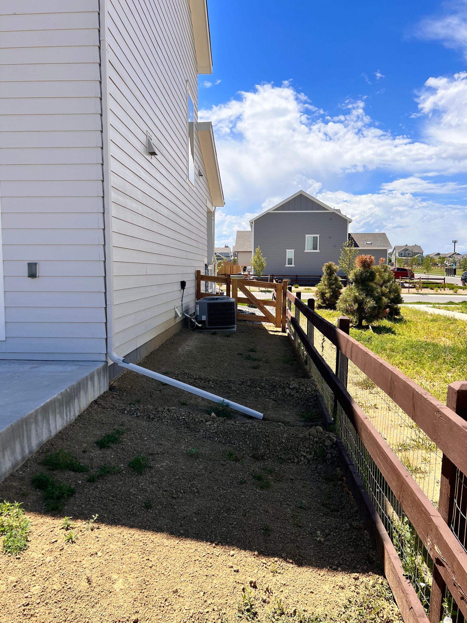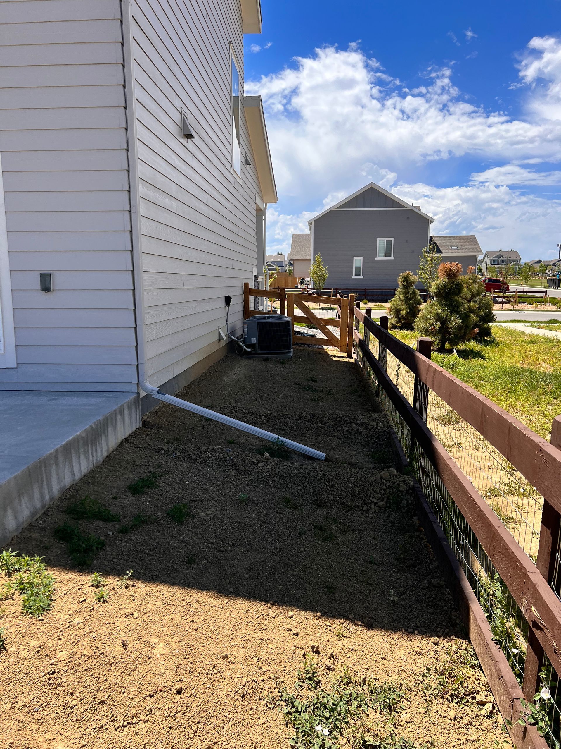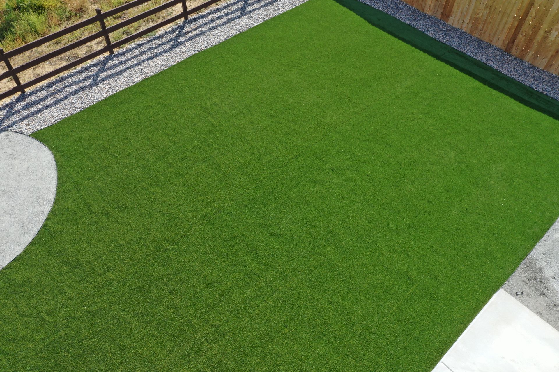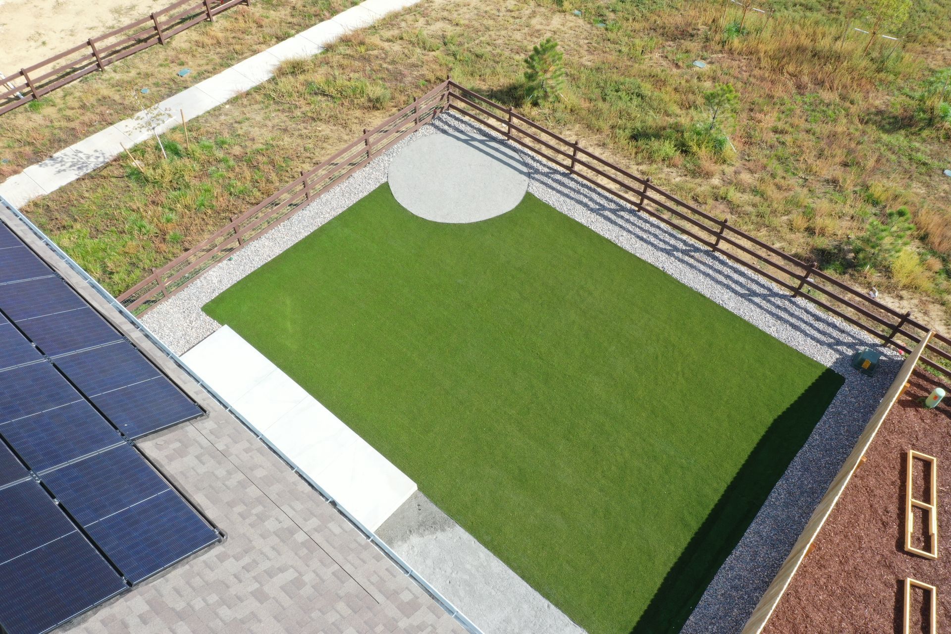 New build home with full landscaping in back yard. Artificial turf, crusher fines patio pad, decorative rock, and irrigation drip line. Mead, CO 2022