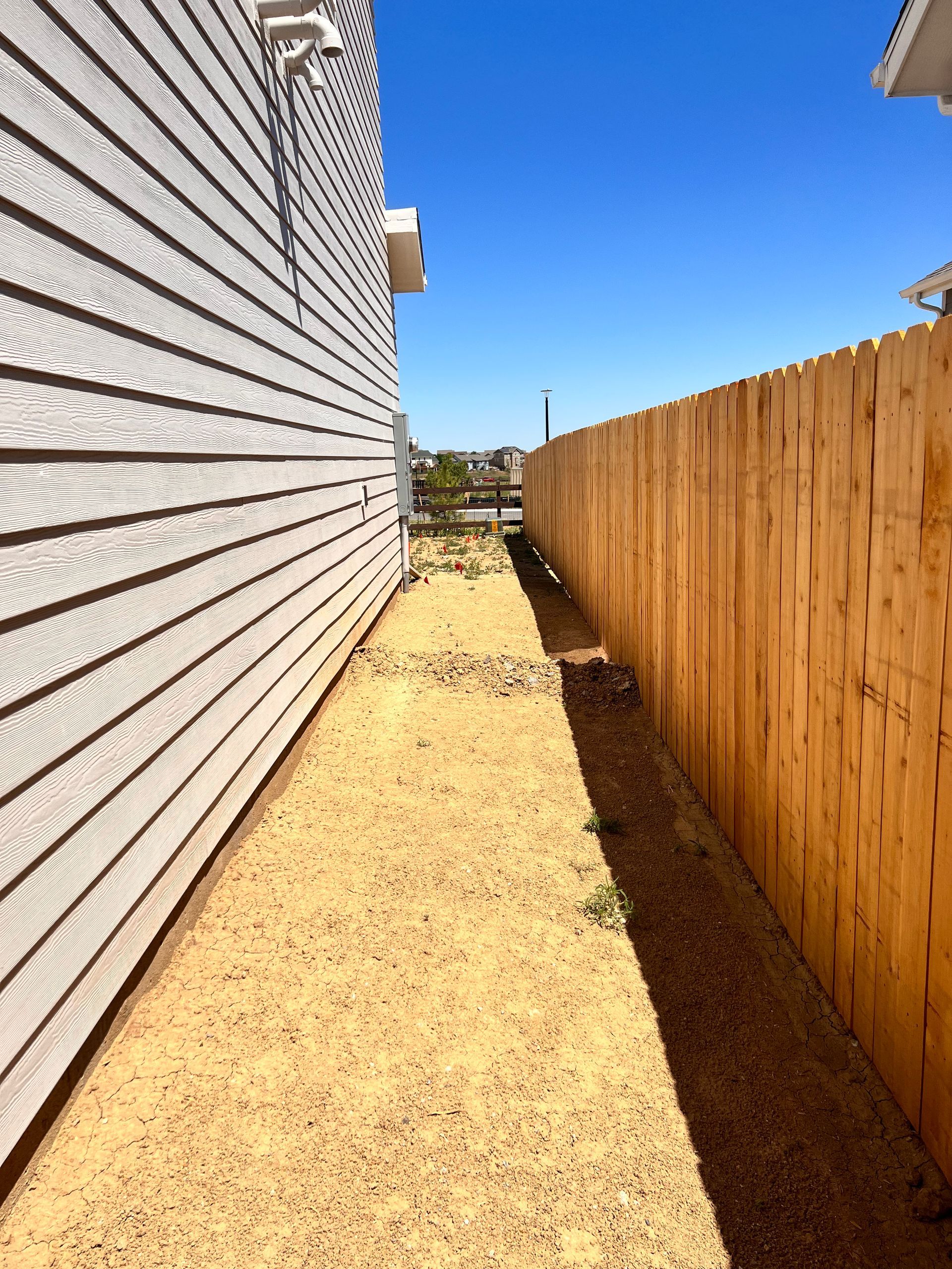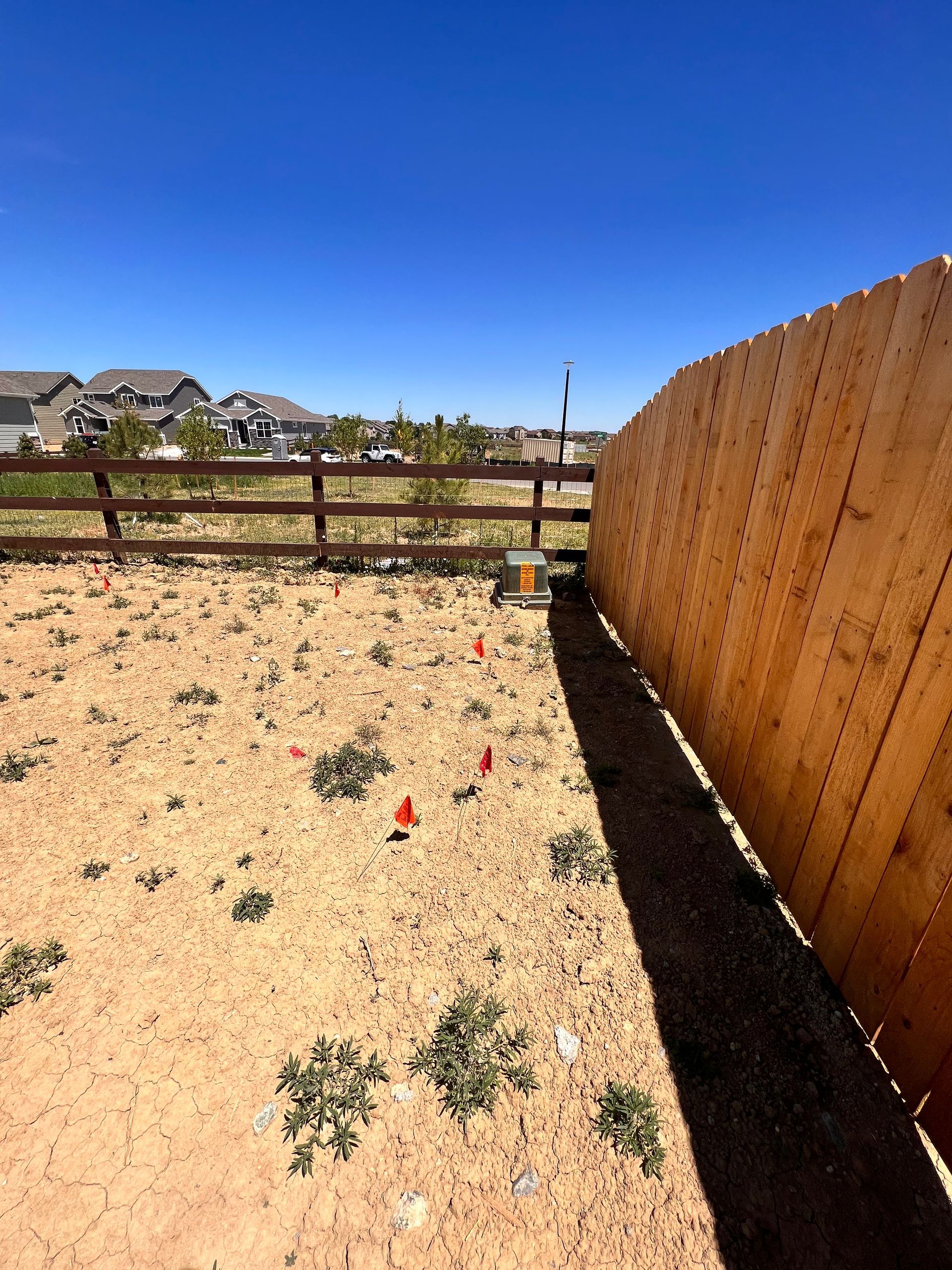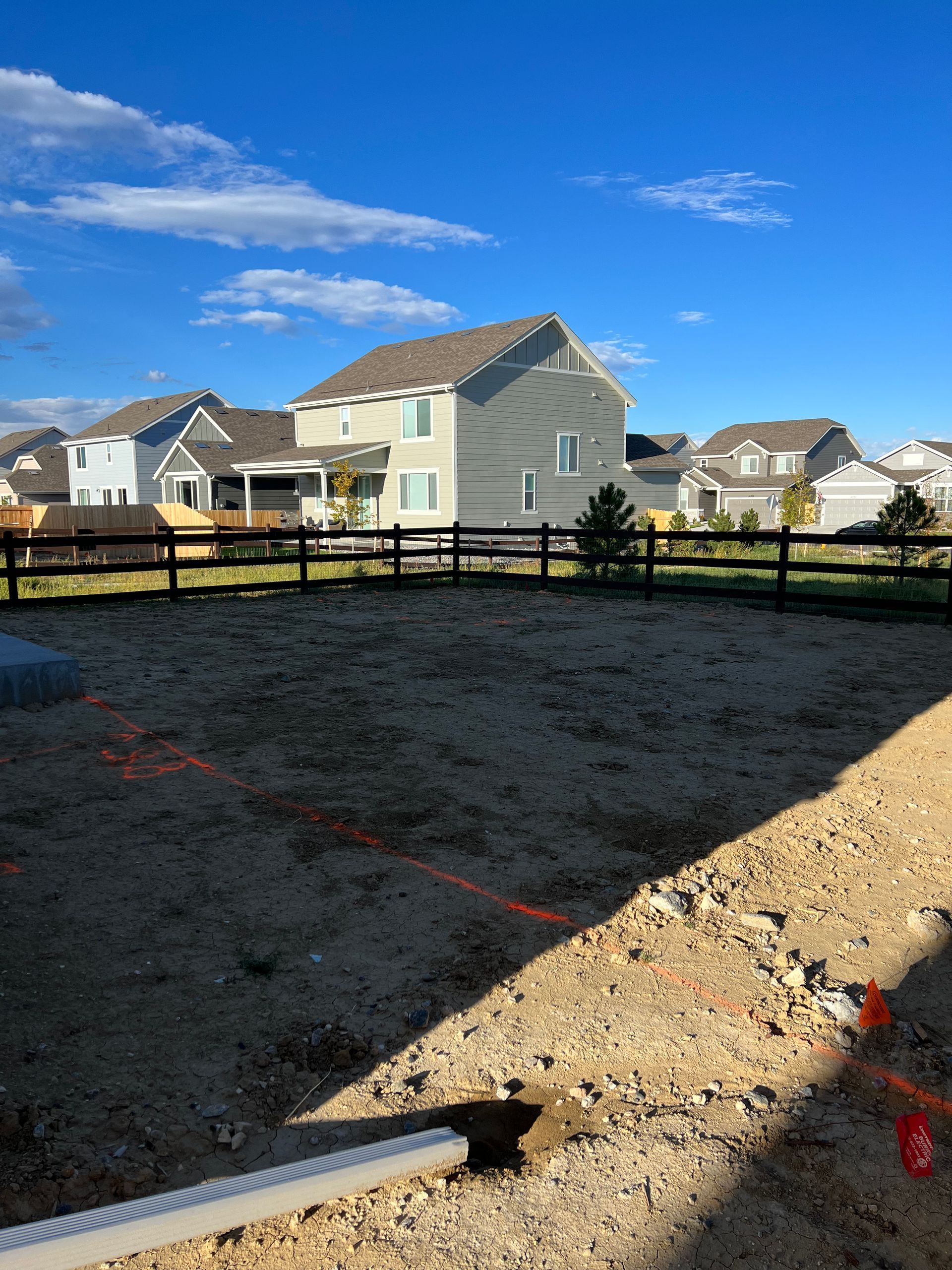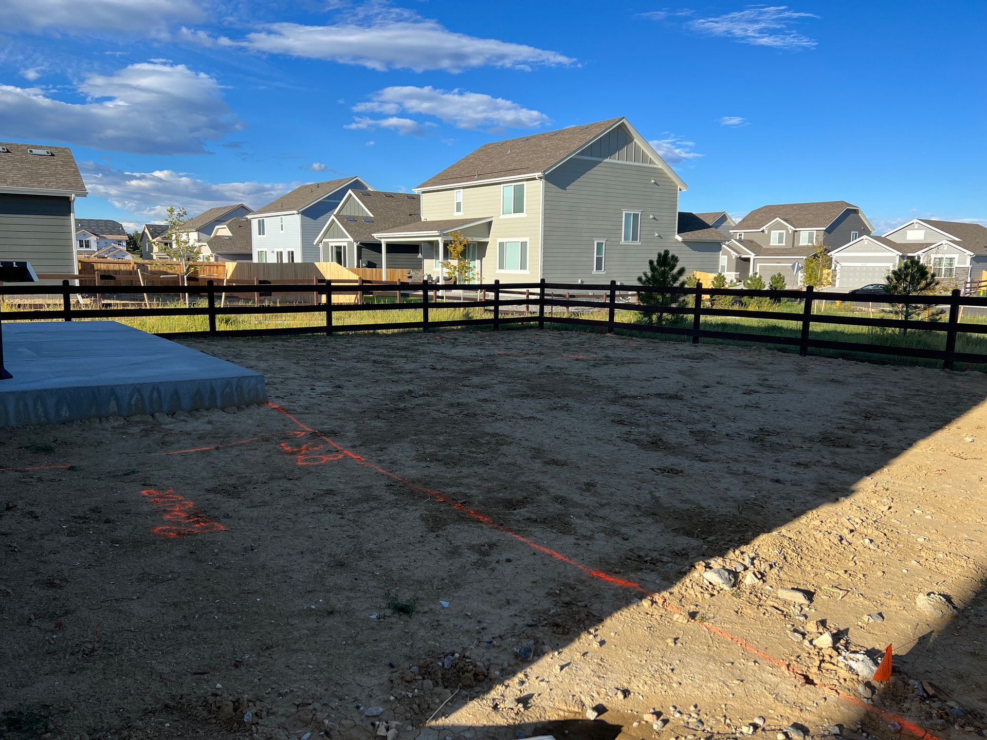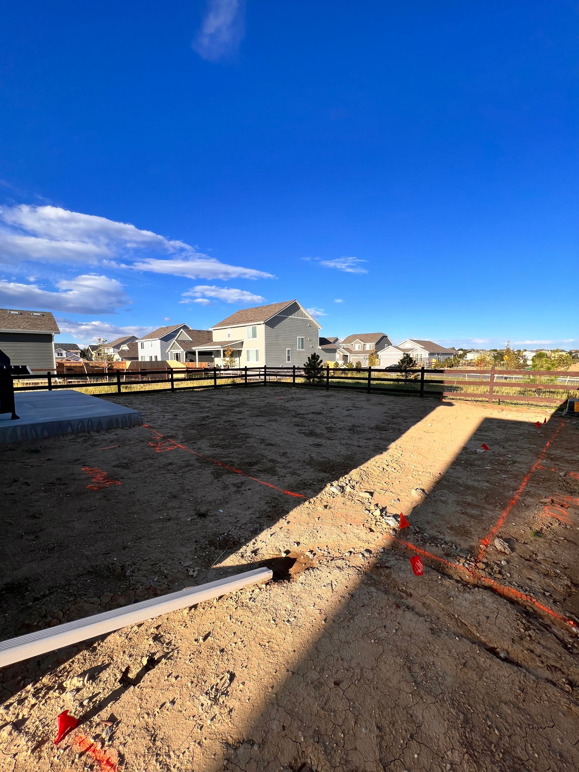 New build home with full landscaping in back yard. Artificial turf, crusher fines patio pad, decorative rock, and irrigation drip line. Mead, CO 2022