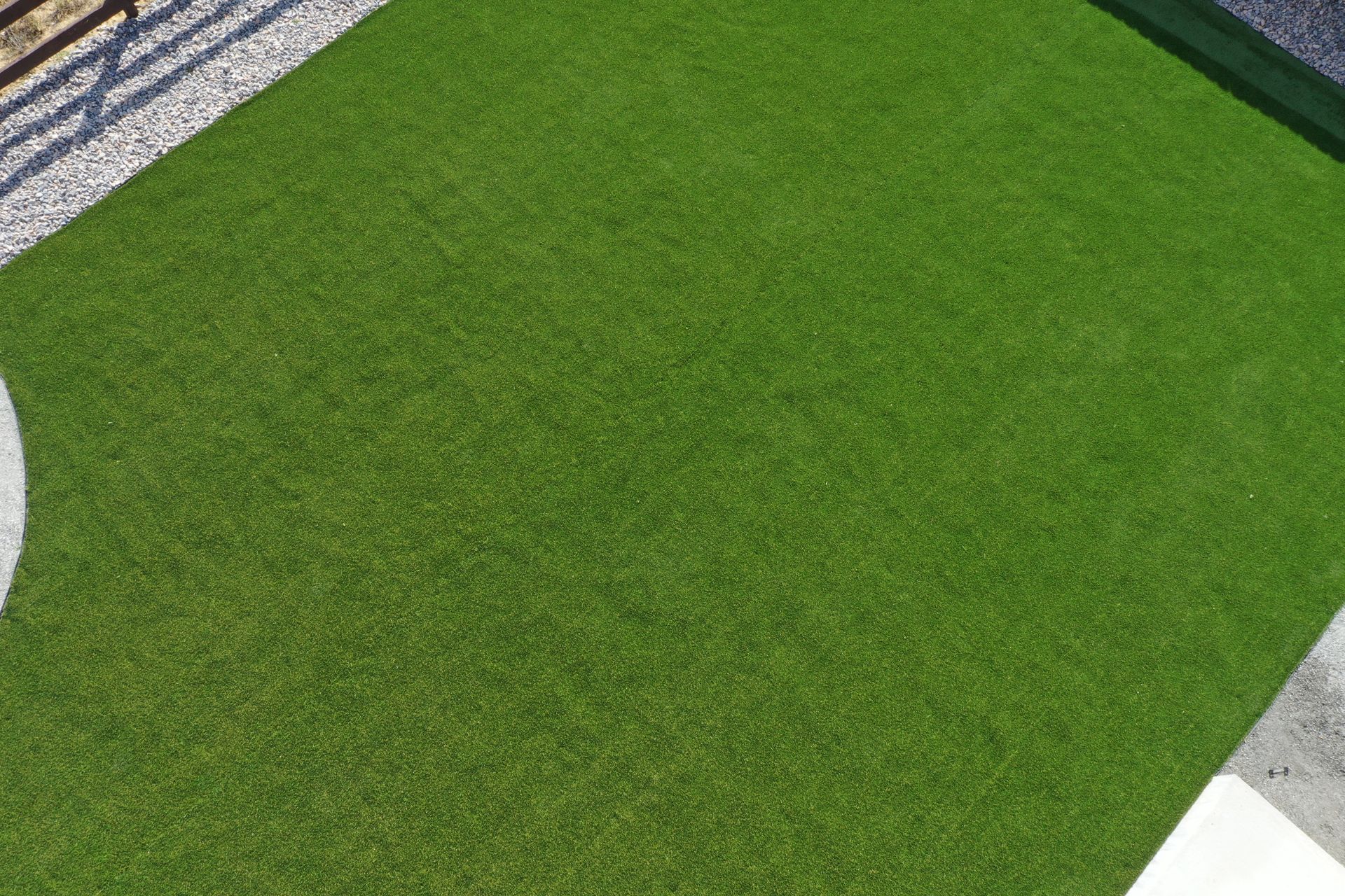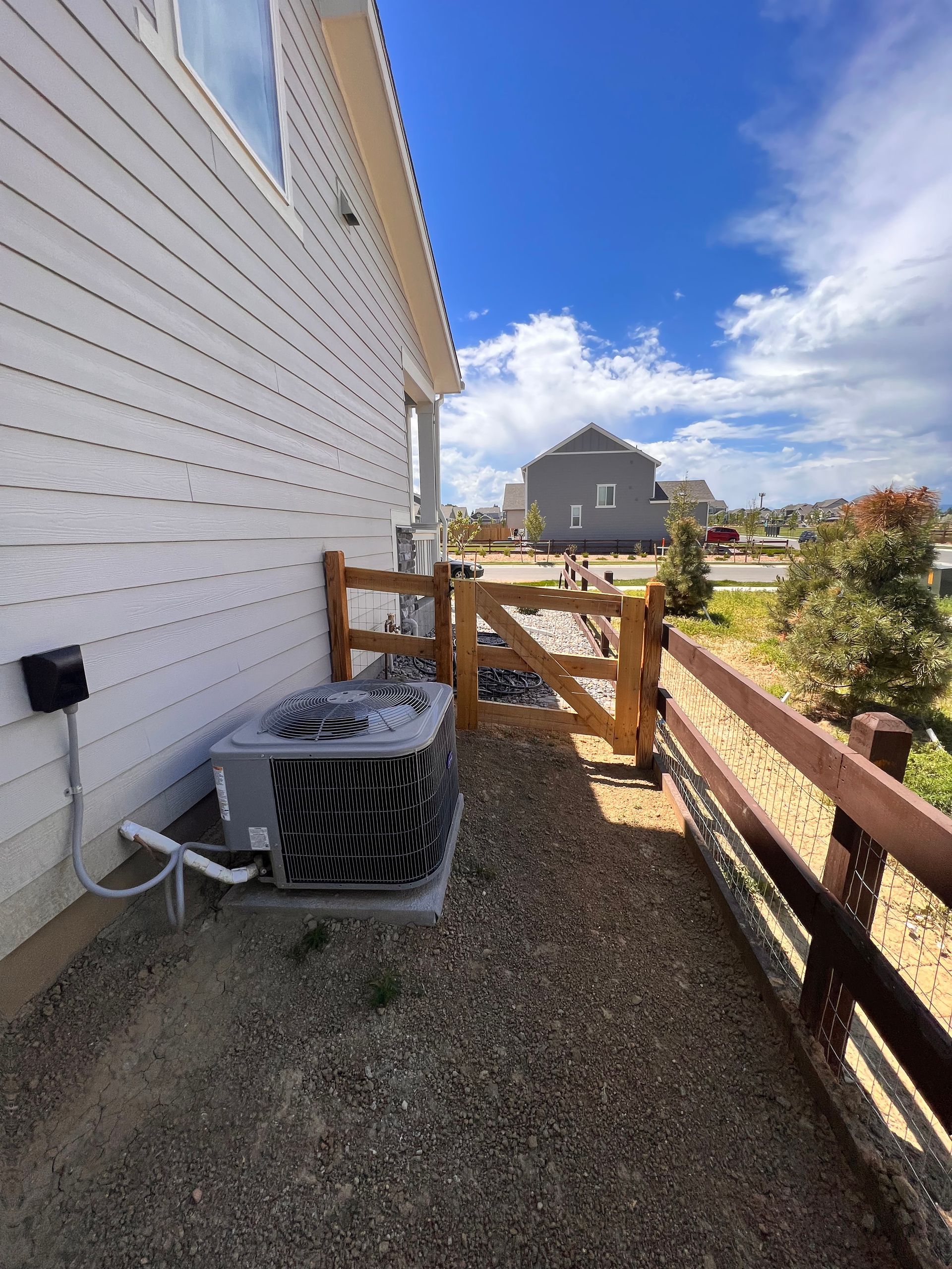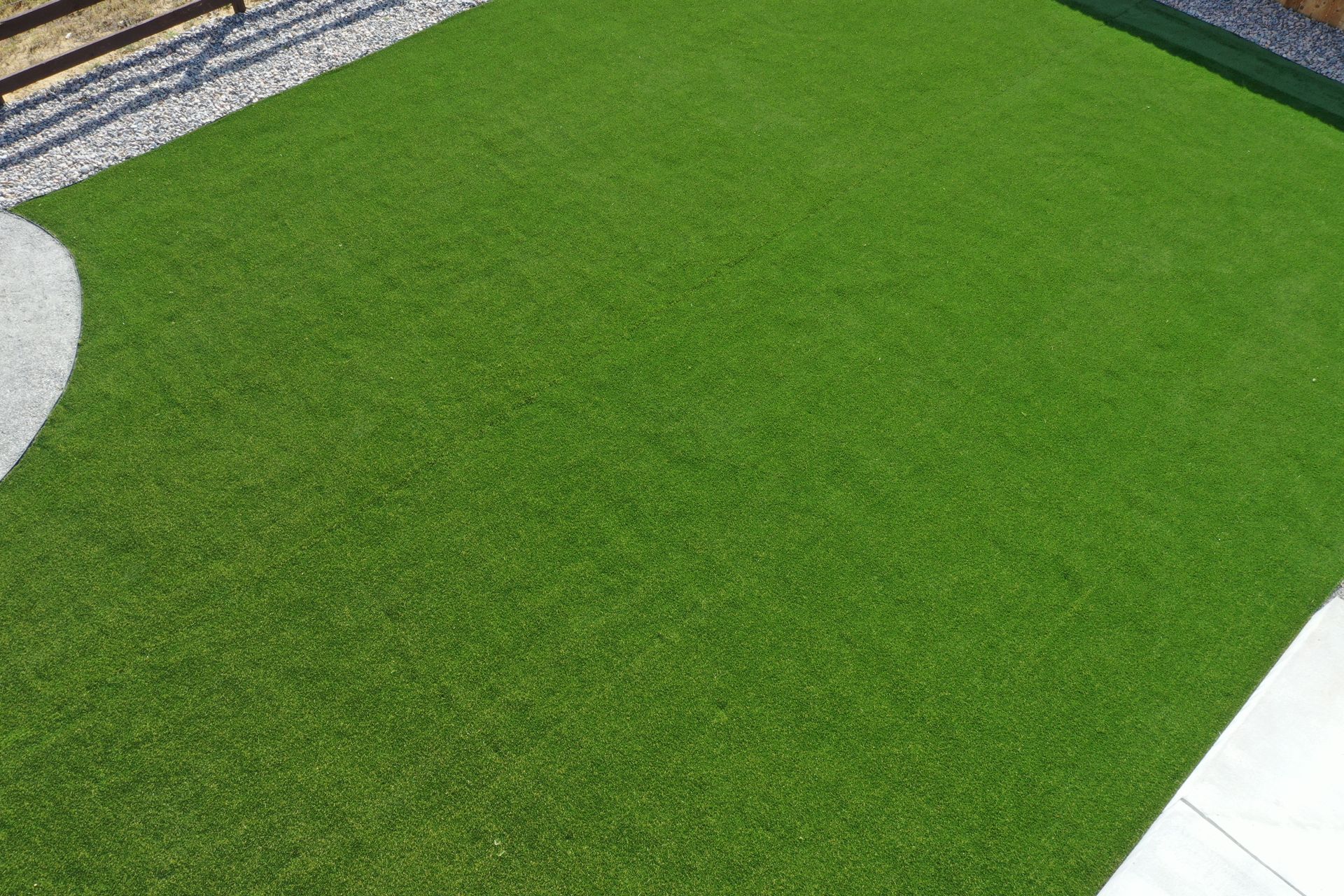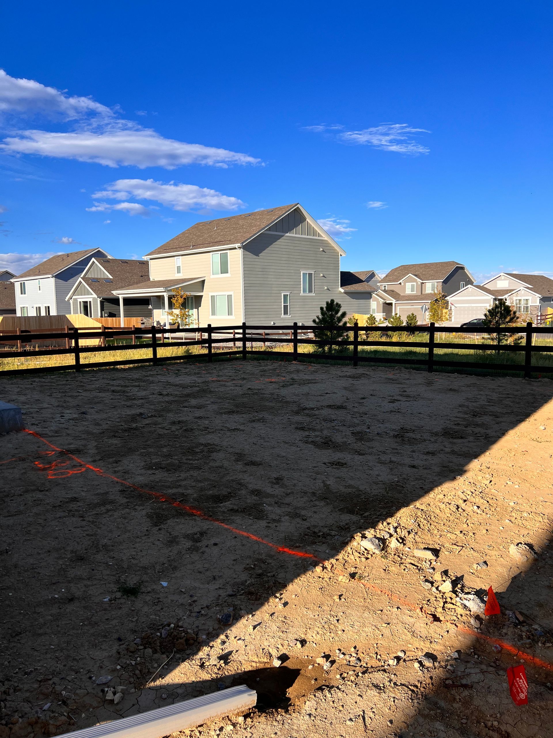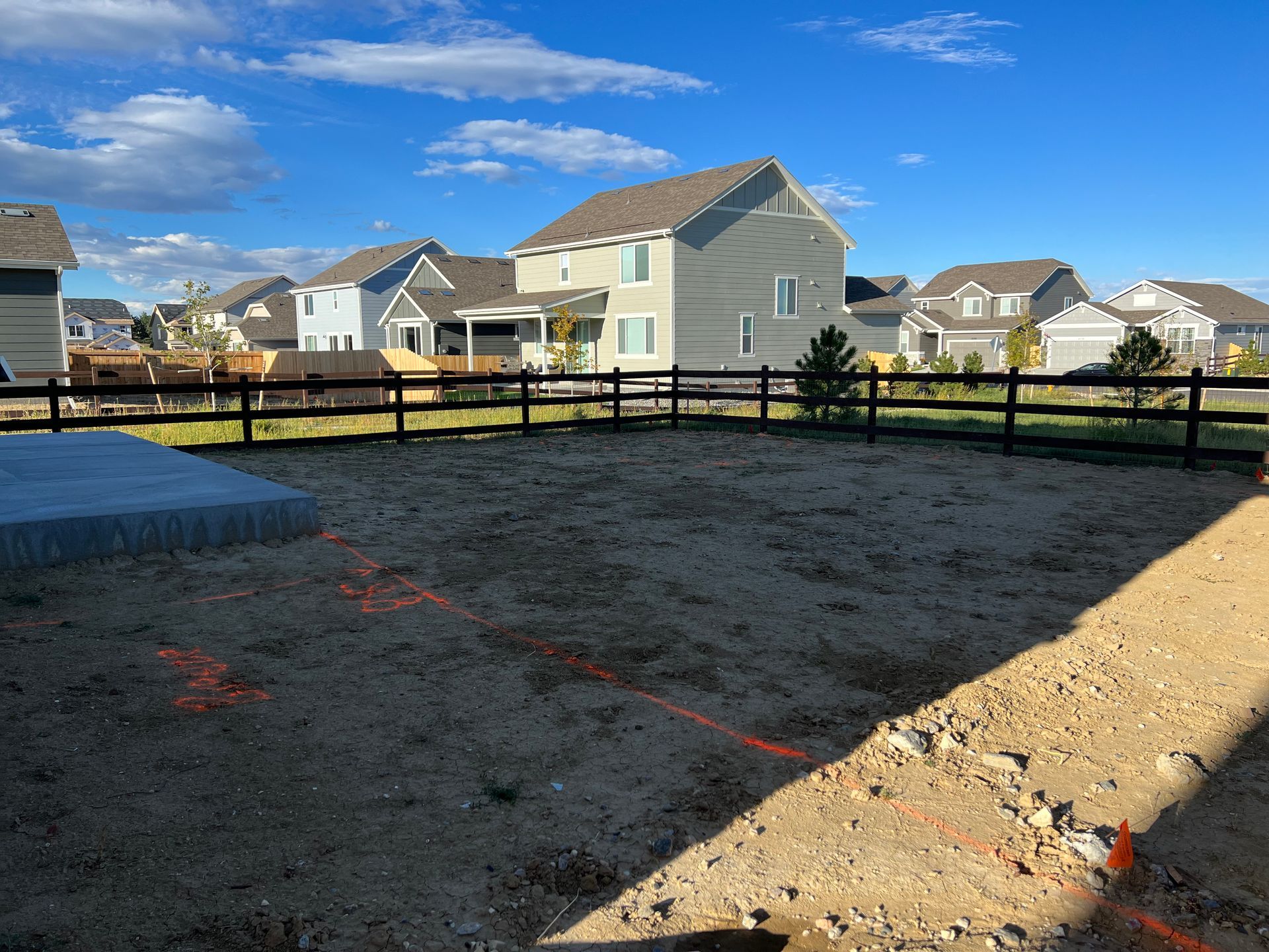 New build home with full landscaping in back yard. Artificial turf, crusher fines patio pad, decorative rock, and irrigation drip line. Mead, CO 2022