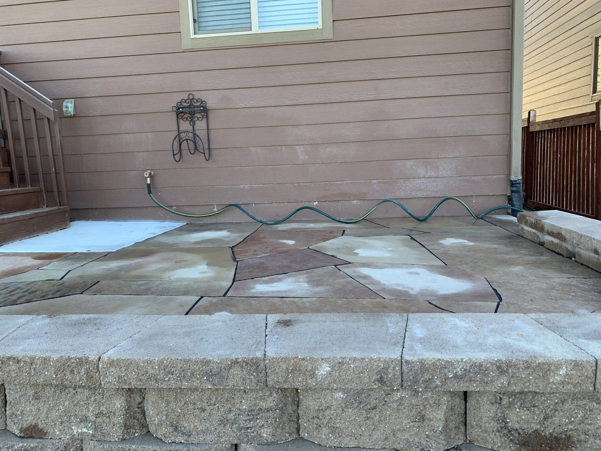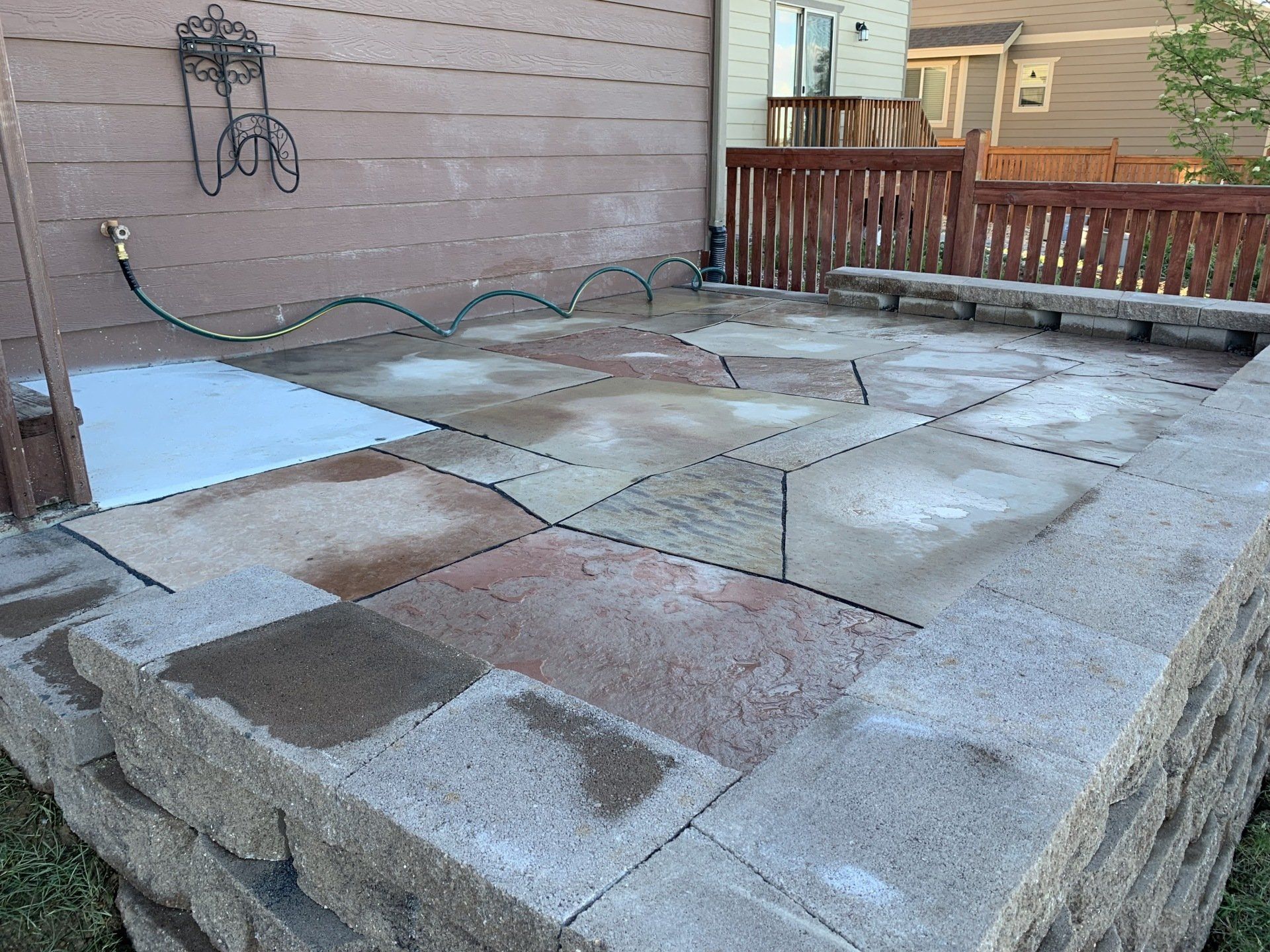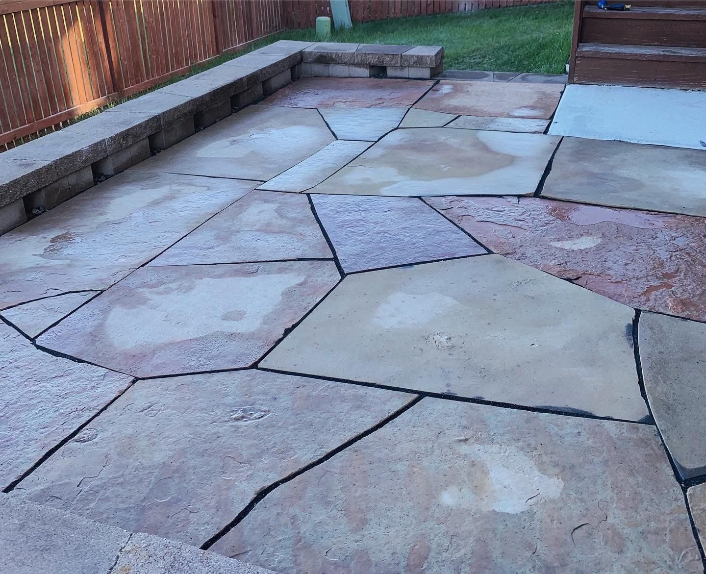 Built to last raised Colorado Buff flagstone patio installed with beautiful natural patterns. Black polymeric sand added between joints to add incredible aesthetic appeal.