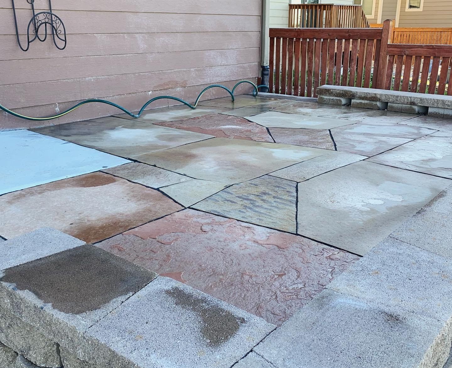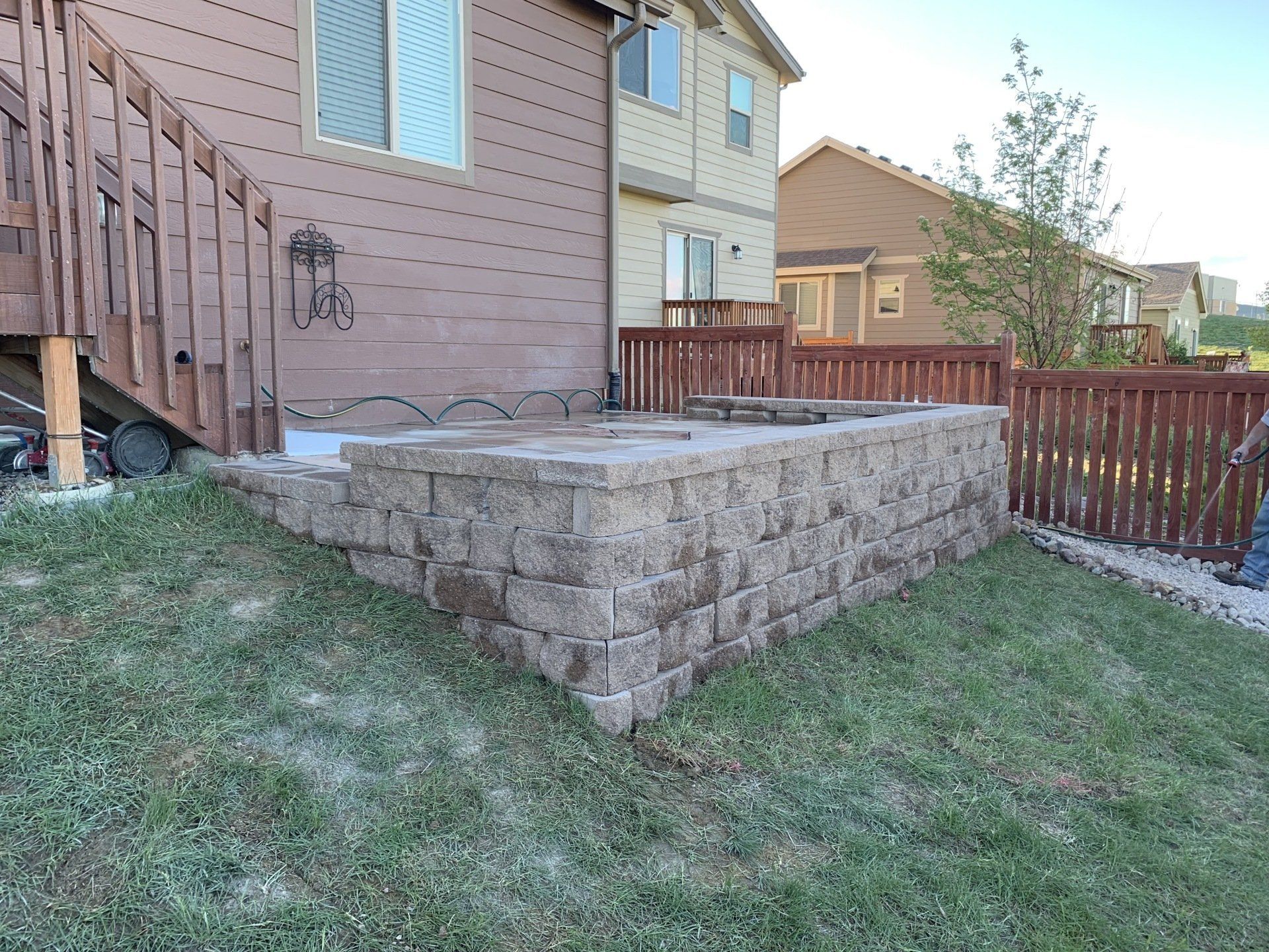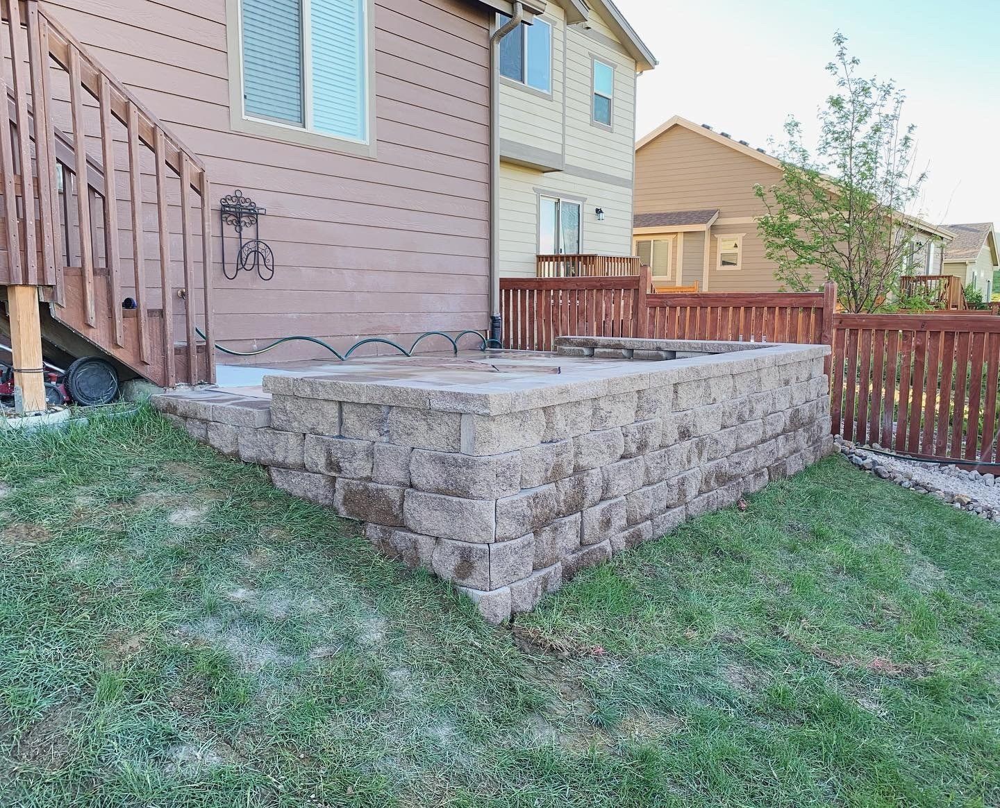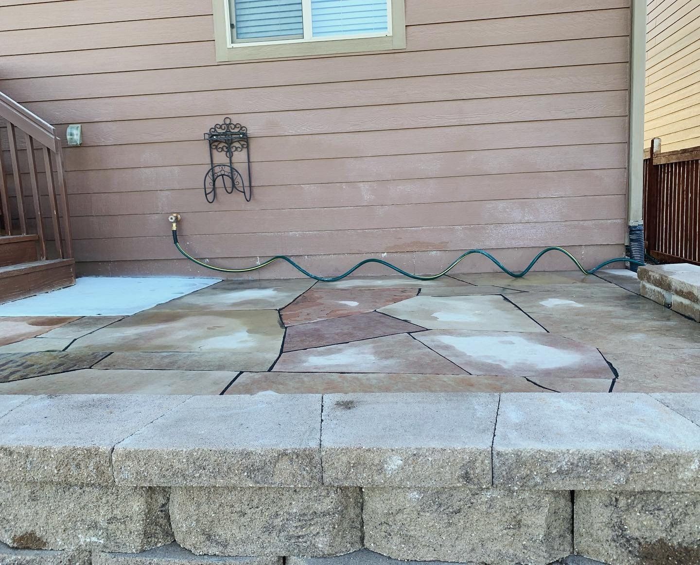 Built to last raised Colorado Buff flagstone patio installed with beautiful natural patterns. Black polymeric sand added between joints to add incredible aesthetic appeal.