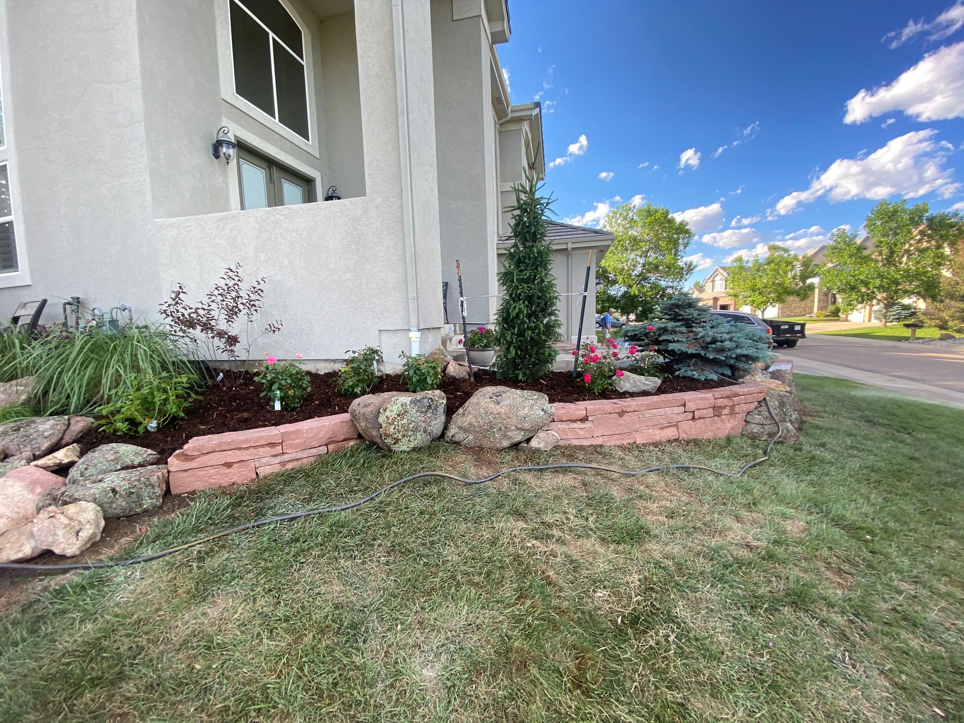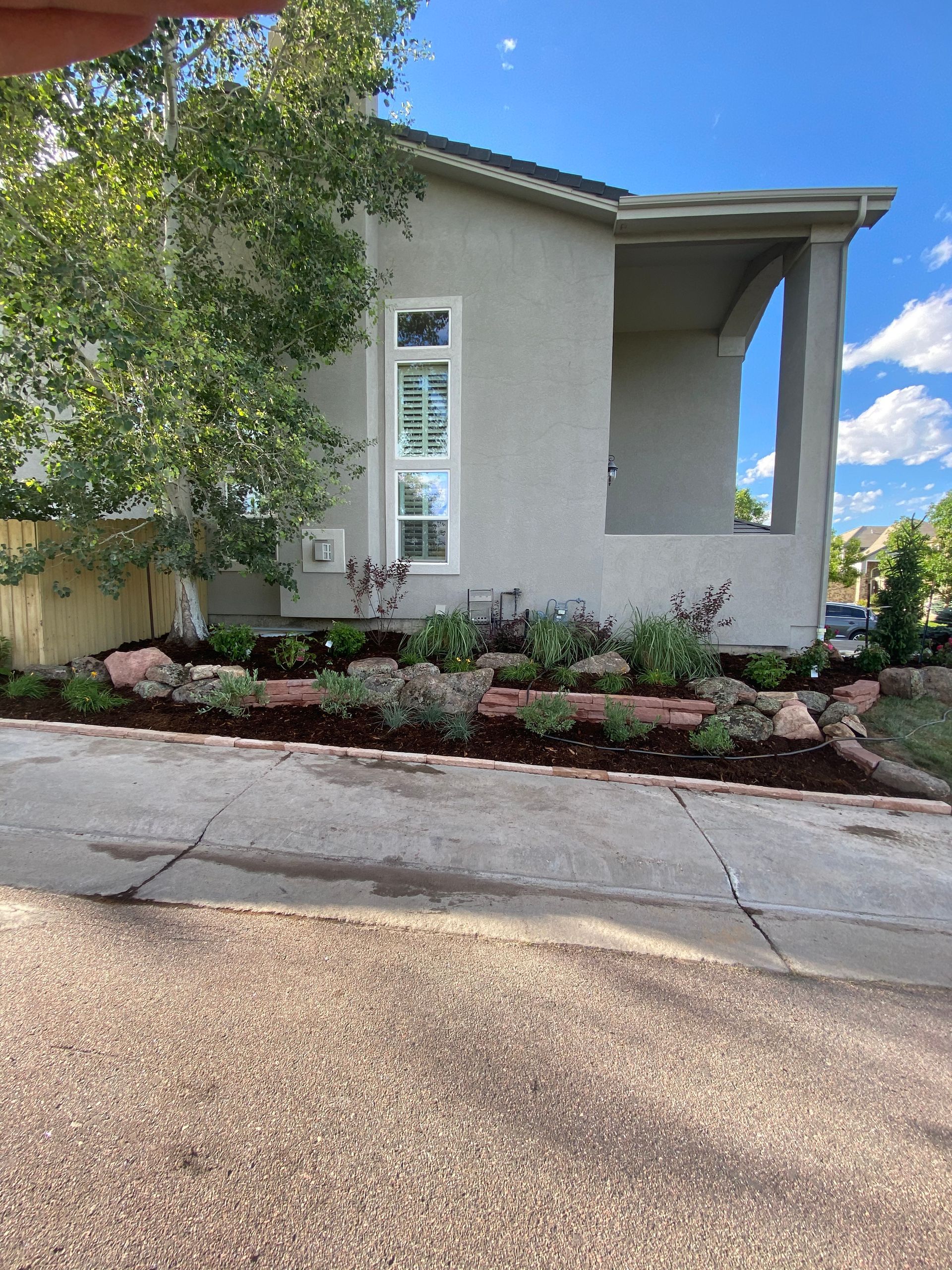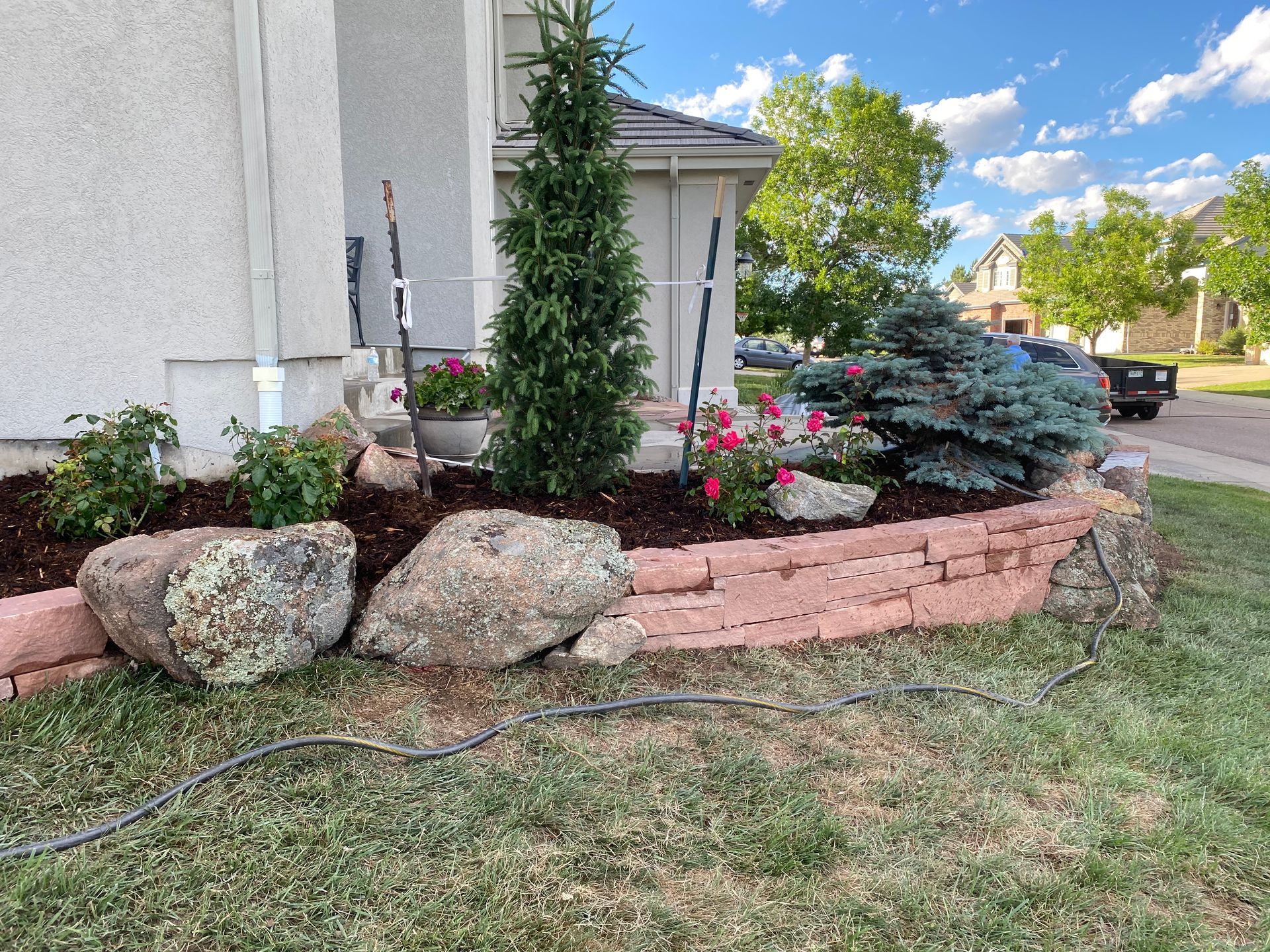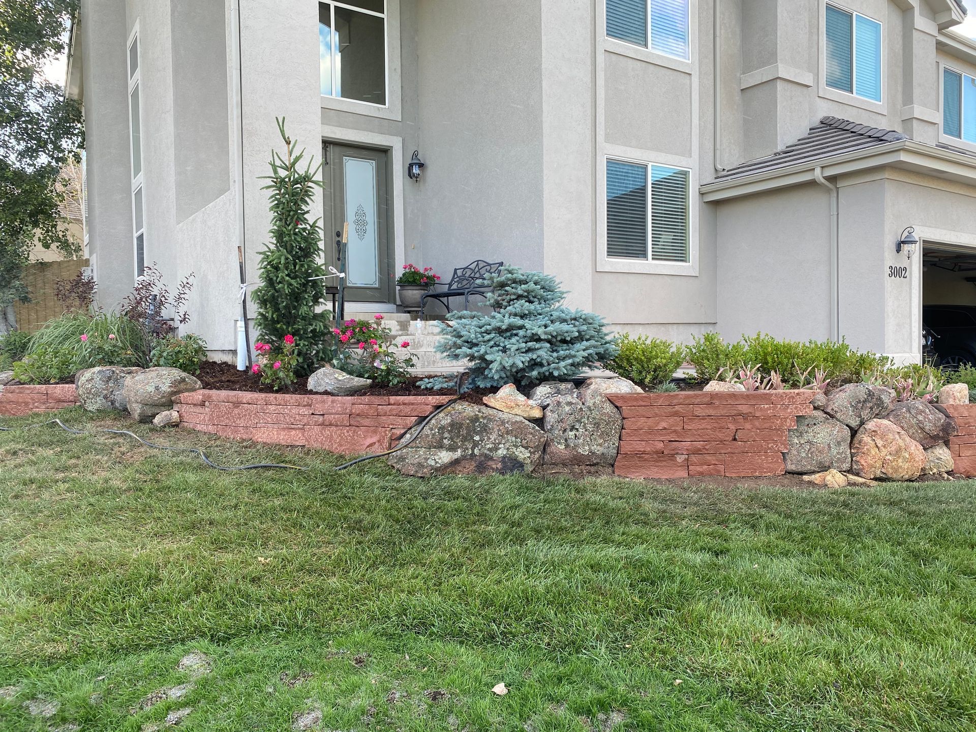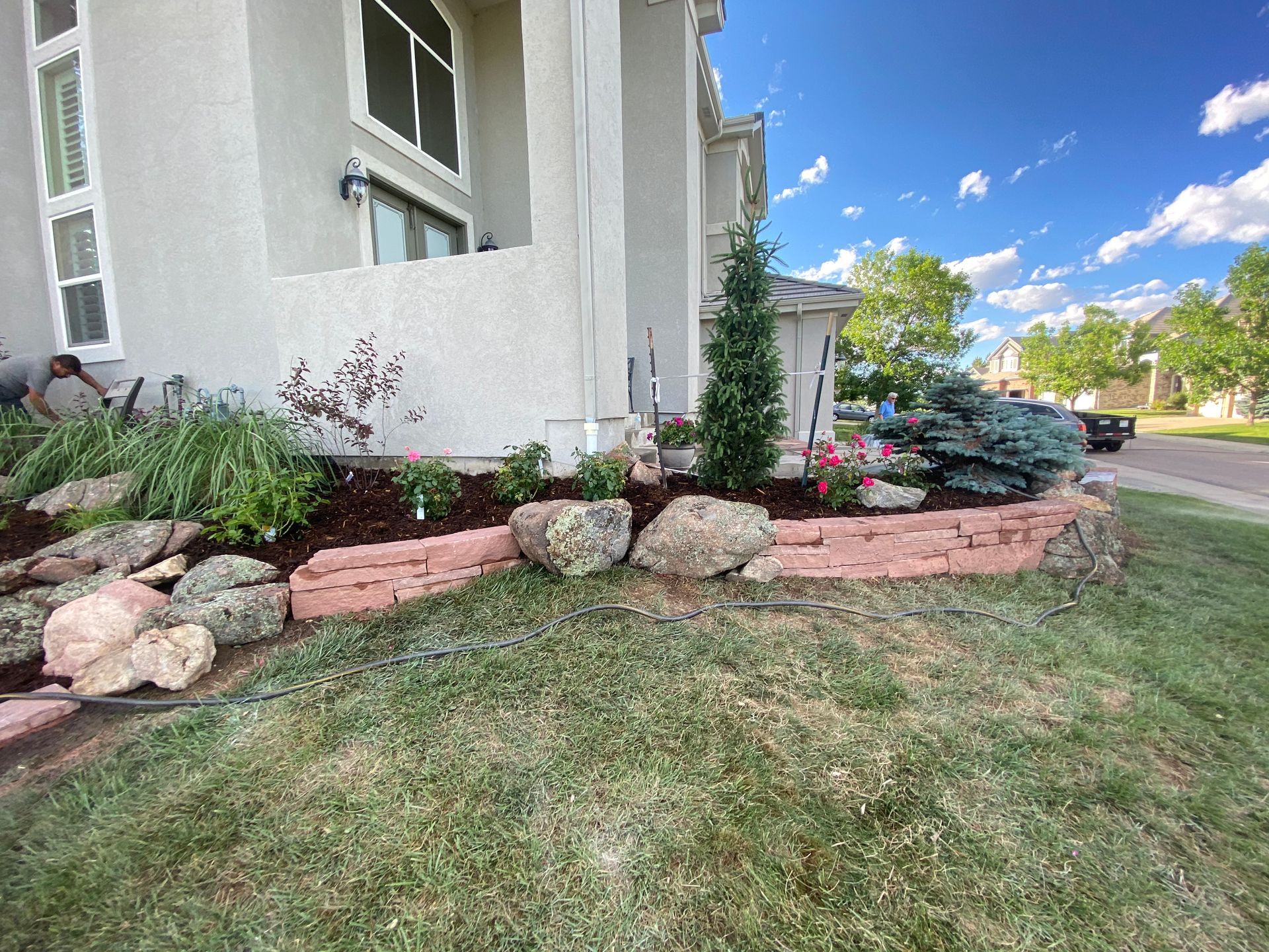 Major changes to existing landscape. Curb appeal using dry stacked Colorado red stripstone, new plants & trees, and mulch. Superior, CO 2020