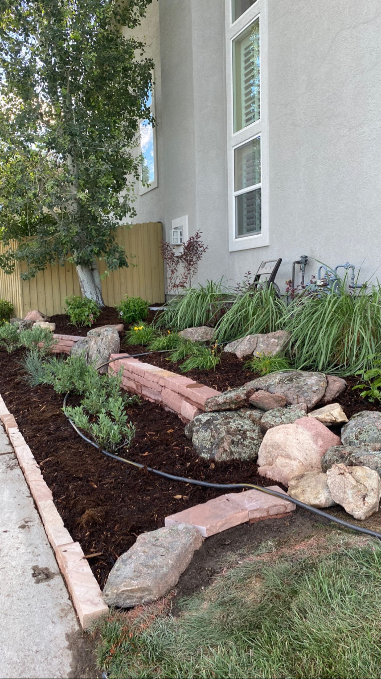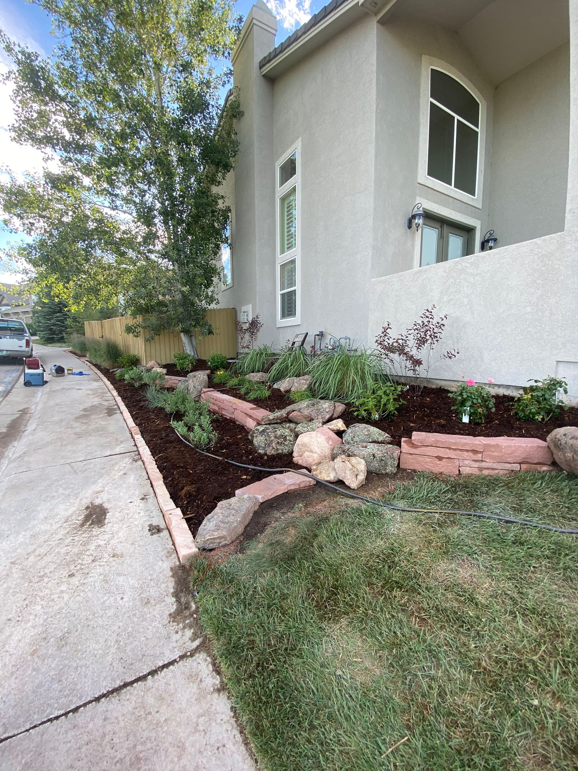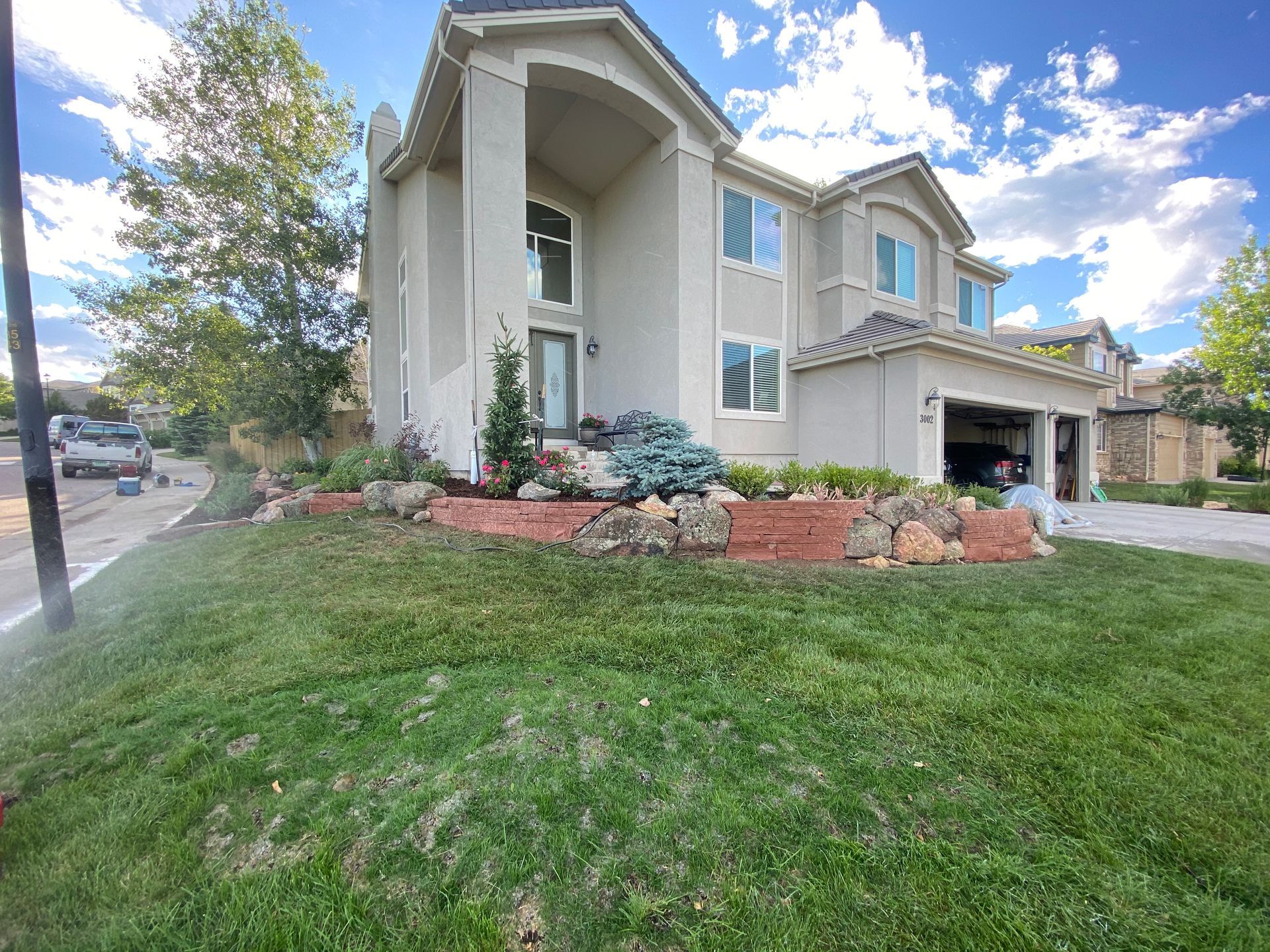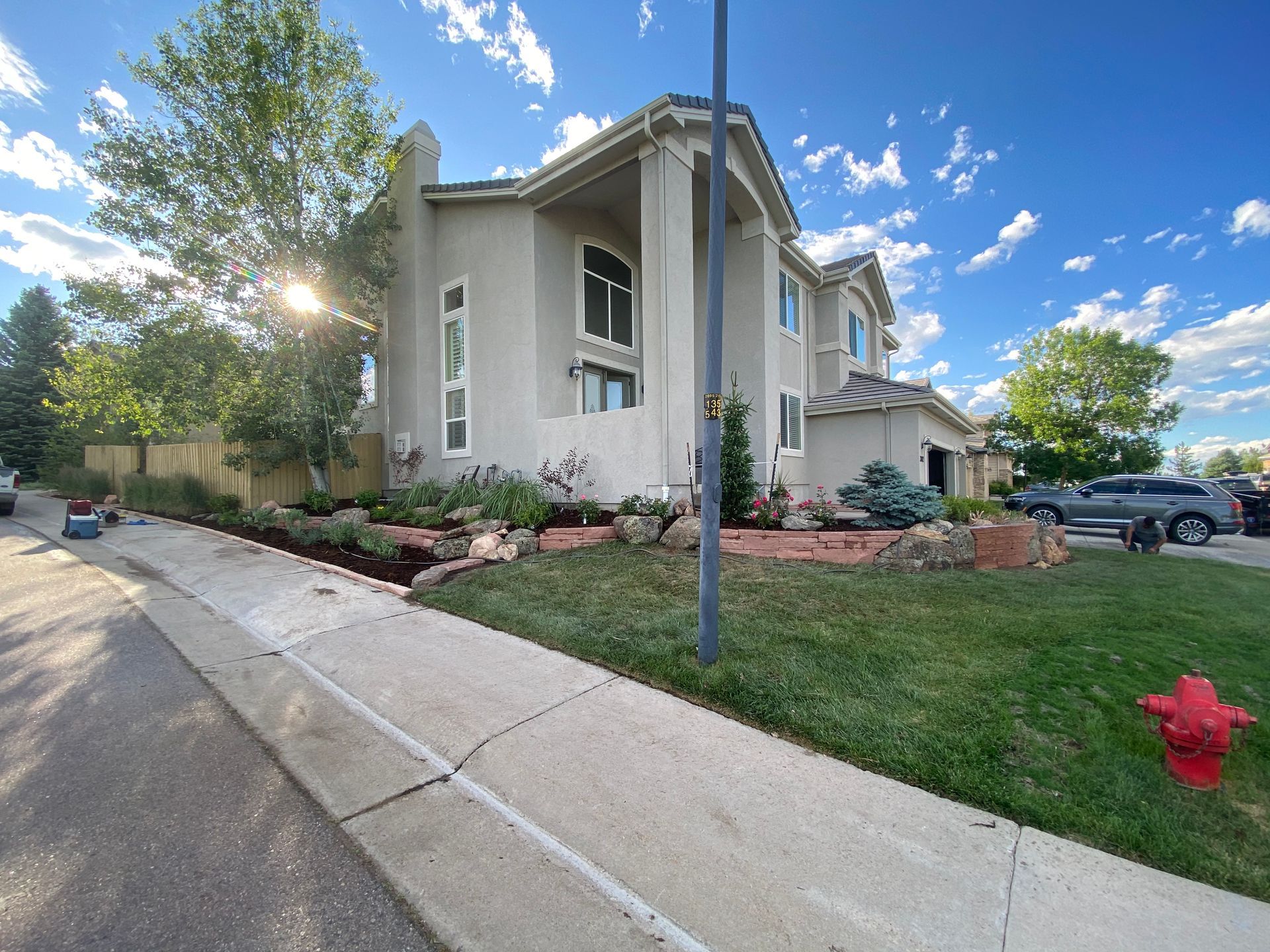 Major changes to existing landscape. Curb appeal using dry stacked Colorado red stripstone, new plants & trees, and mulch. Superior, CO 2020