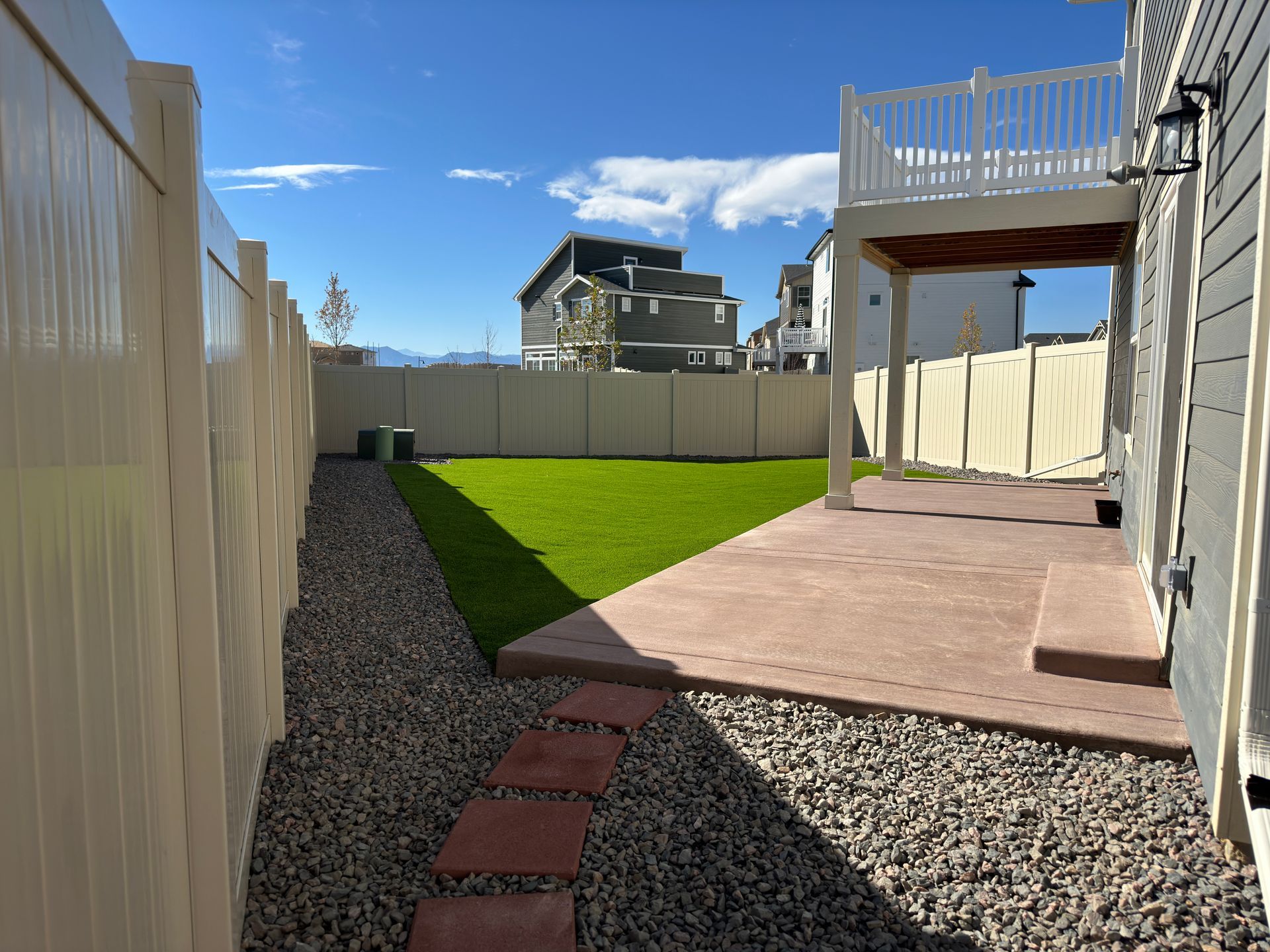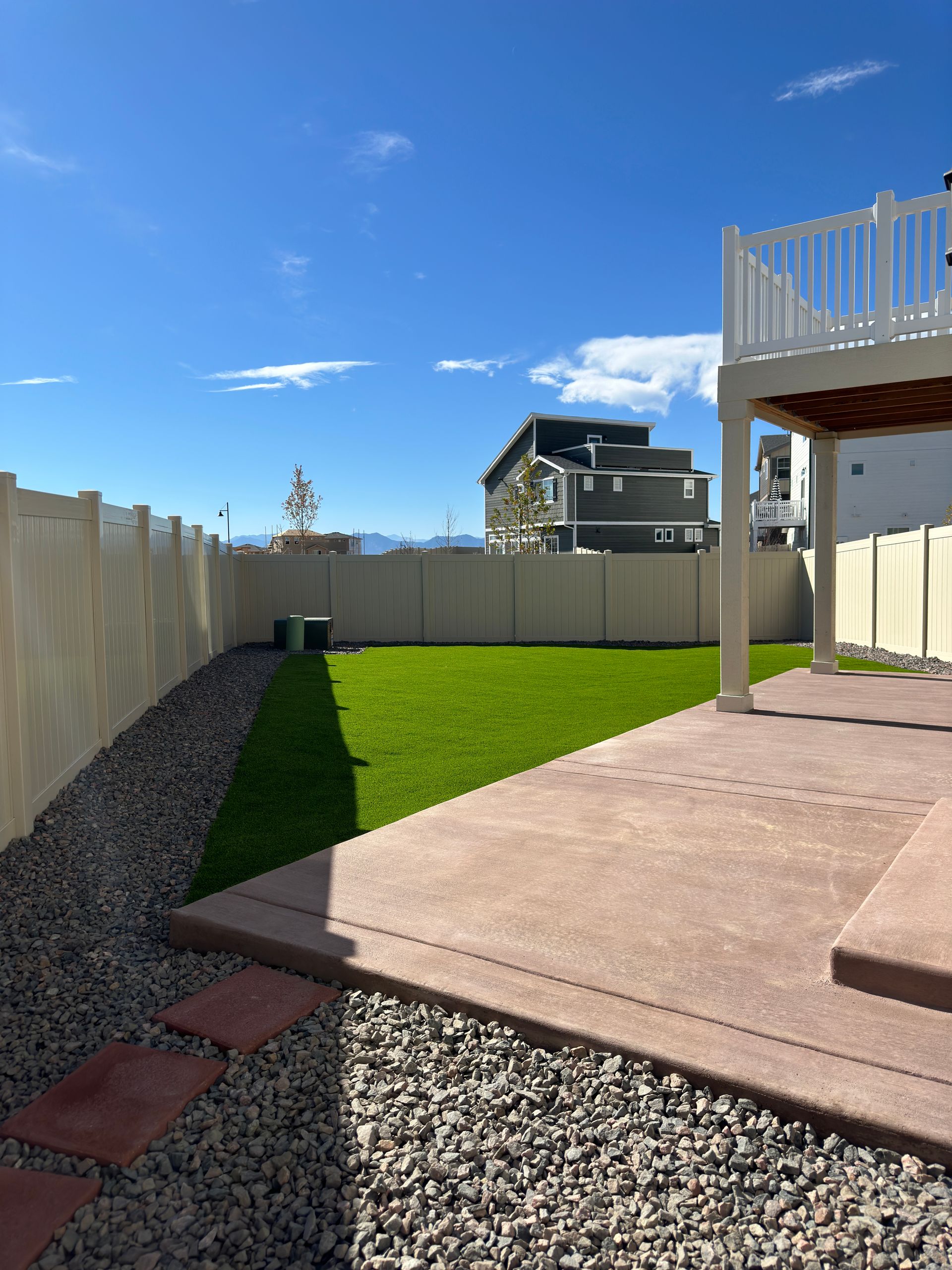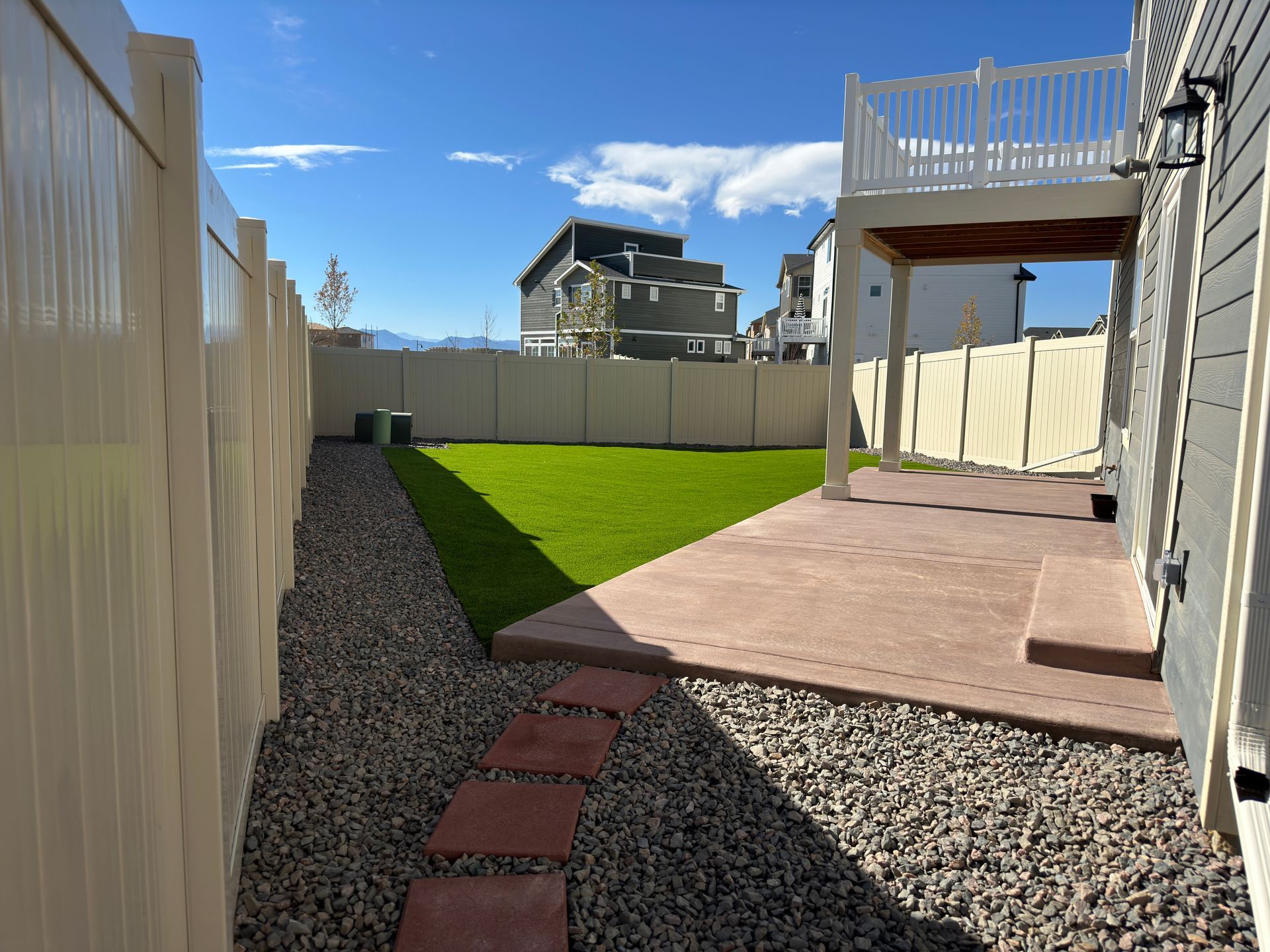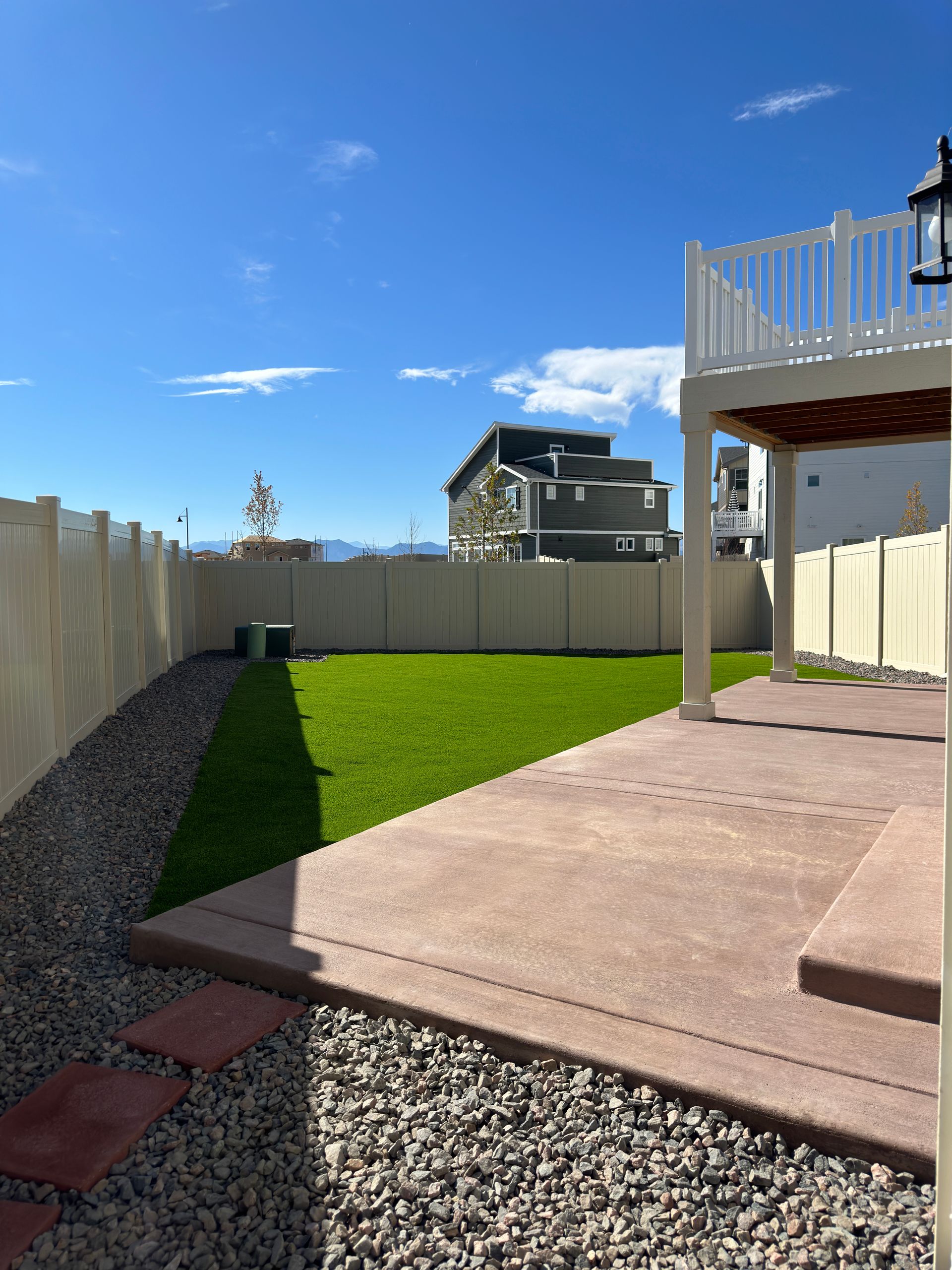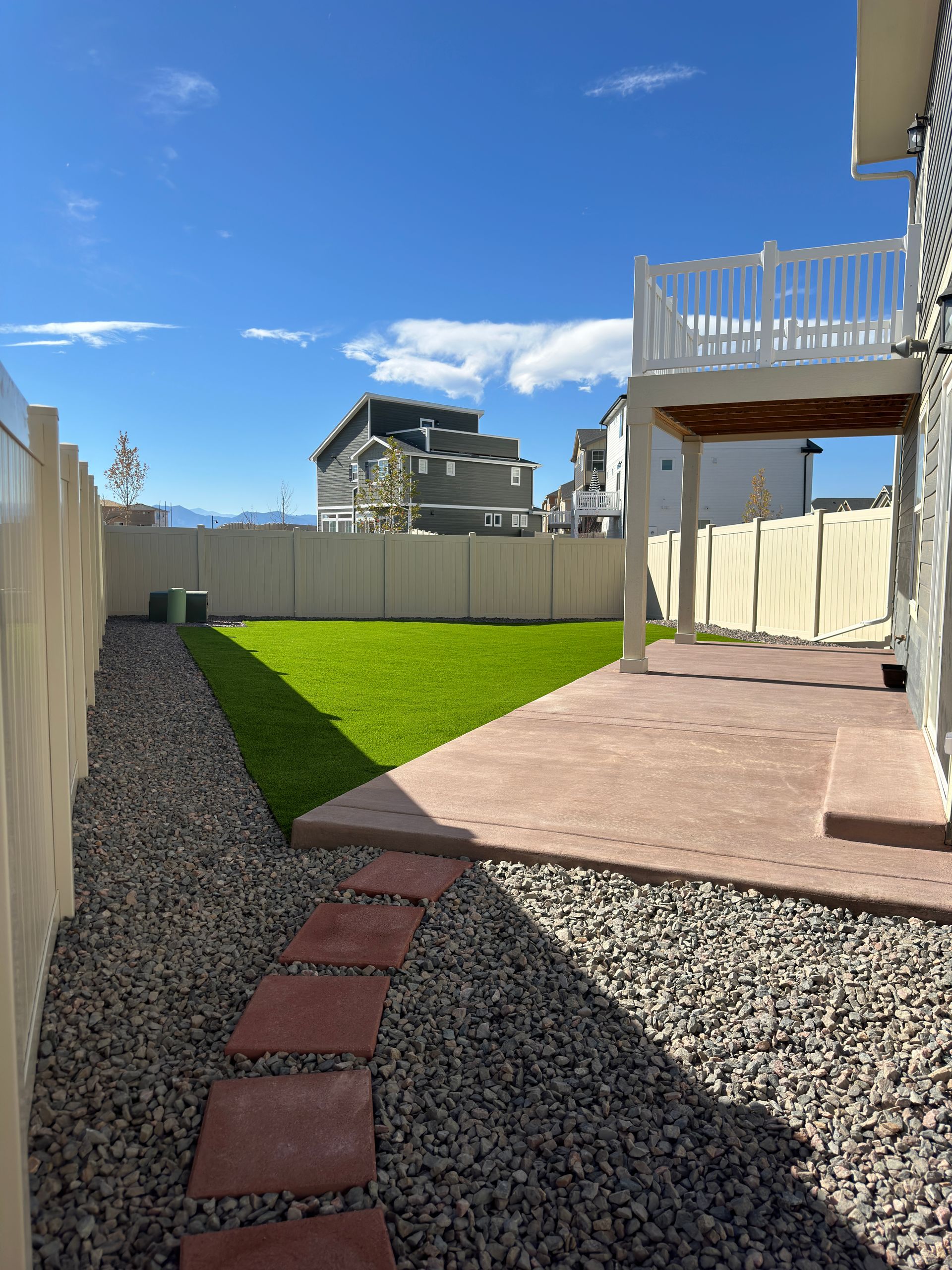Newly built home with addition of colored concrete patio, artificial turf, irrigation for plants, and rock. Erie, CO 2022