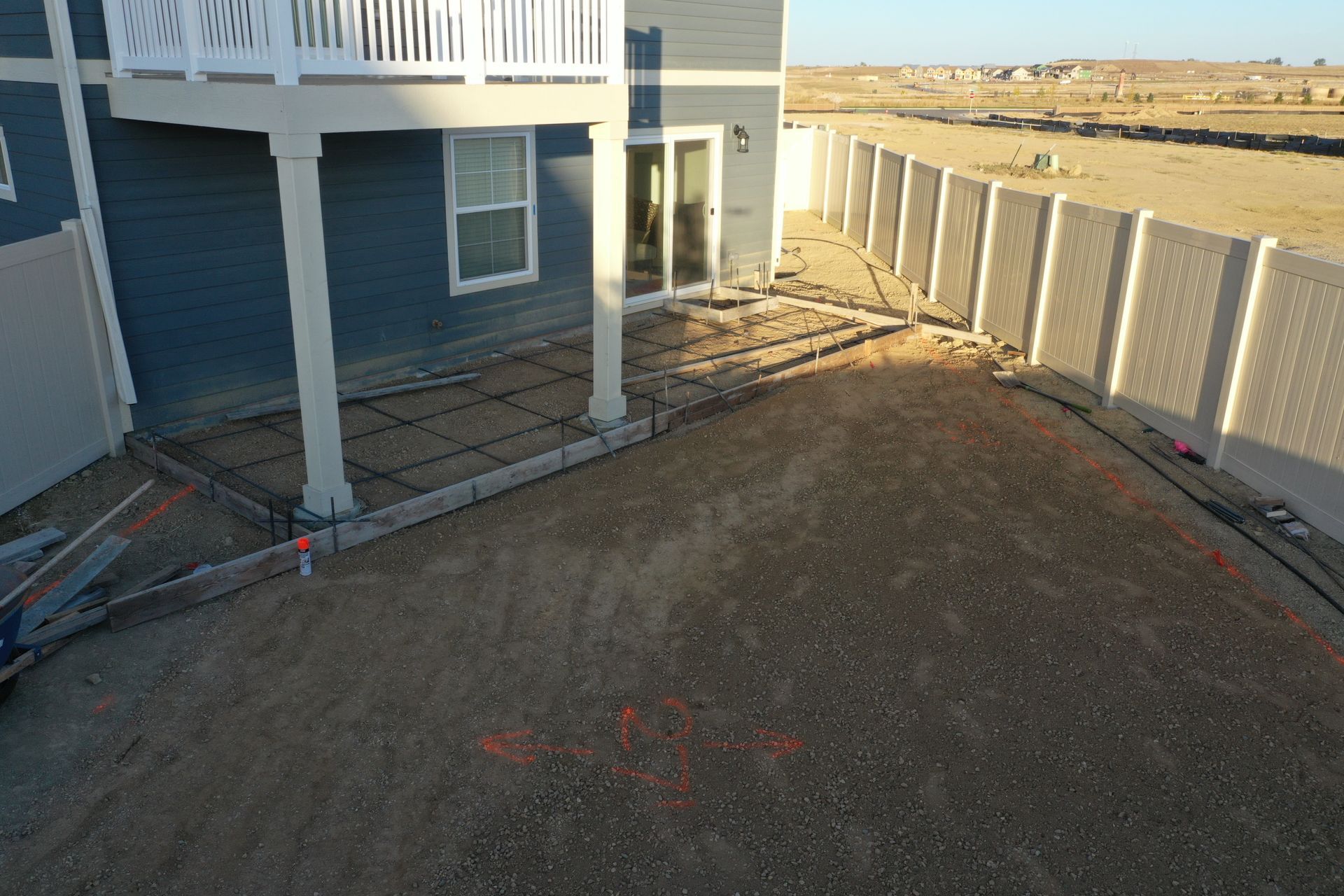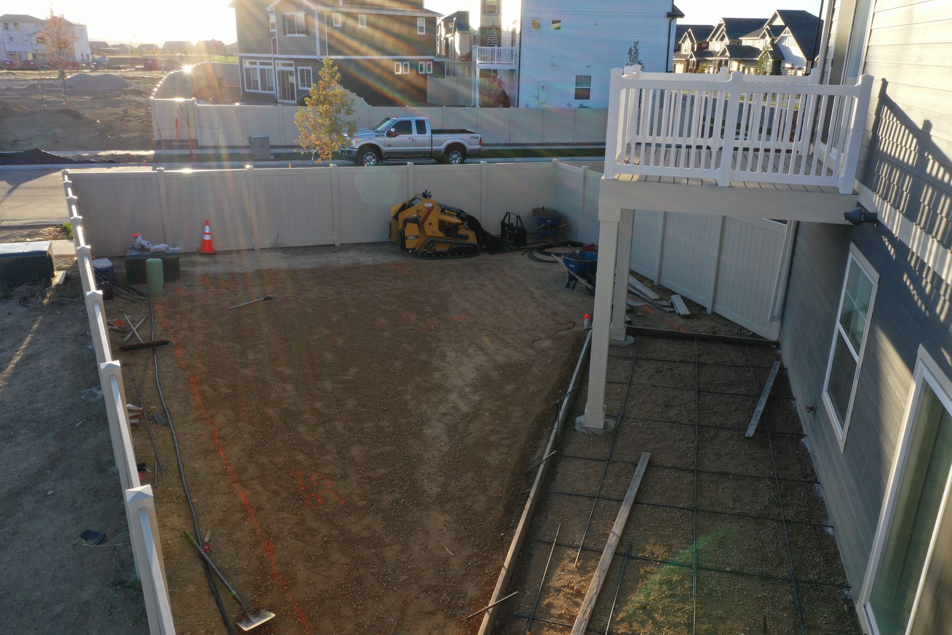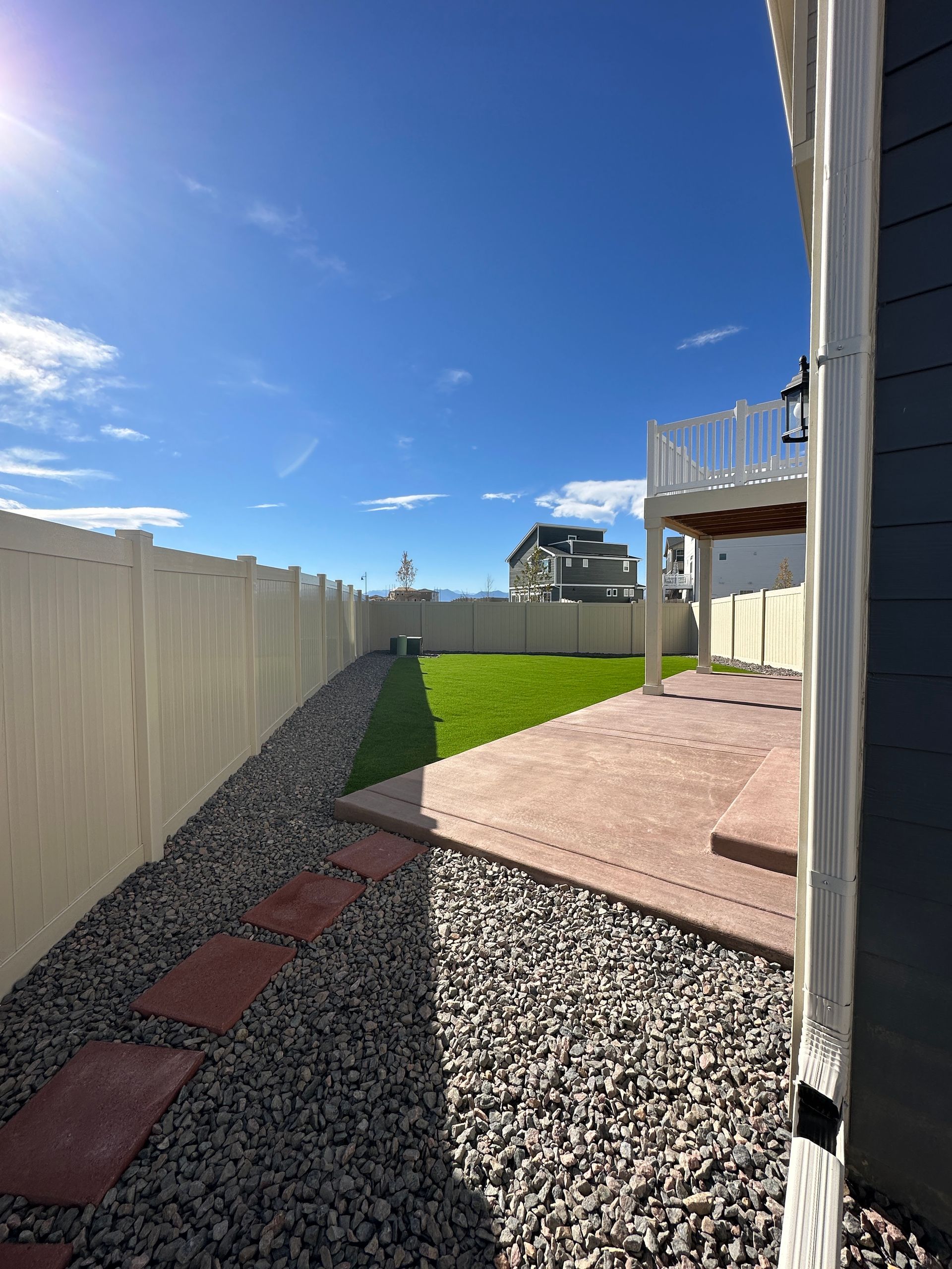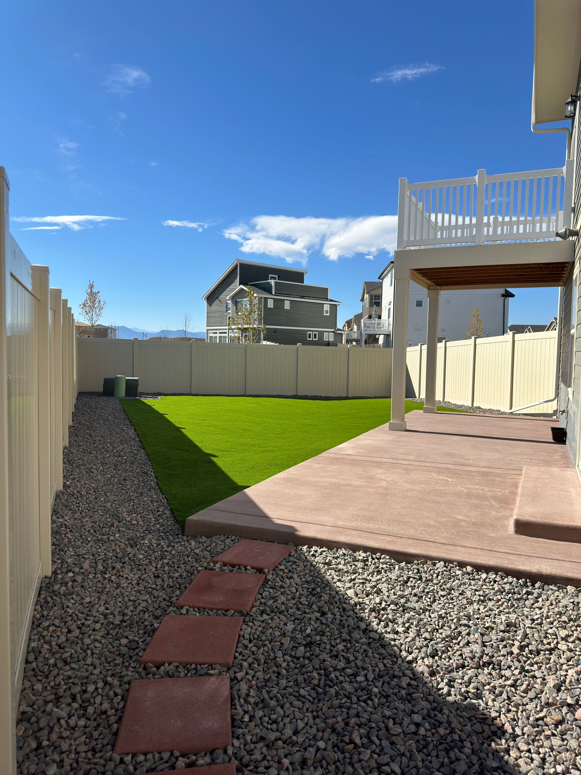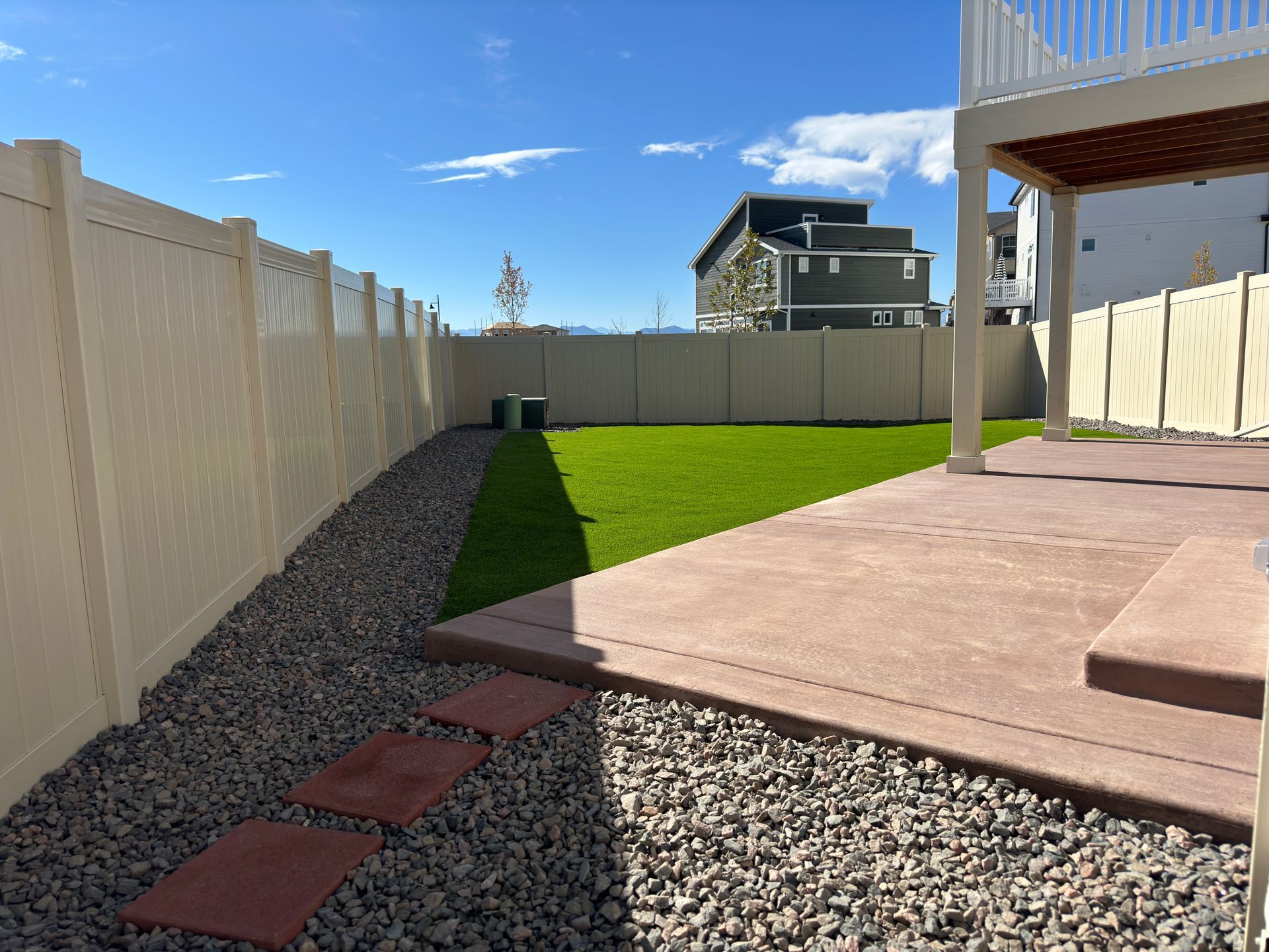 Newly built home with addition of colored concrete patio, artificial turf, irrigation for plants, and rock. Erie, CO 2022