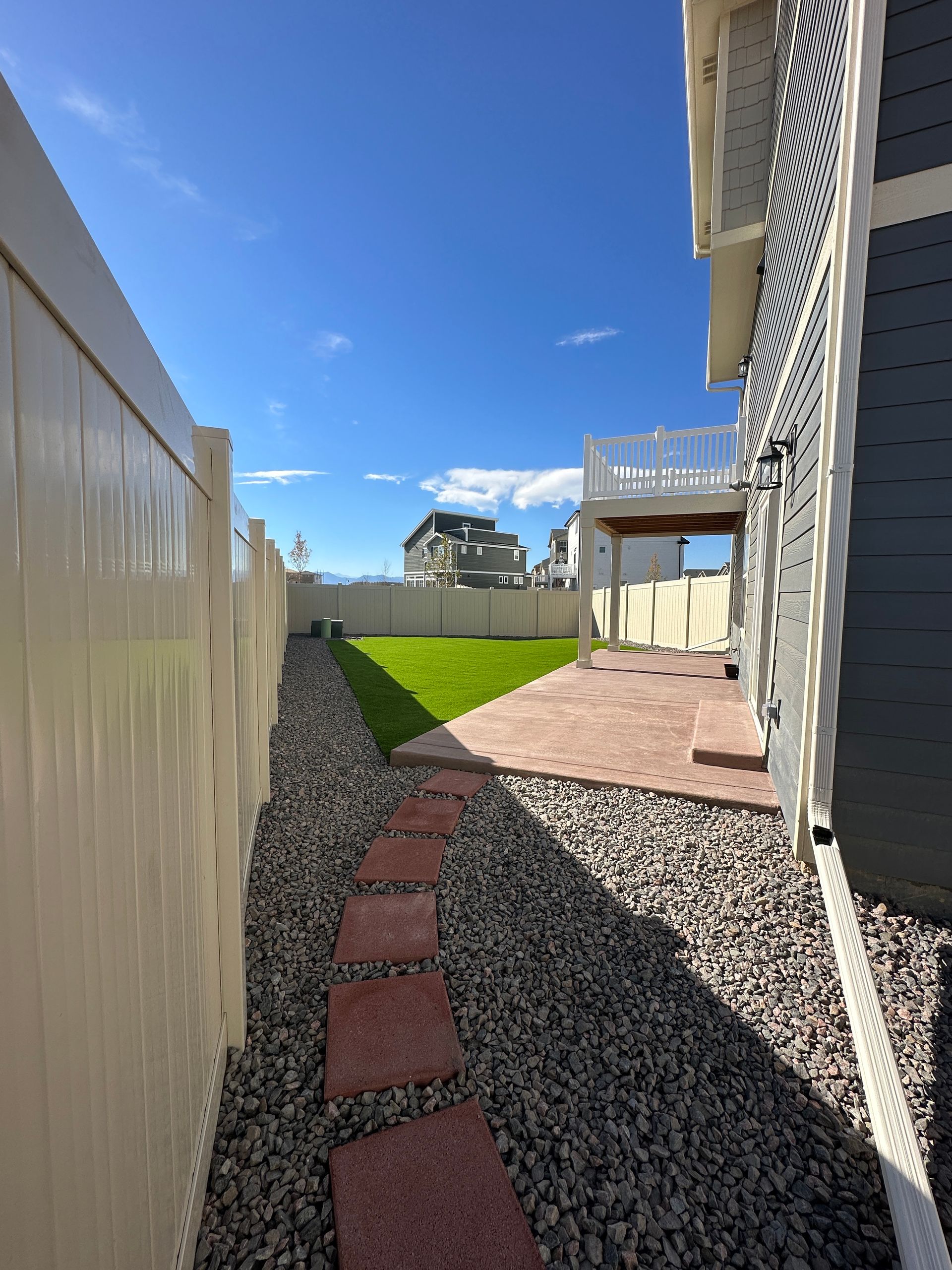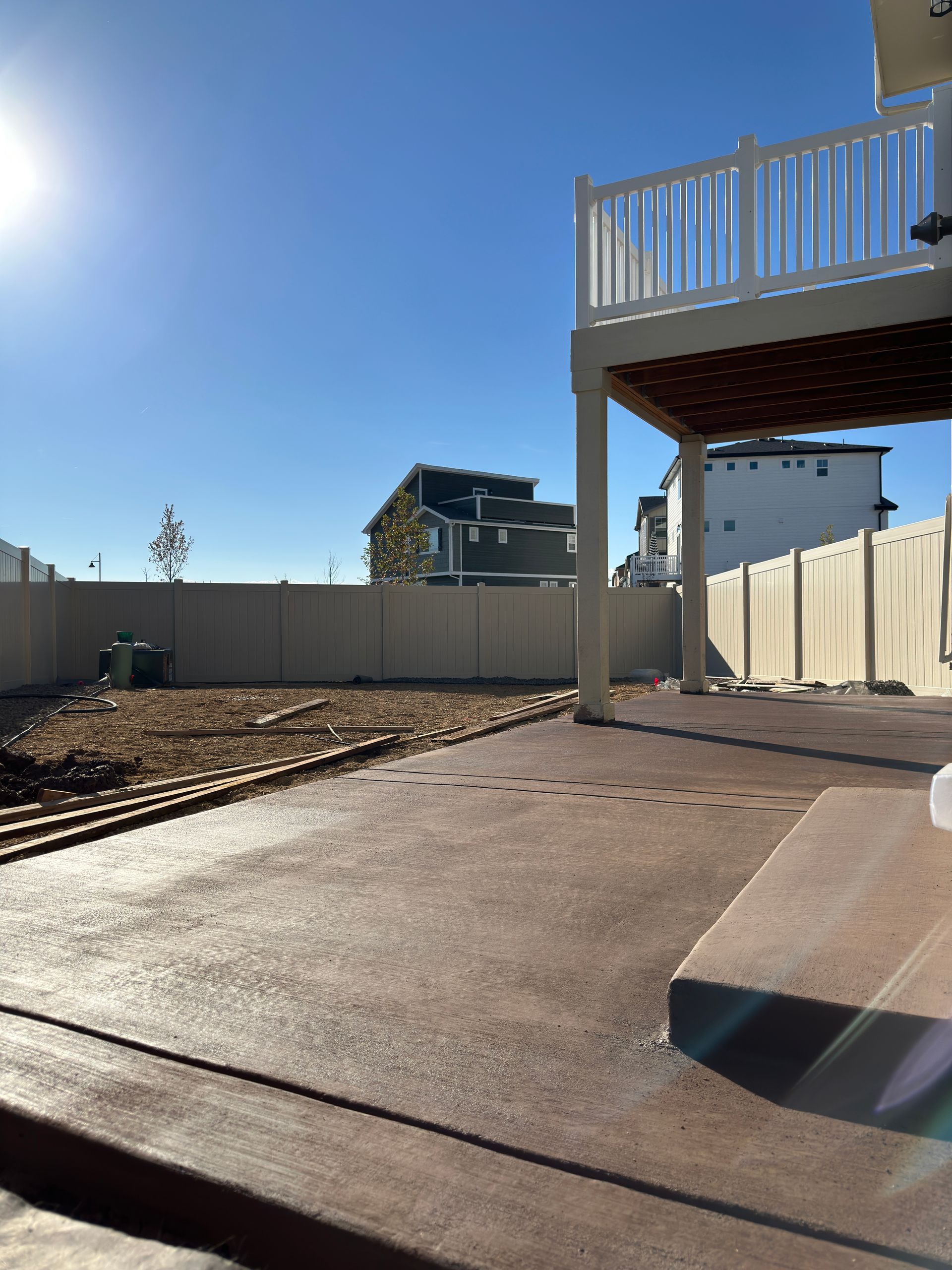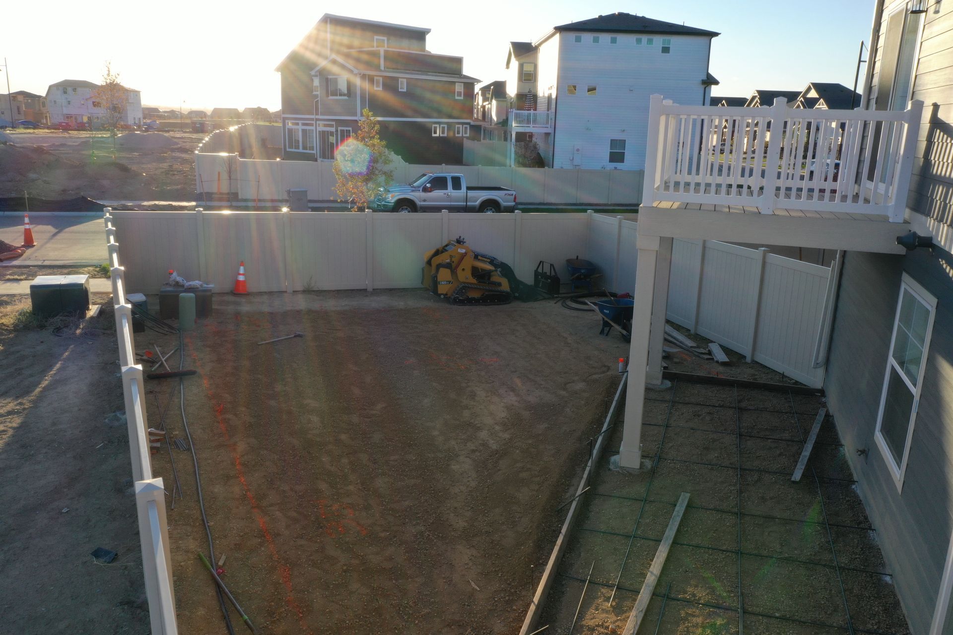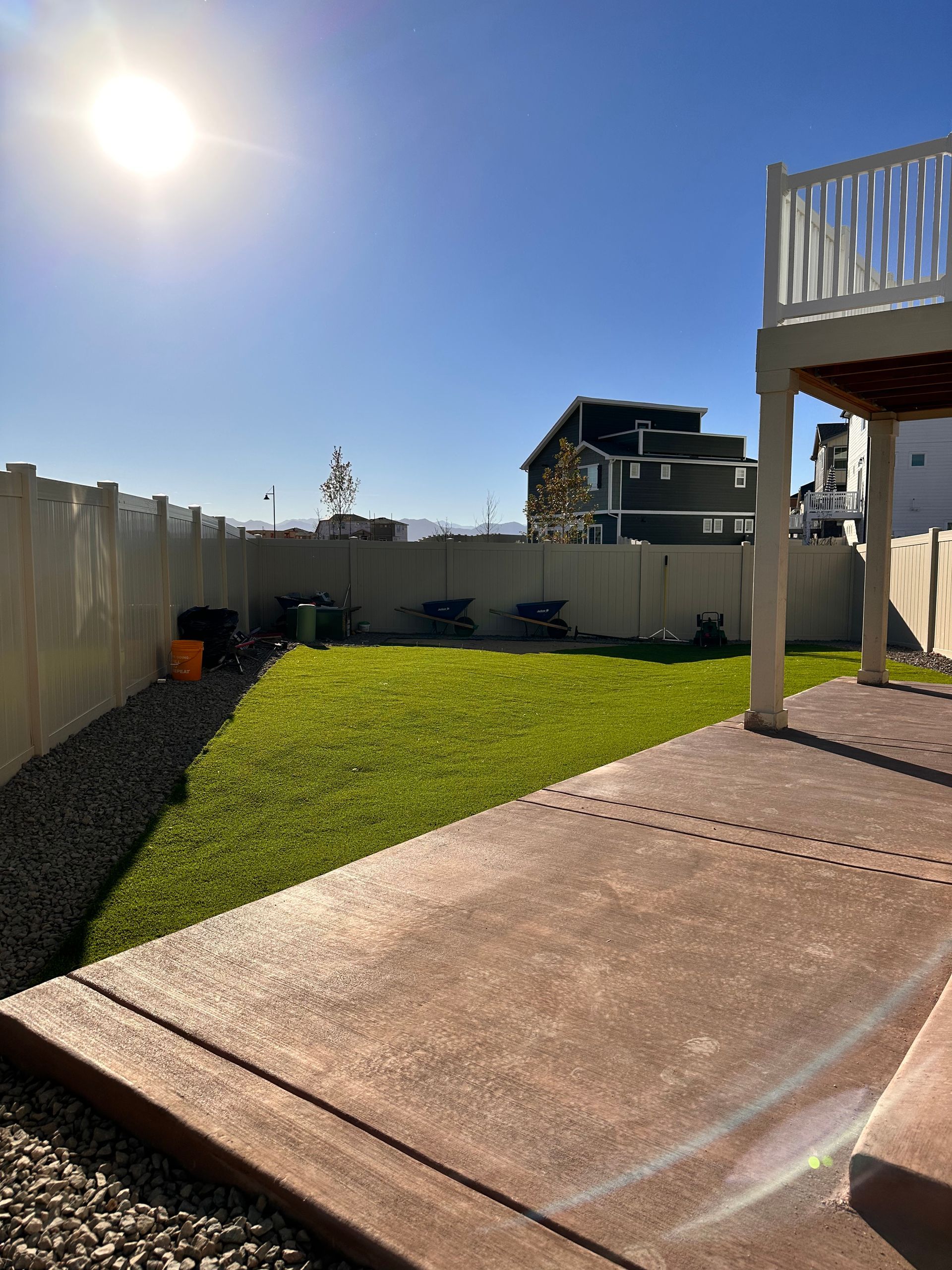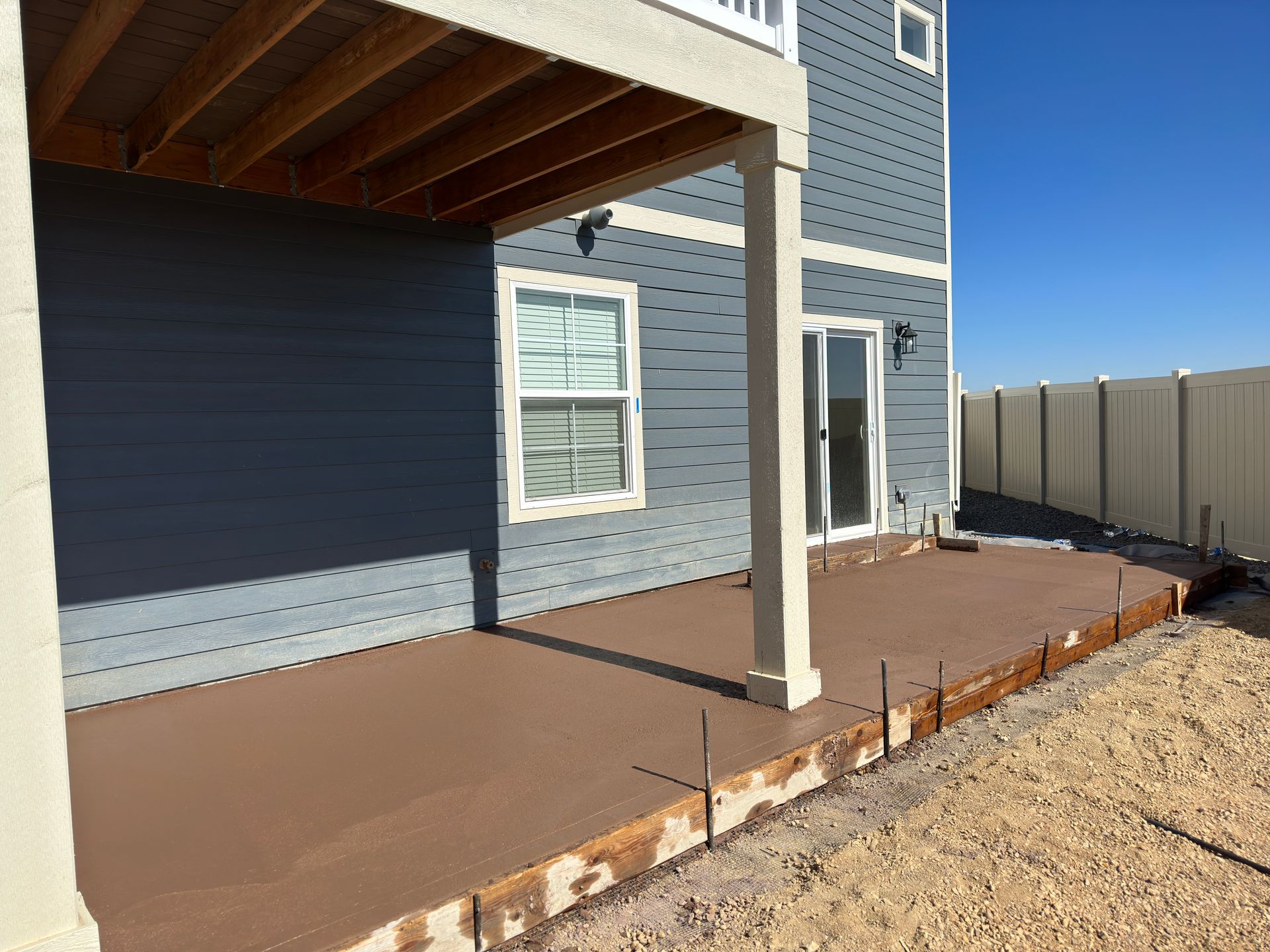 Newly built home with addition of colored concrete patio, artificial turf, irrigation for plants, and rock. Erie, CO 2022