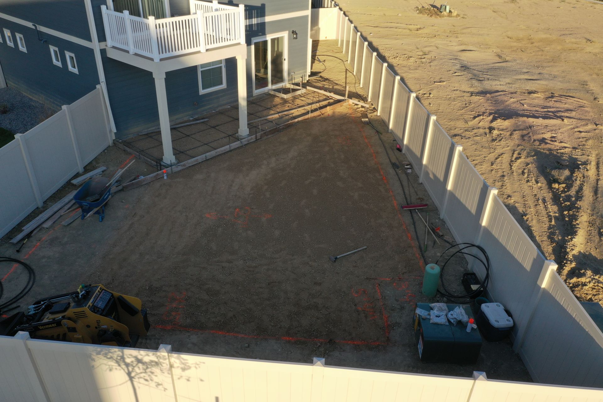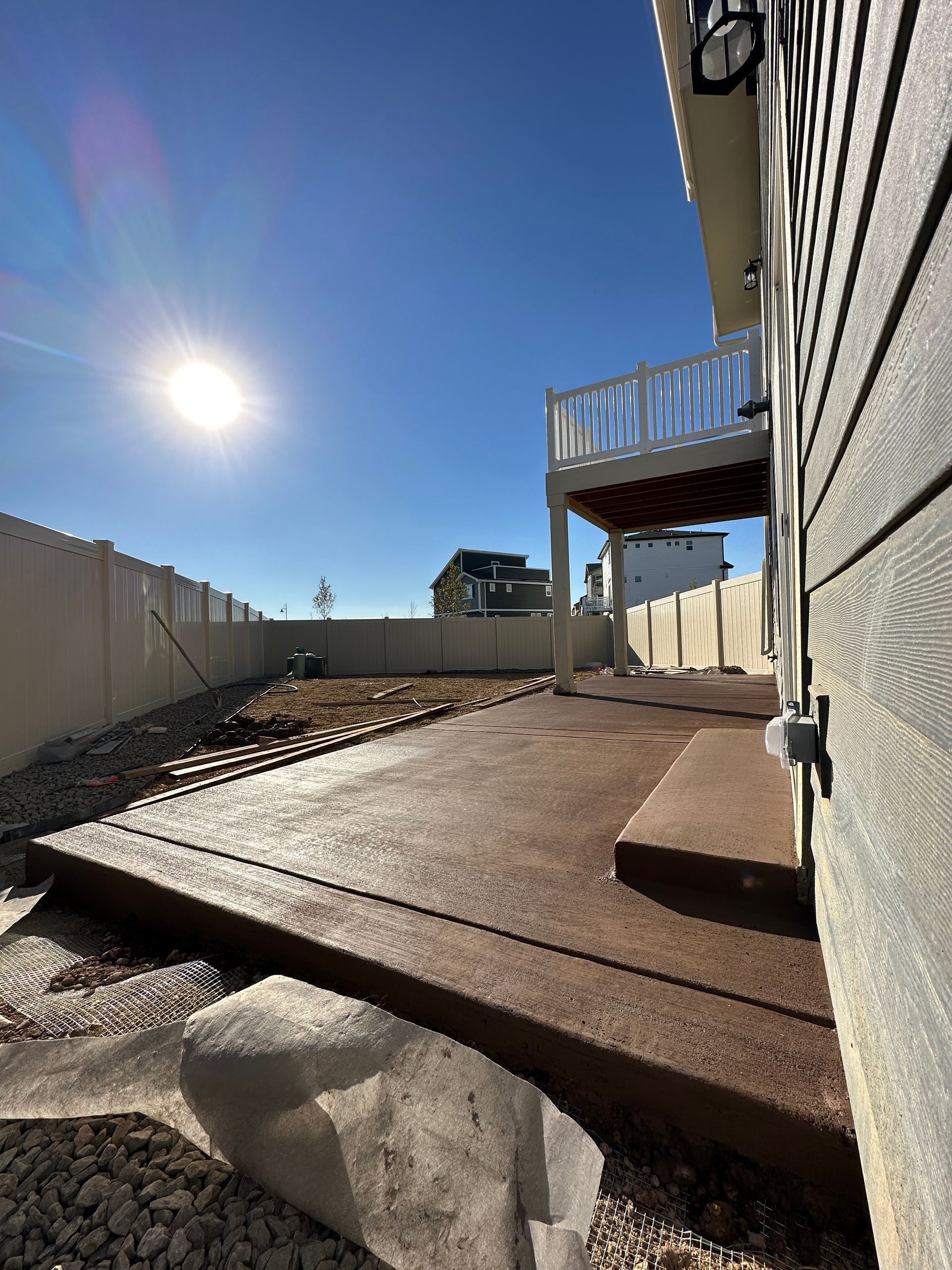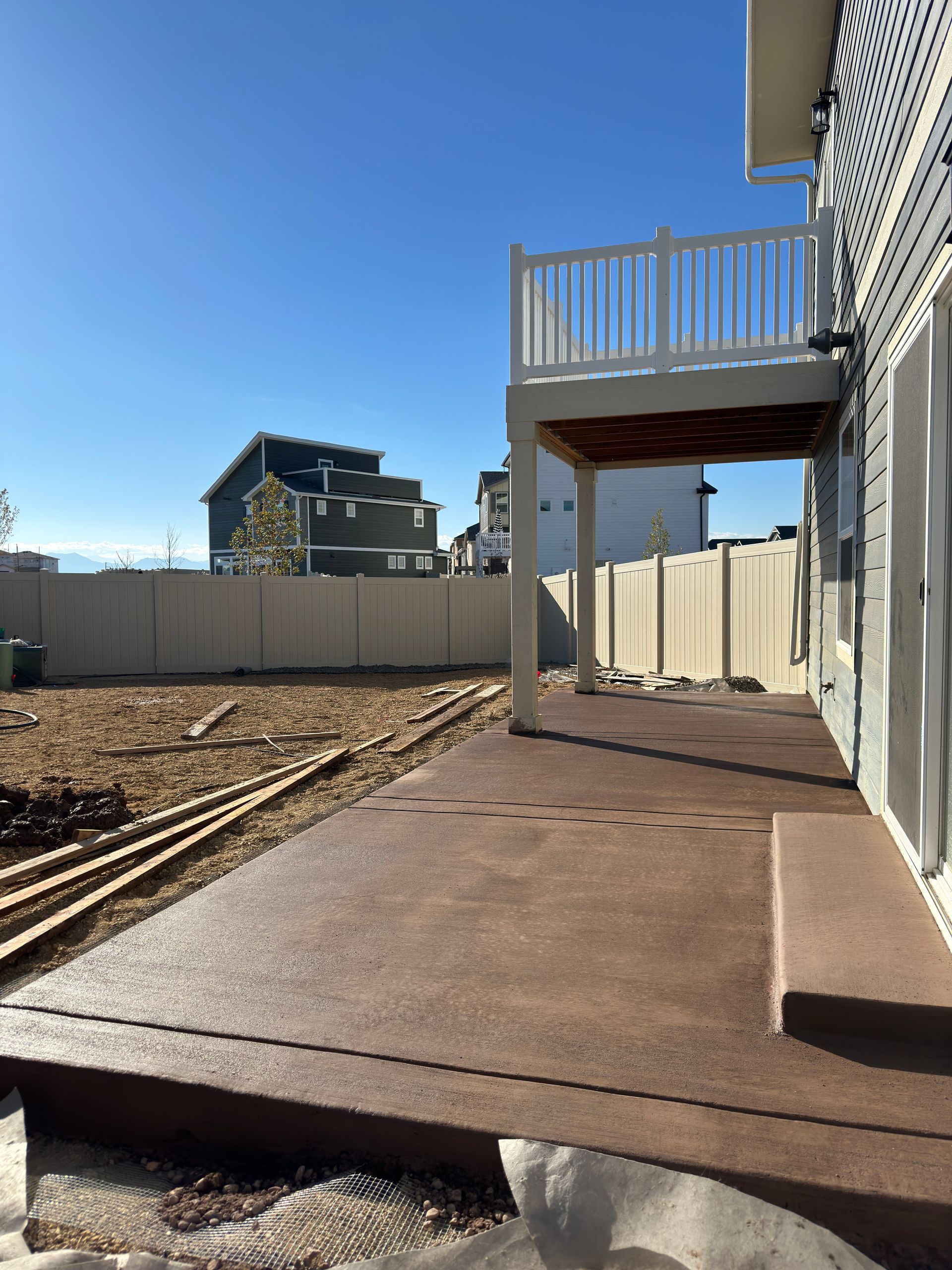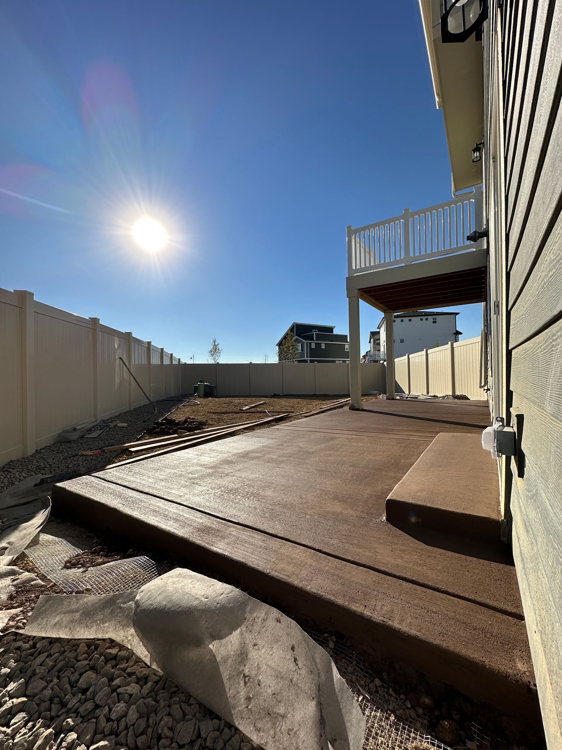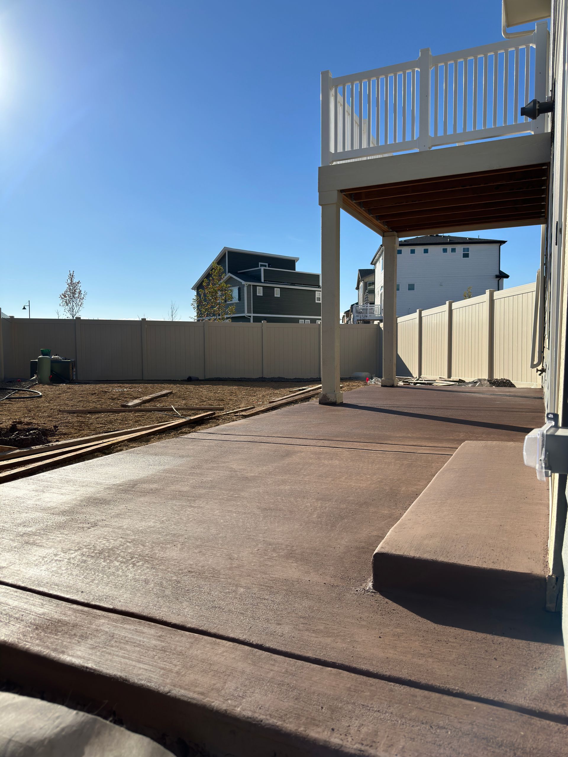 Newly built home with addition of colored concrete patio, artificial turf, irrigation for plants, and rock. Erie, CO 2022