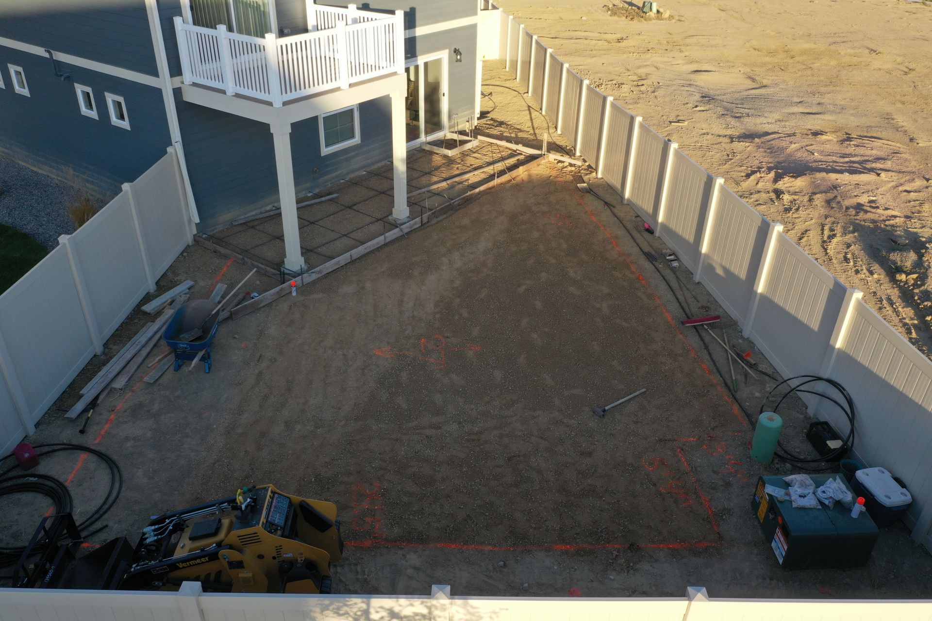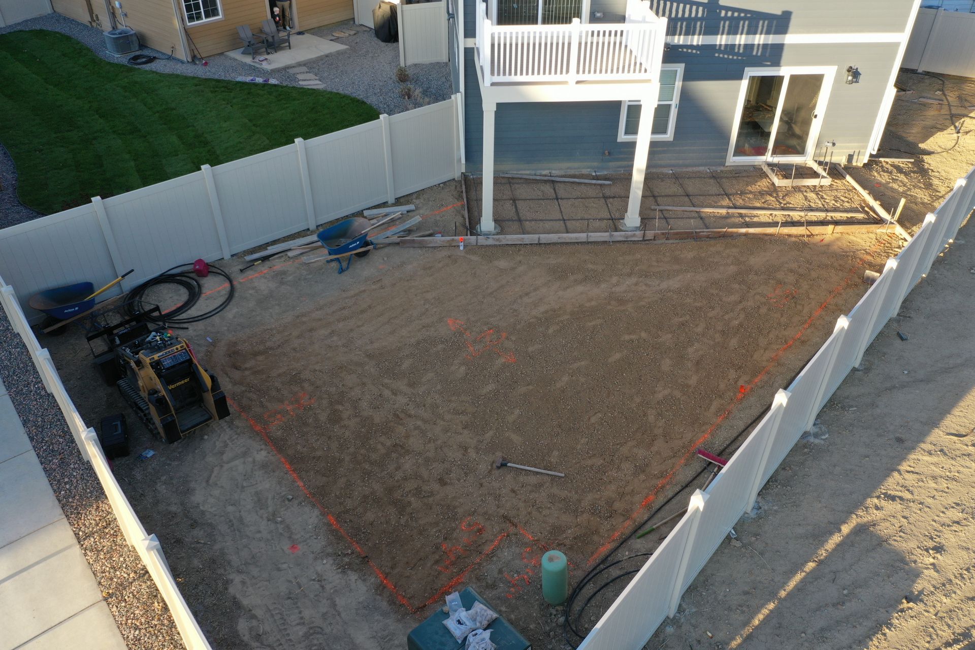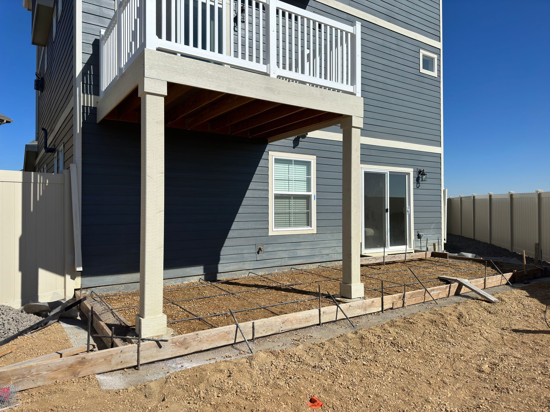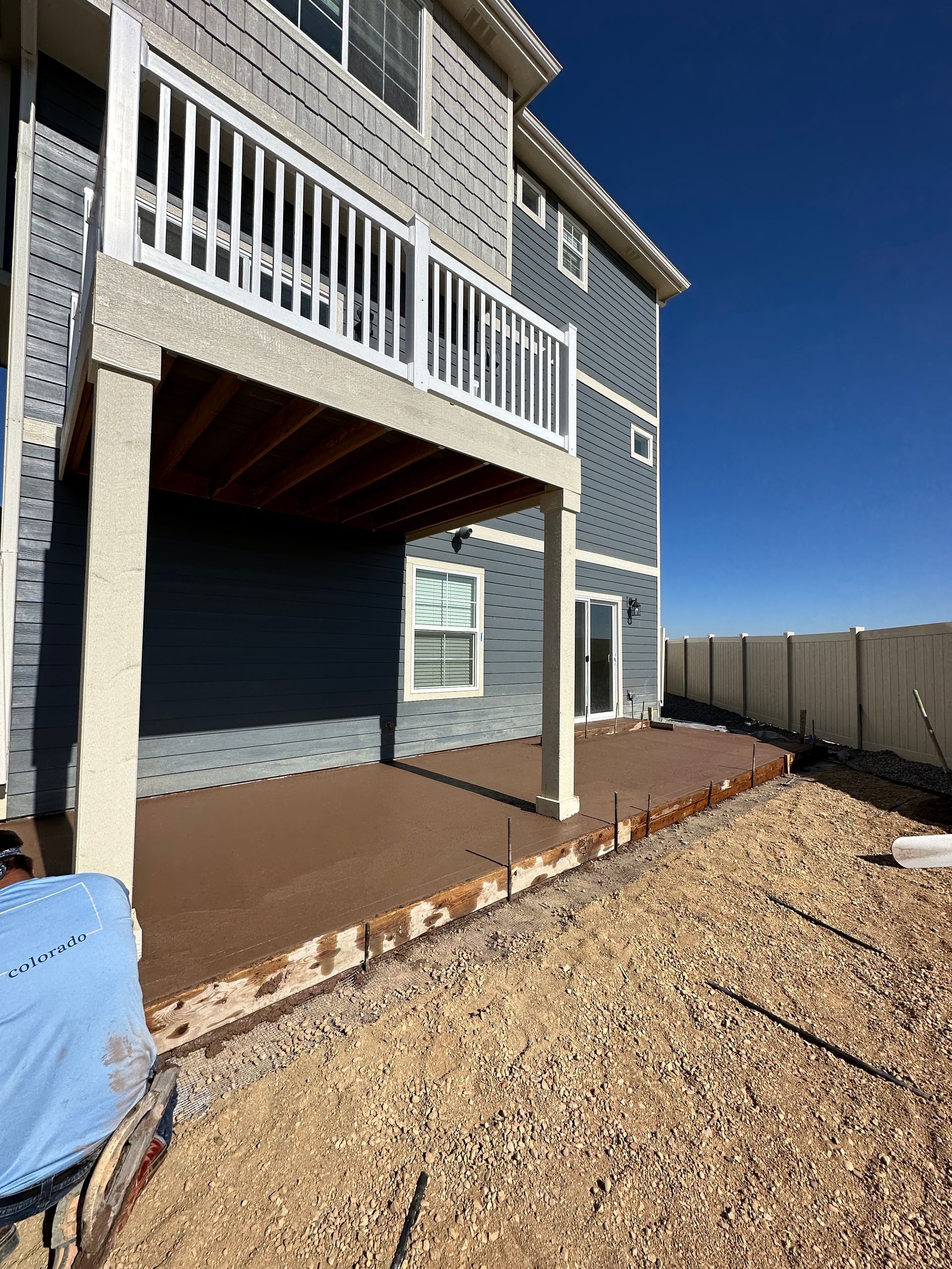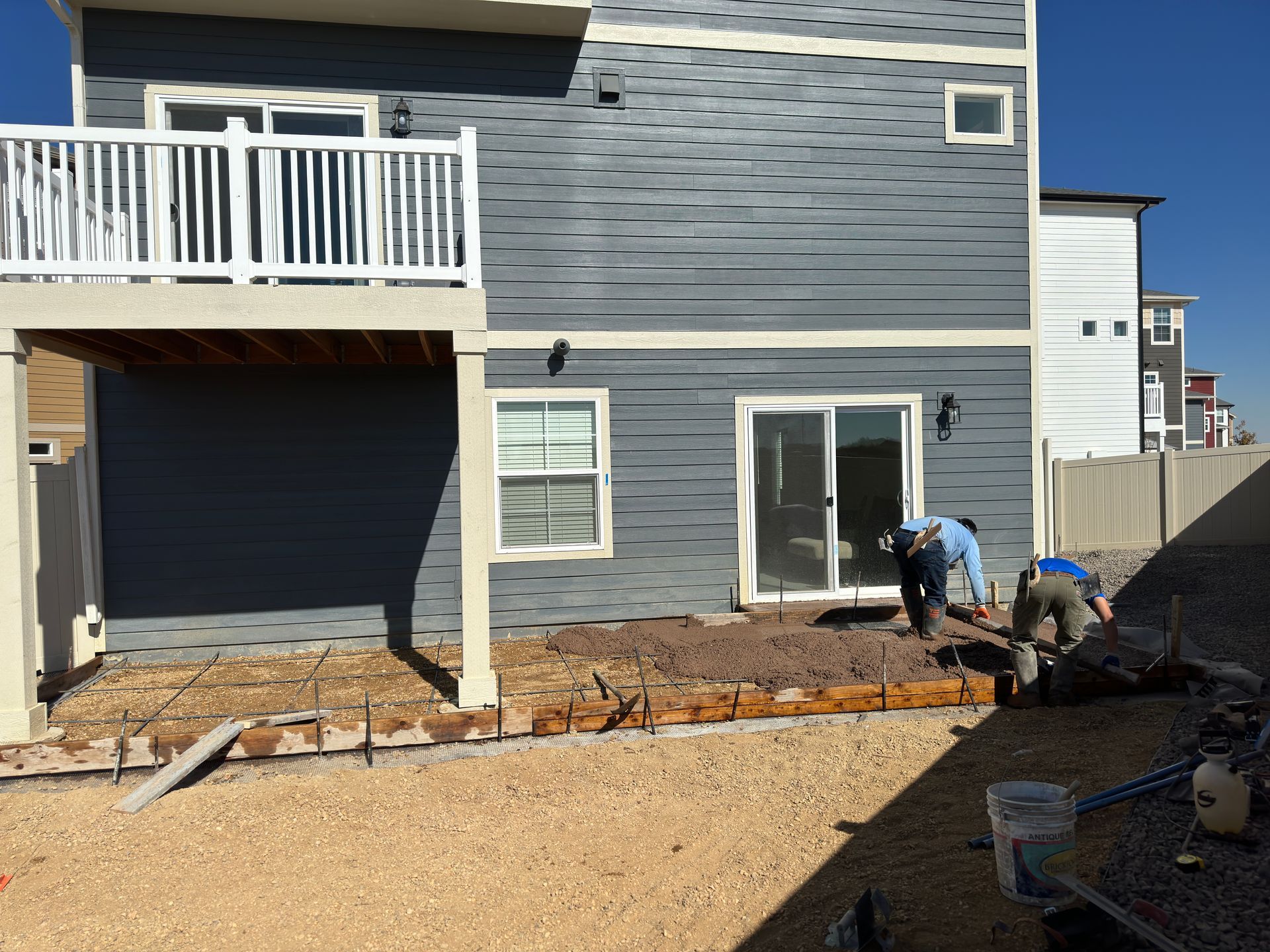 Newly built home with addition of colored concrete patio, artificial turf, irrigation for plants, and rock. Erie, CO 2022