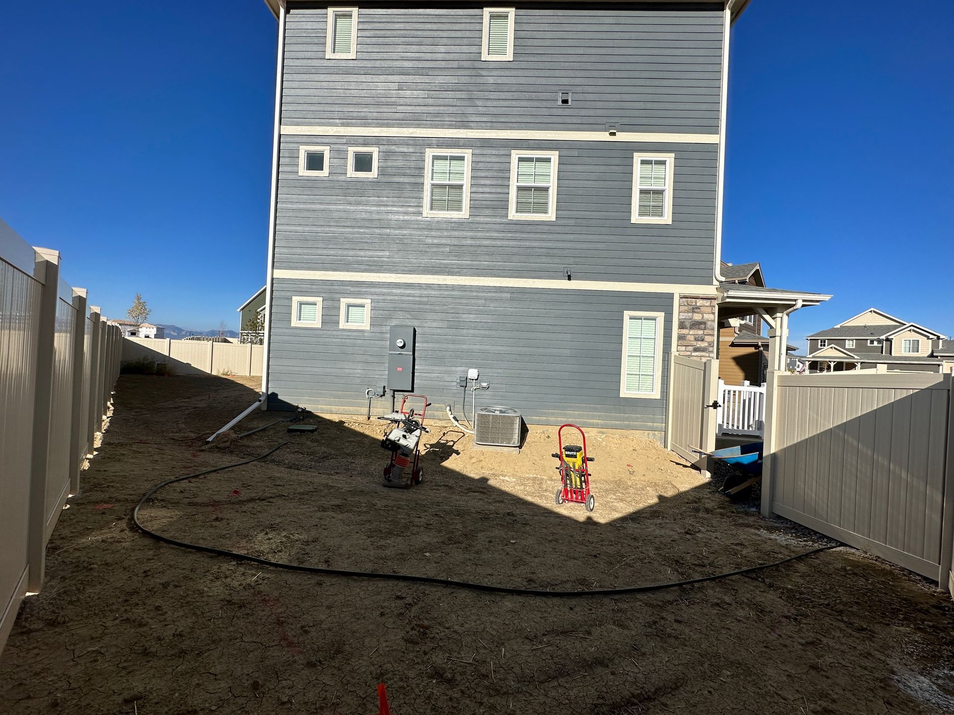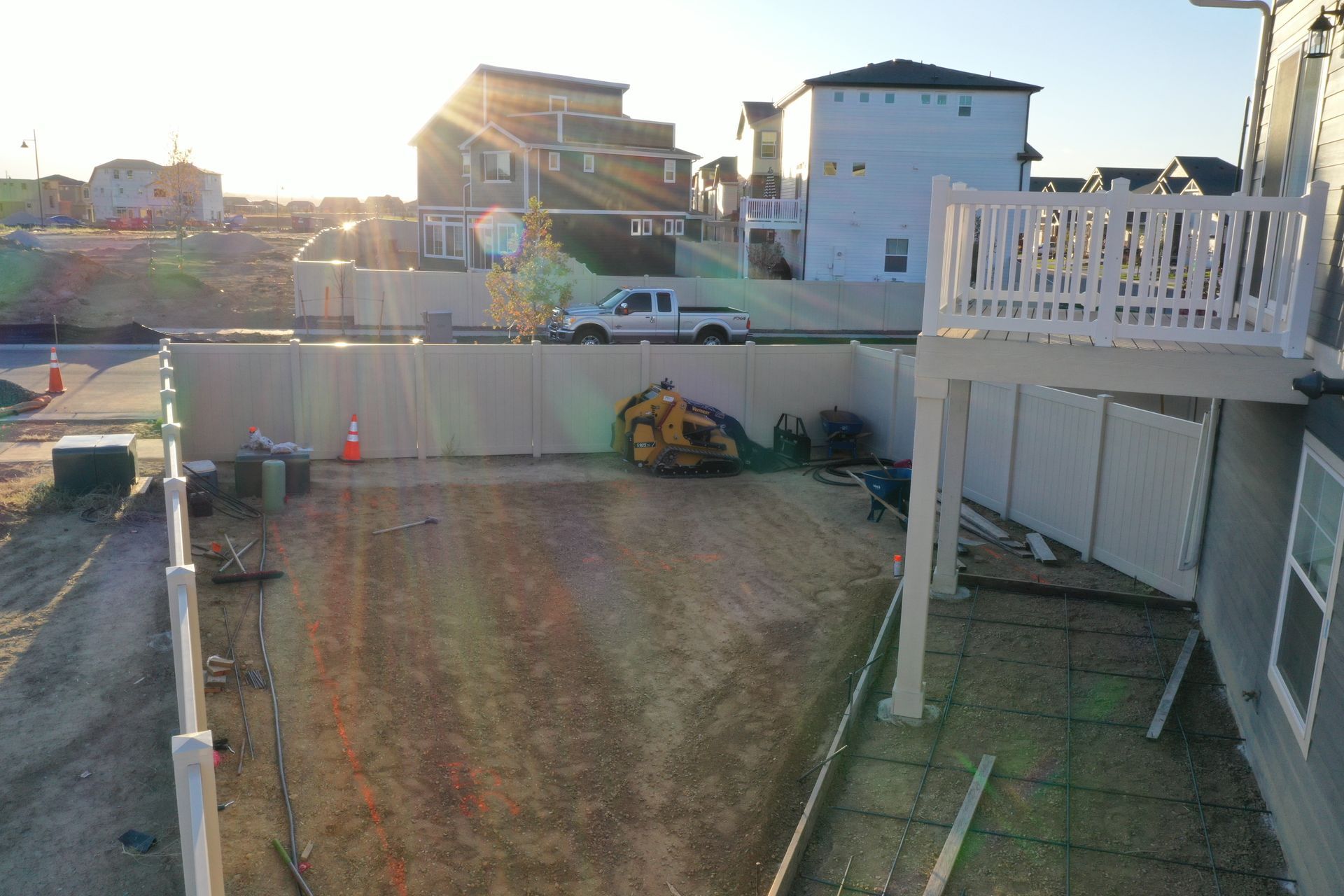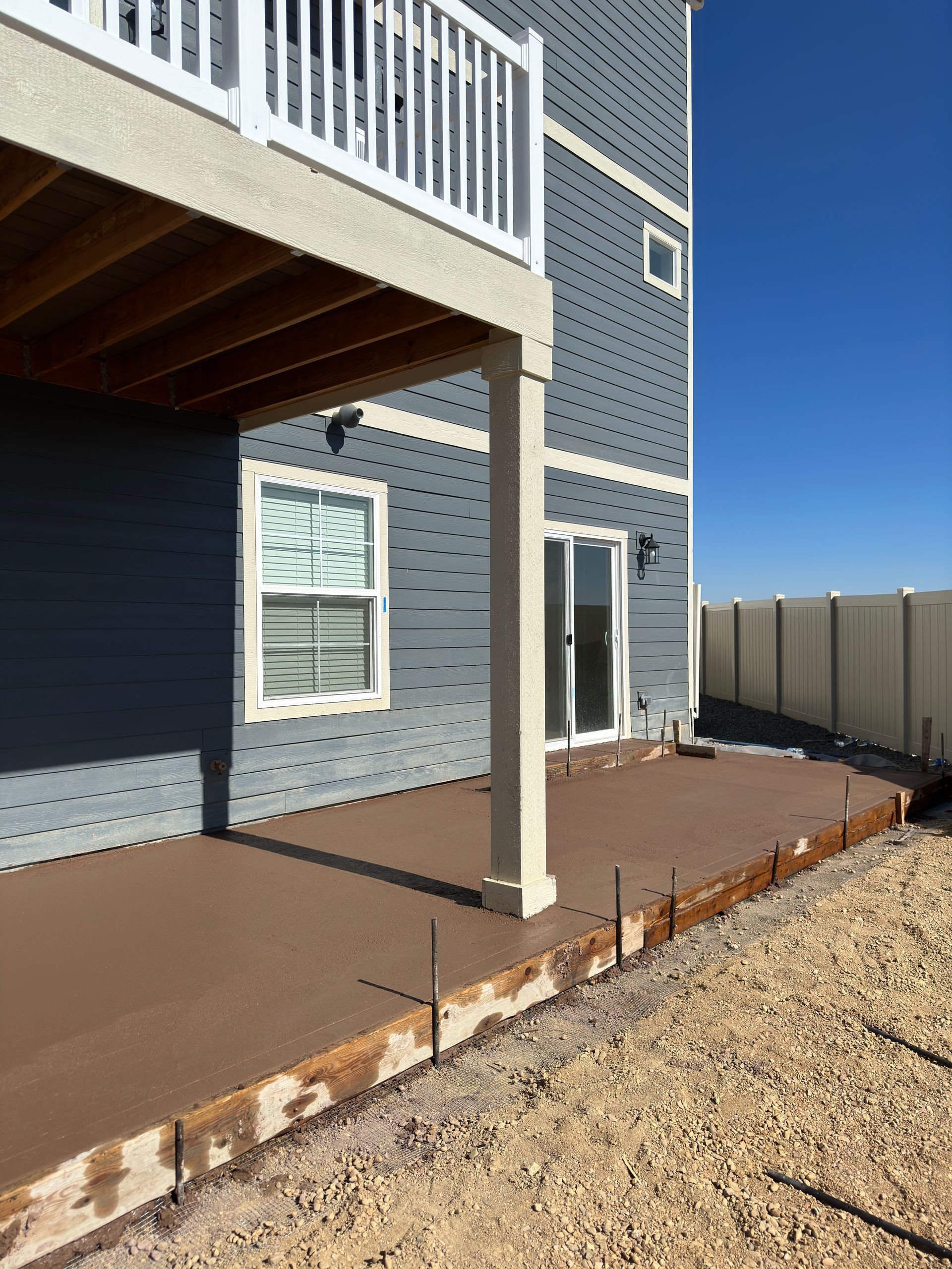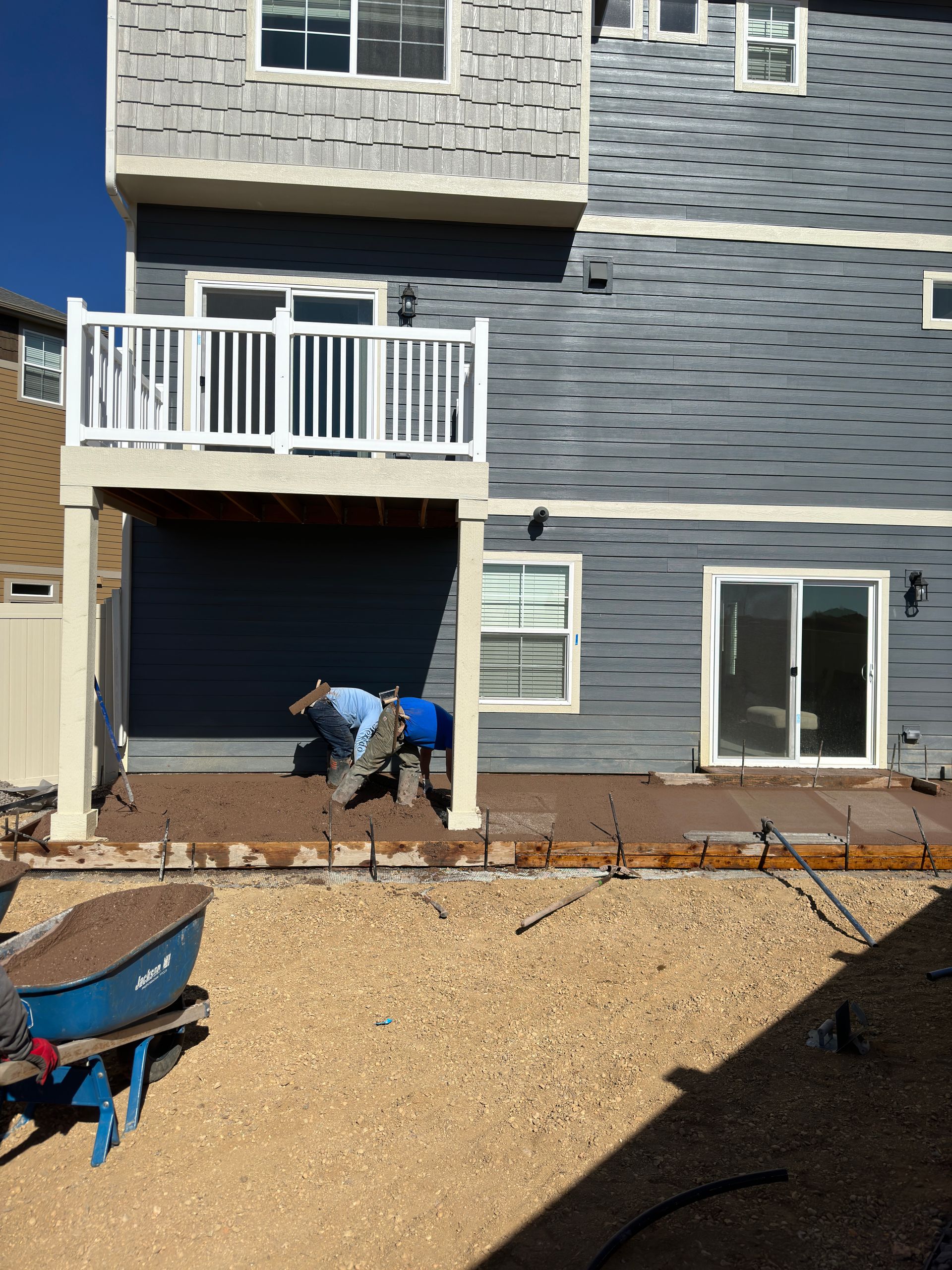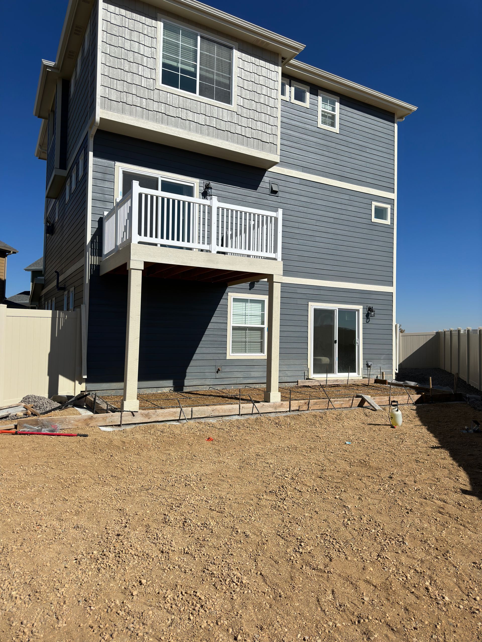 Newly built home with addition of colored concrete patio, artificial turf, irrigation for plants, and rock. Erie, CO 2022