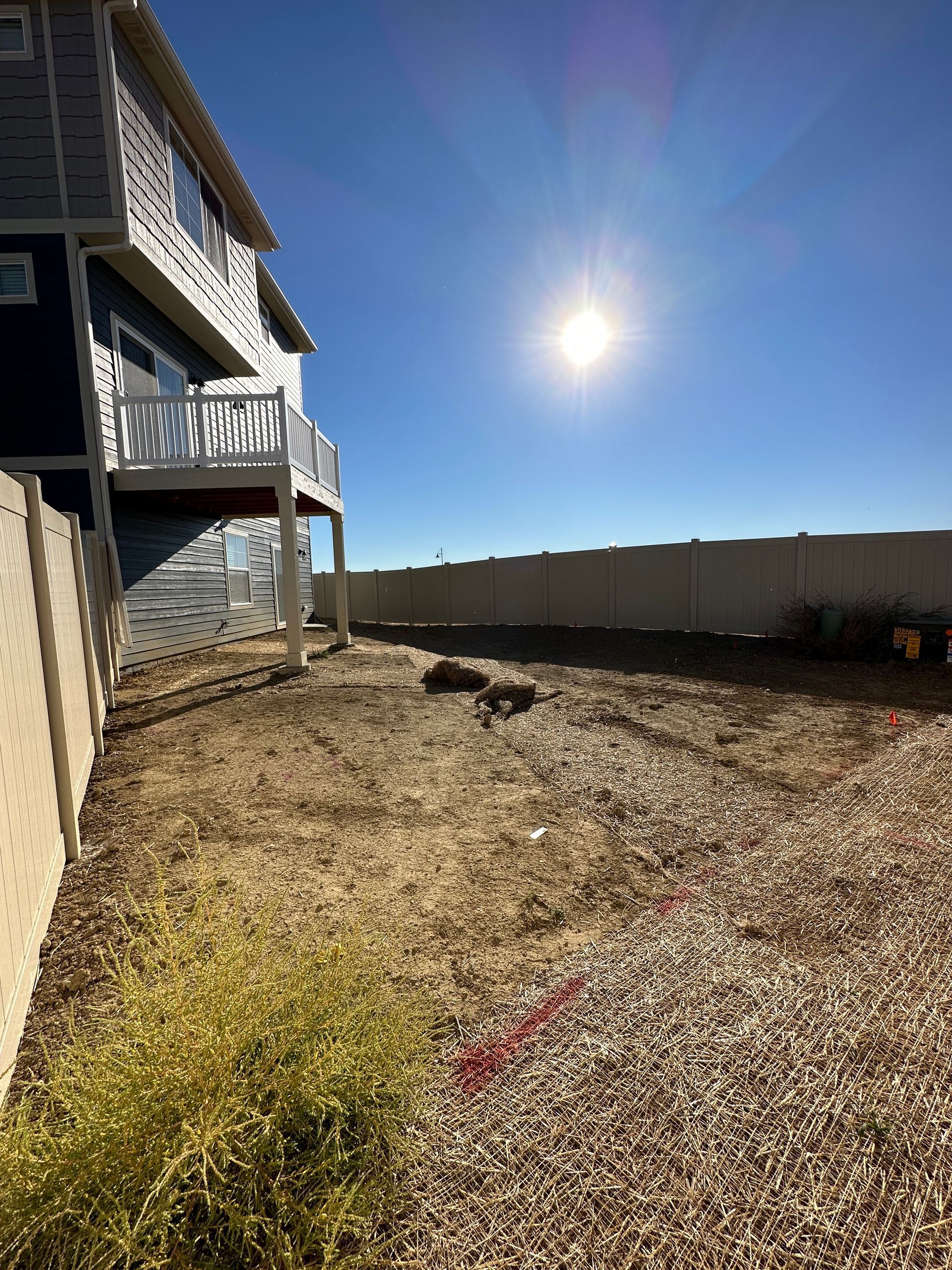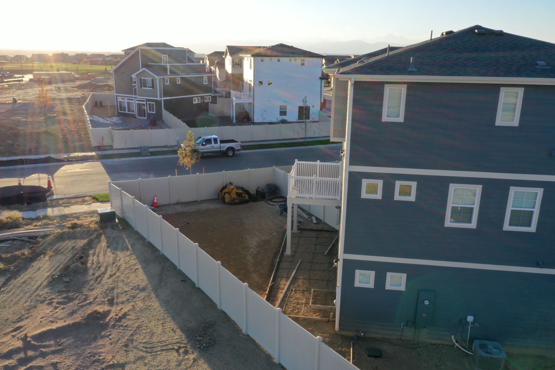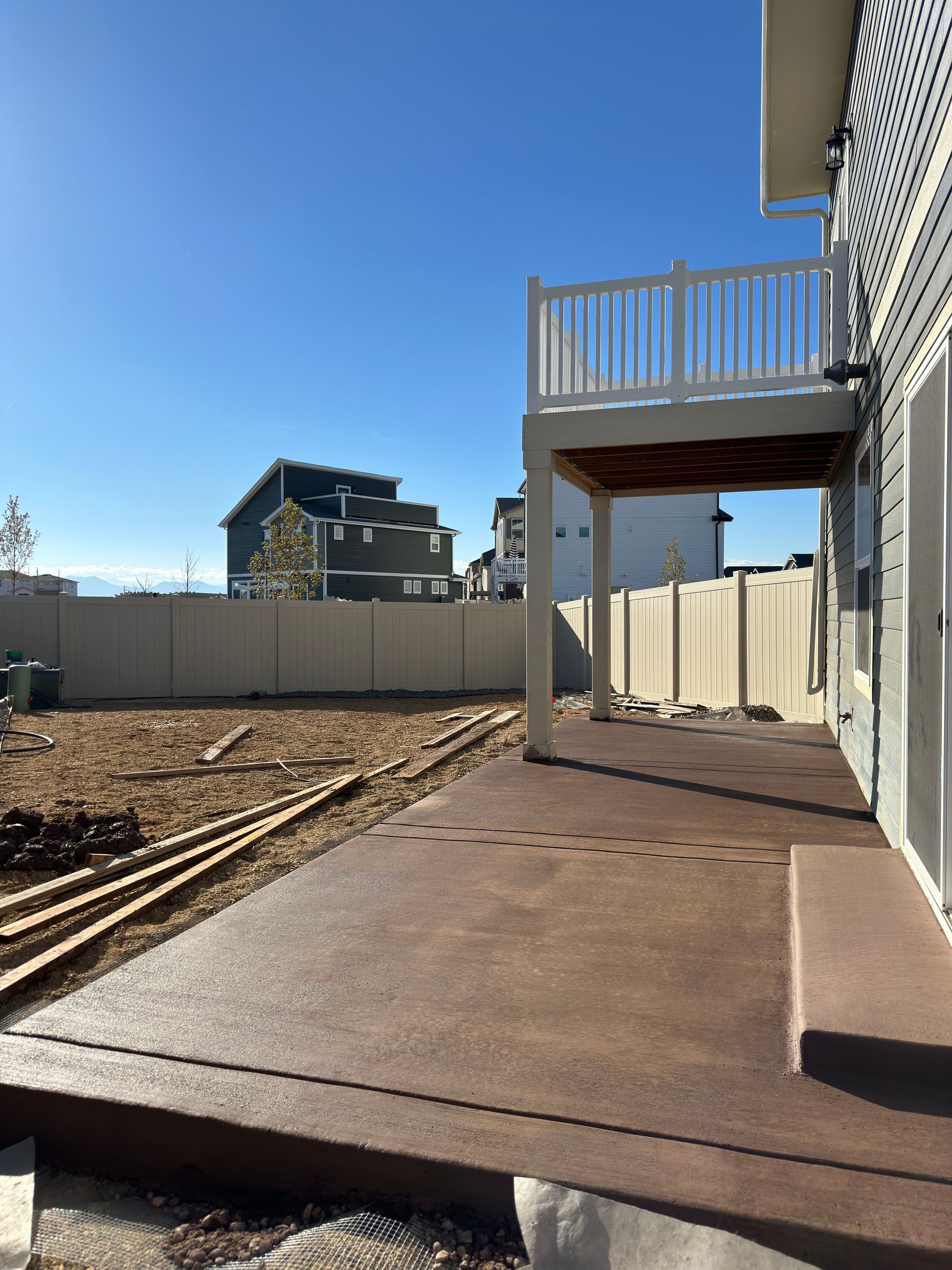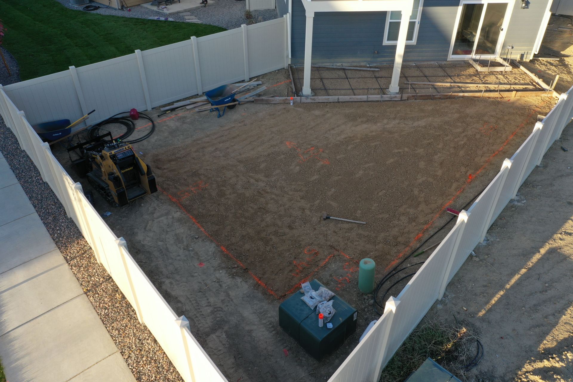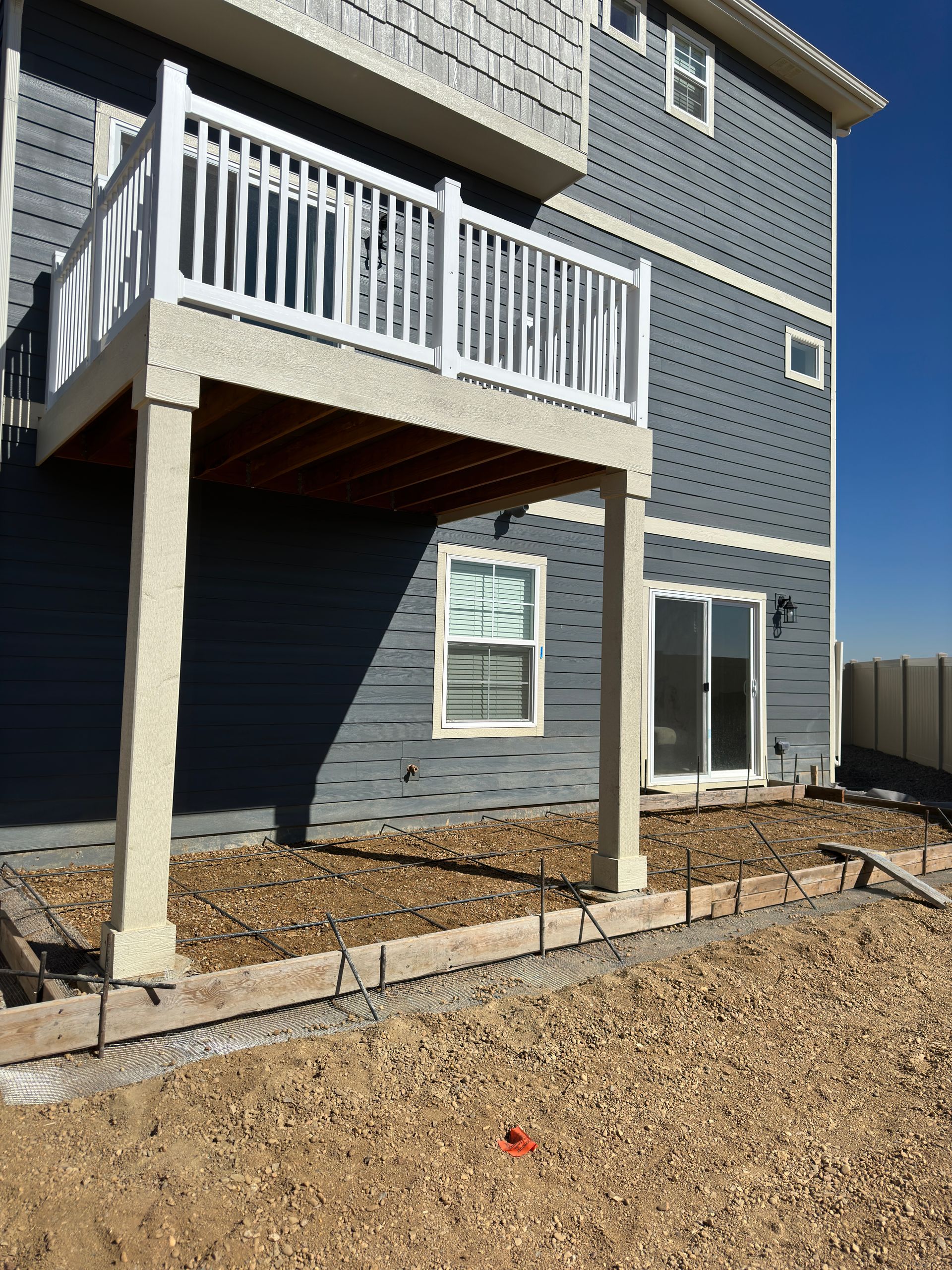 Newly built home with addition of colored concrete patio, artificial turf, irrigation for plants, and rock. Erie, CO 2022