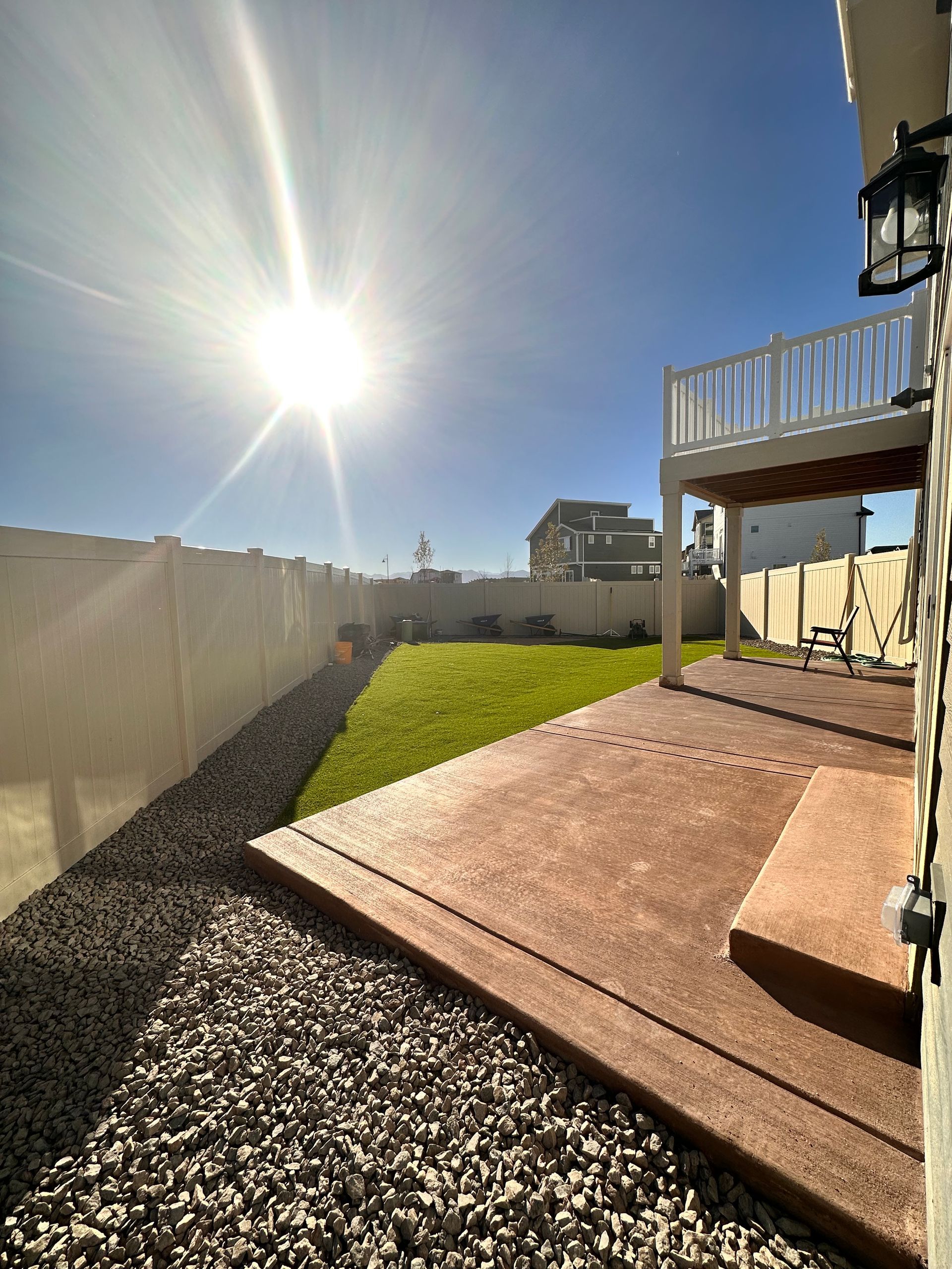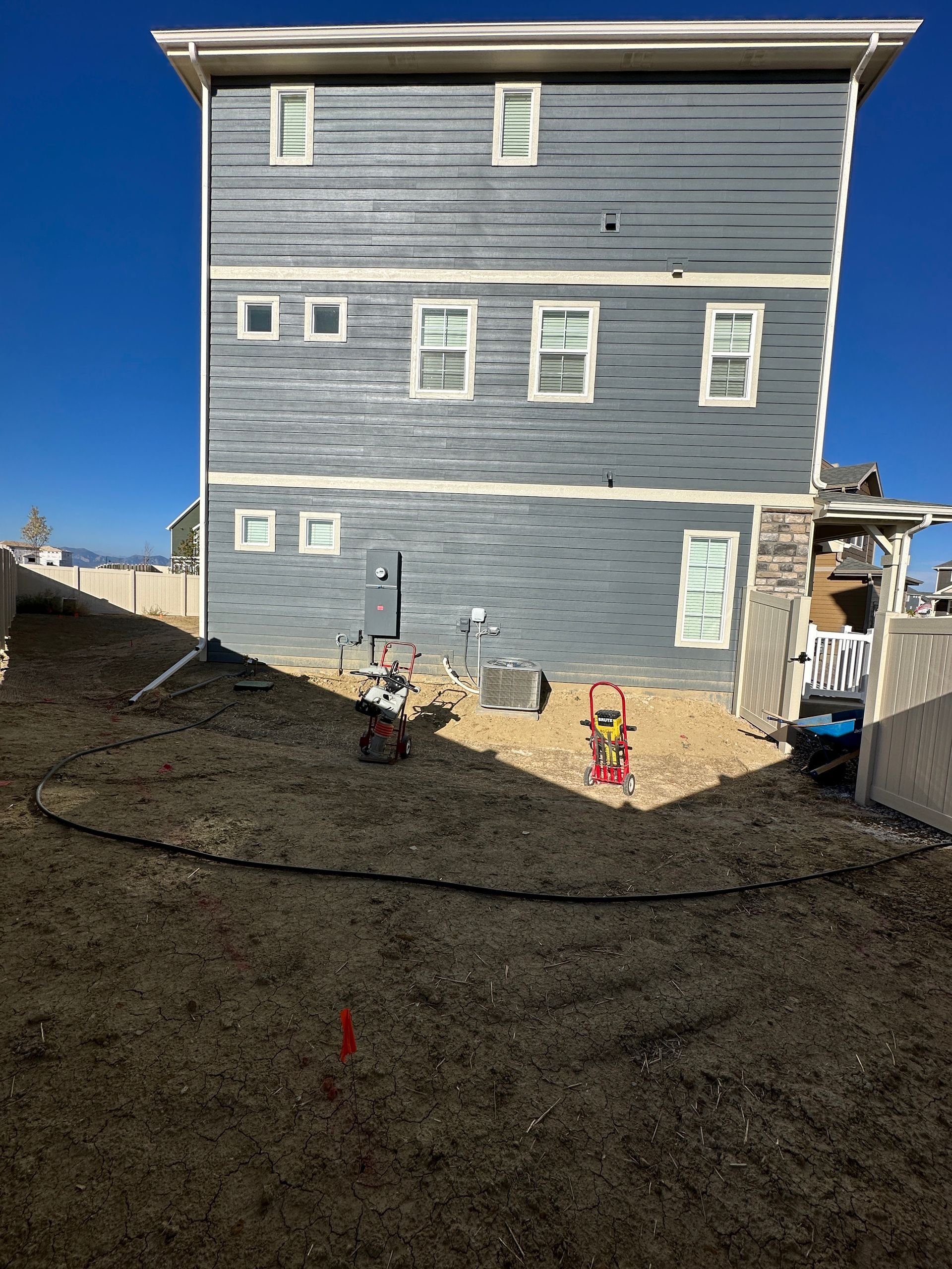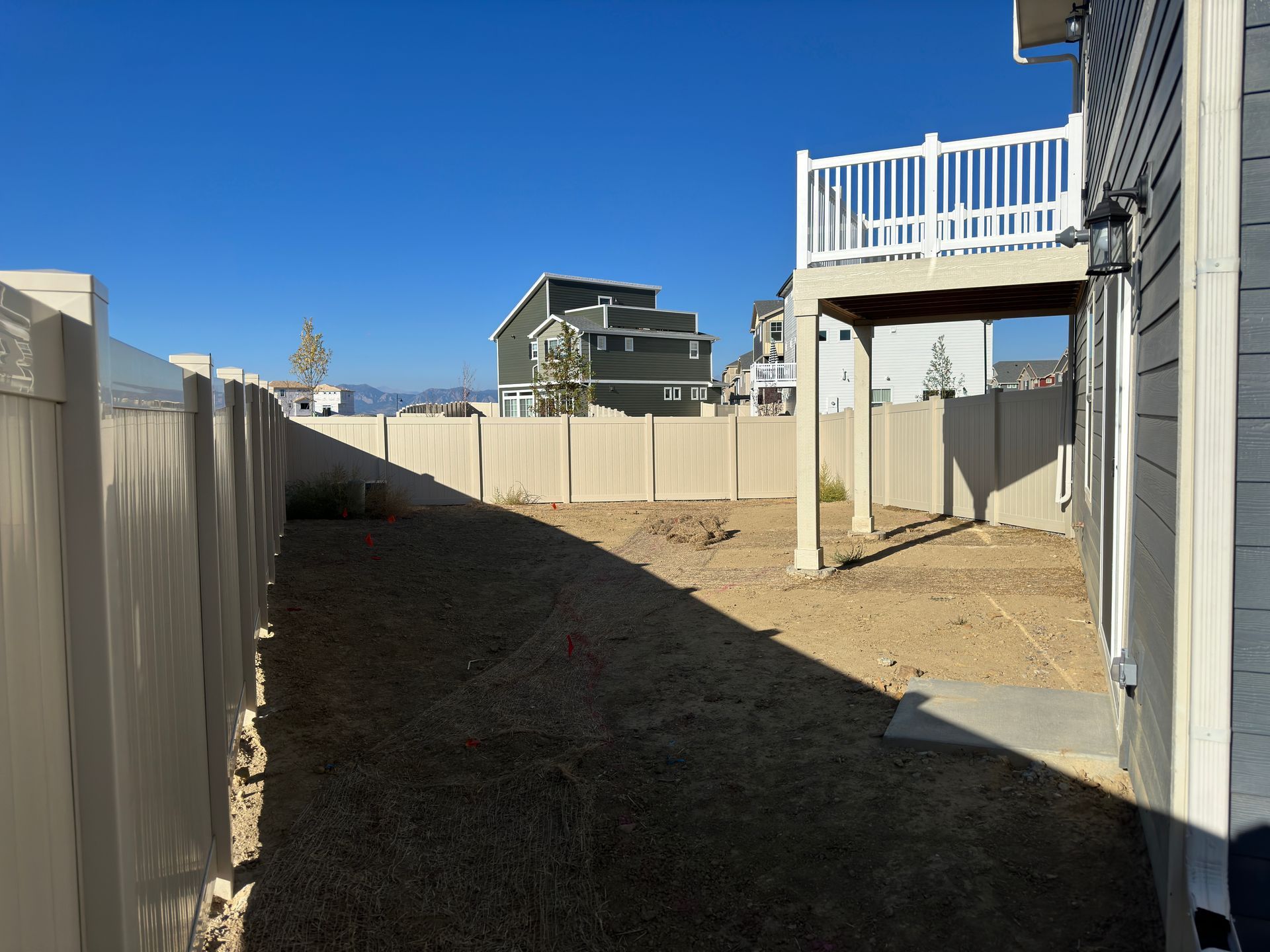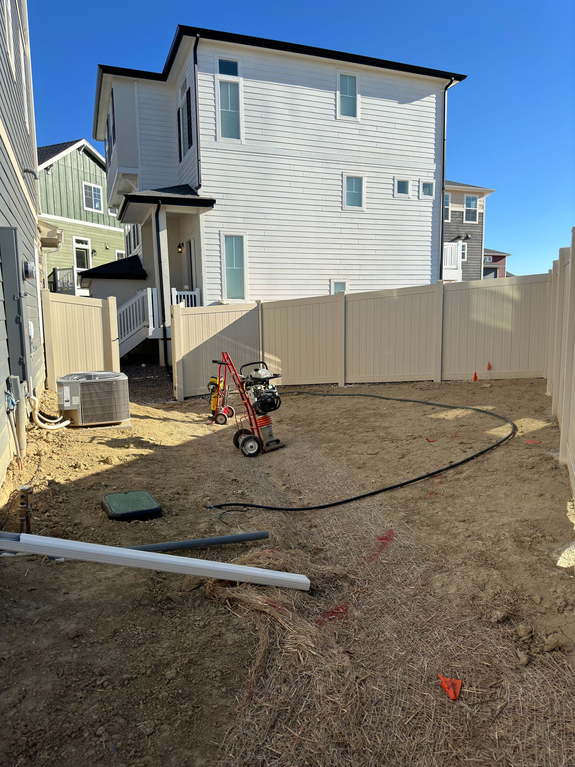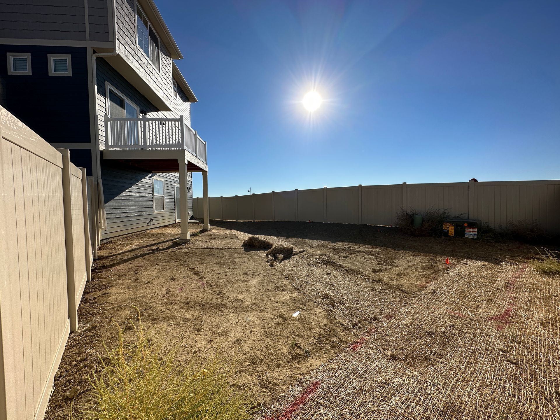 Newly built home with addition of colored concrete patio, artificial turf, irrigation for plants, and rock. Erie, CO 2022