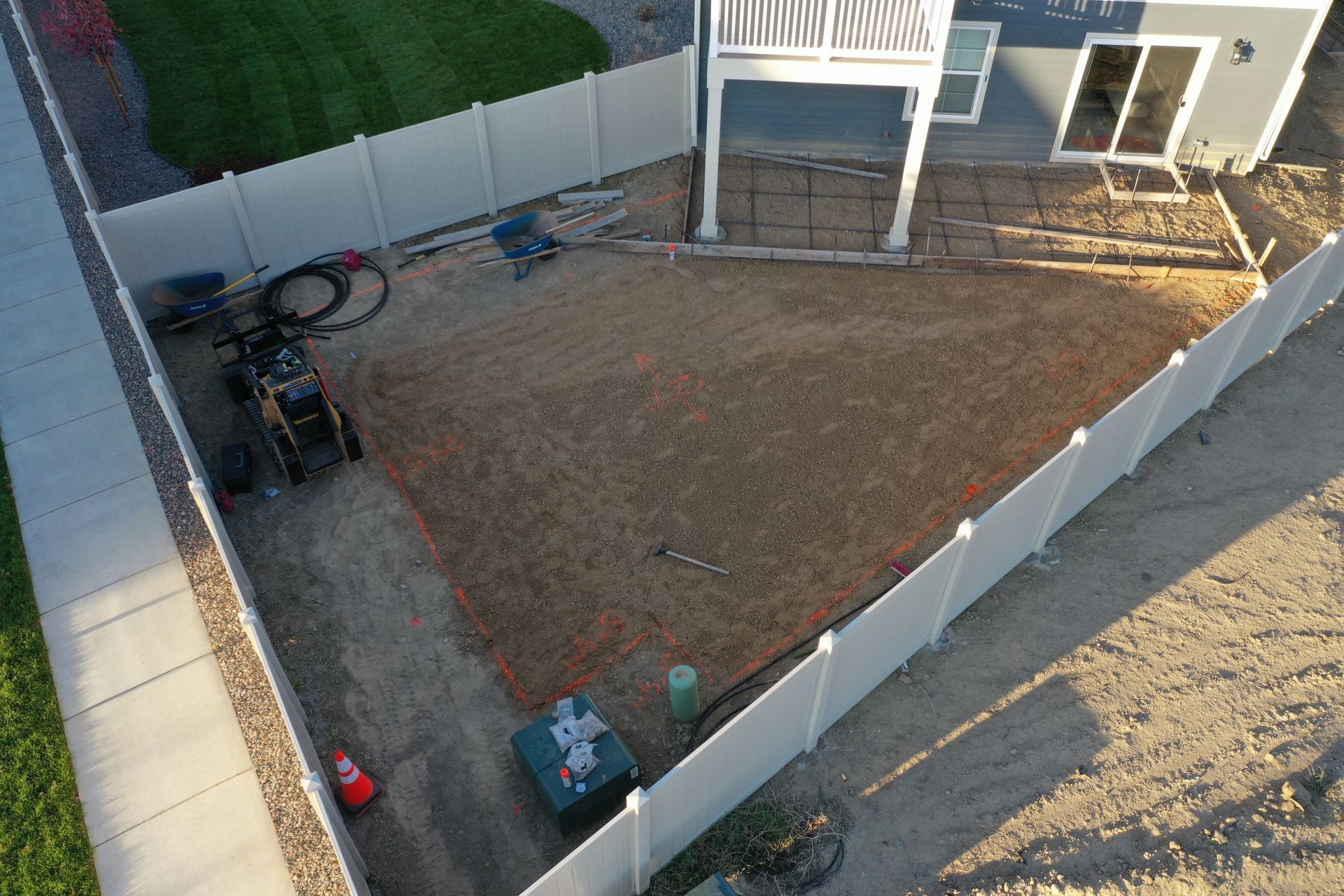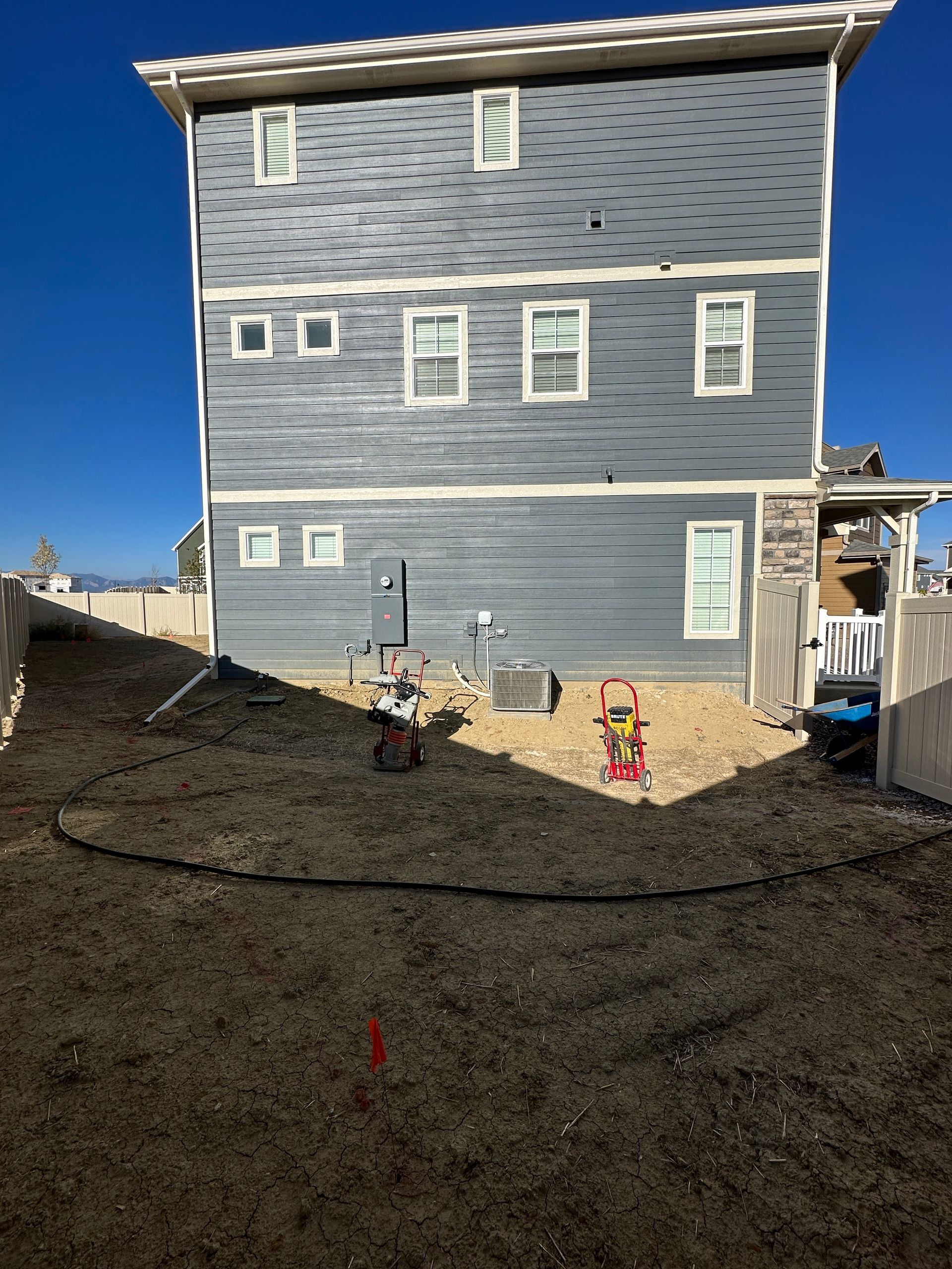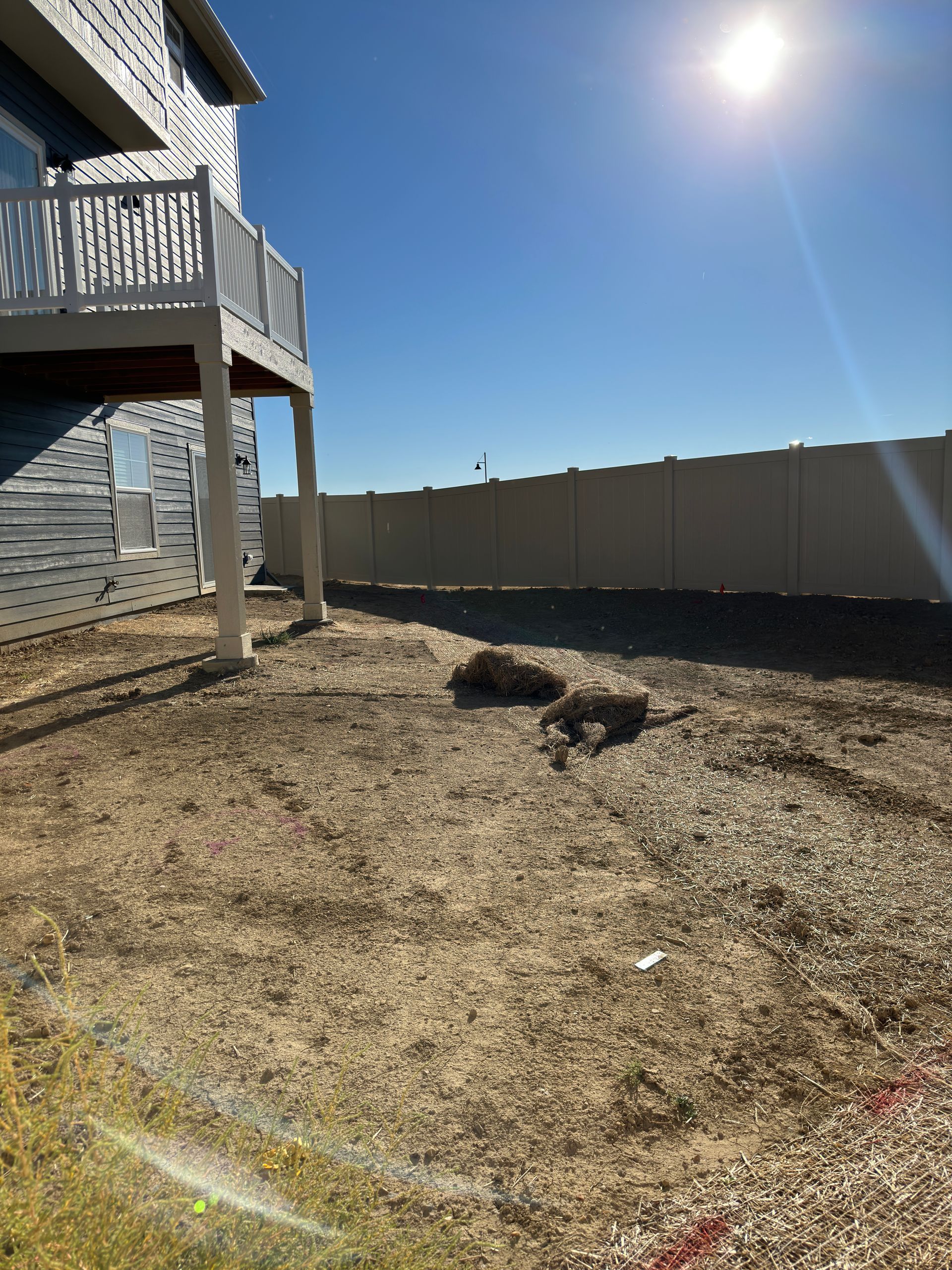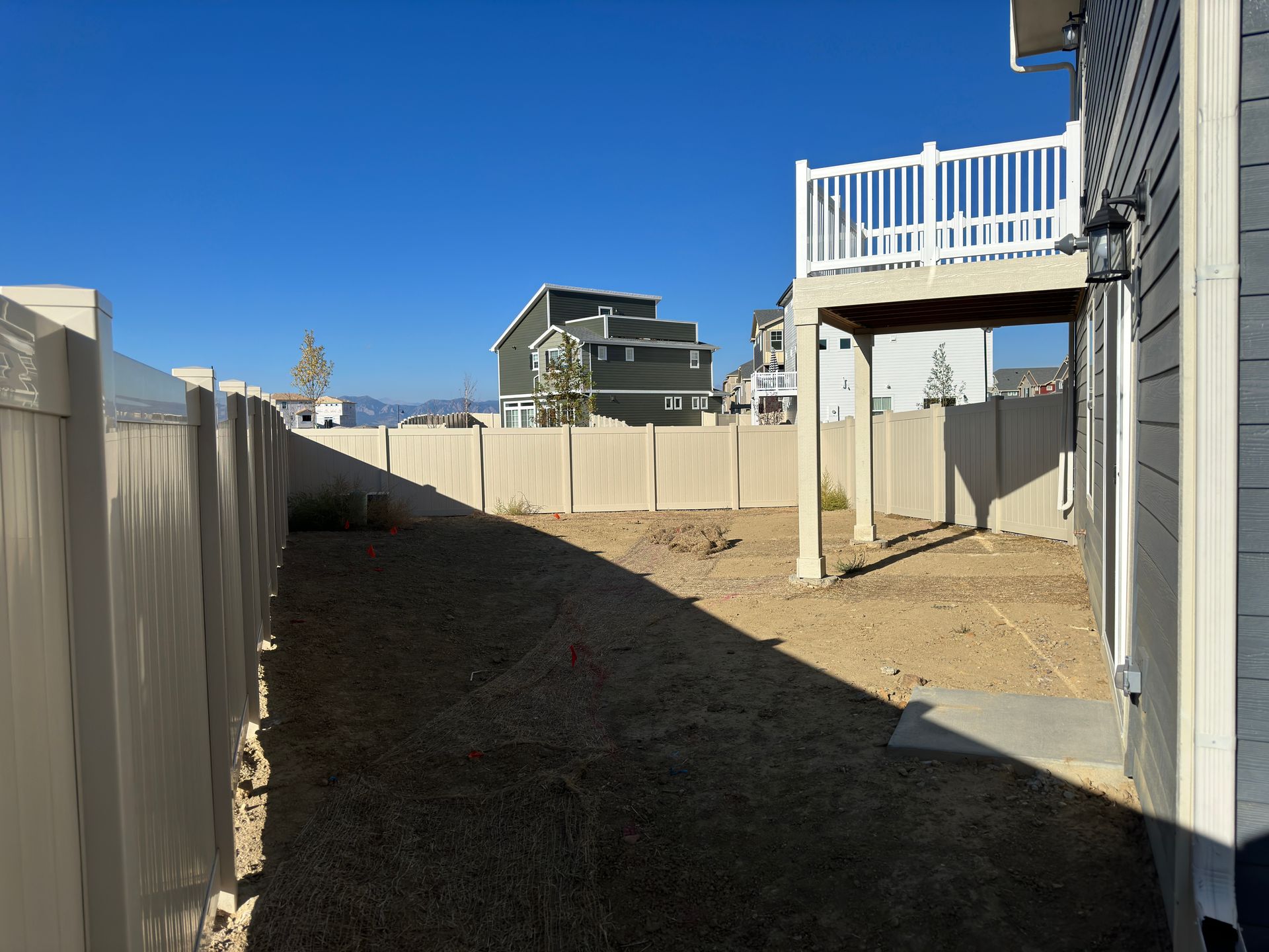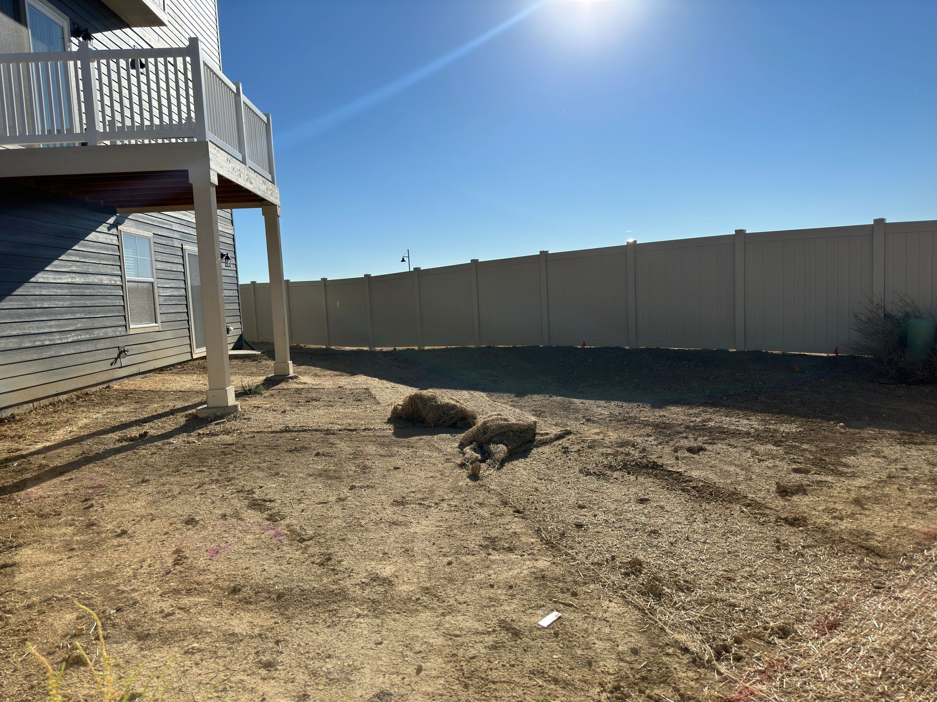 Newly built home with addition of colored concrete patio, artificial turf, irrigation for plants, and rock. Erie, CO 2022