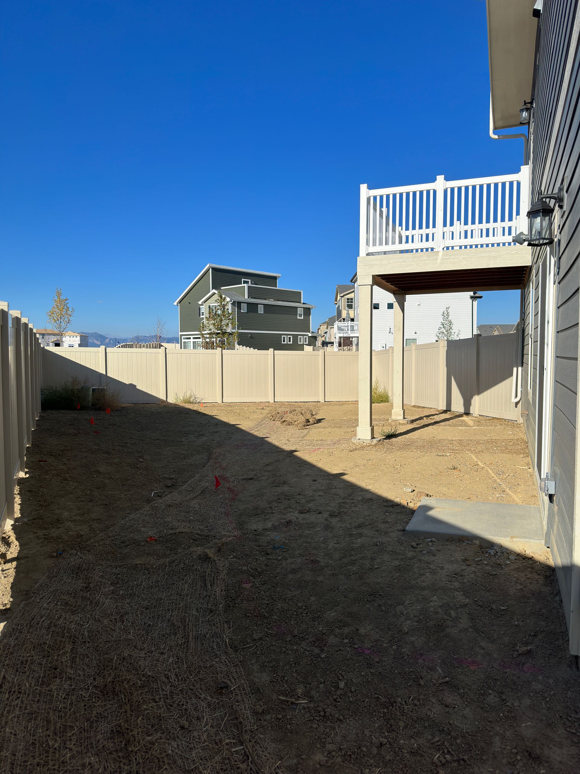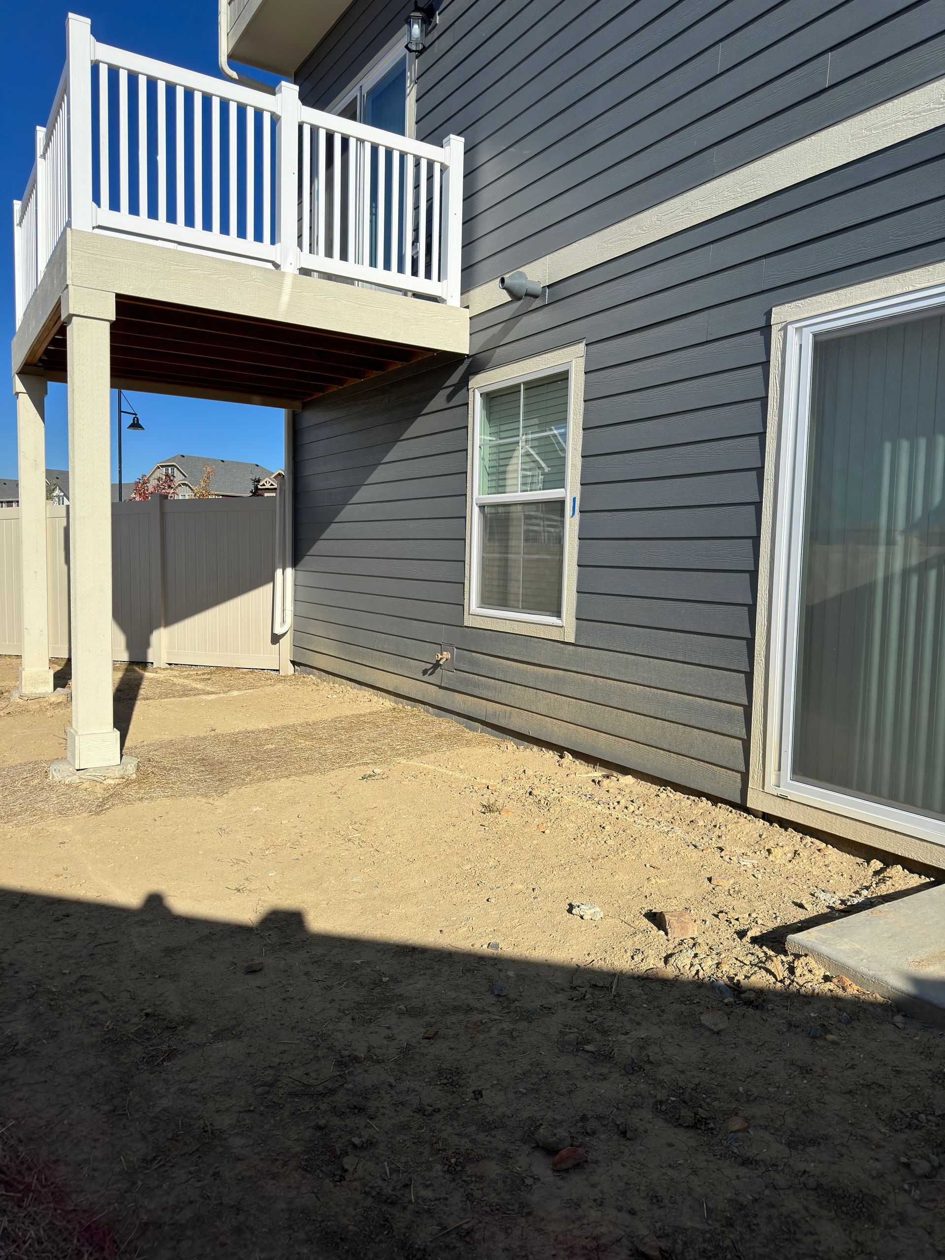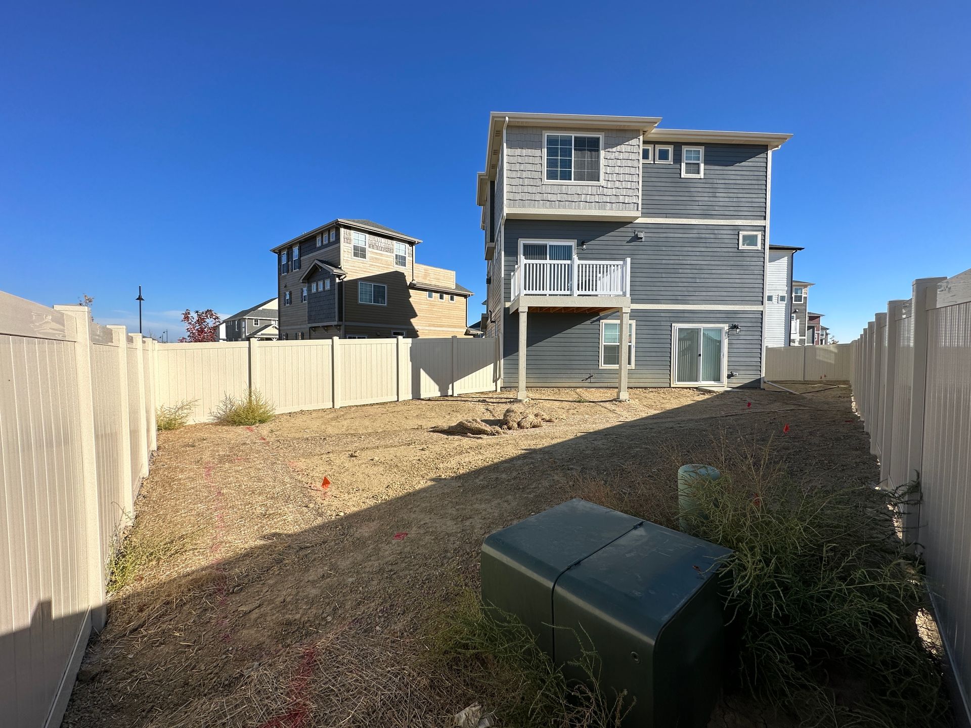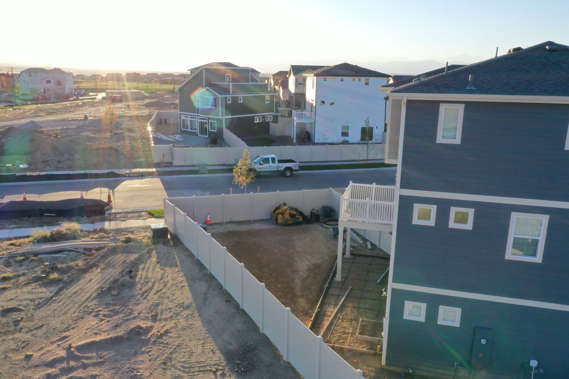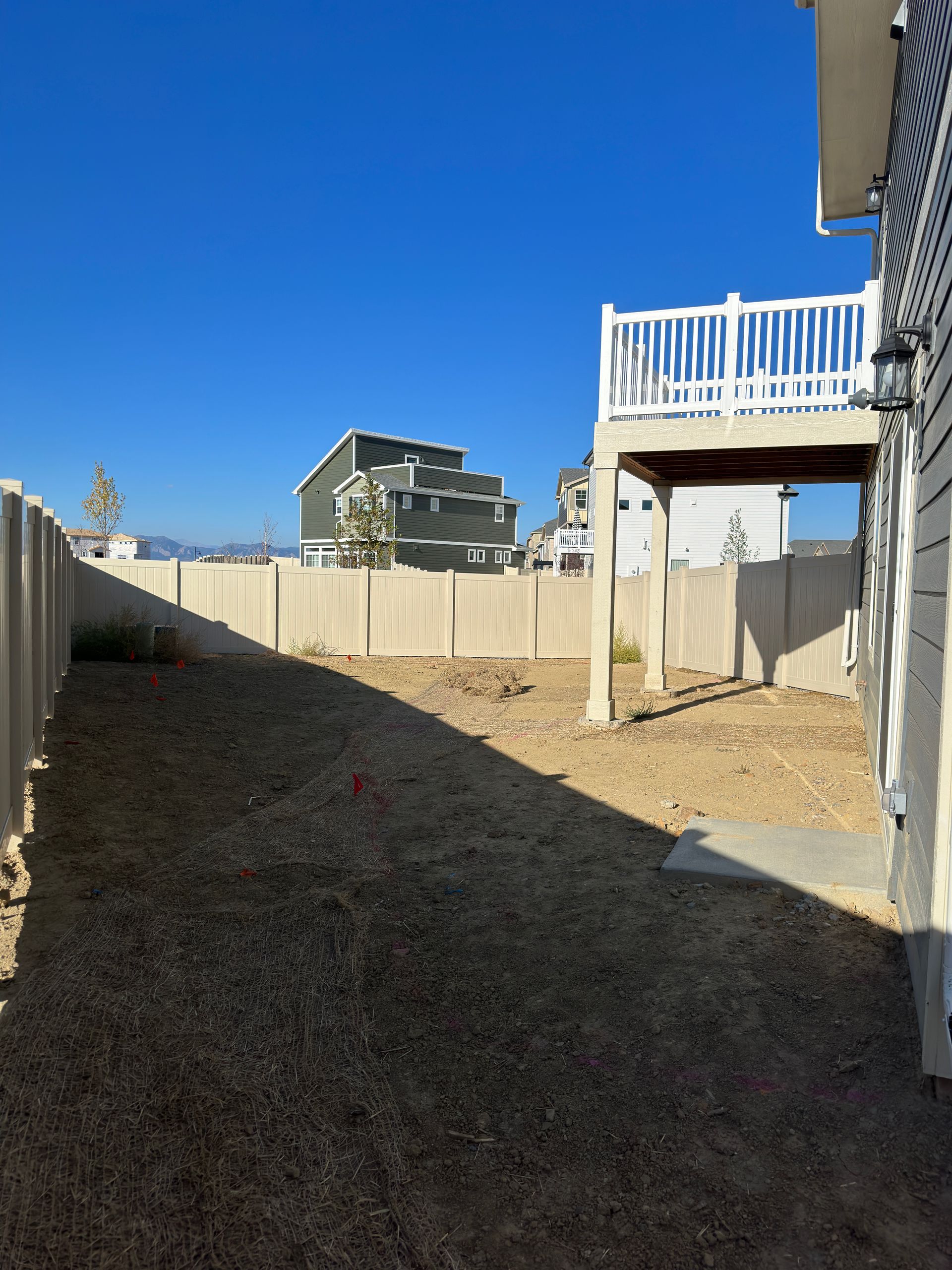 Newly built home with addition of colored concrete patio, artificial turf, irrigation for plants, and rock. Erie, CO 2022