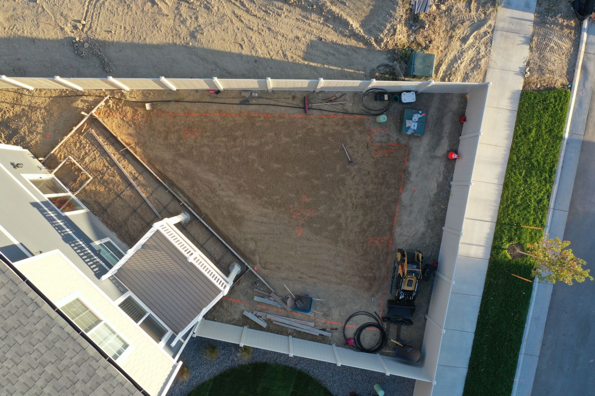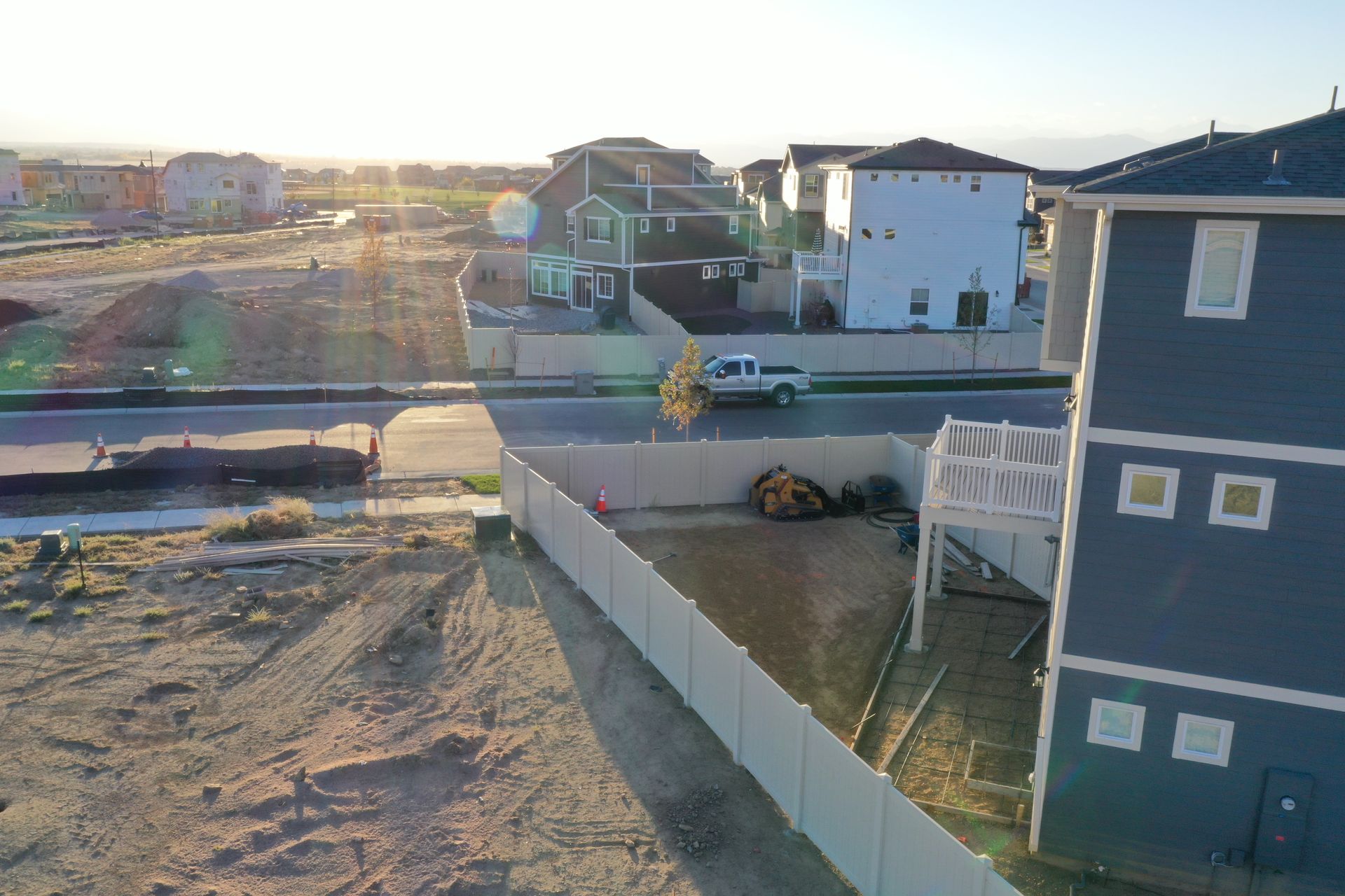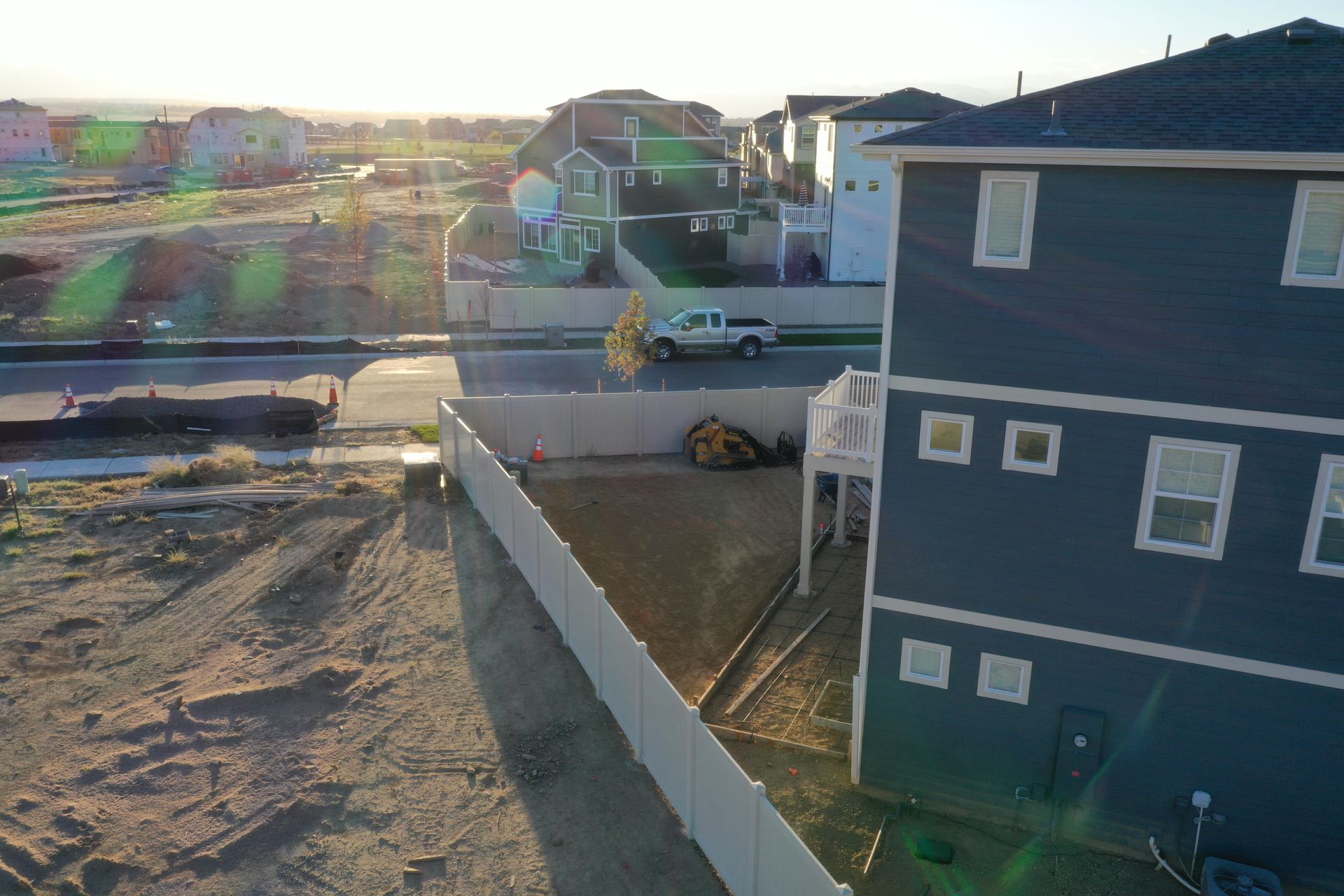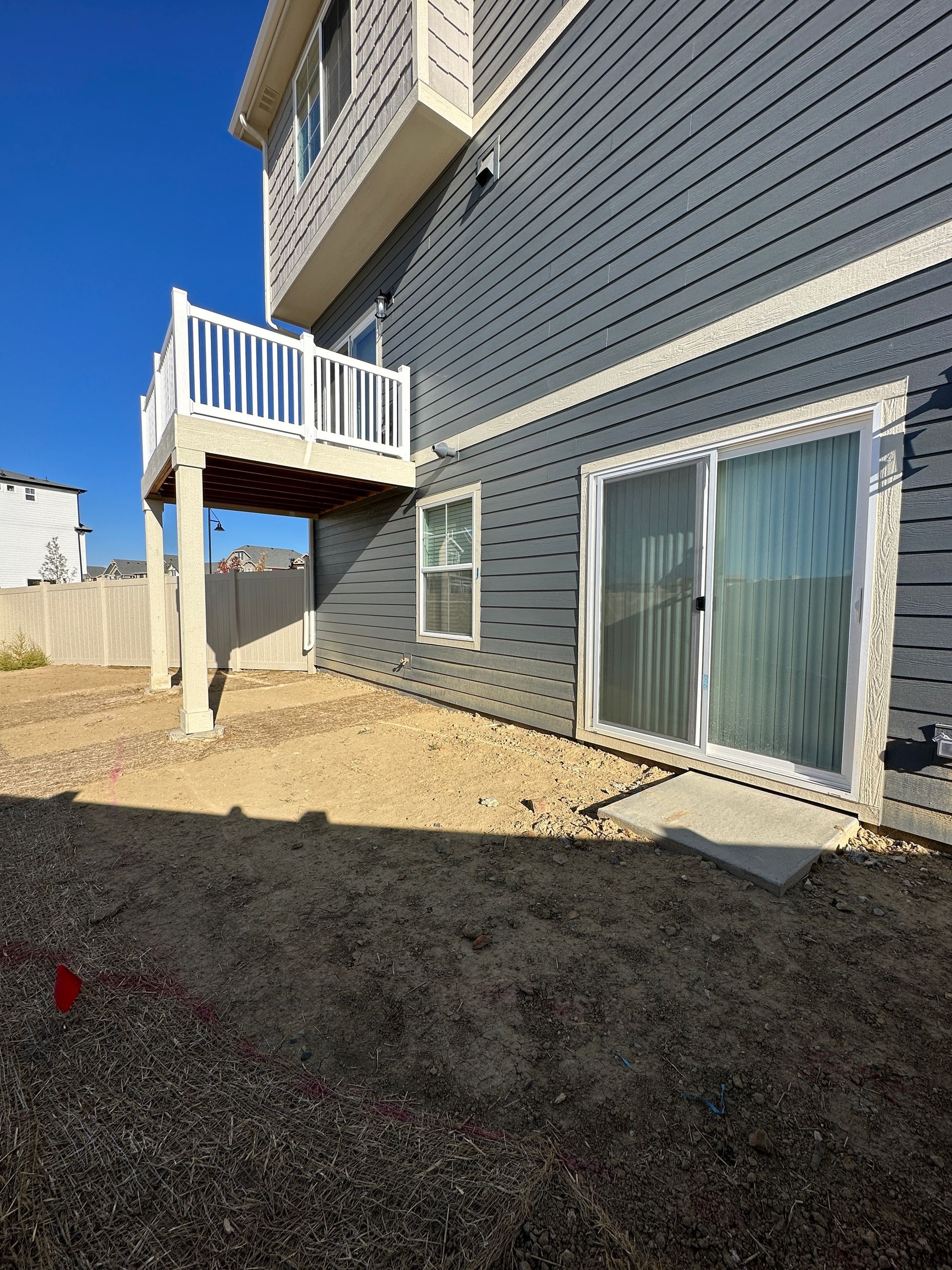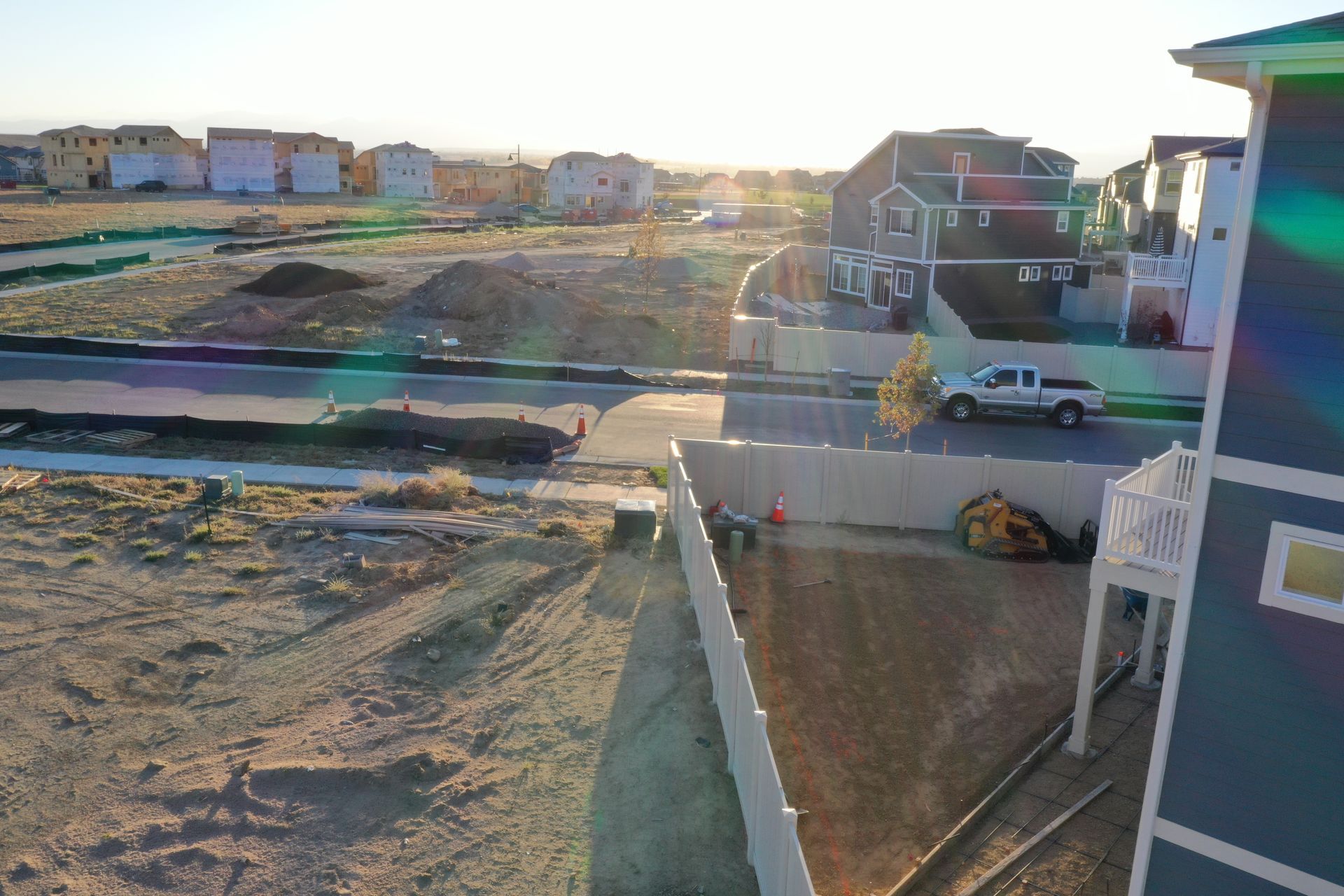 Newly built home with addition of colored concrete patio, artificial turf, irrigation for plants, and rock. Erie, CO 2022