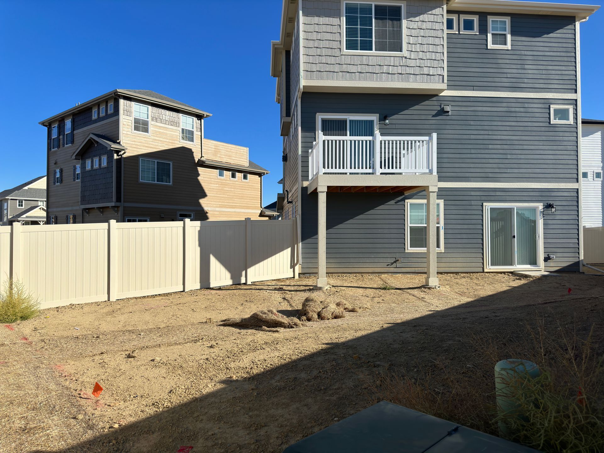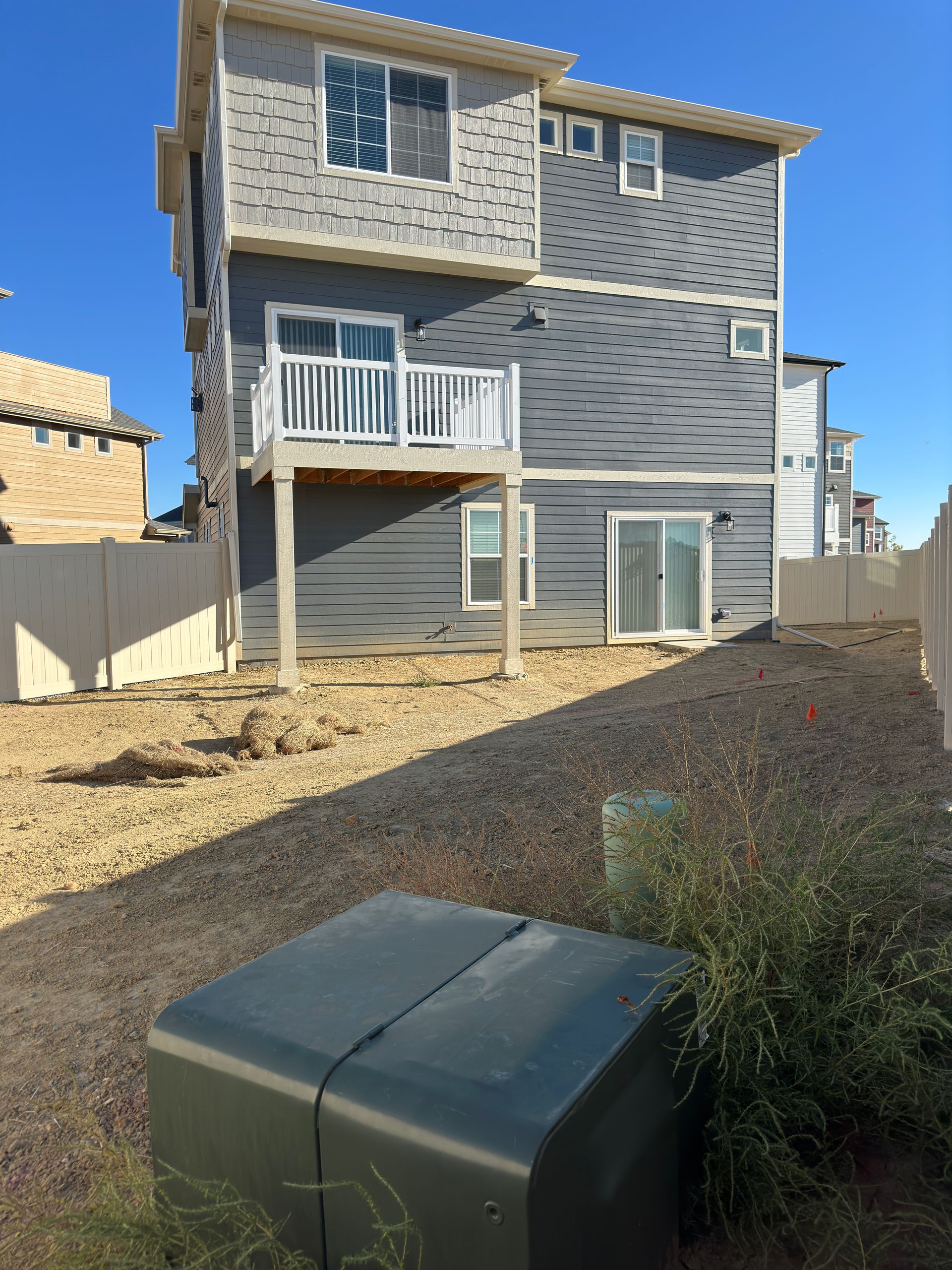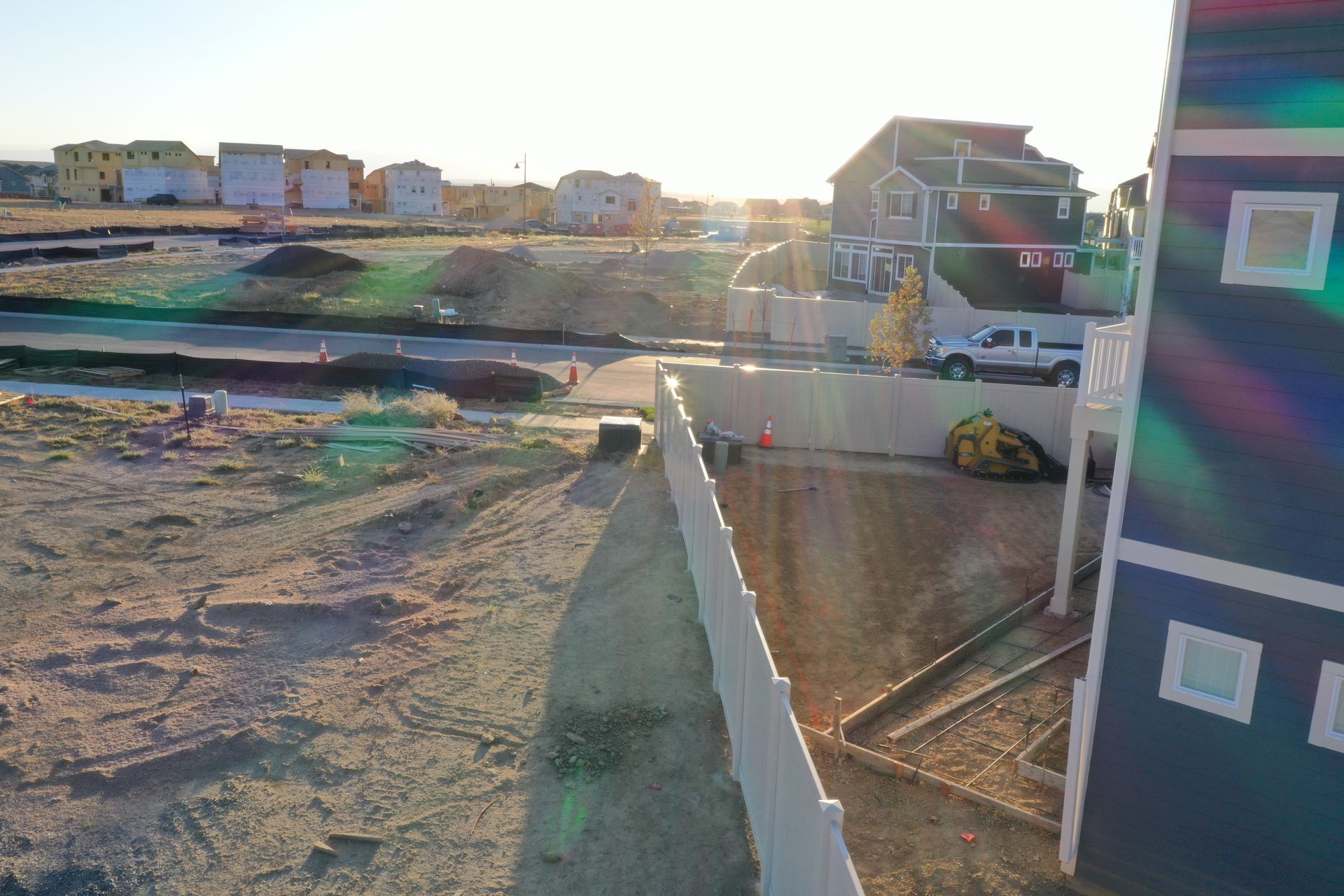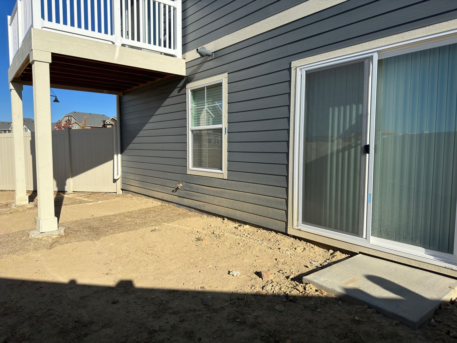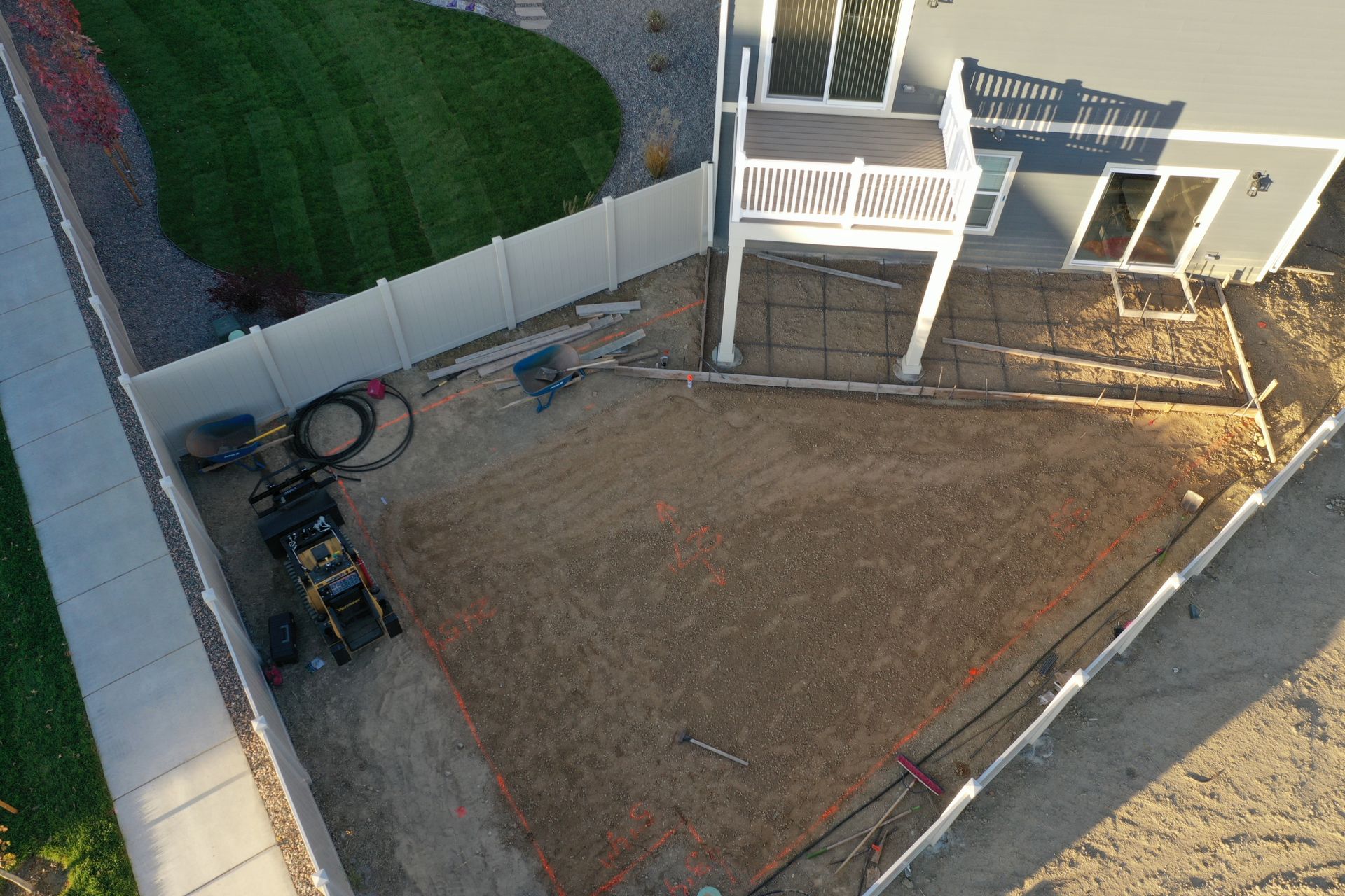 Newly built home with addition of colored concrete patio, artificial turf, irrigation for plants, and rock. Erie, CO 2022