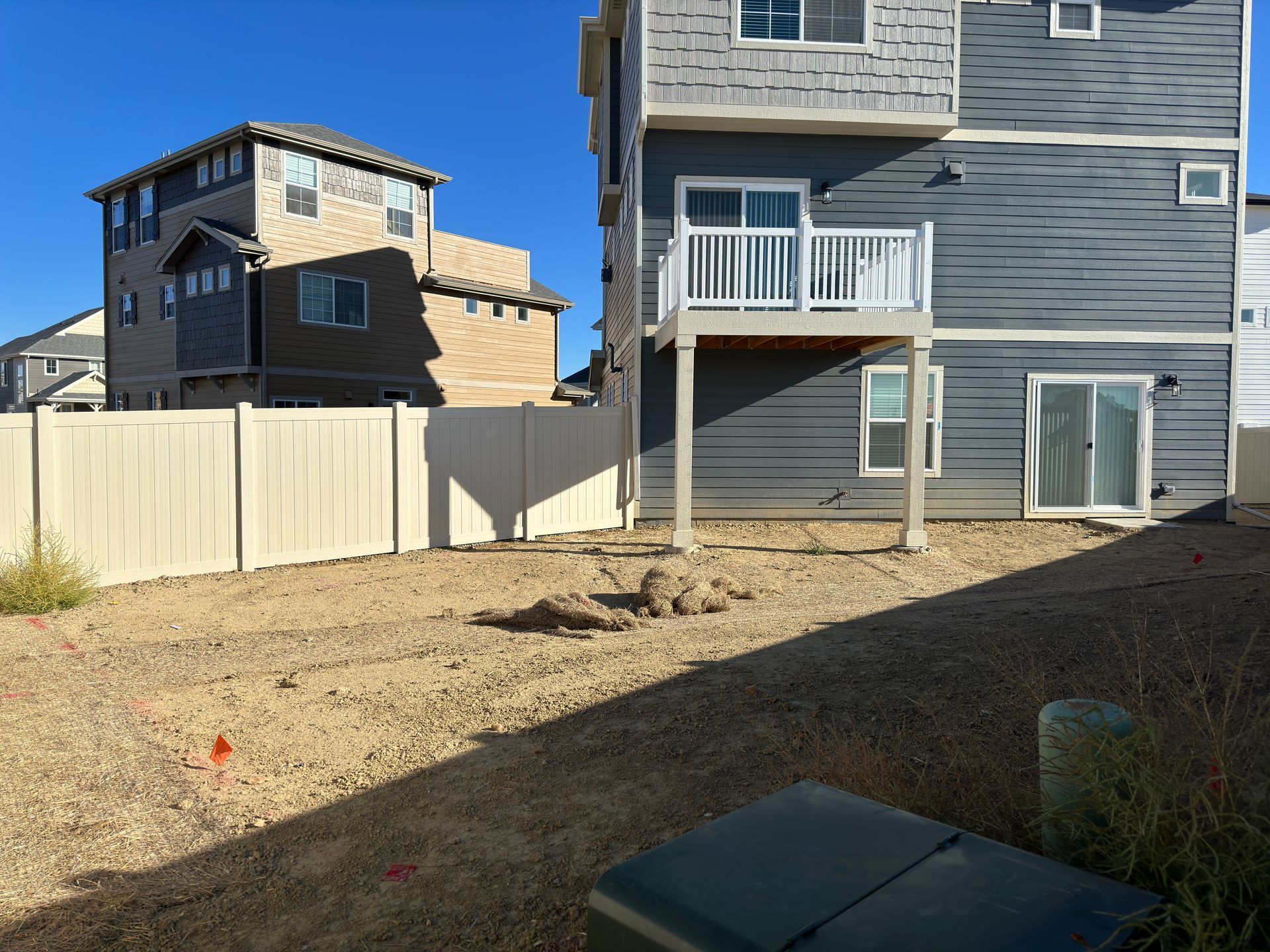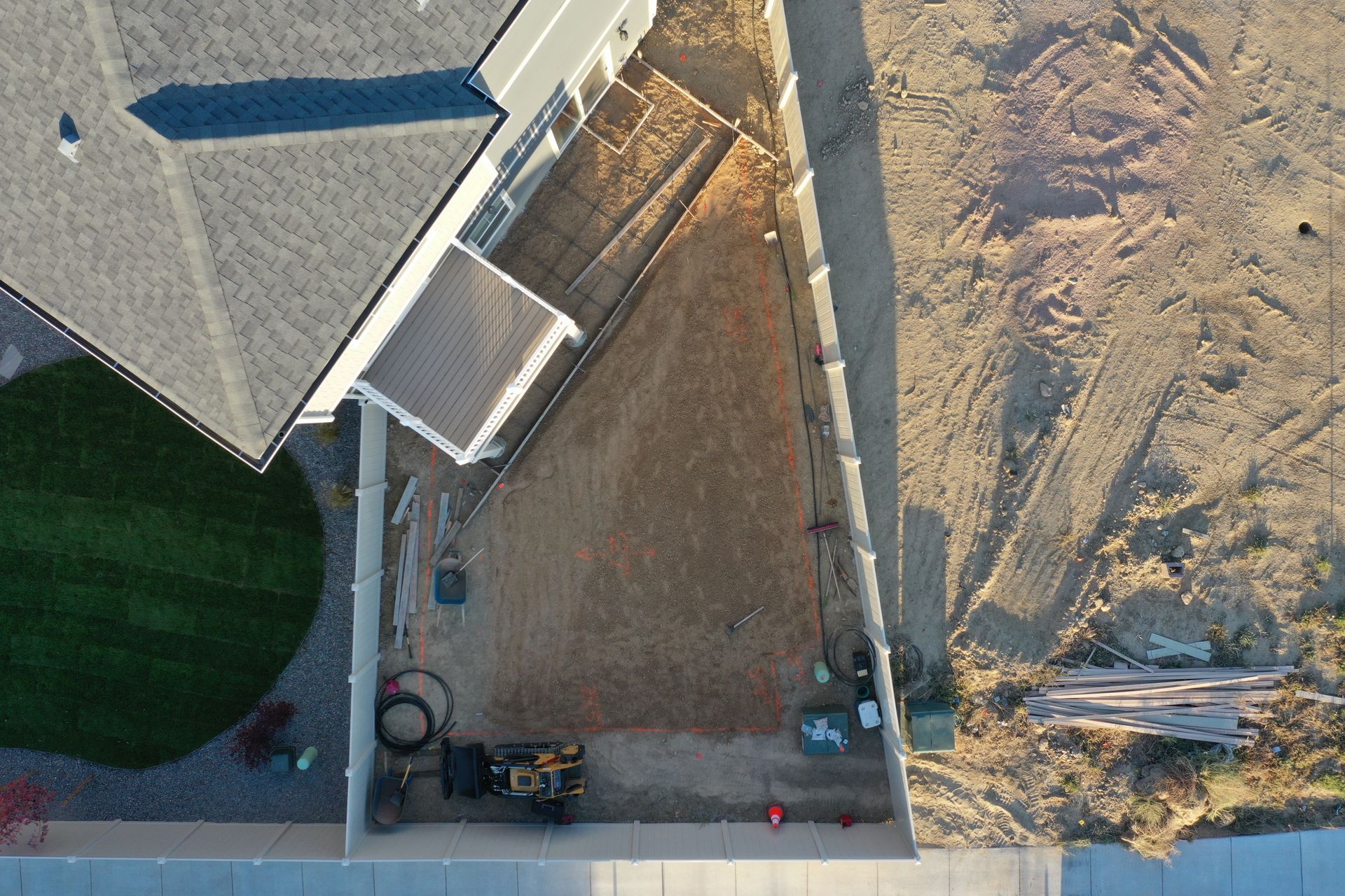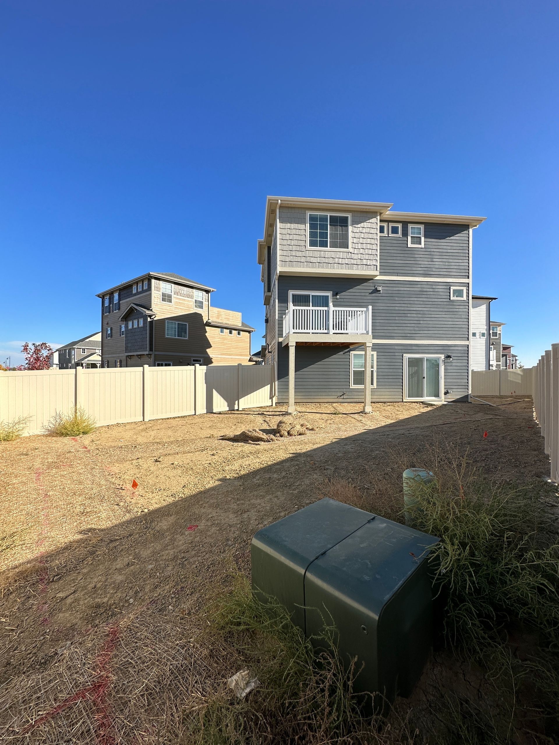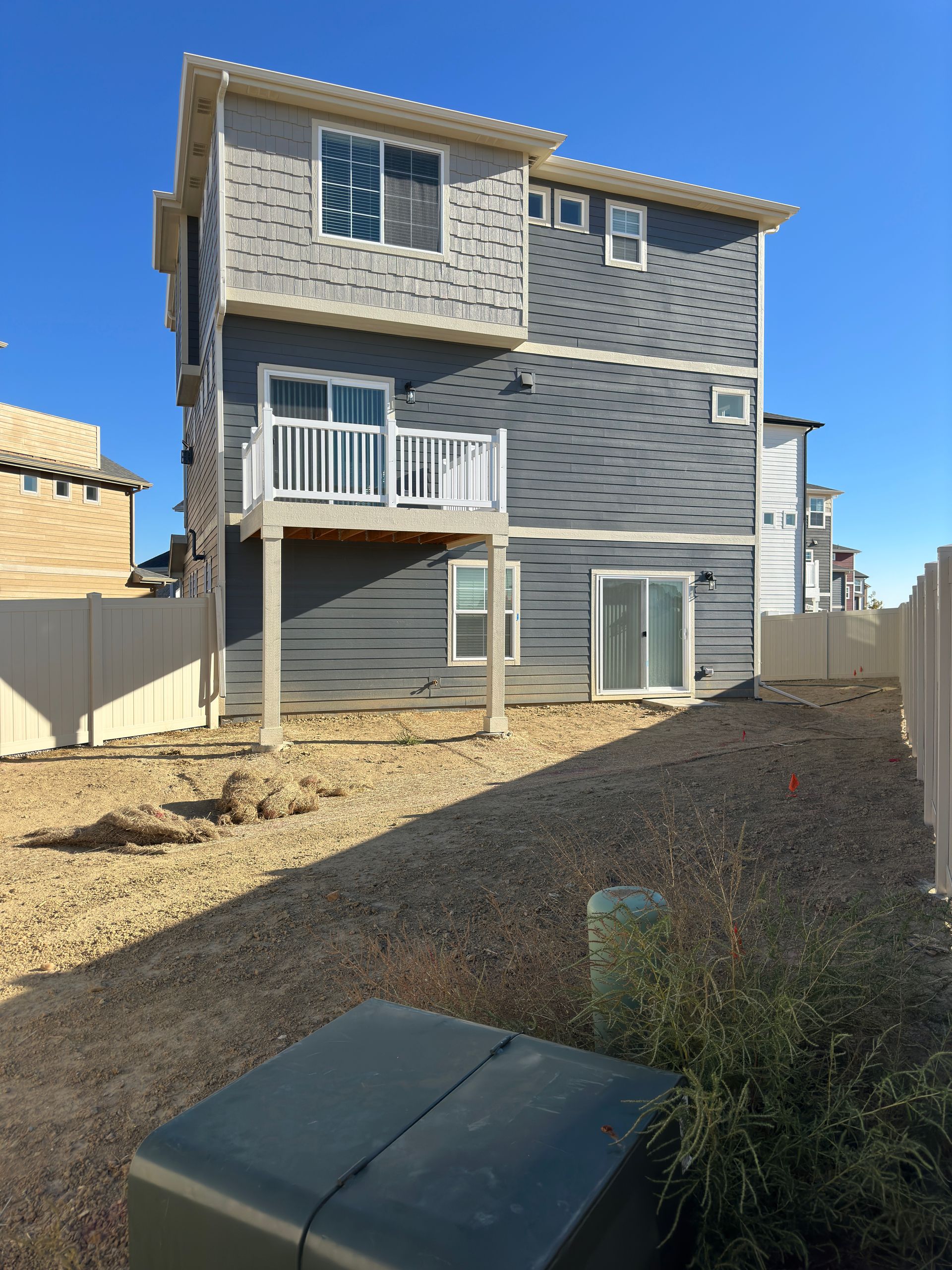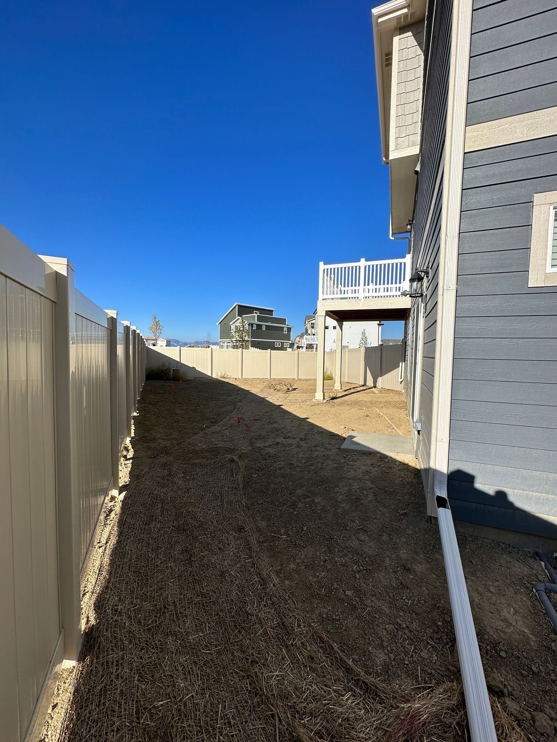 Newly built home with addition of colored concrete patio, artificial turf, irrigation for plants, and rock. Erie, CO 2022