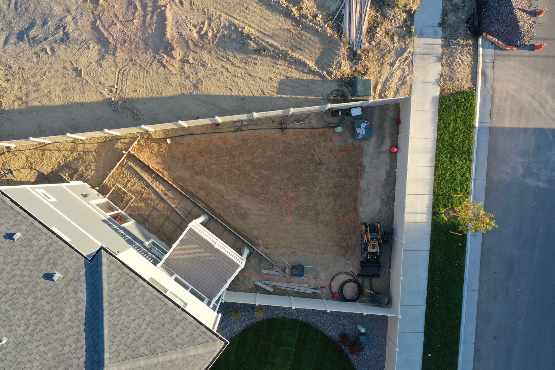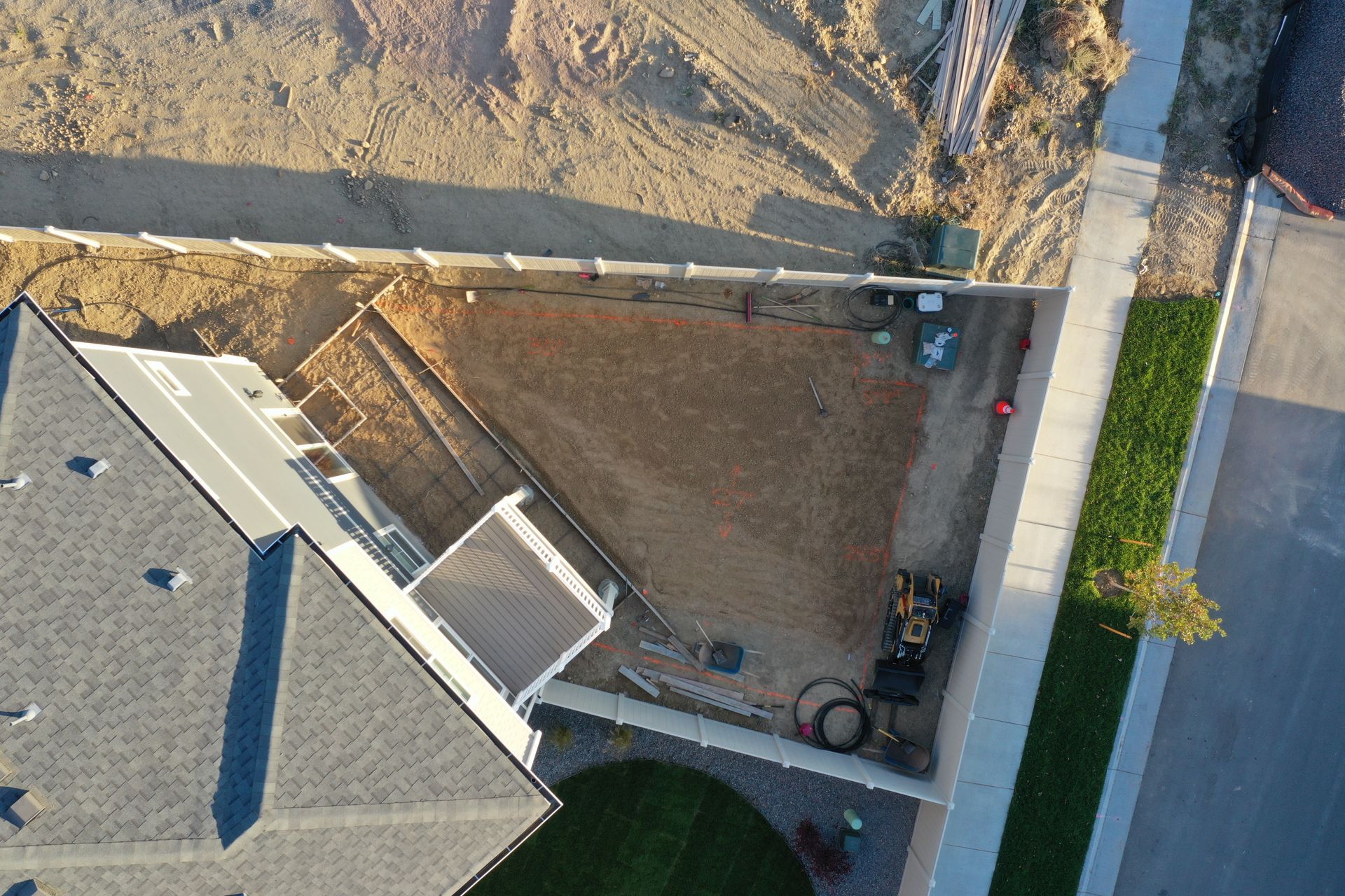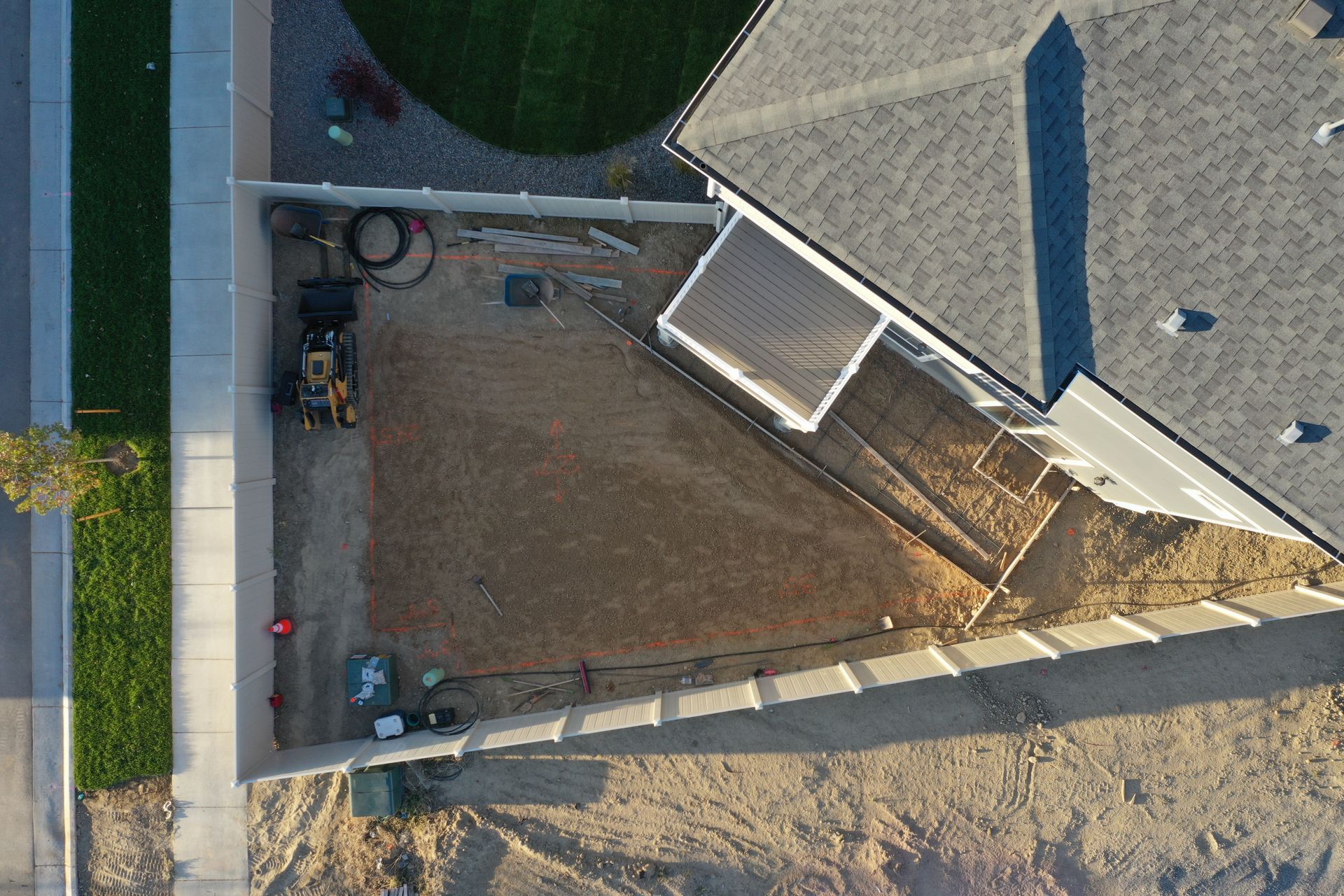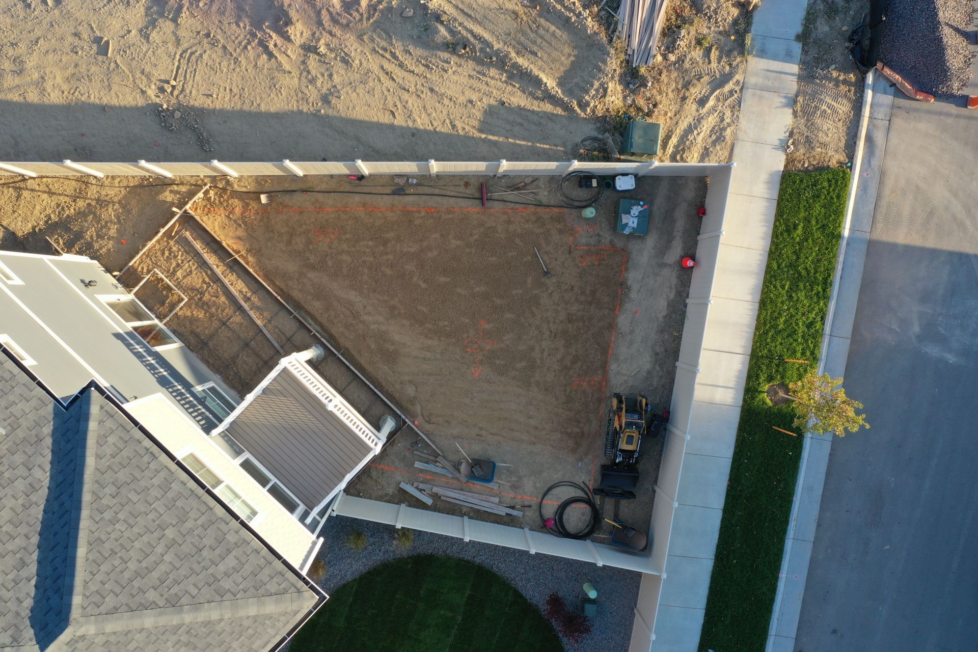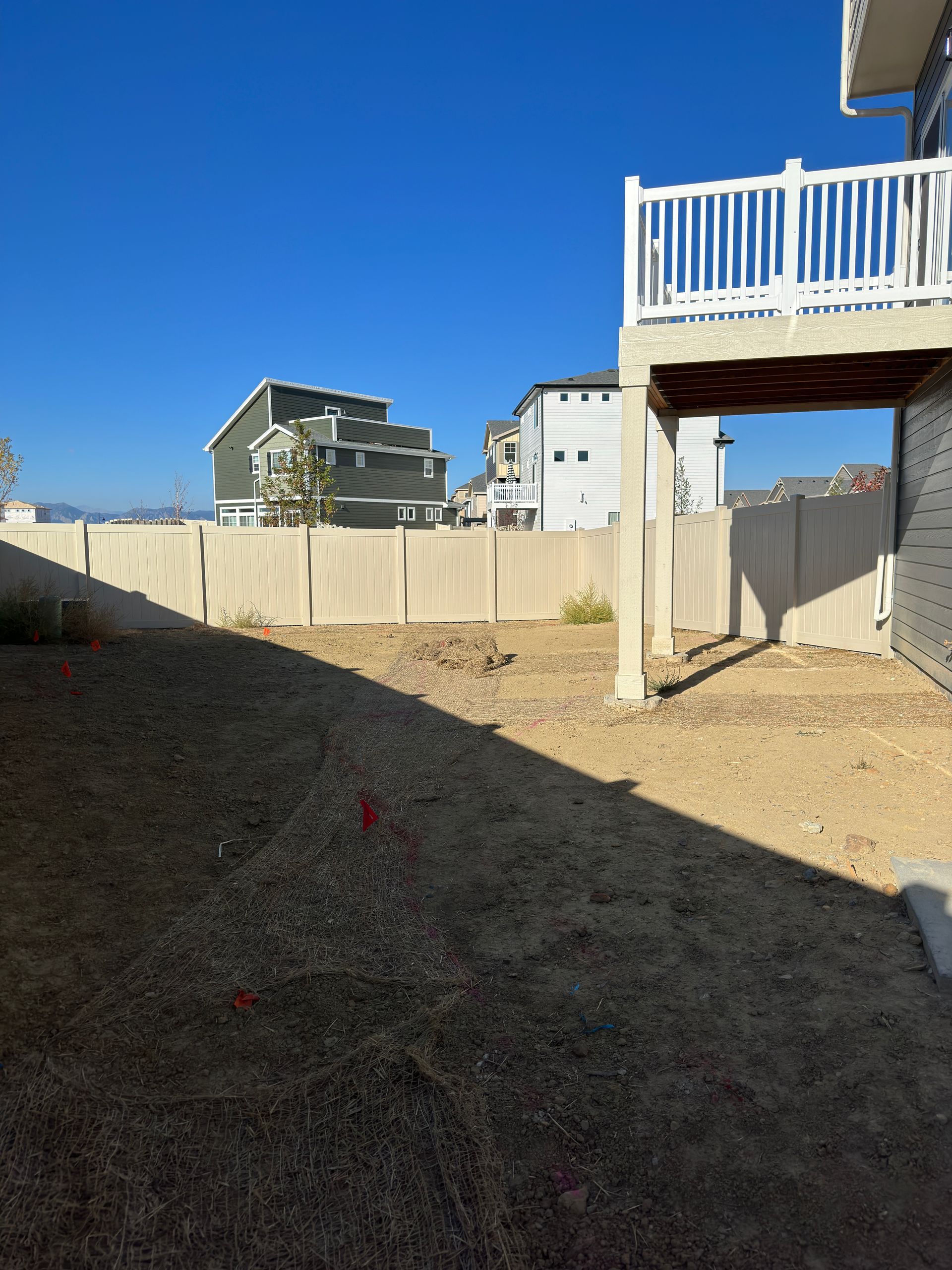 Newly built home with addition of colored concrete patio, artificial turf, irrigation for plants, and rock. Erie, CO 2022