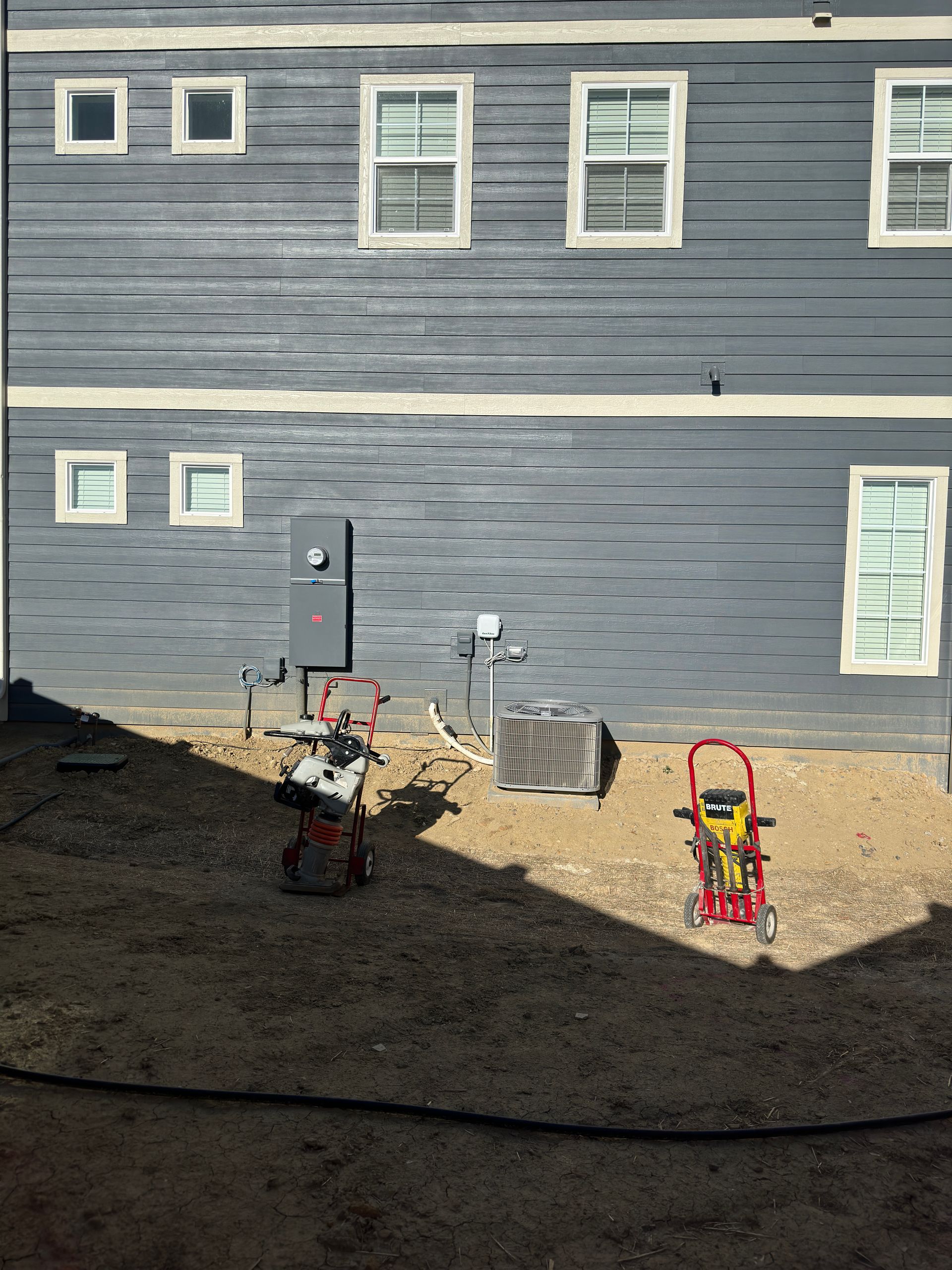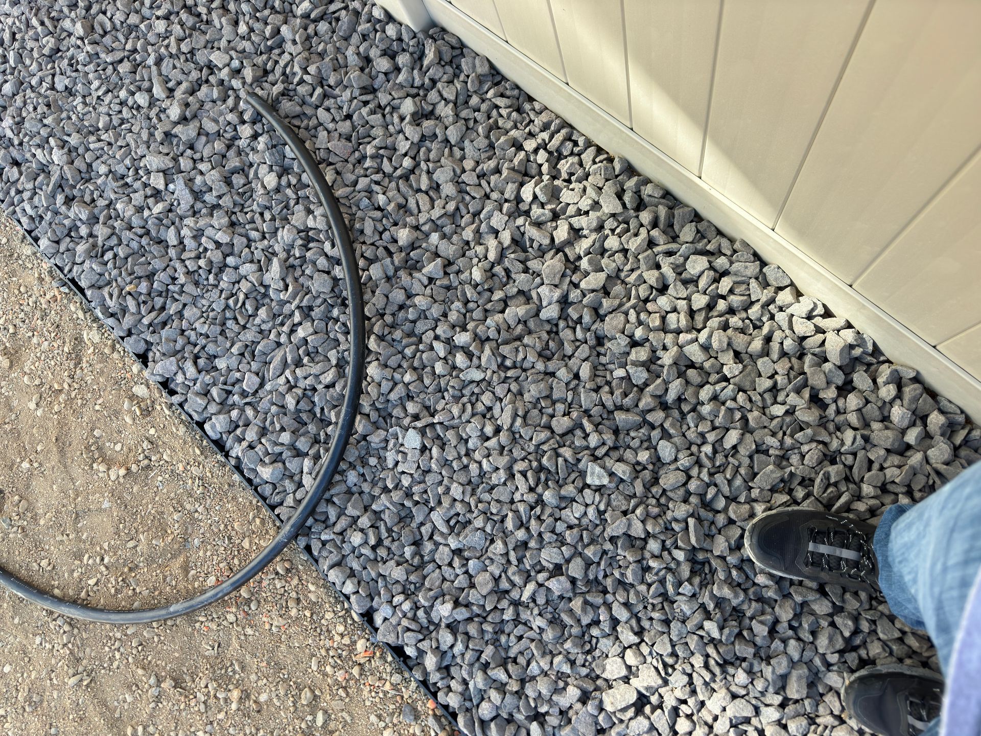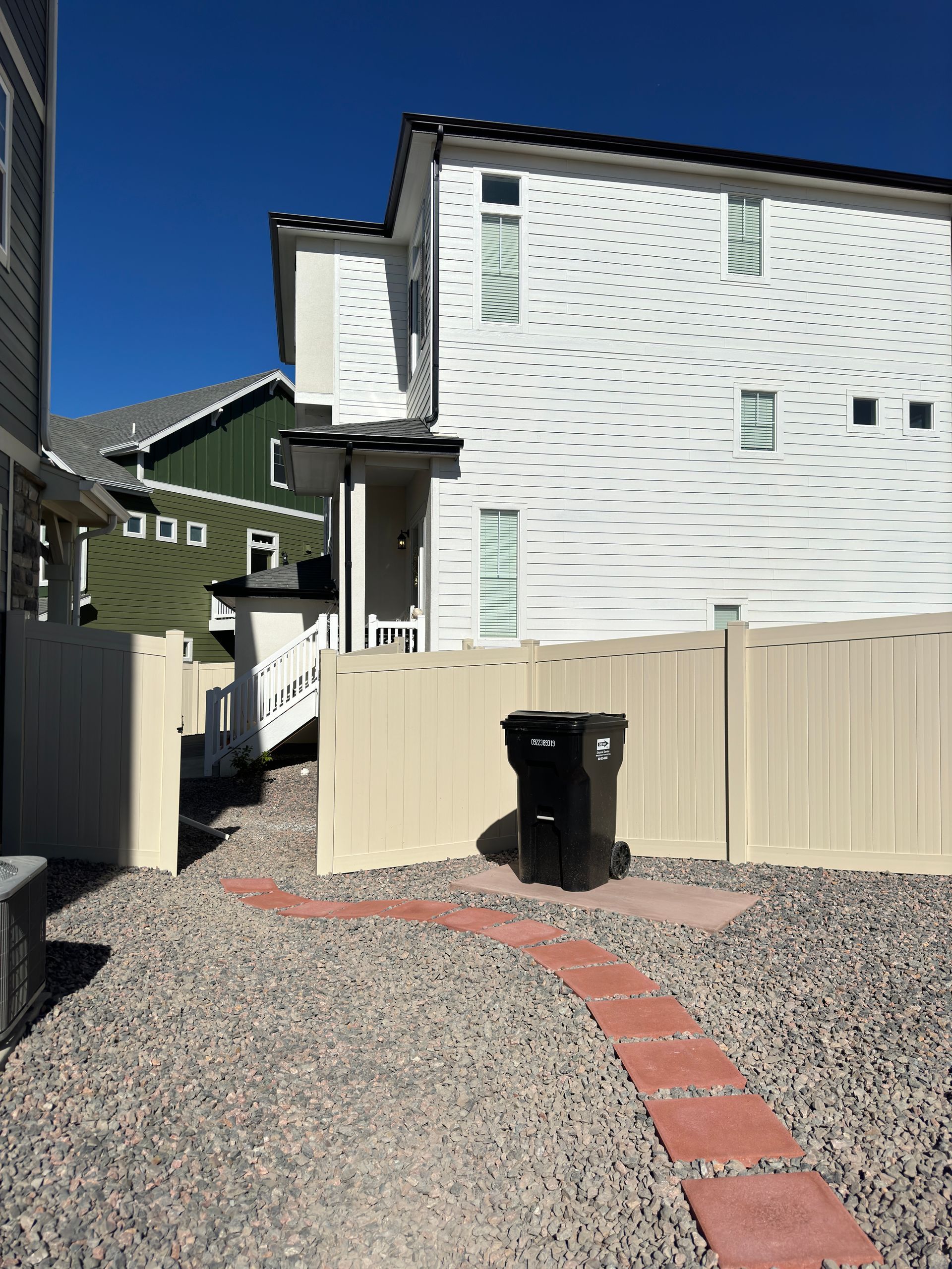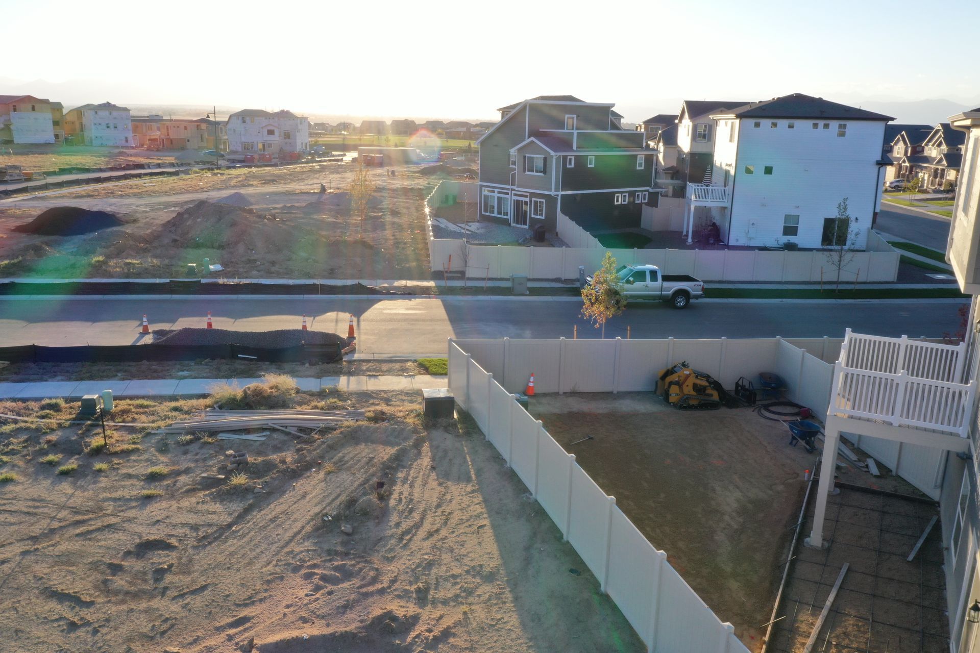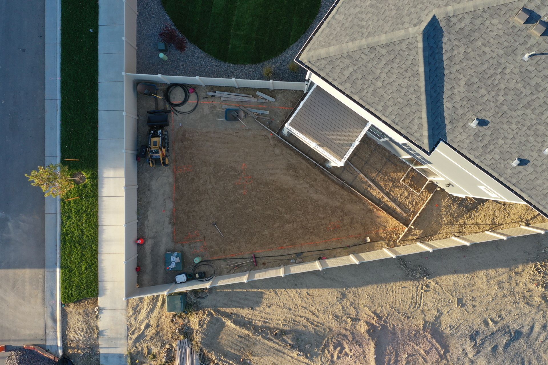 Newly built home with addition of colored concrete patio, artificial turf, irrigation for plants, and rock. Erie, CO 2022
