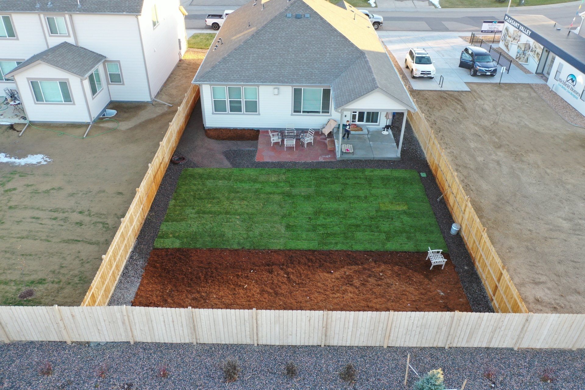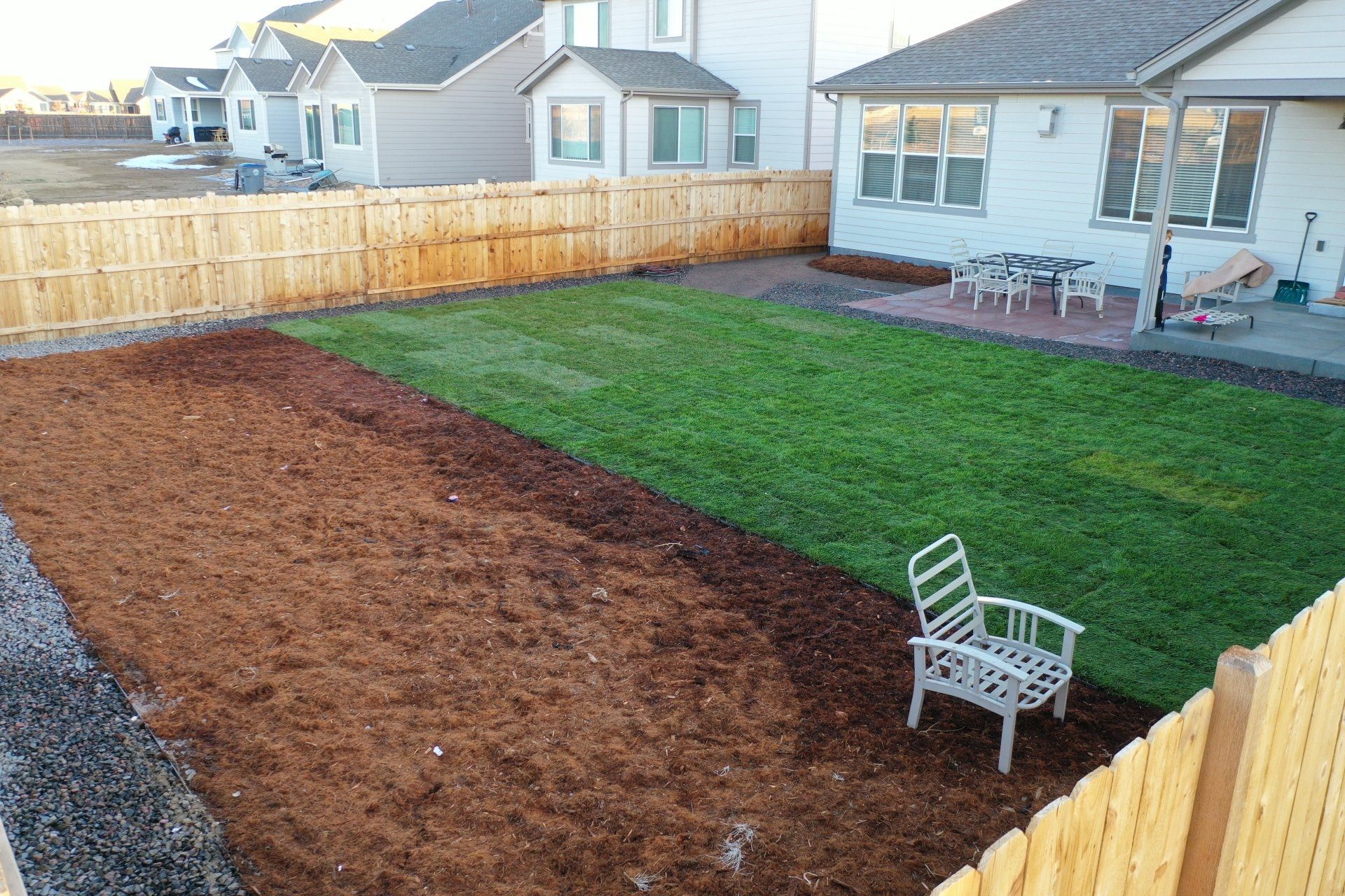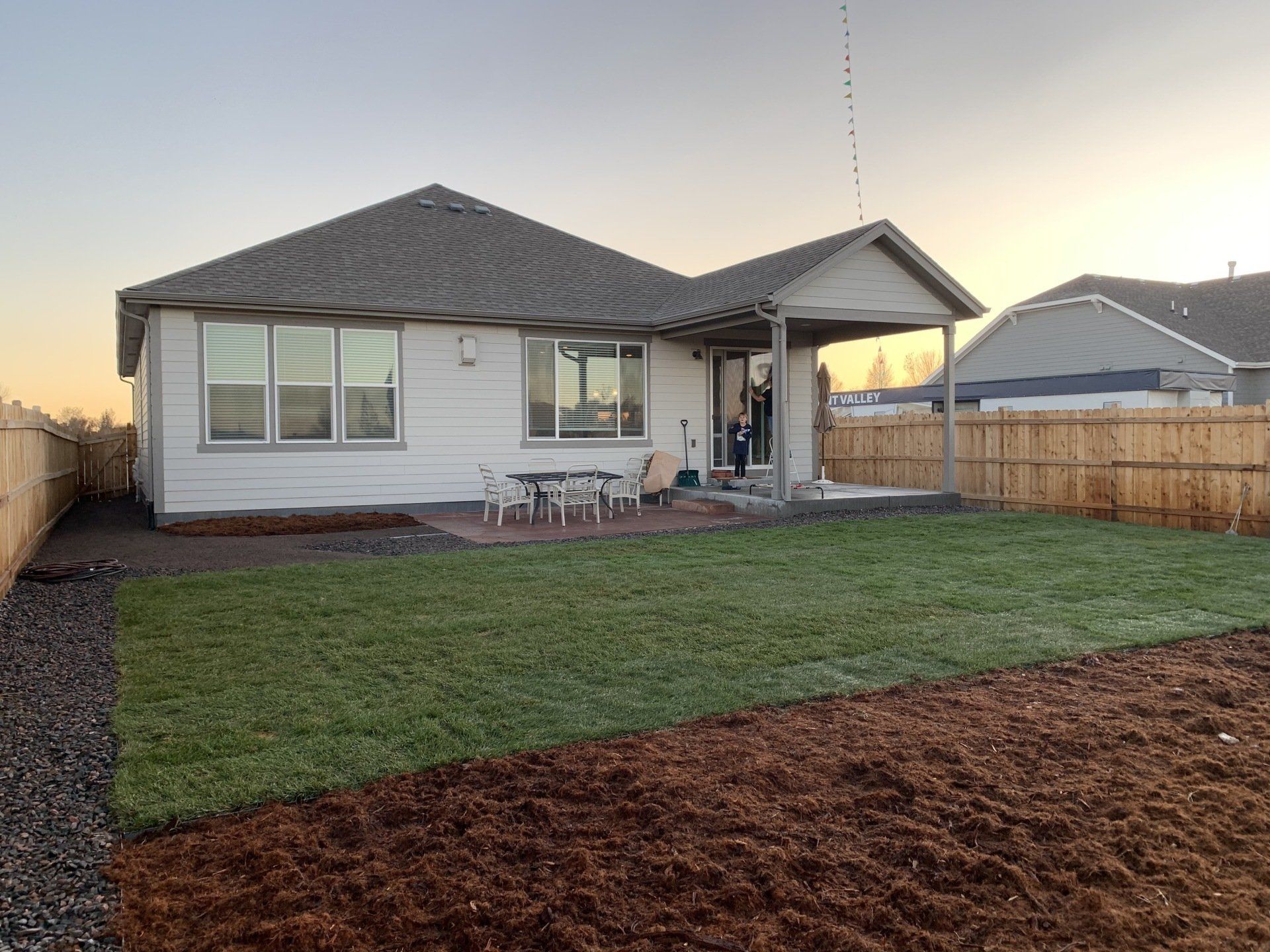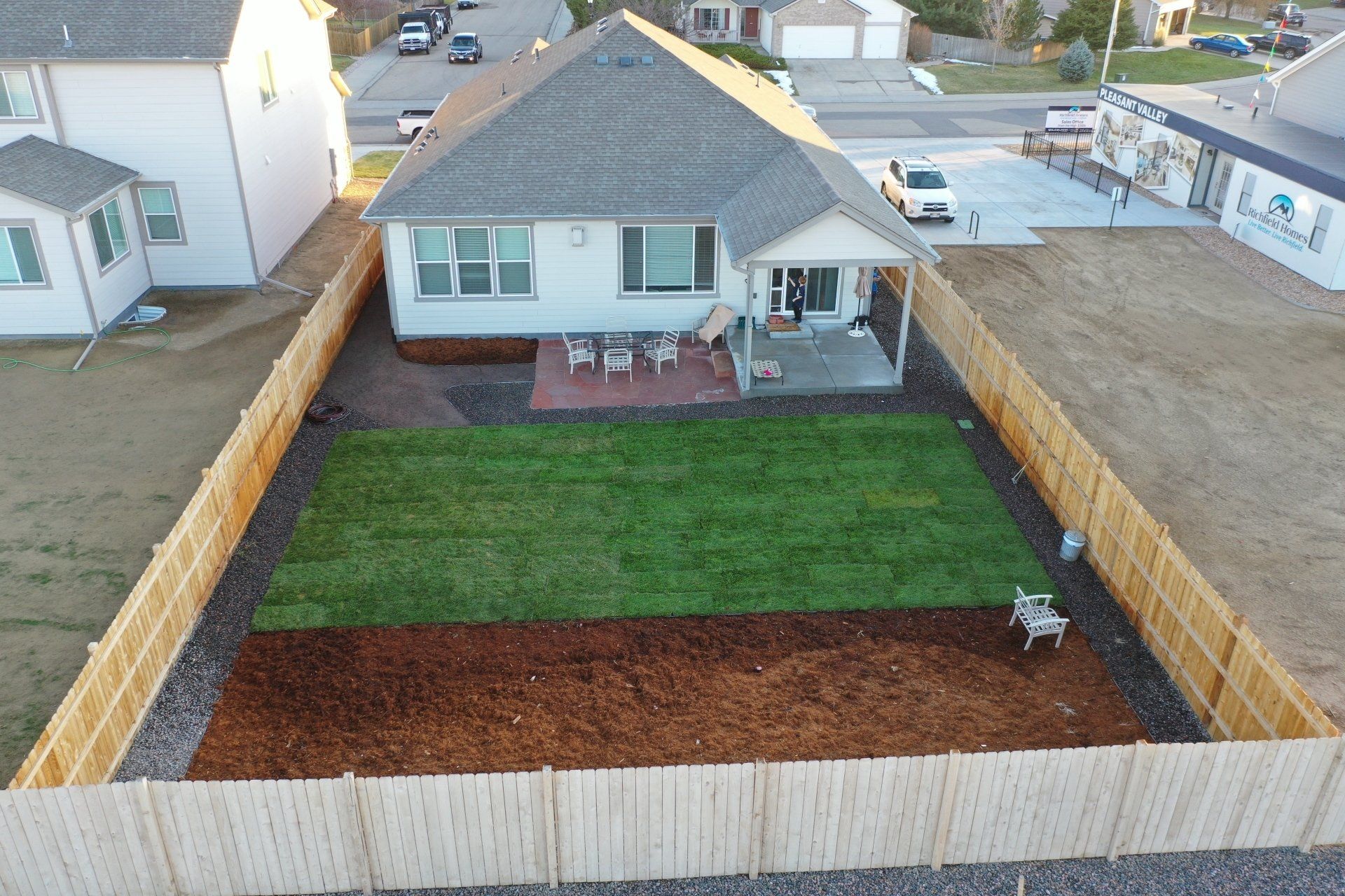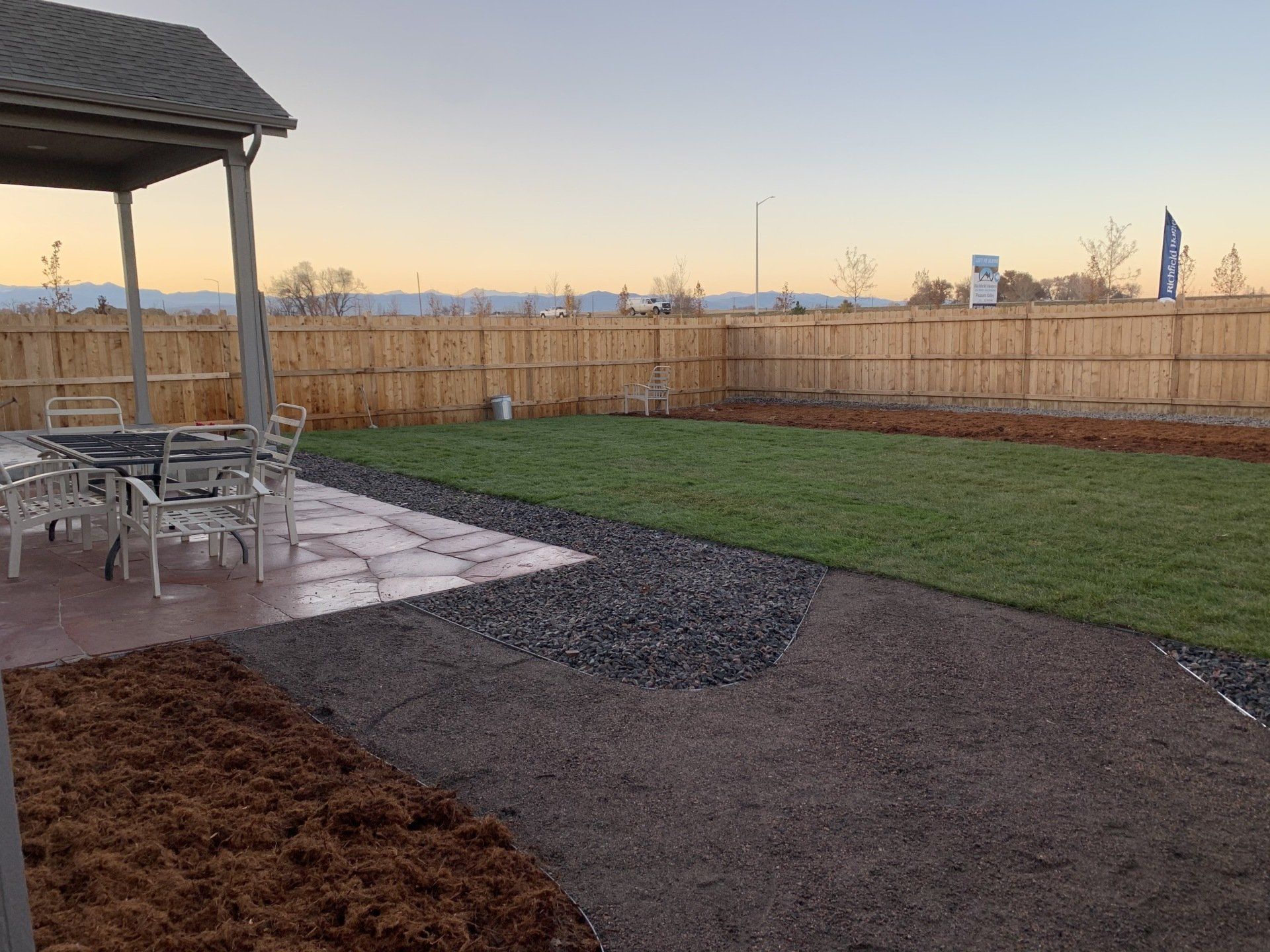 Newly built home with Kentucky bluegrass, Colorado red flagstone patio, crushed fines walkway, and gorilla hair mulch.