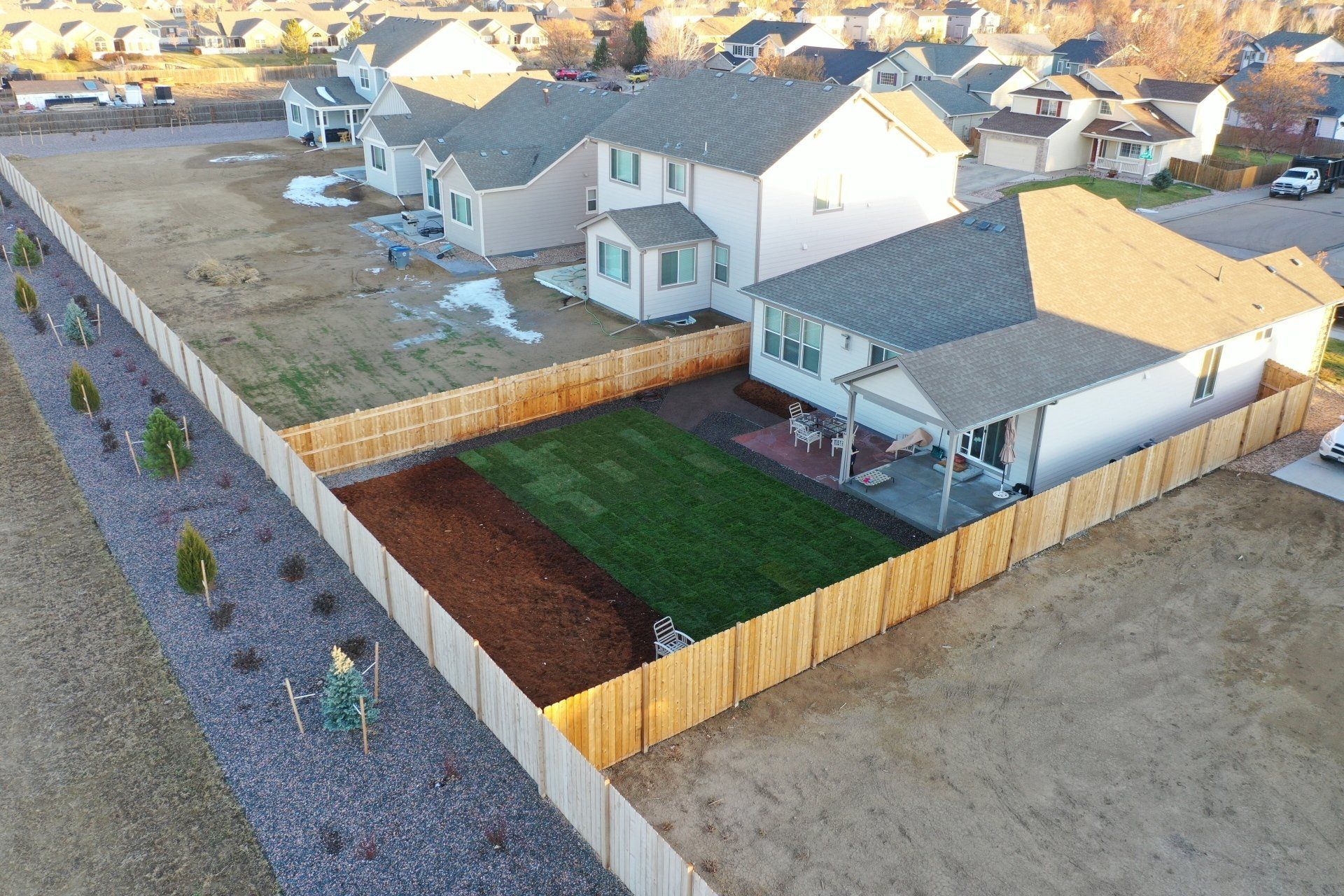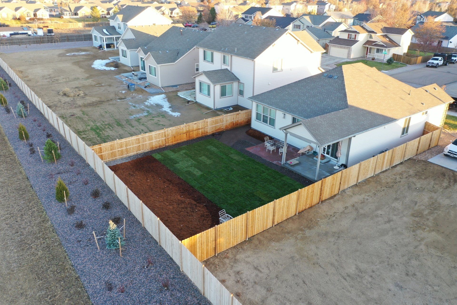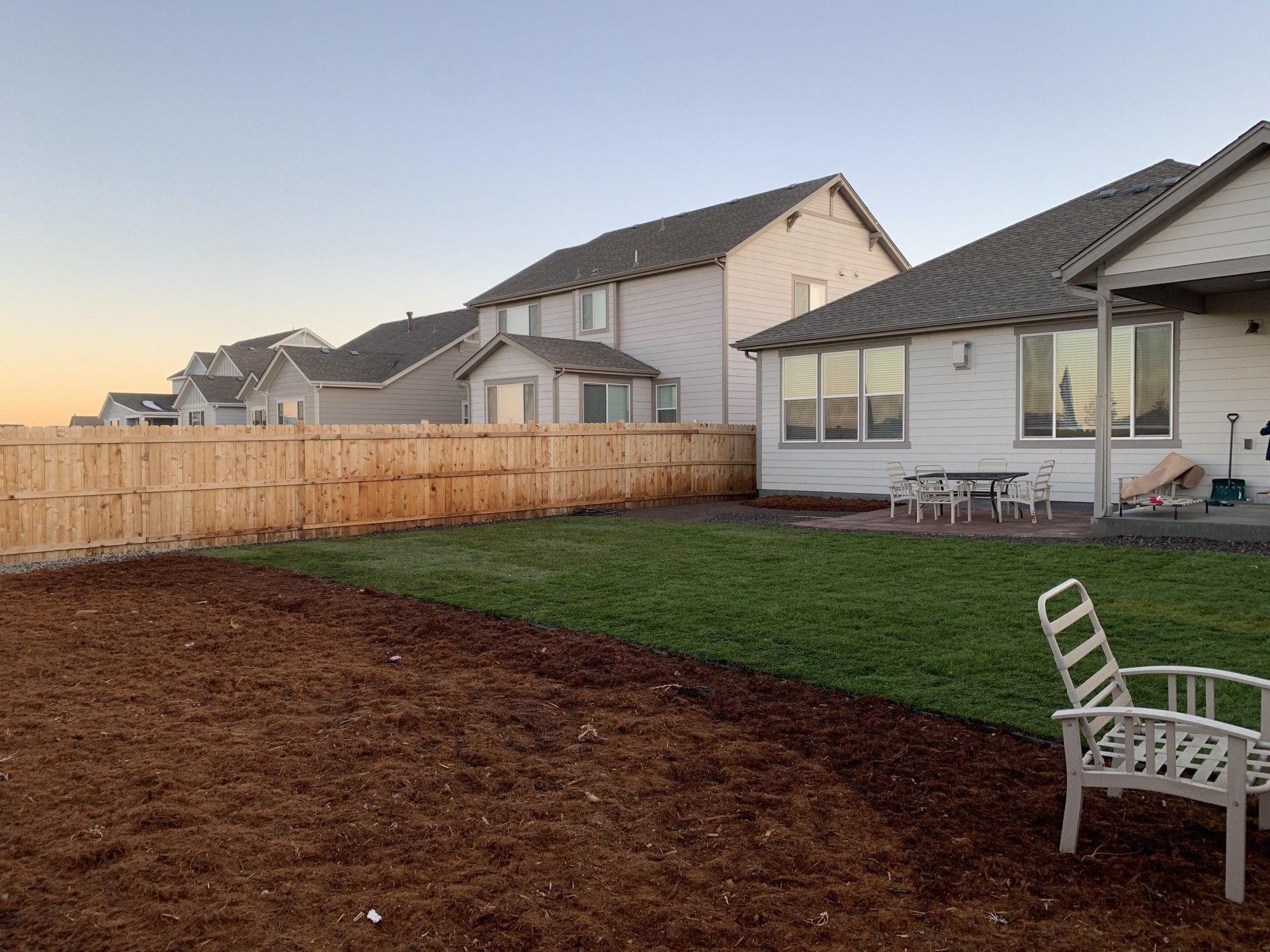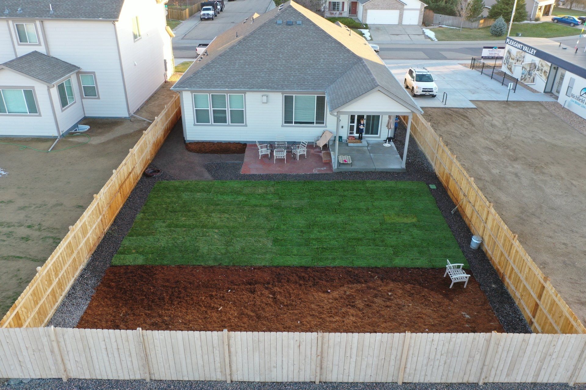Newly built home with Kentucky bluegrass, Colorado red flagstone patio, crushed fines walkway, and gorilla hair mulch.