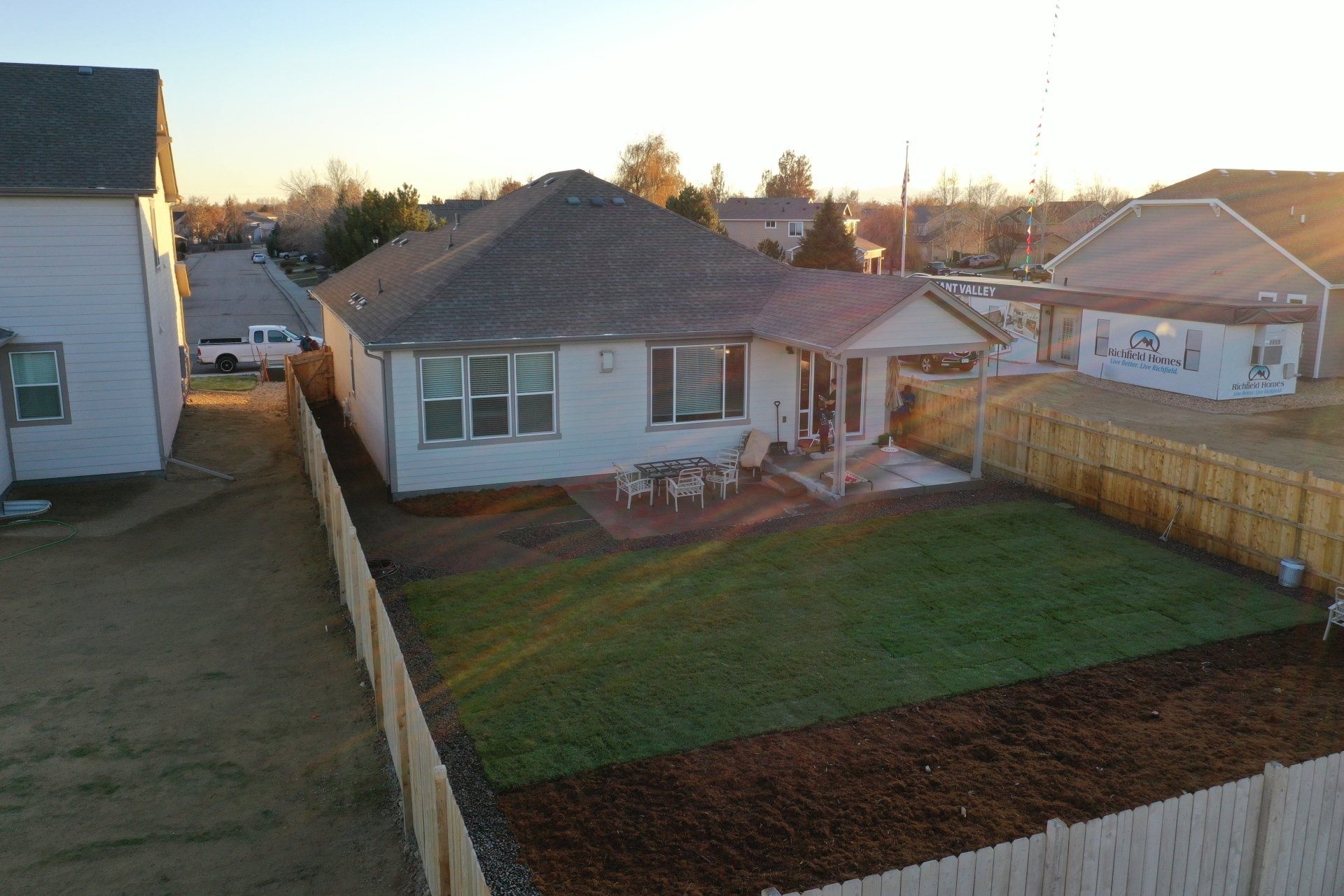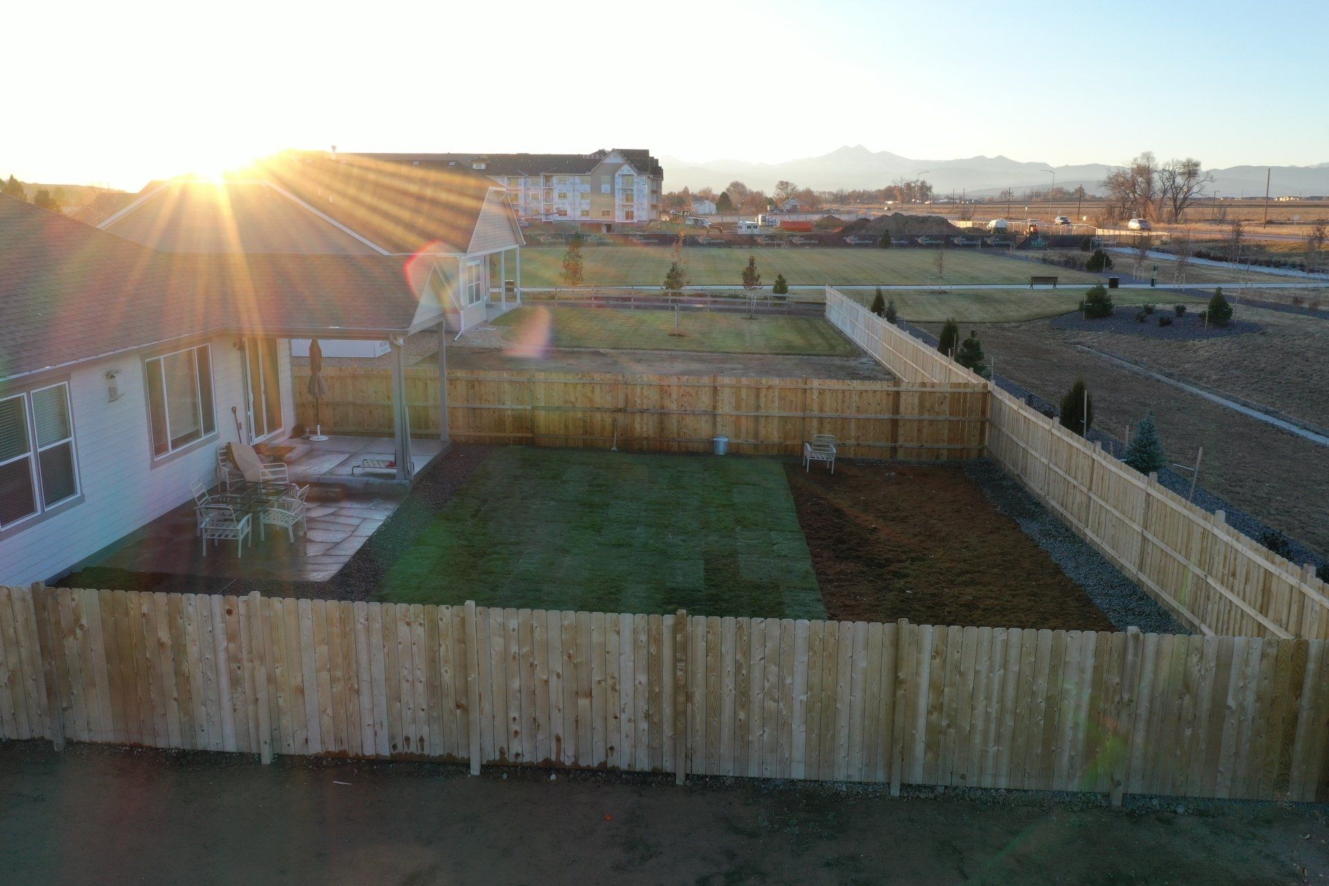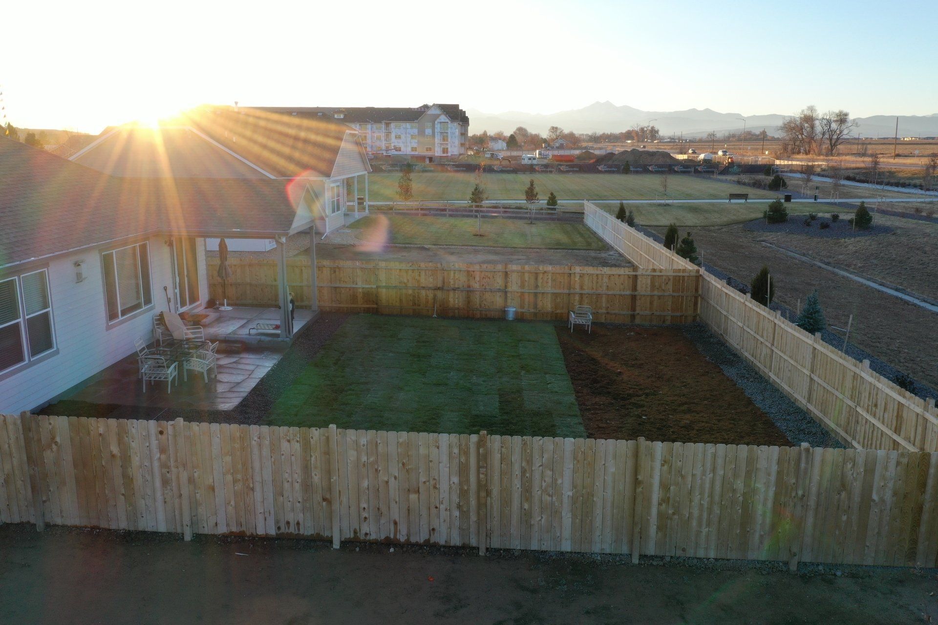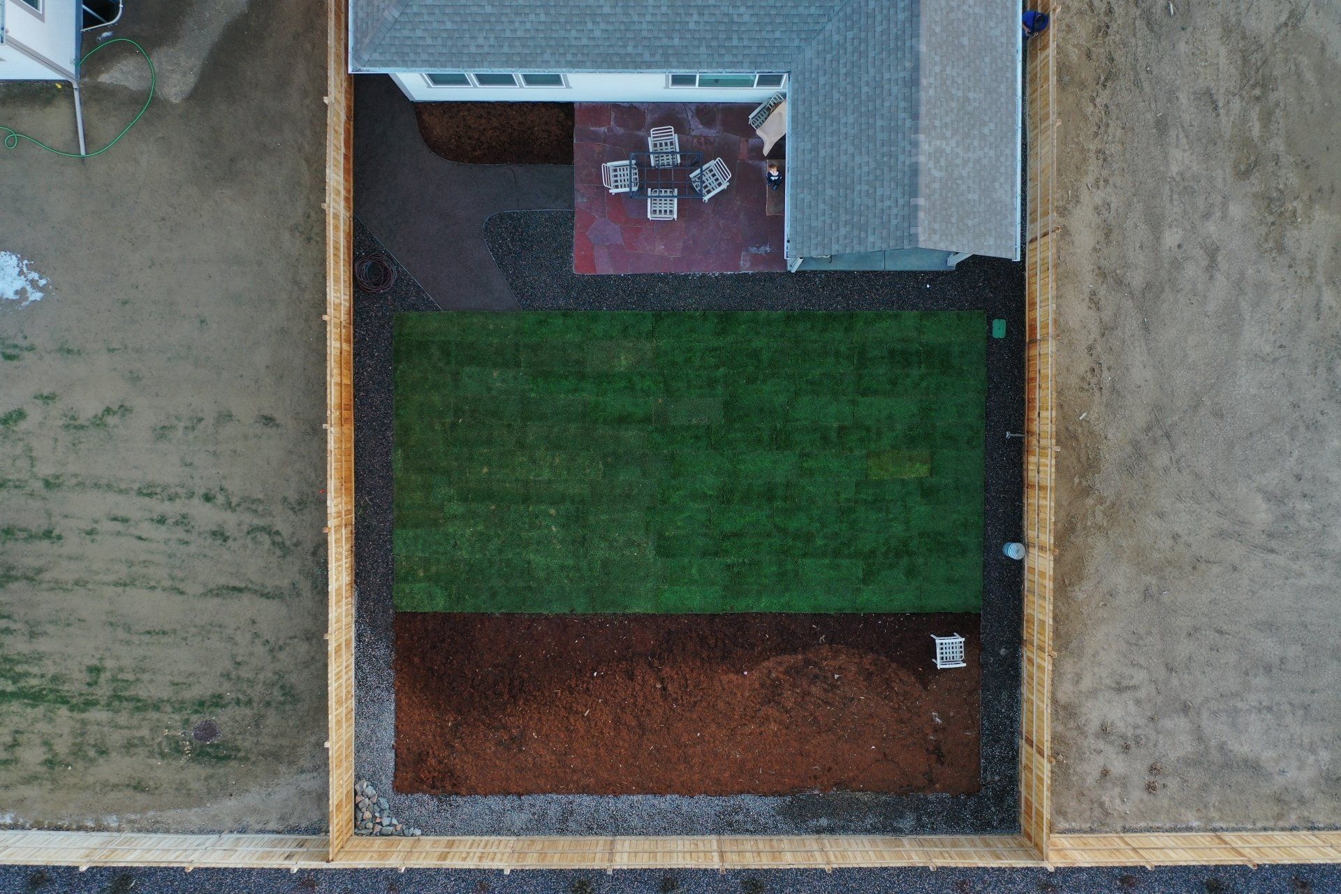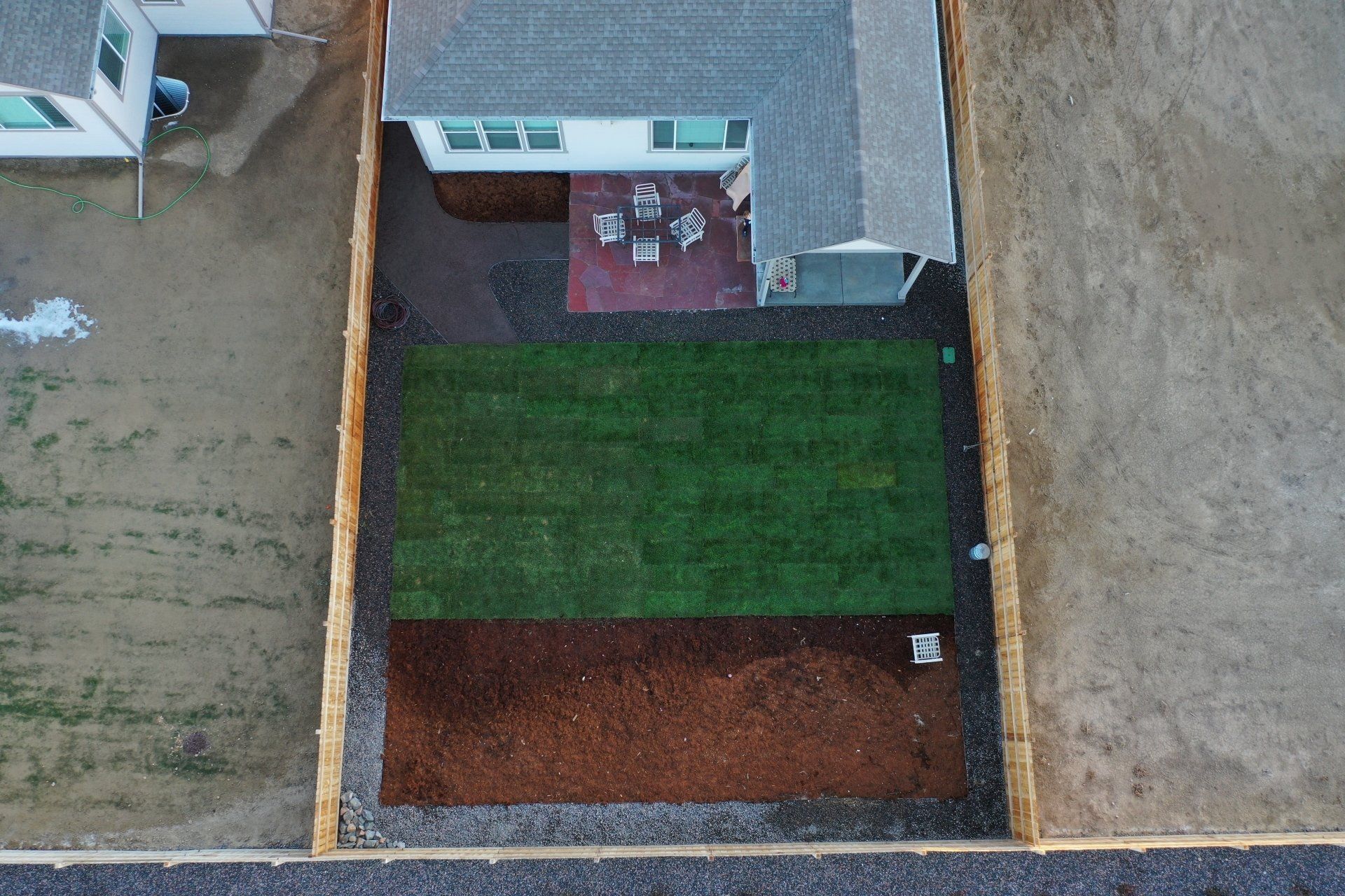 Newly built home with Kentucky bluegrass, Colorado red flagstone patio, crushed fines walkway, and gorilla hair mulch.