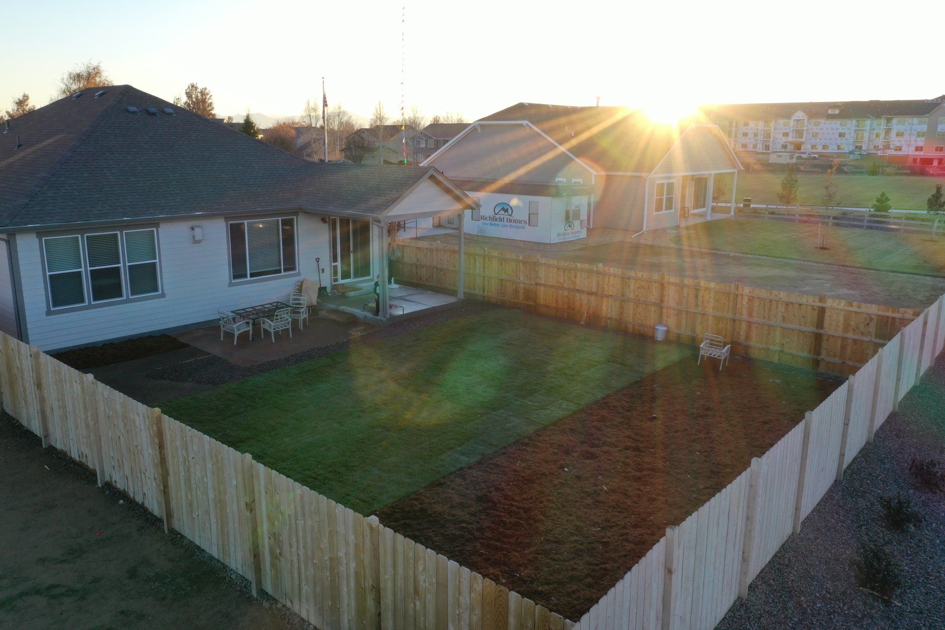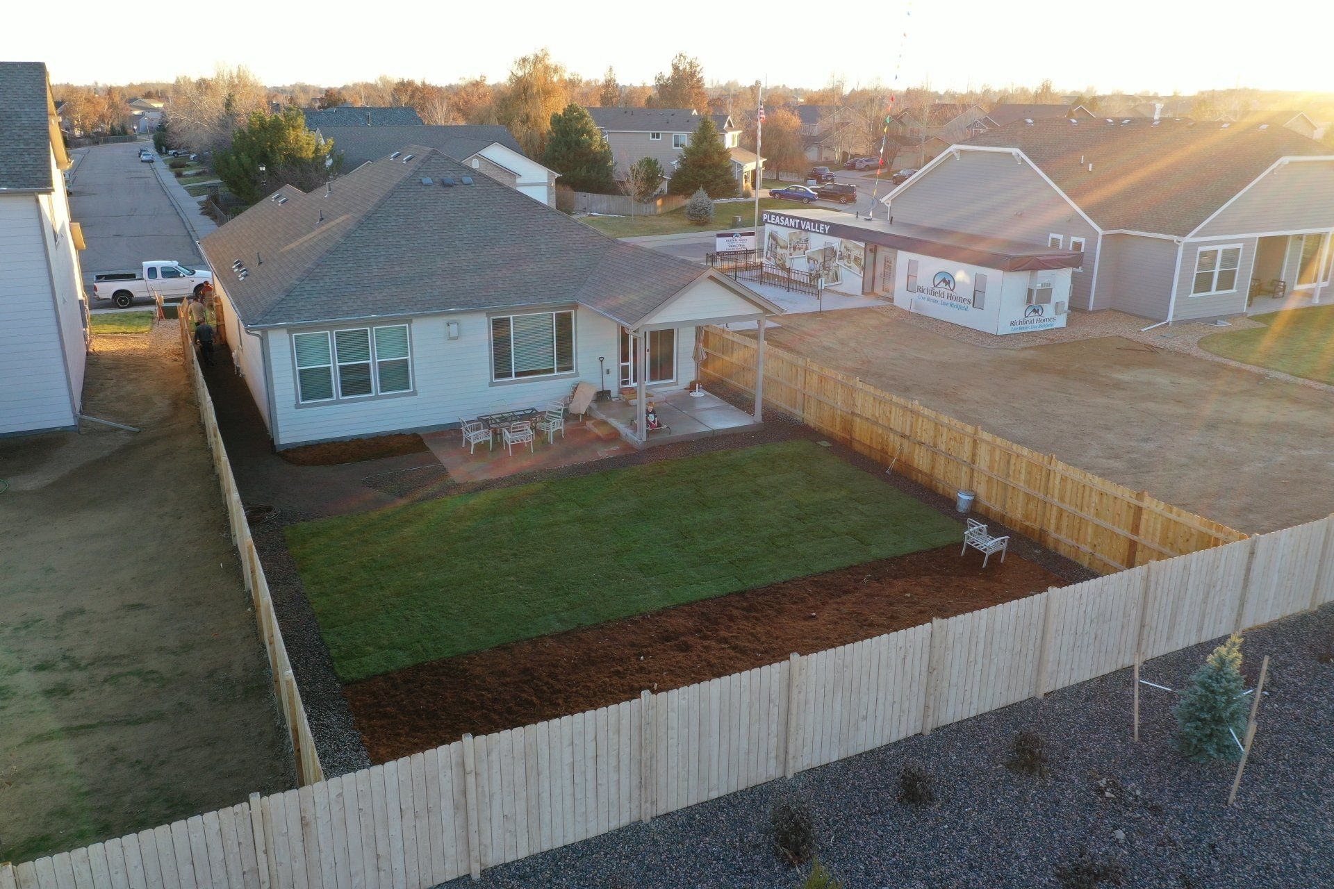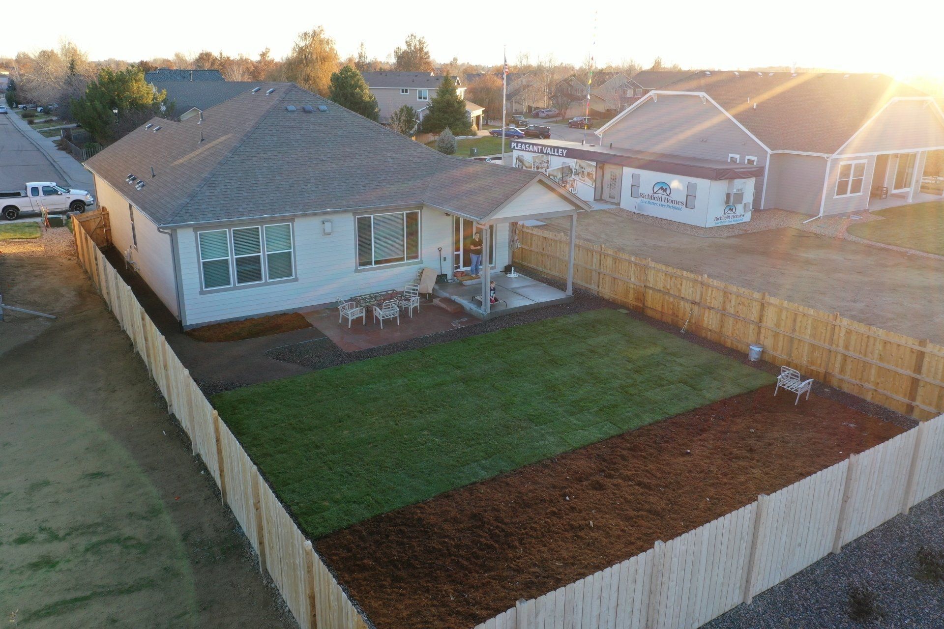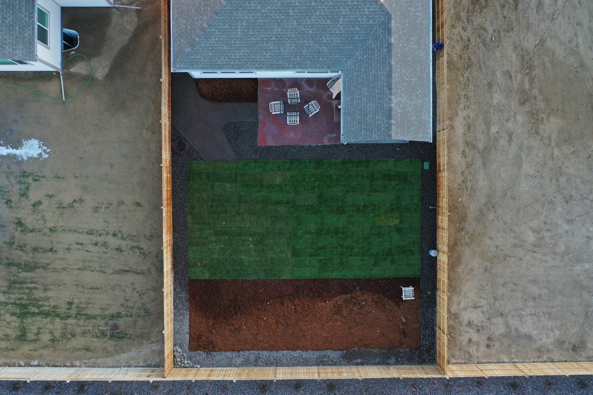 Newly built home with Kentucky bluegrass, Colorado red flagstone patio, crushed fines walkway, and gorilla hair mulch.