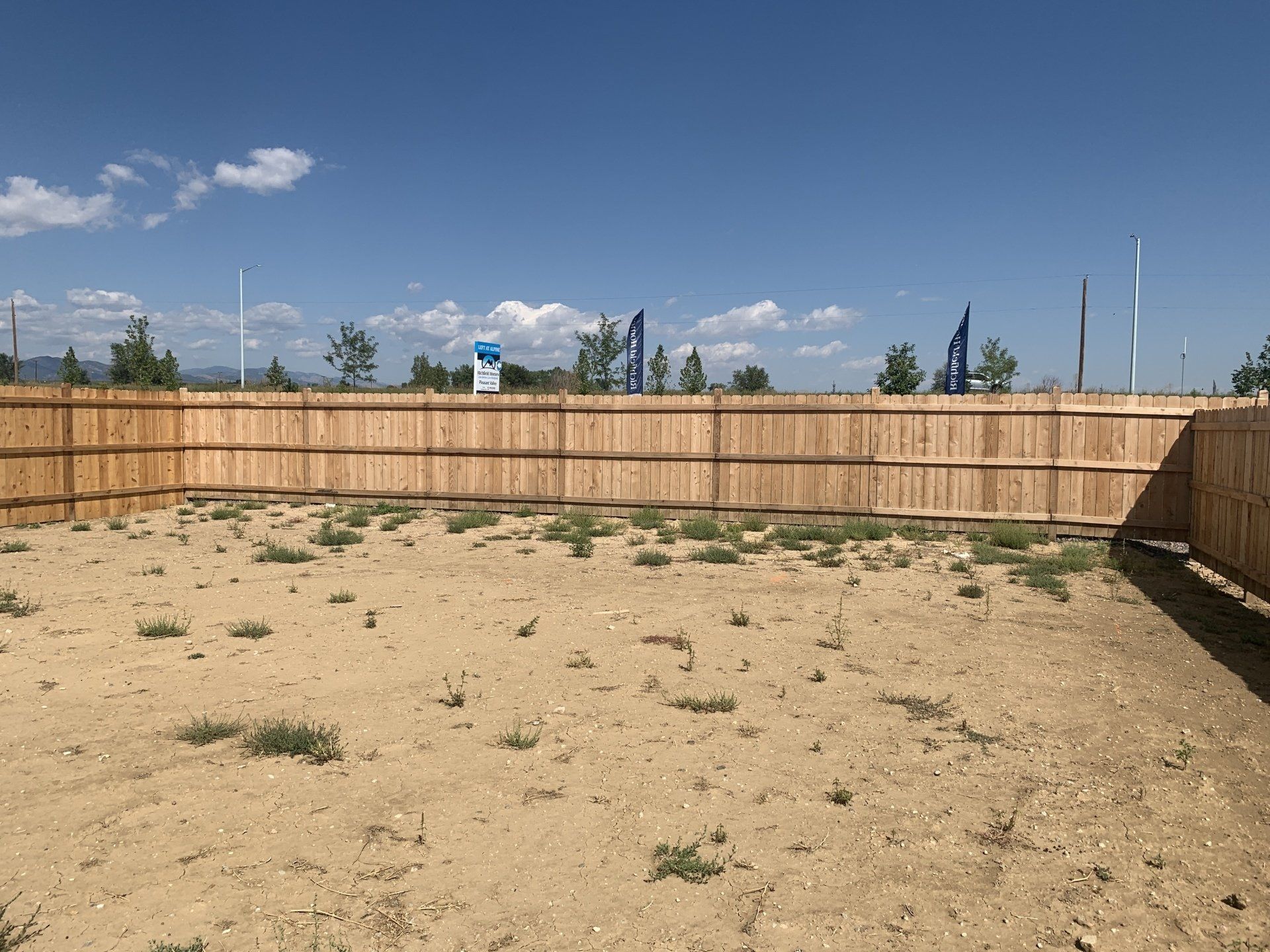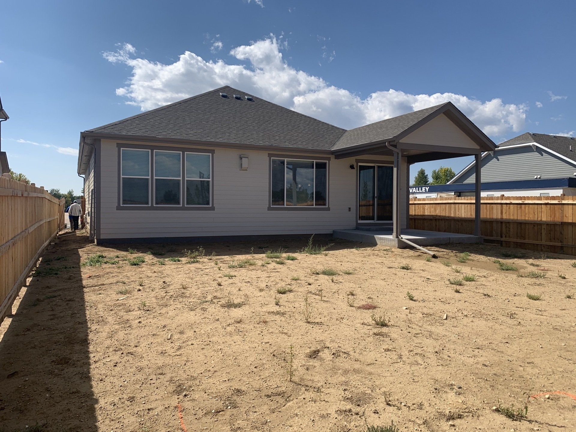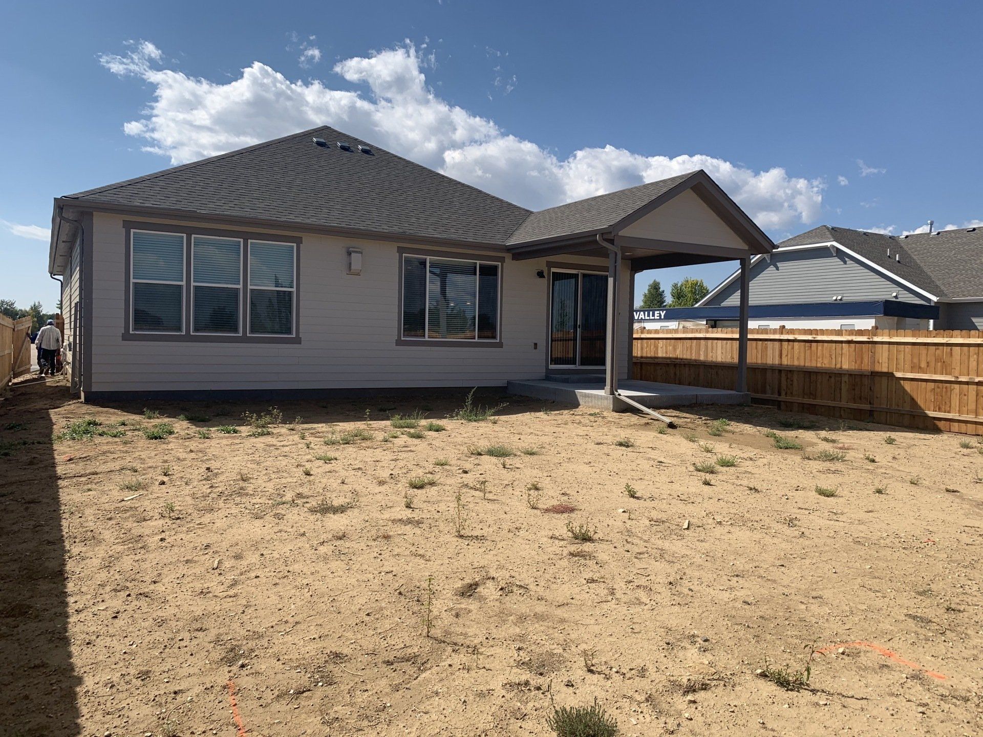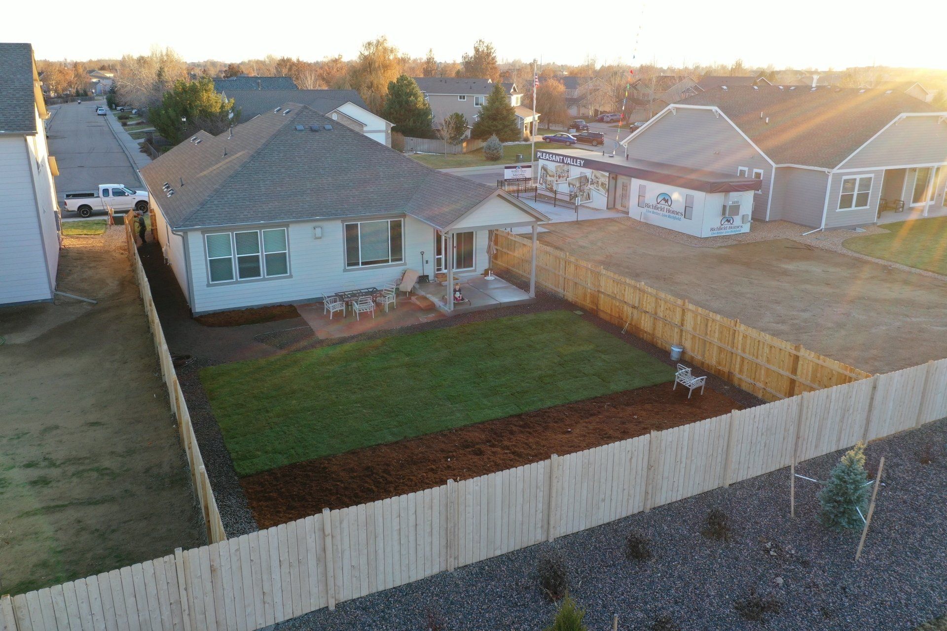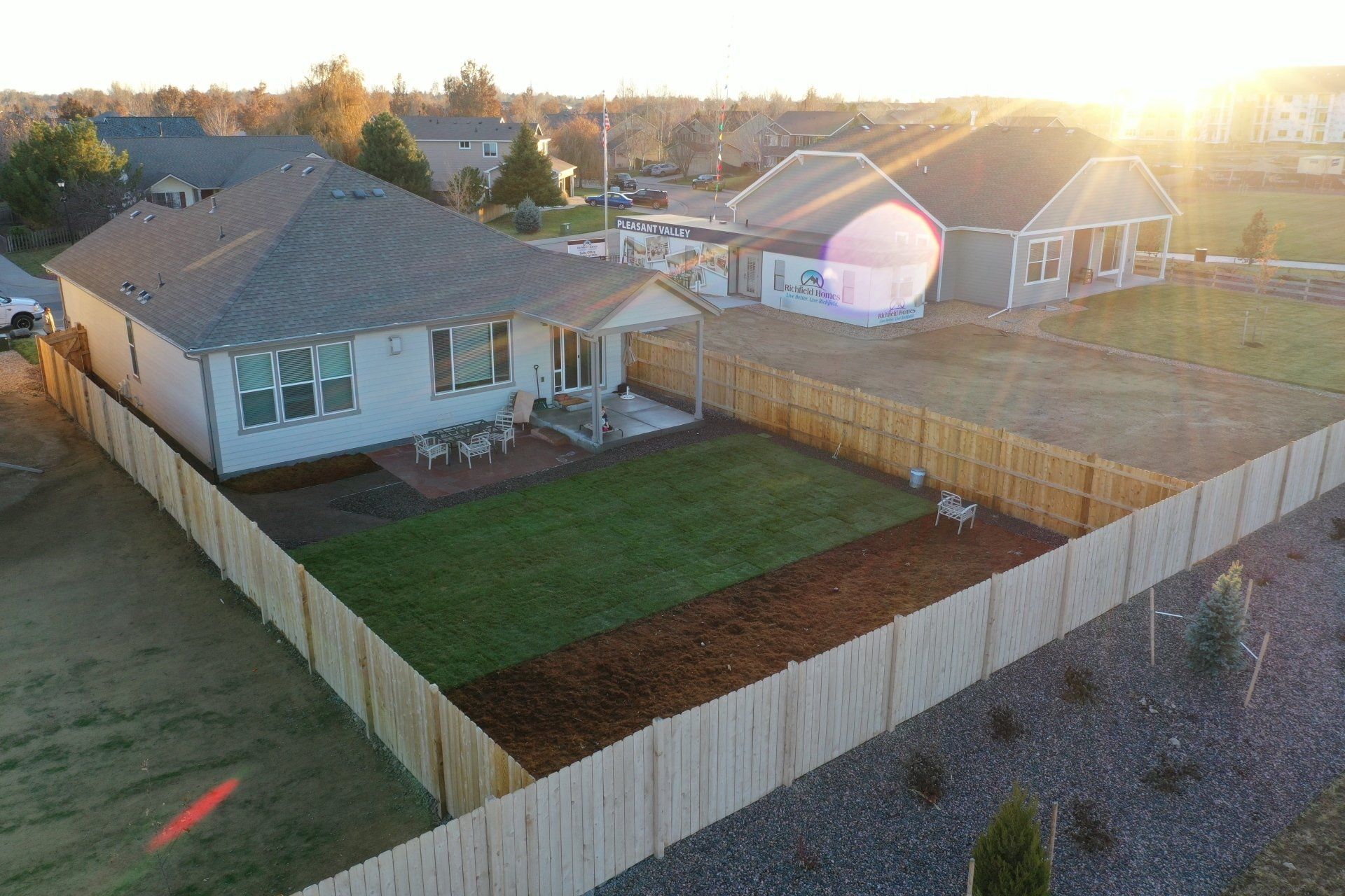 Newly built home with Kentucky bluegrass, Colorado red flagstone patio, crushed fines walkway, and gorilla hair mulch.
