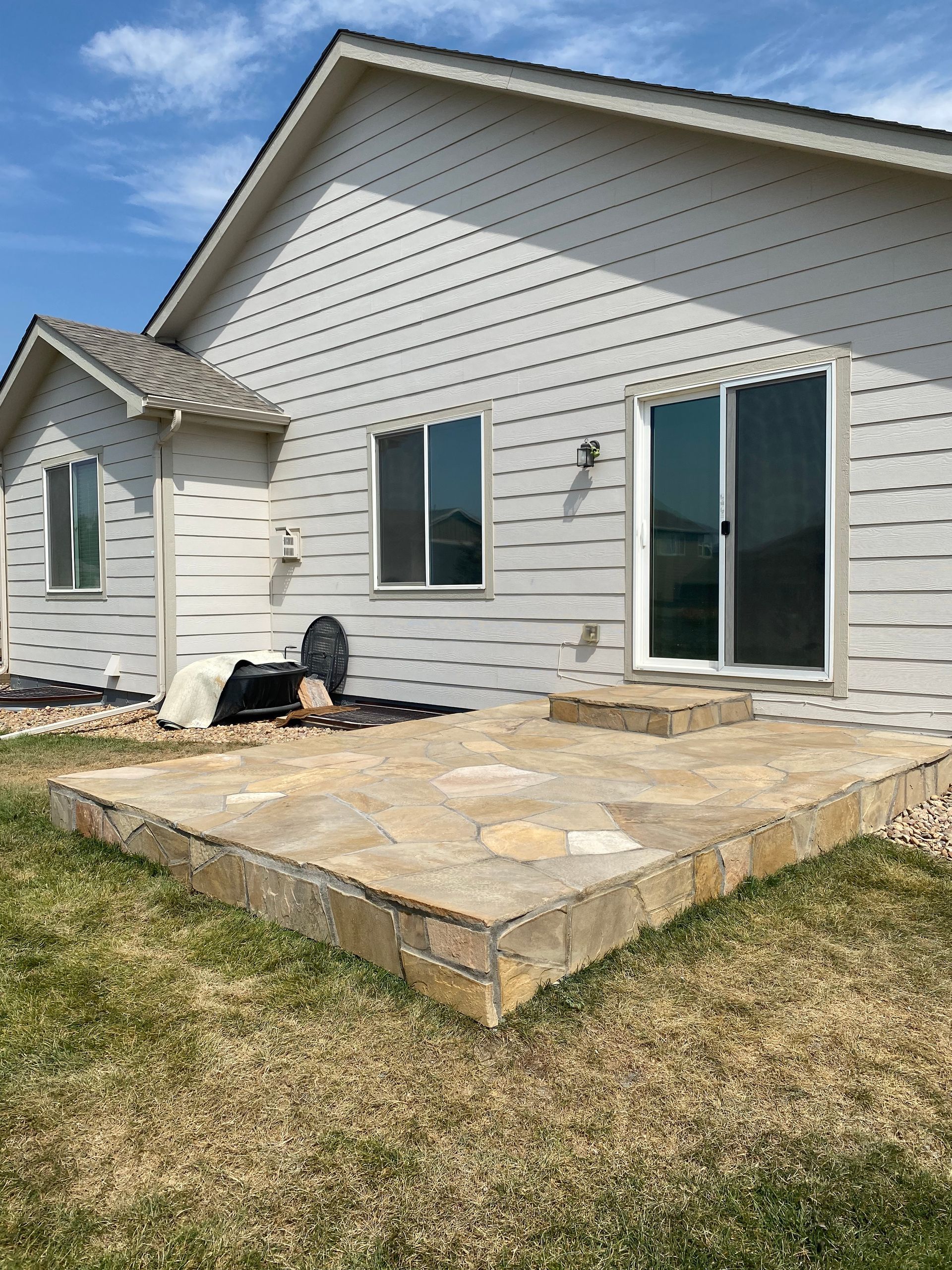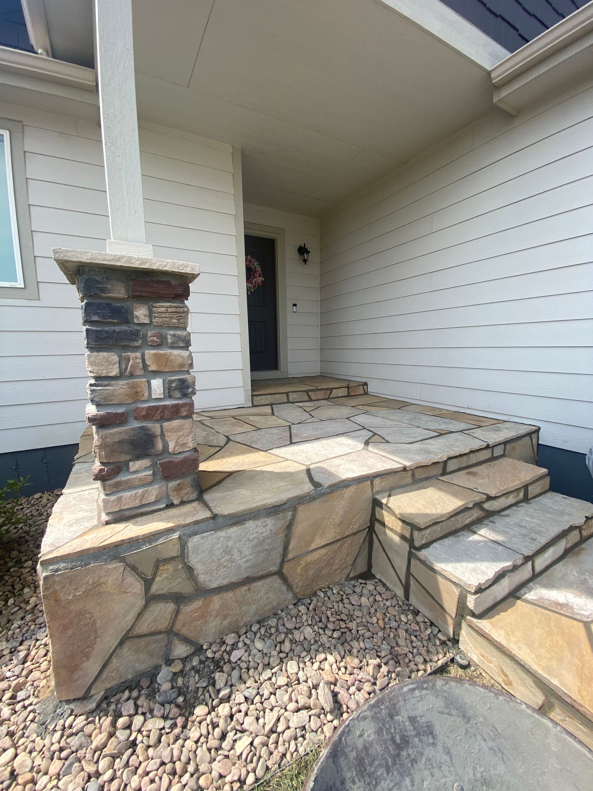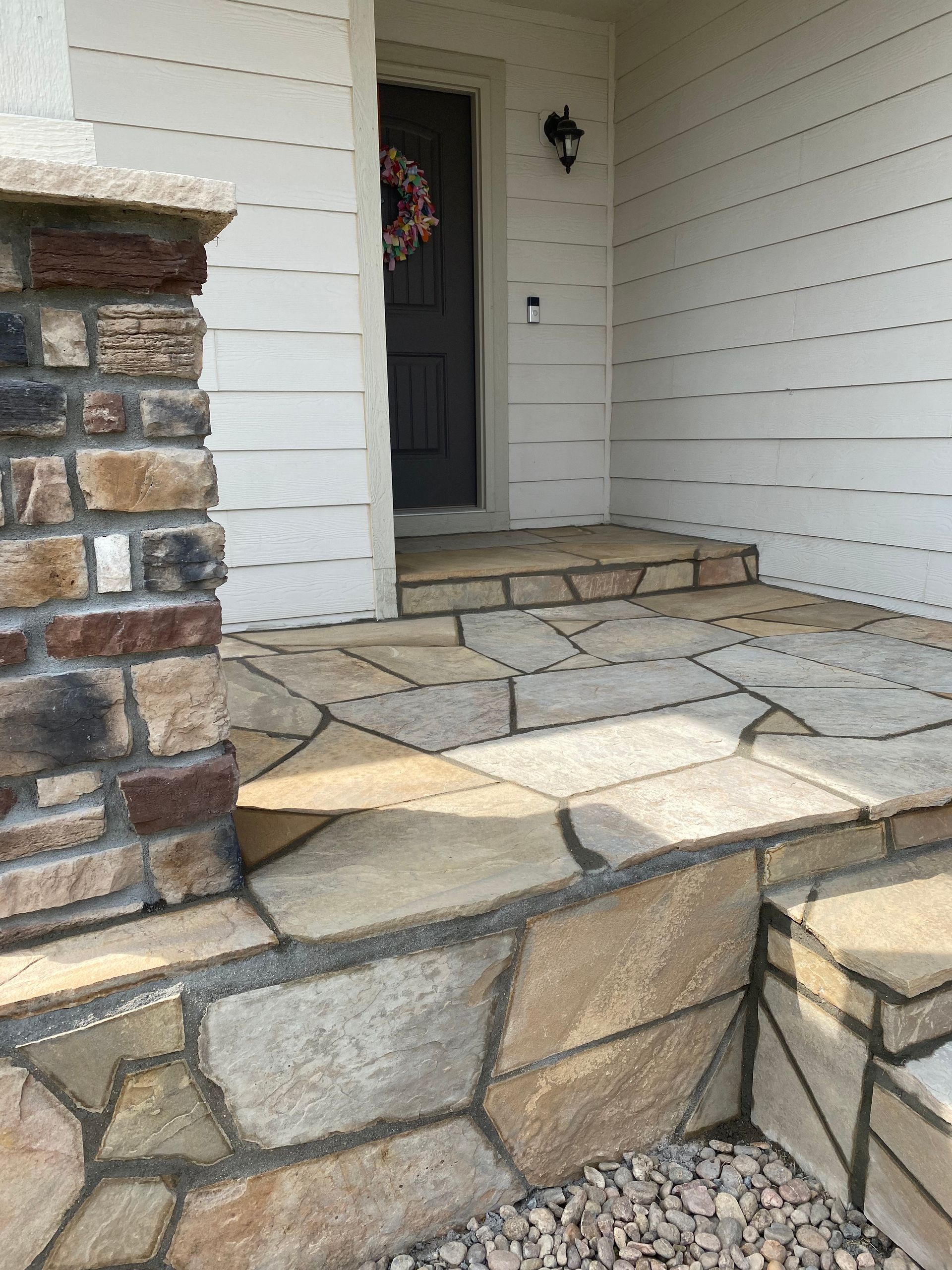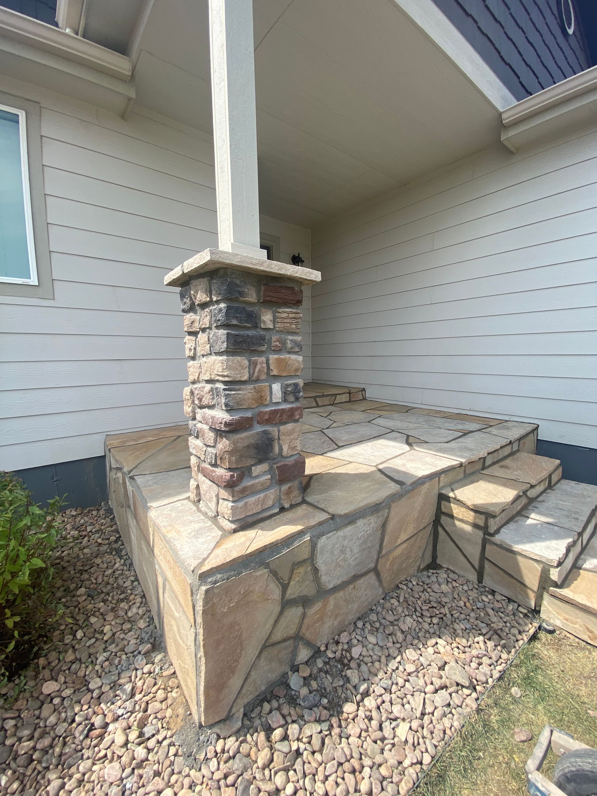 To match house and stonework, we installed Colorado buff flagstone over previously concrete areas. Set in mortar with mortar in joints. Mead, CO 2021