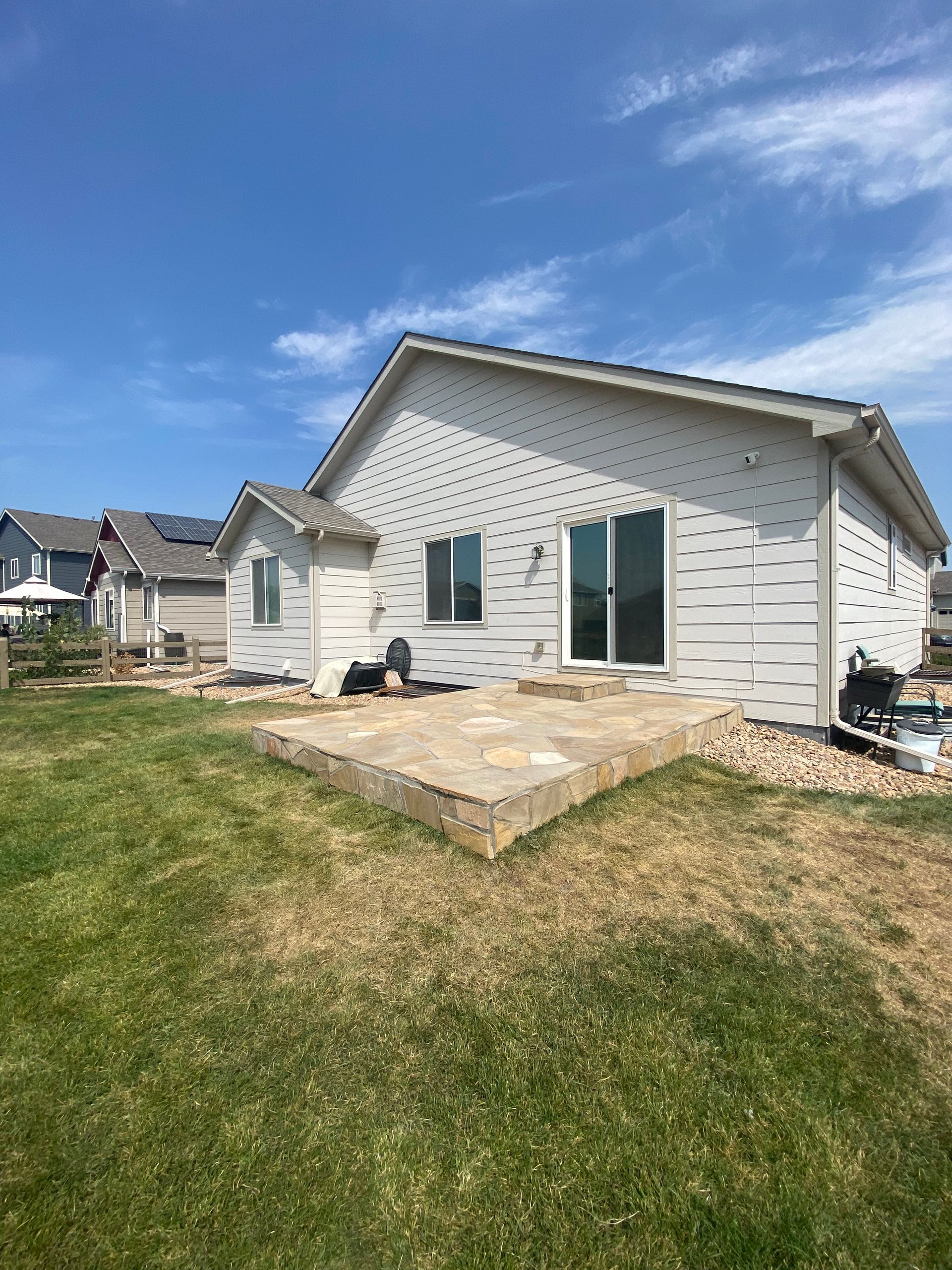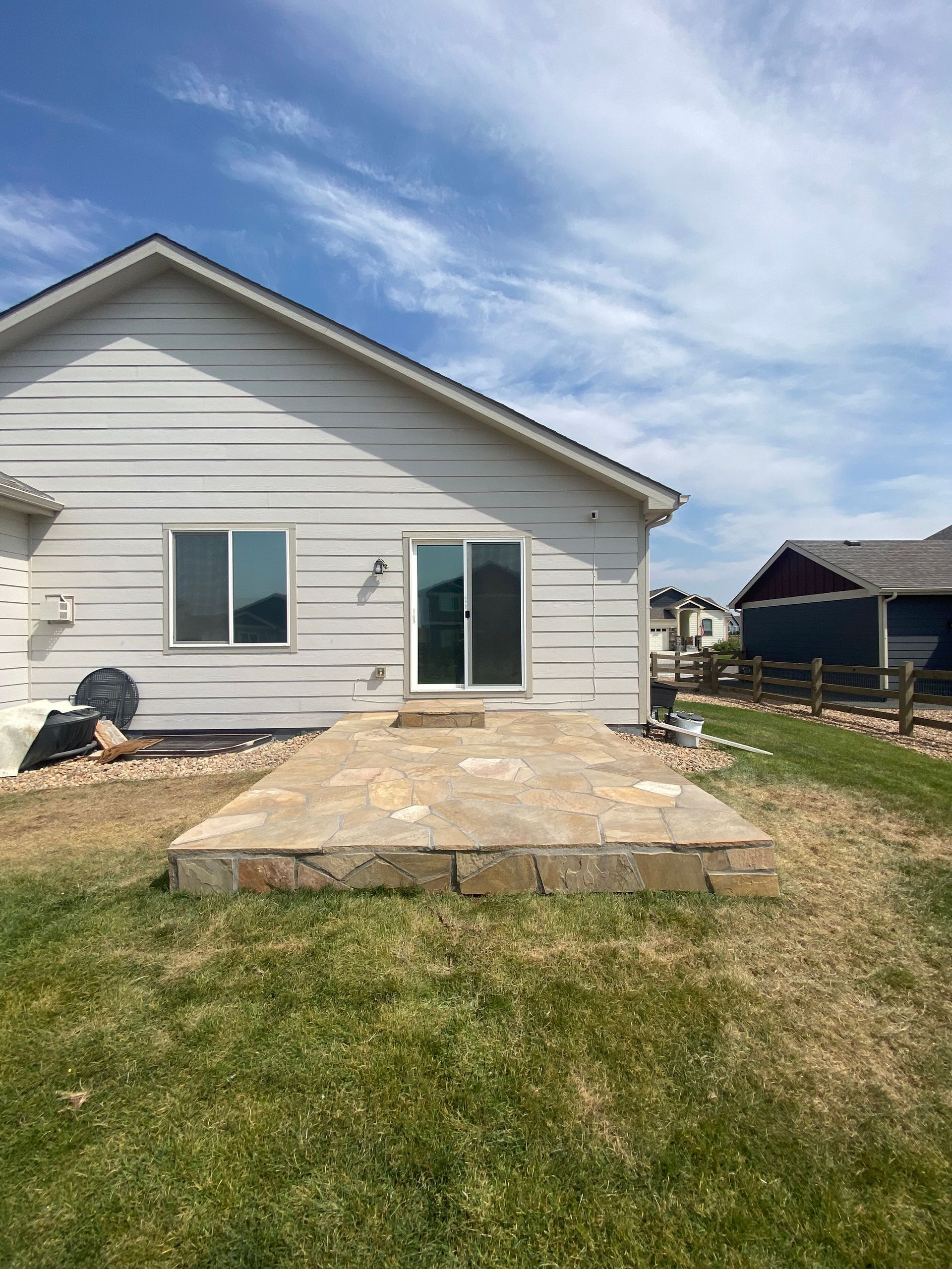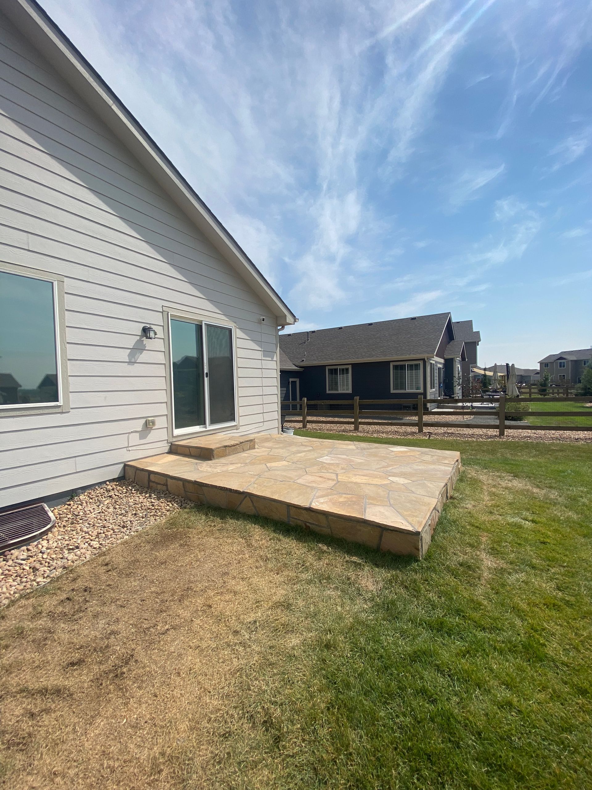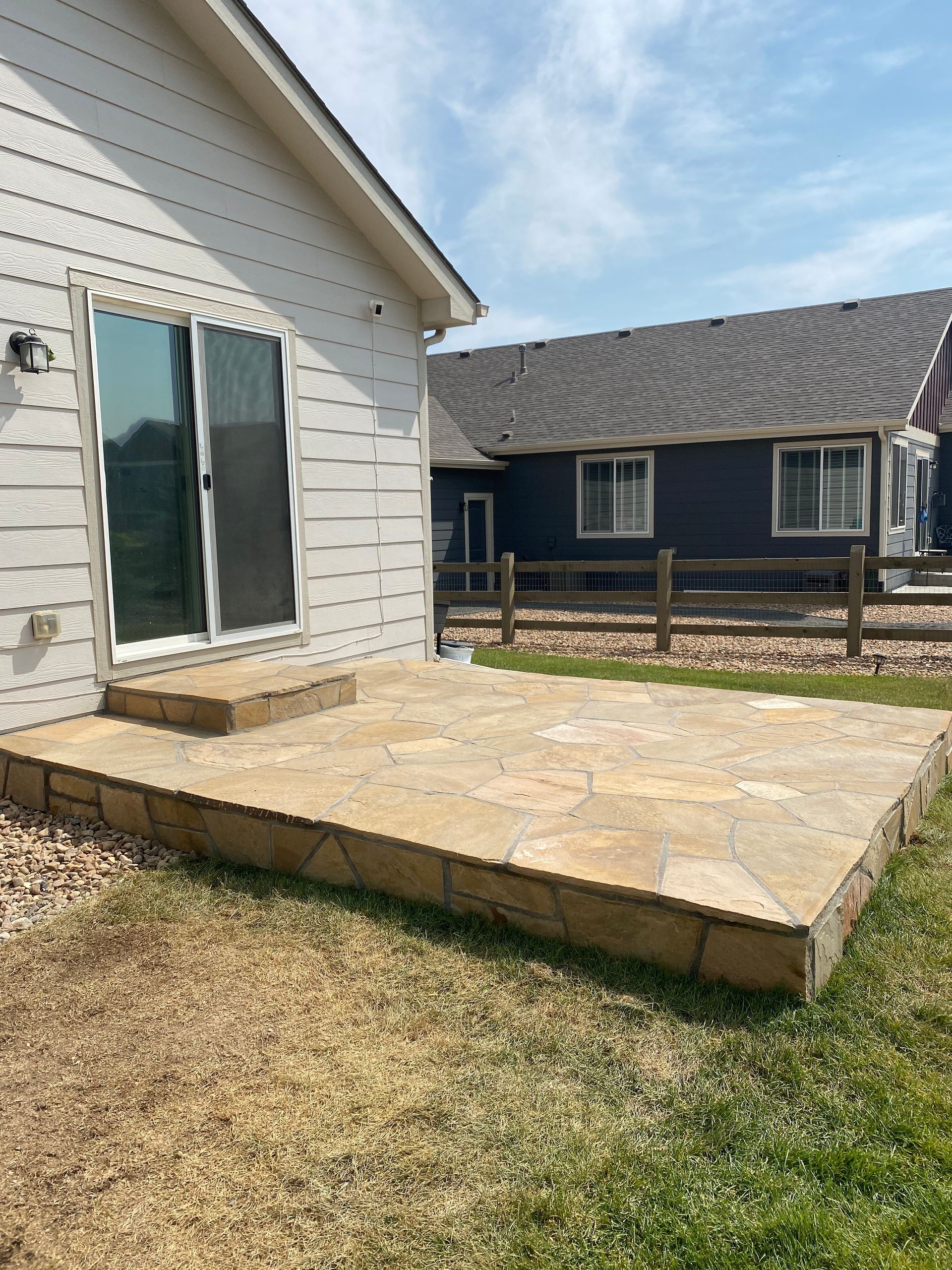 To match house and stonework, we installed Colorado buff flagstone over previously concrete areas. Set in mortar with mortar in joints. Mead, CO 2021