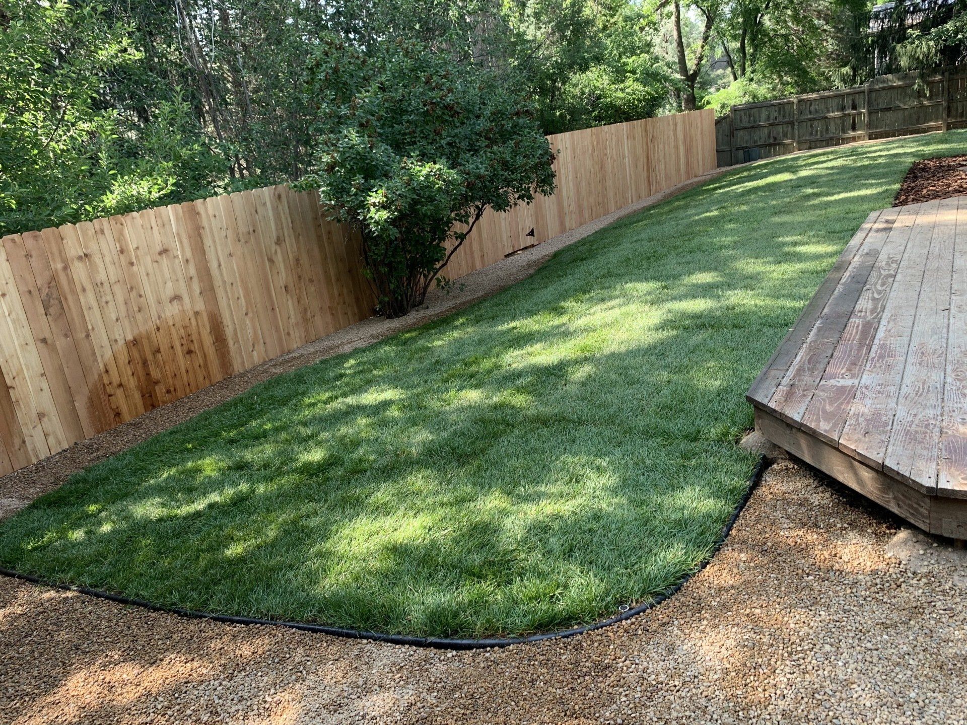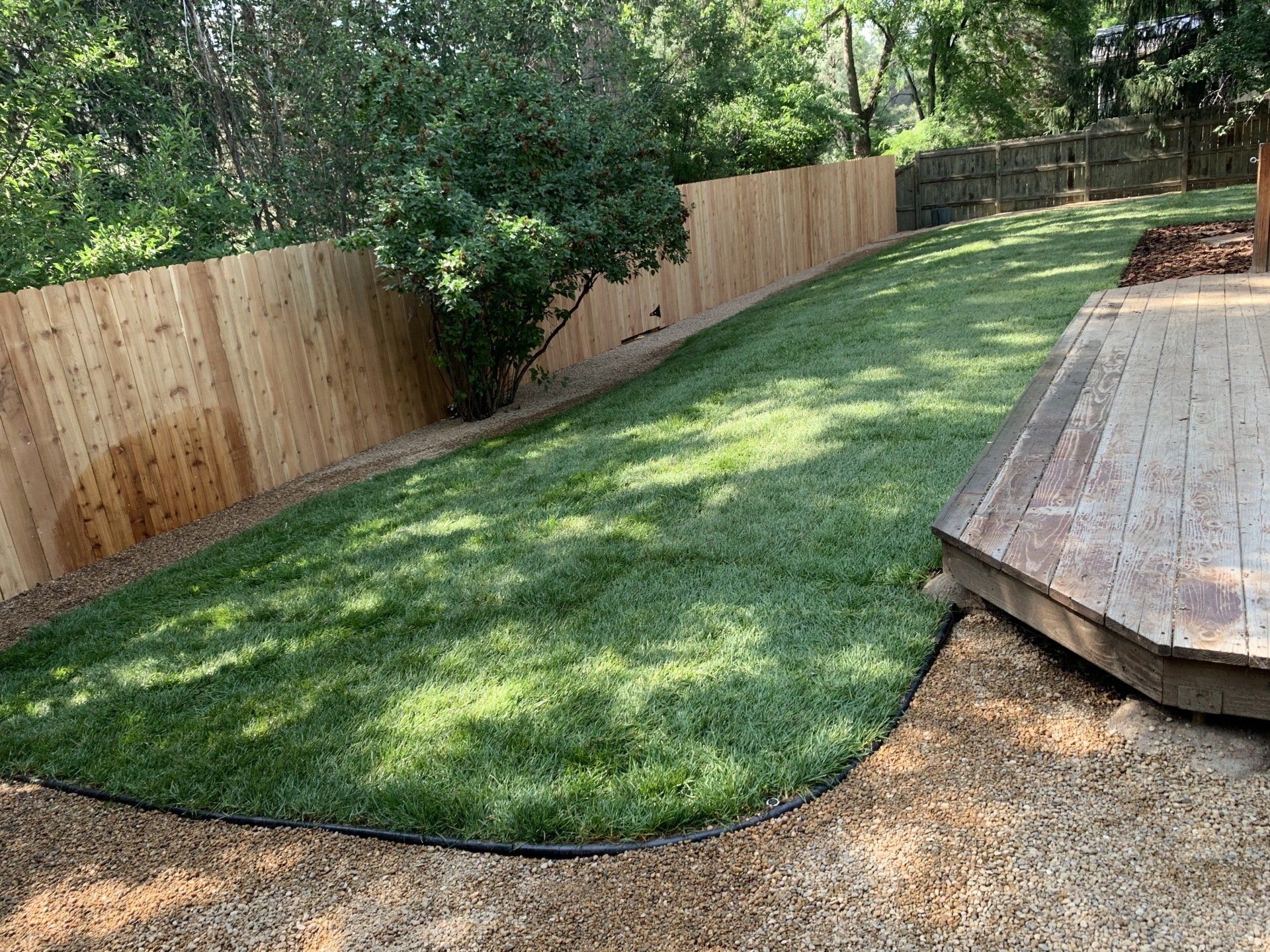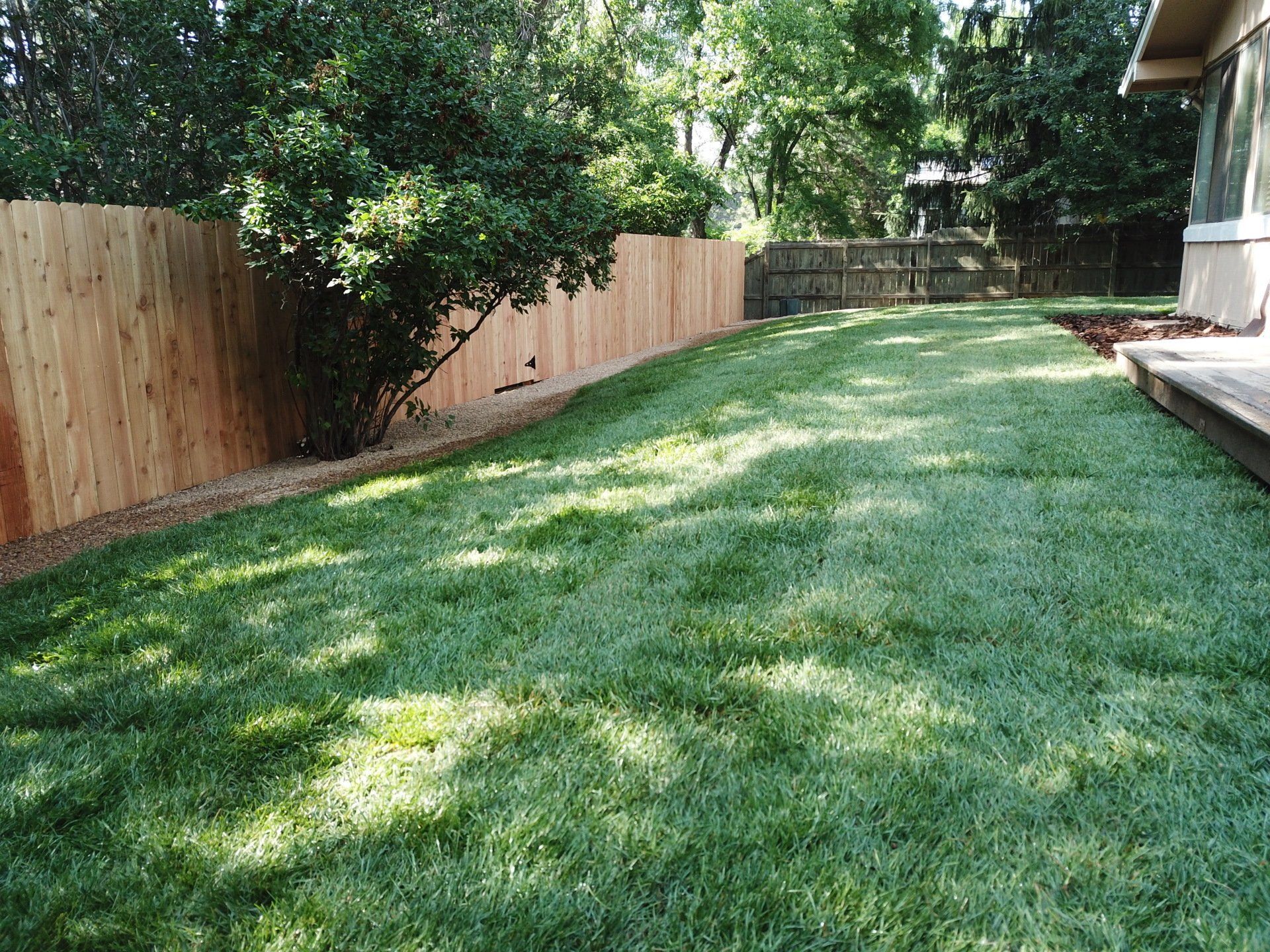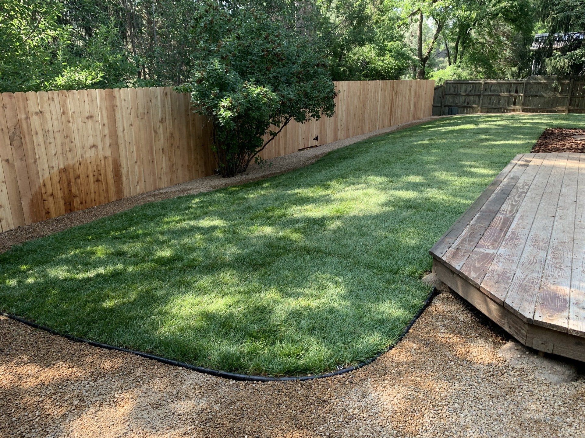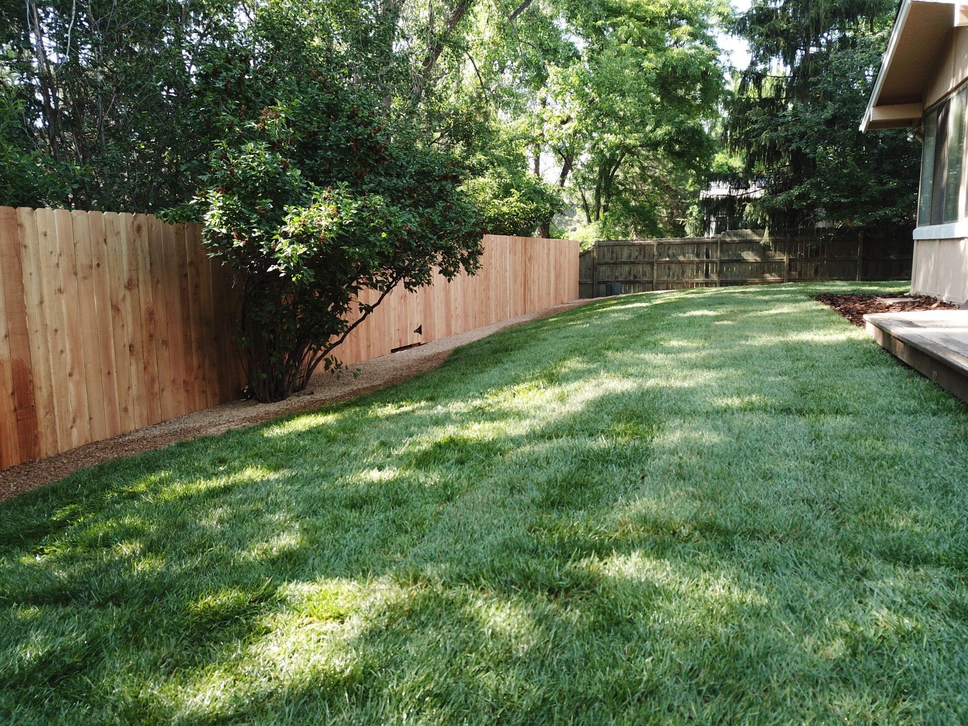 Backyard requiring upgrades due to pets and neglect. Quality cedar fence built with pea gravel, Kentucky bluegrass, and