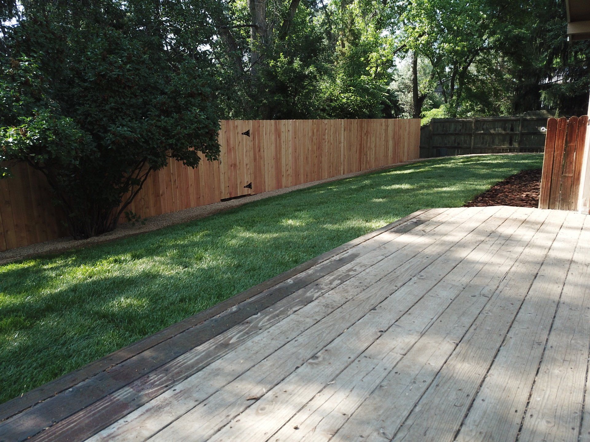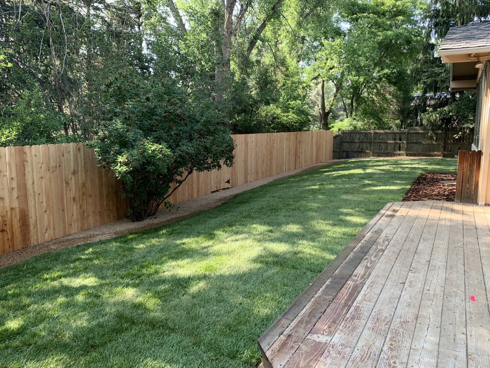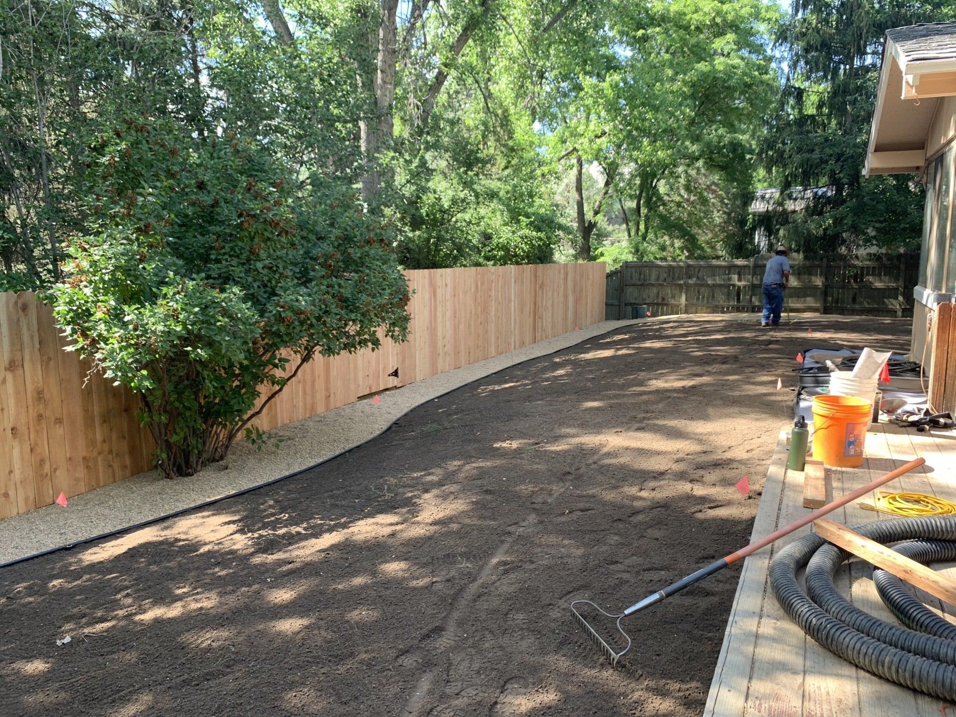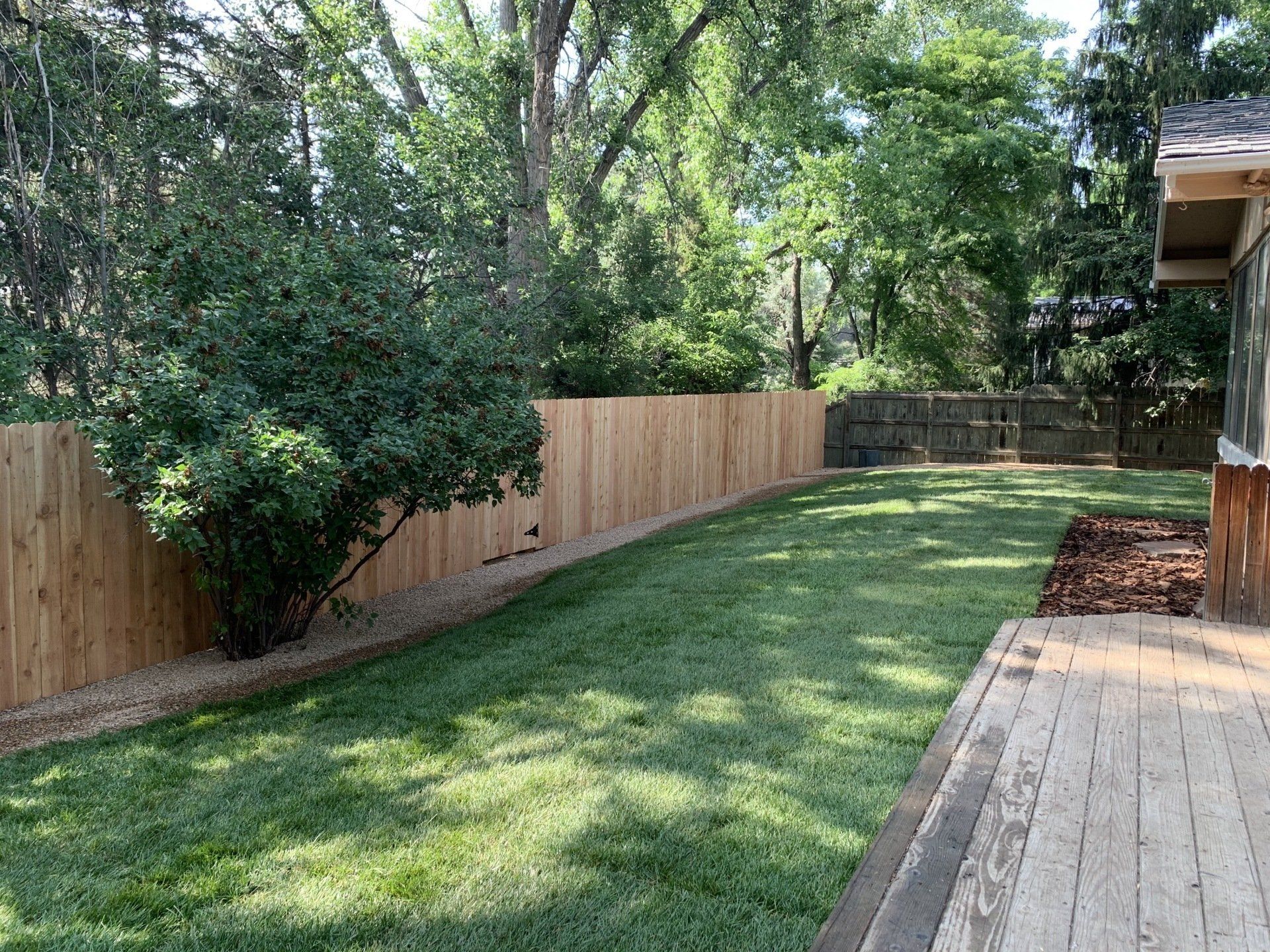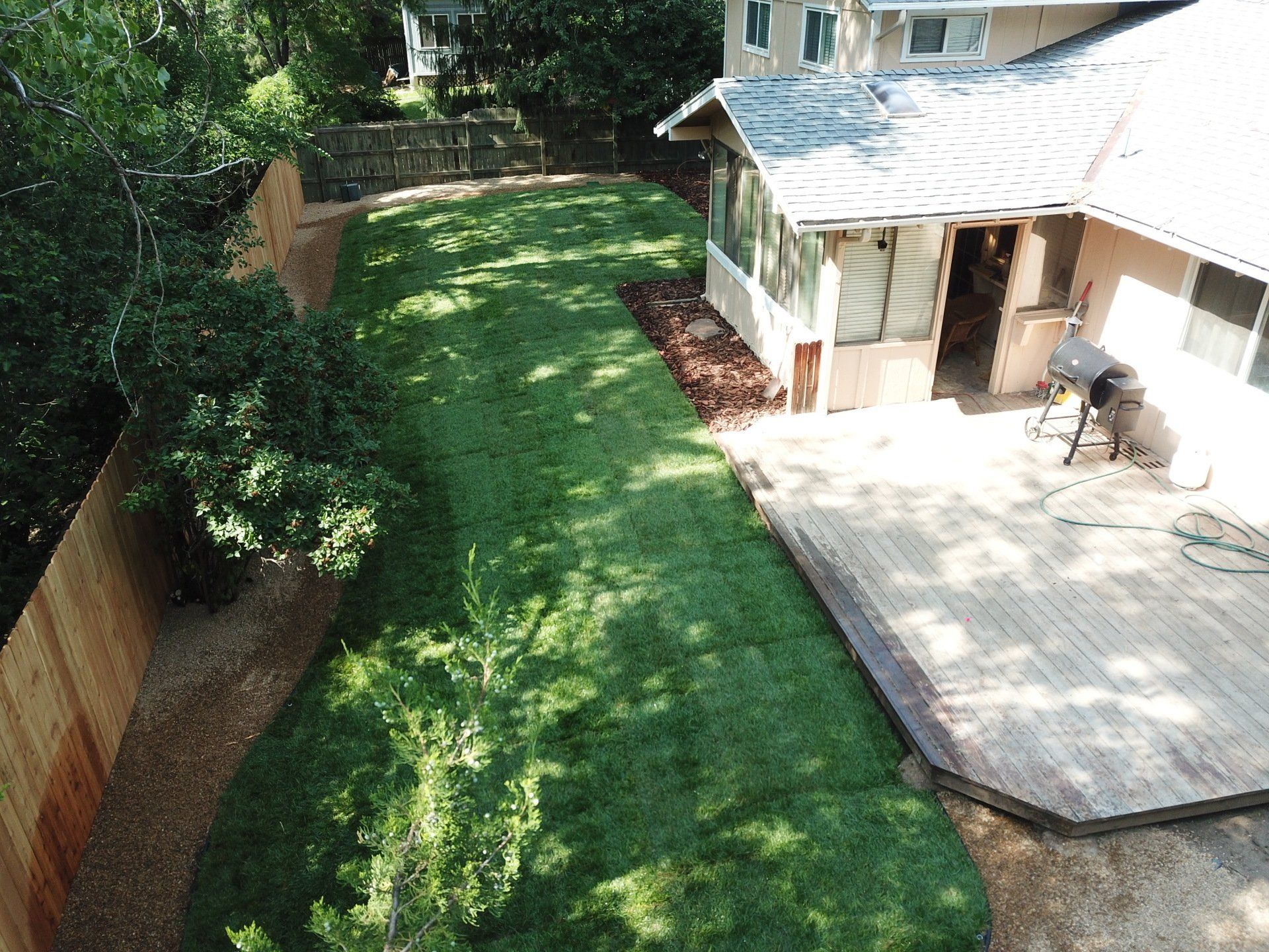 Backyard requiring upgrades due to pets and neglect. Quality cedar fence built with pea gravel, Kentucky bluegrass, and