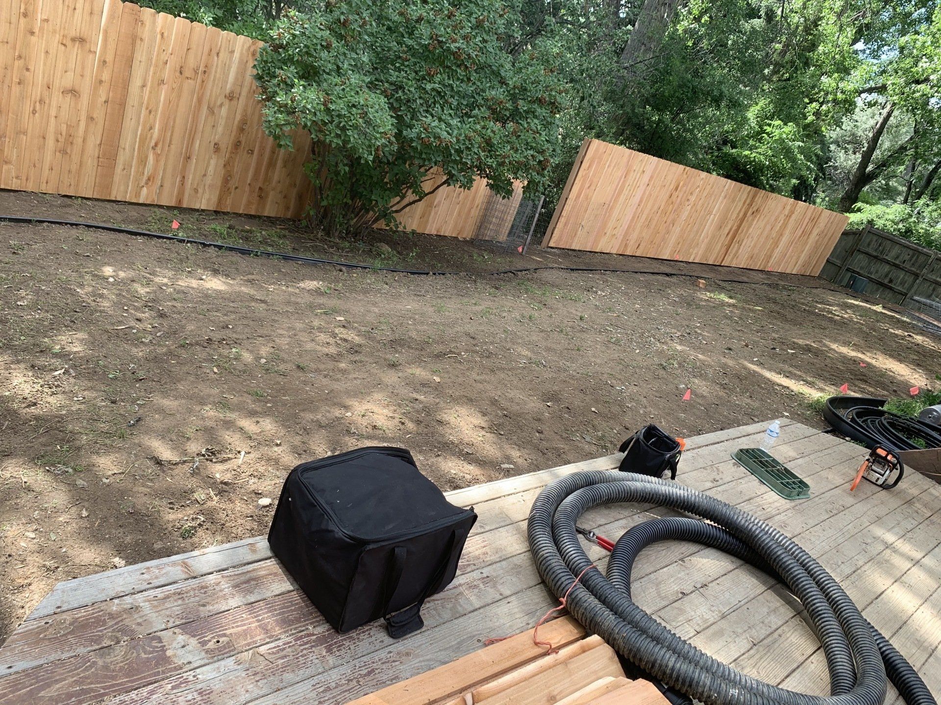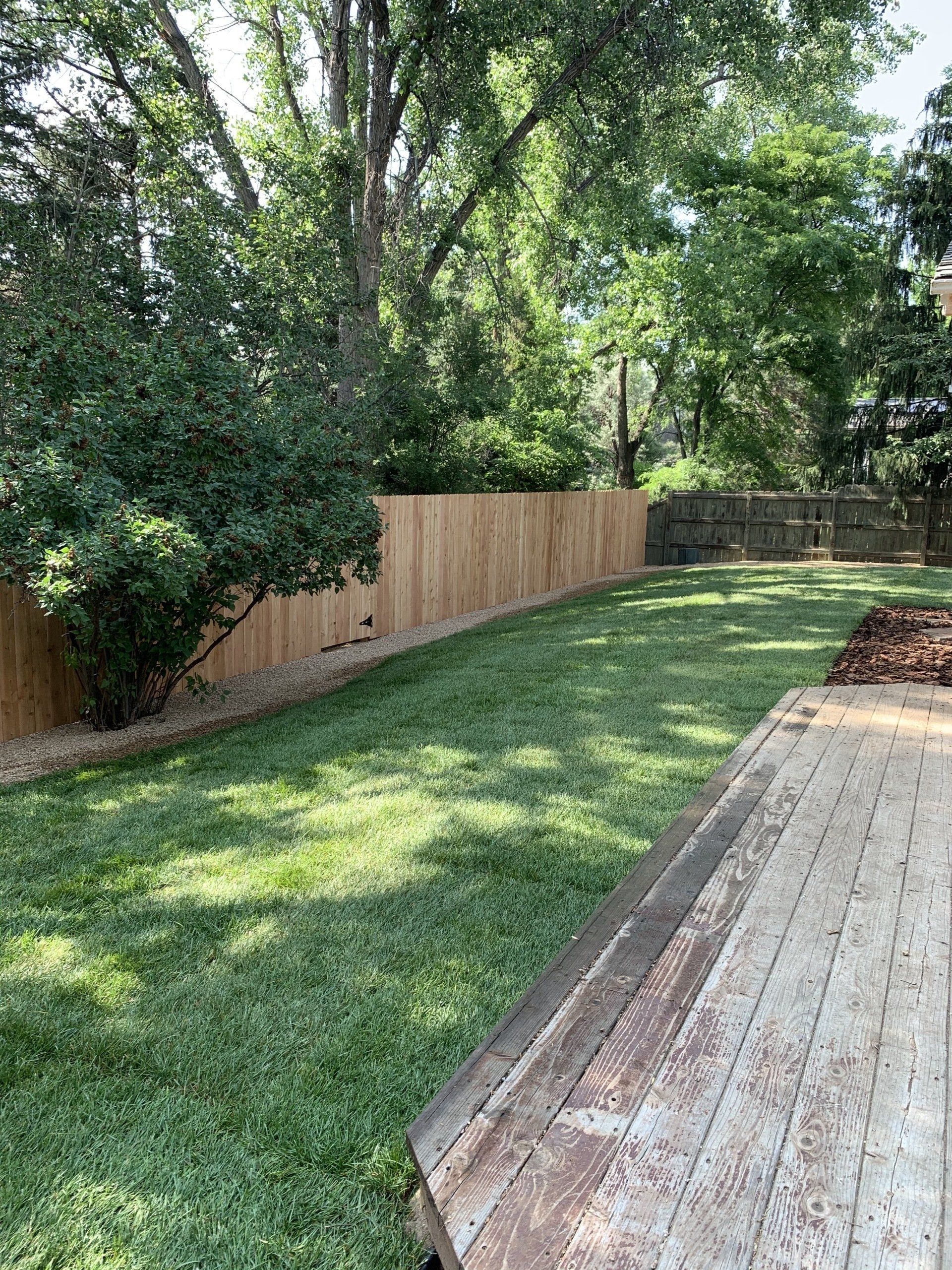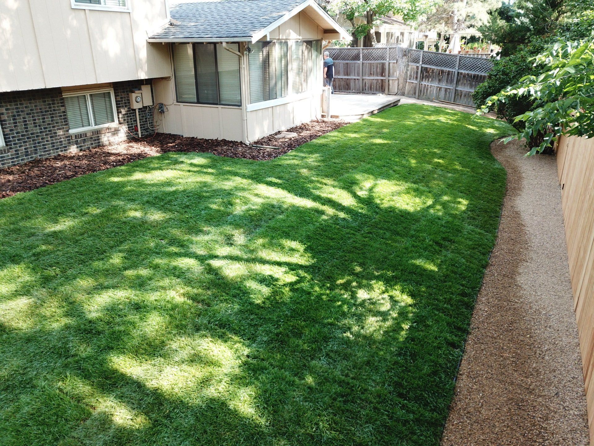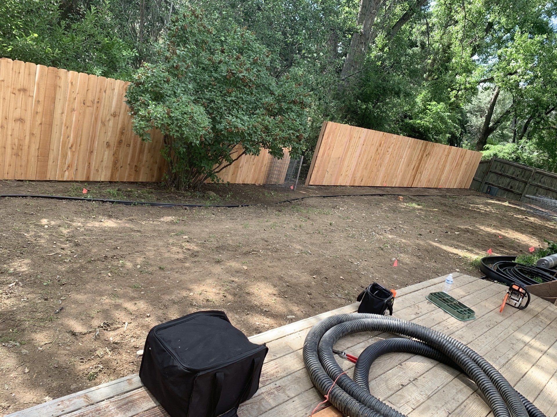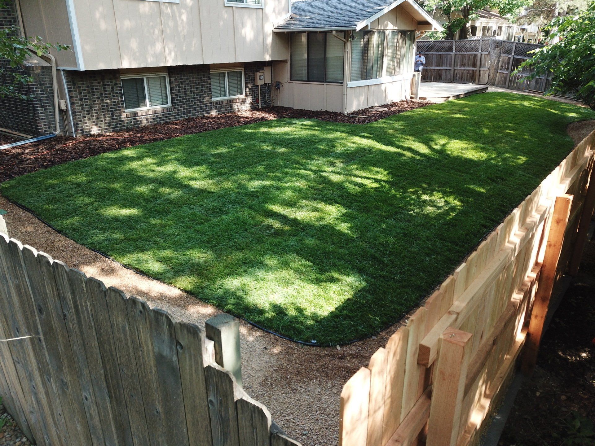 Backyard requiring upgrades due to pets and neglect. Quality cedar fence built with pea gravel, Kentucky bluegrass, and