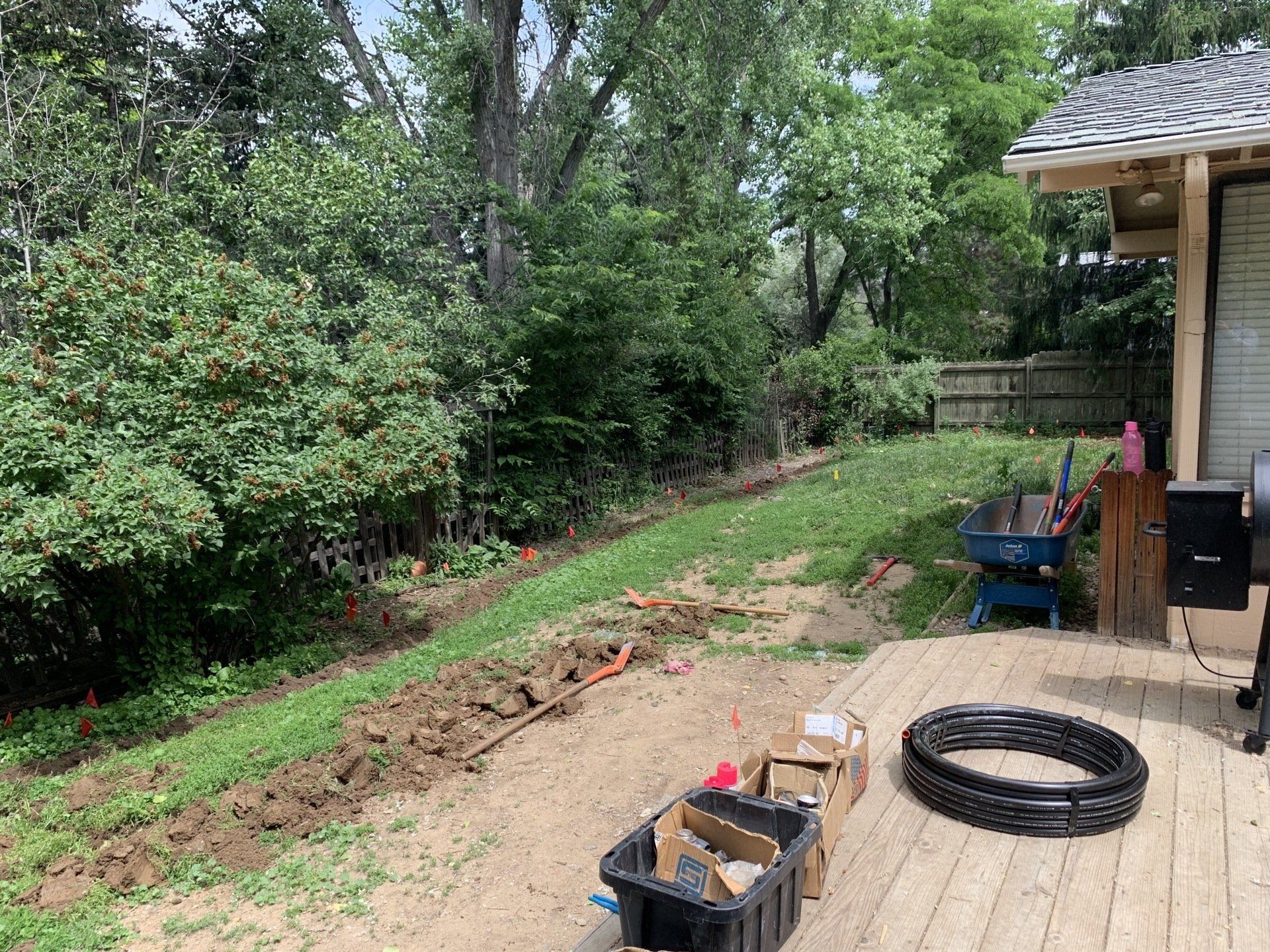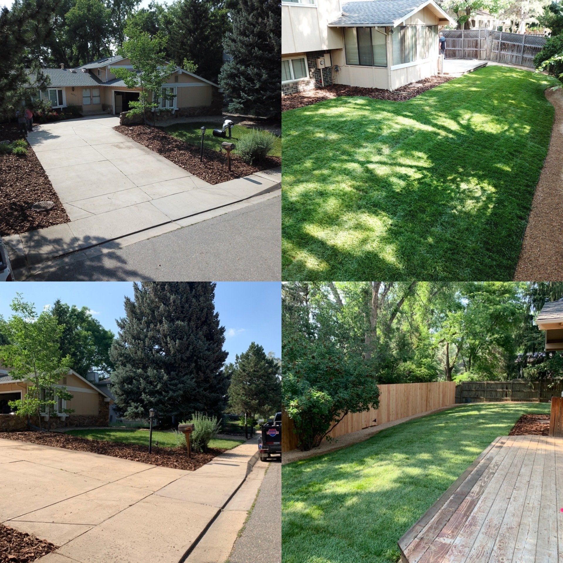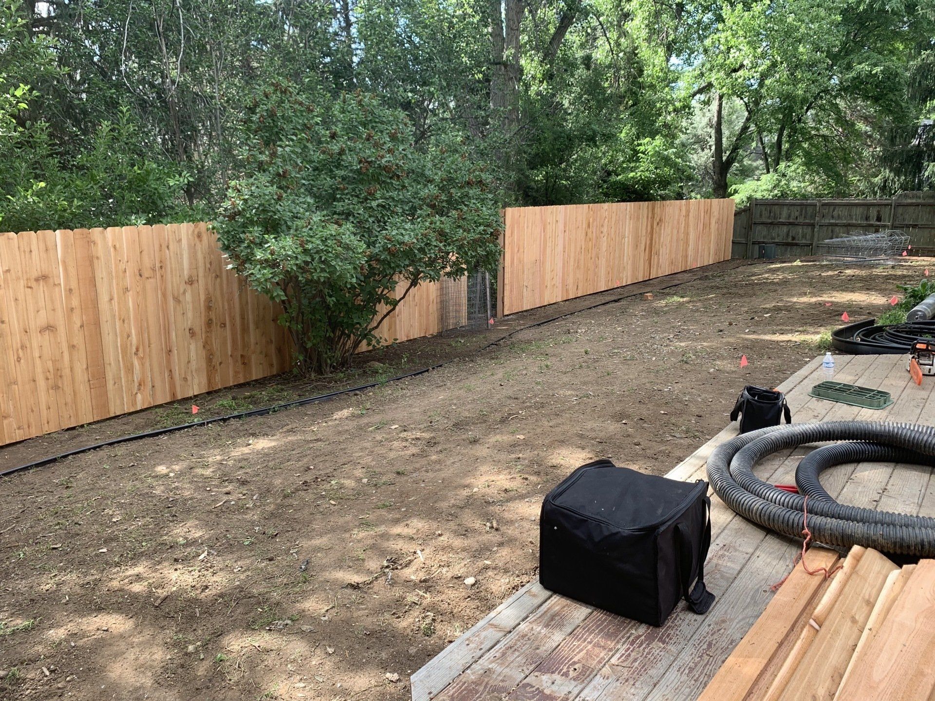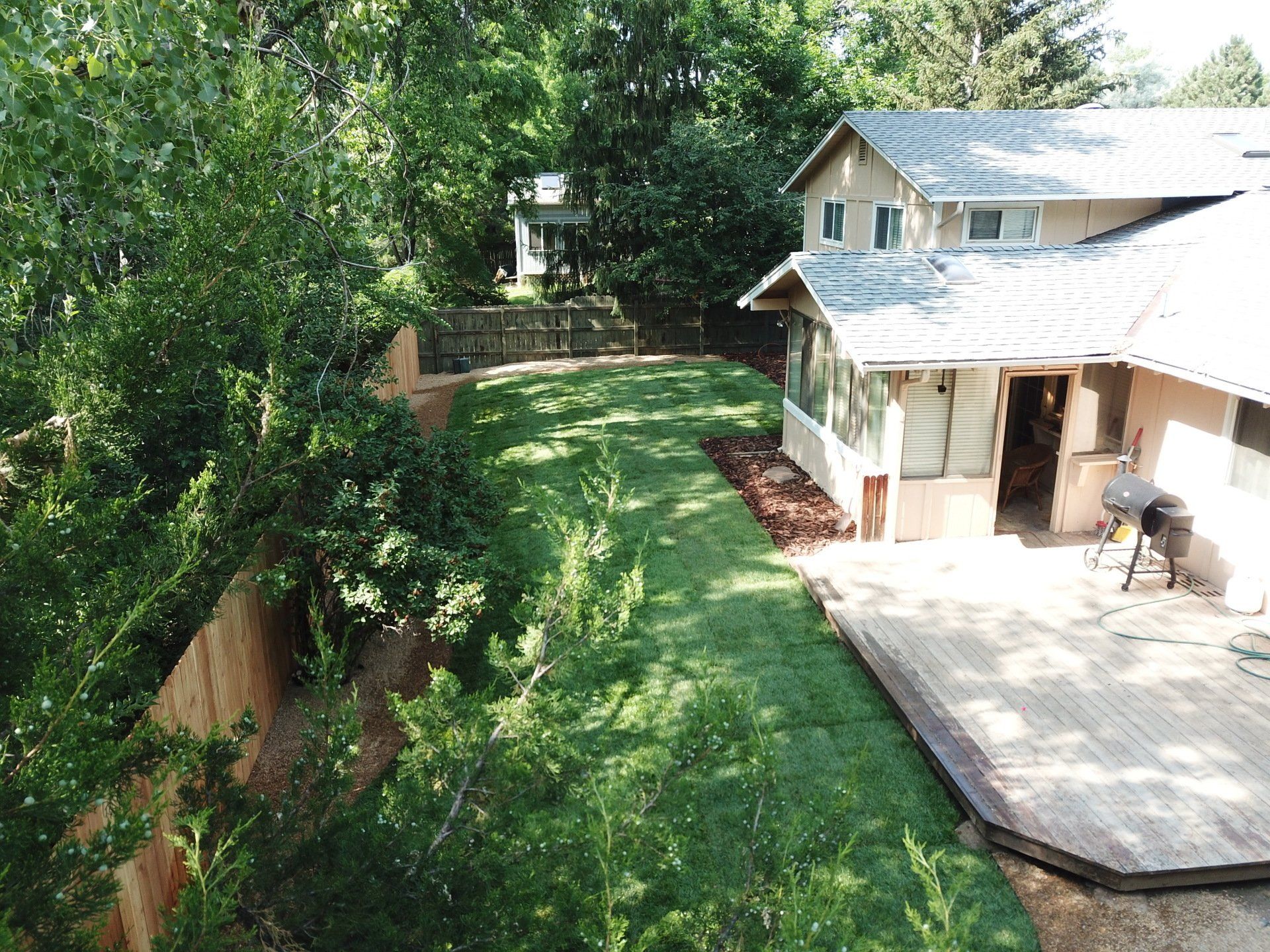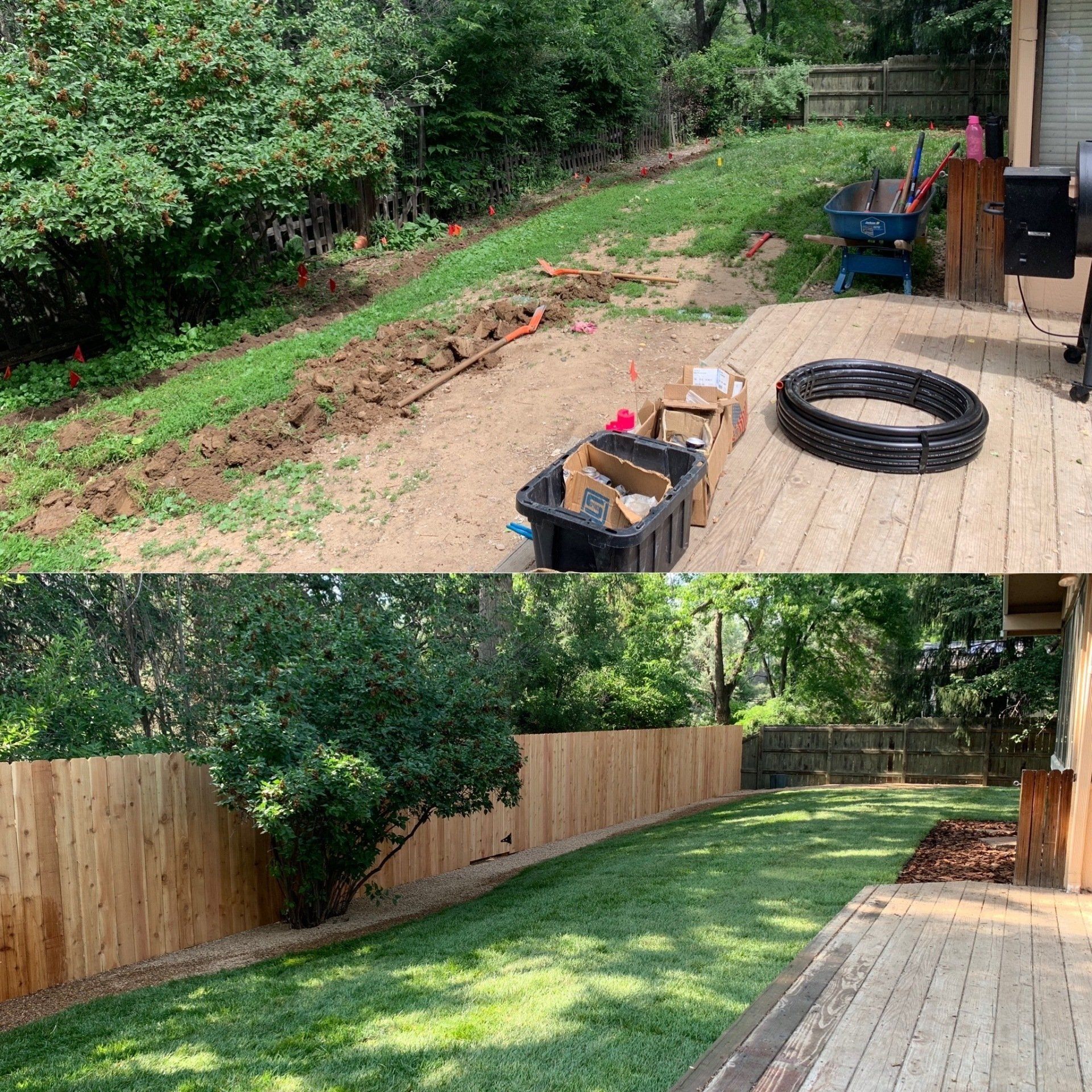 Backyard requiring upgrades due to pets and neglect. Quality cedar fence built with pea gravel, Kentucky bluegrass, and