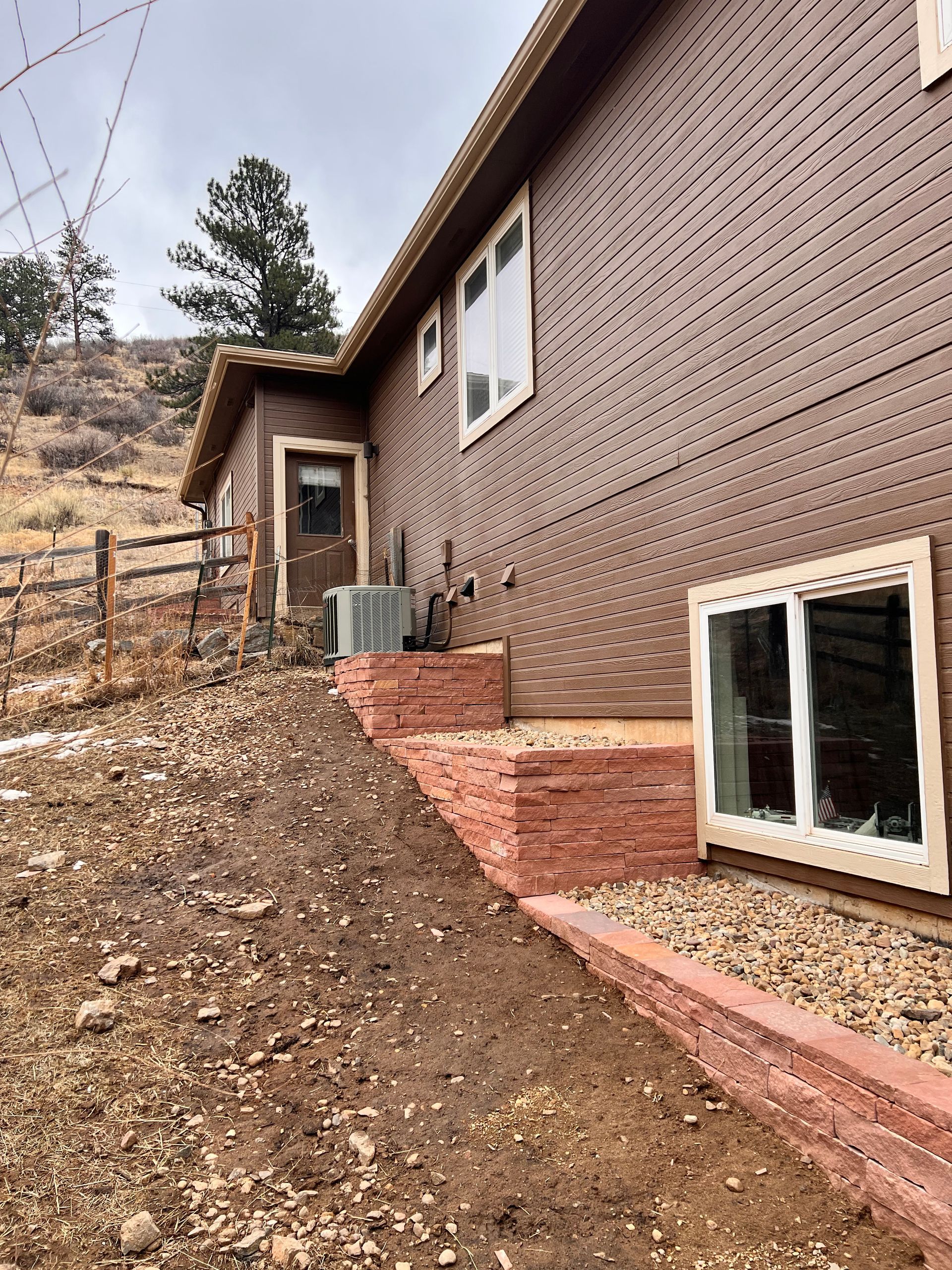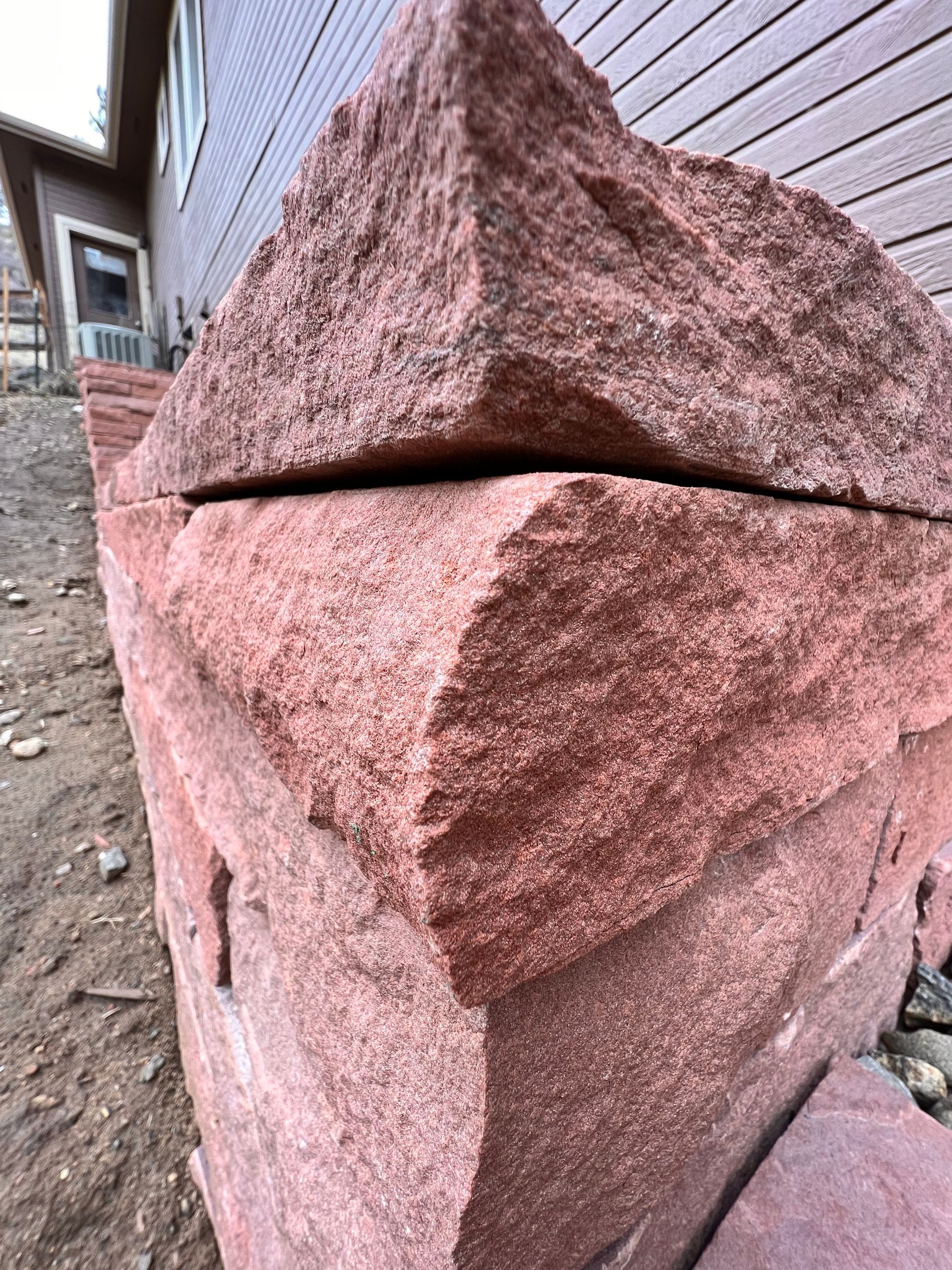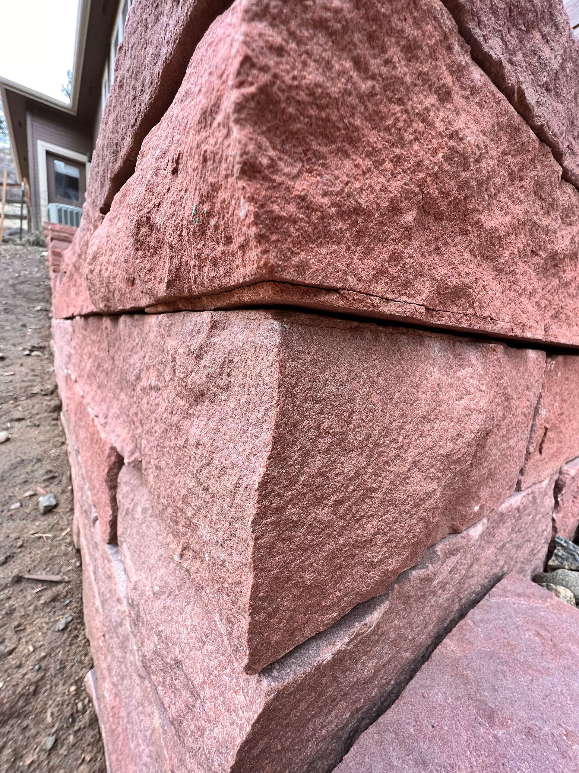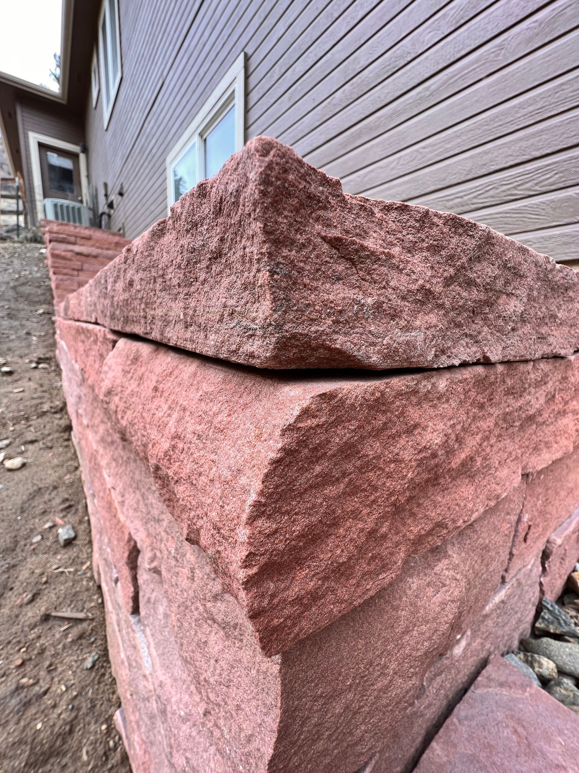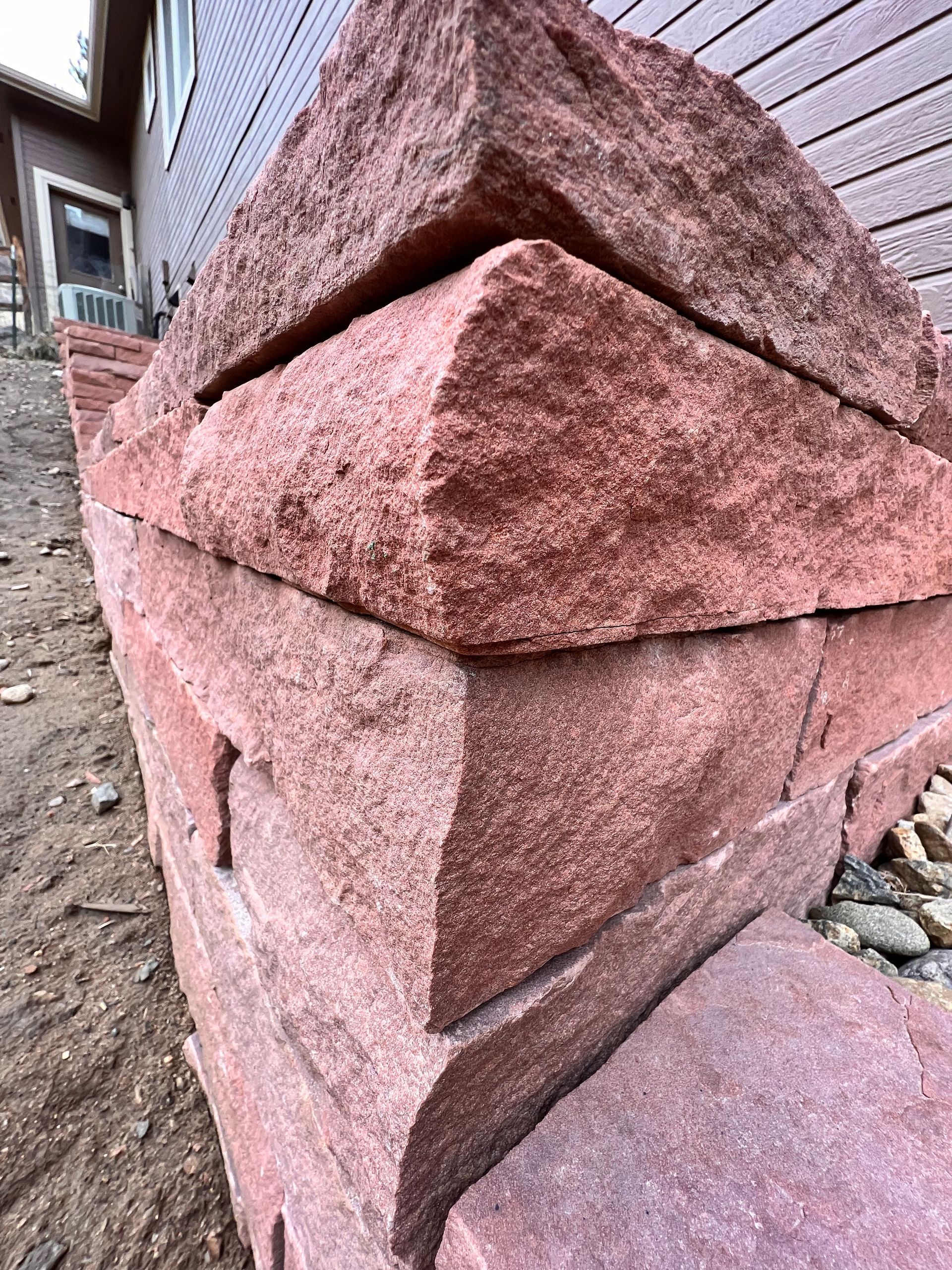 As part of fire mitigation work, Colorado red stripstone dry stacked 3' away from entire house with river rock in new beds. Boulder retaining wall also. Lyons, CO 2022
