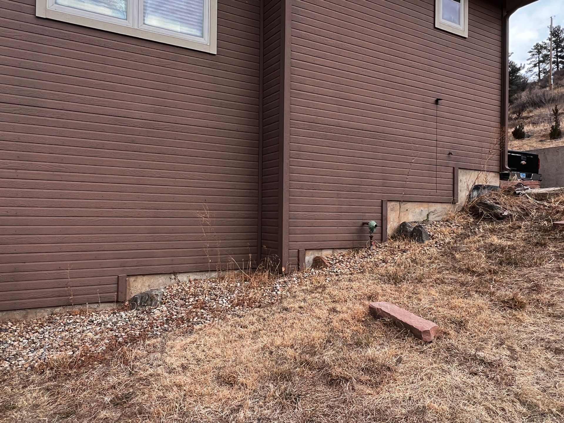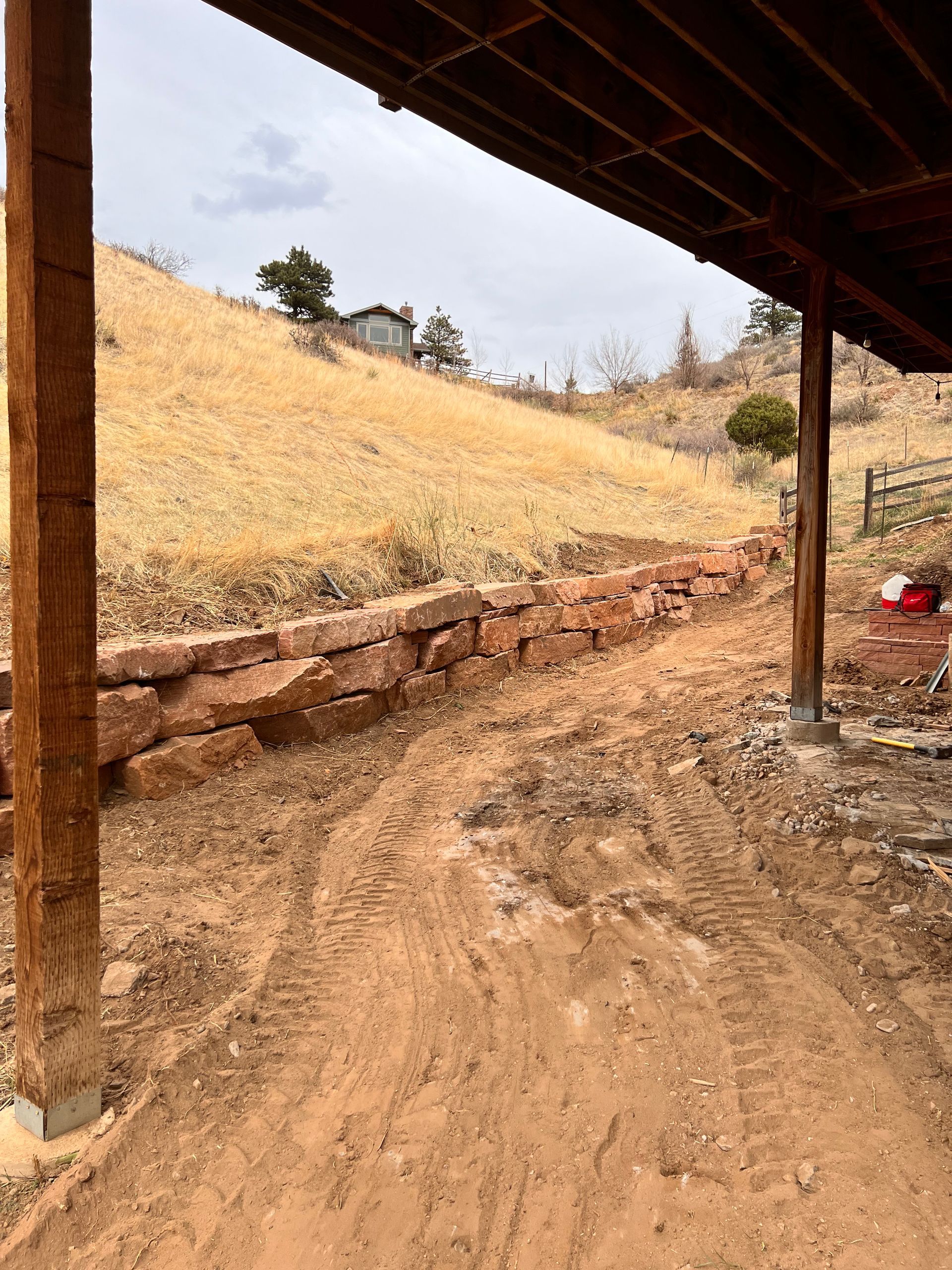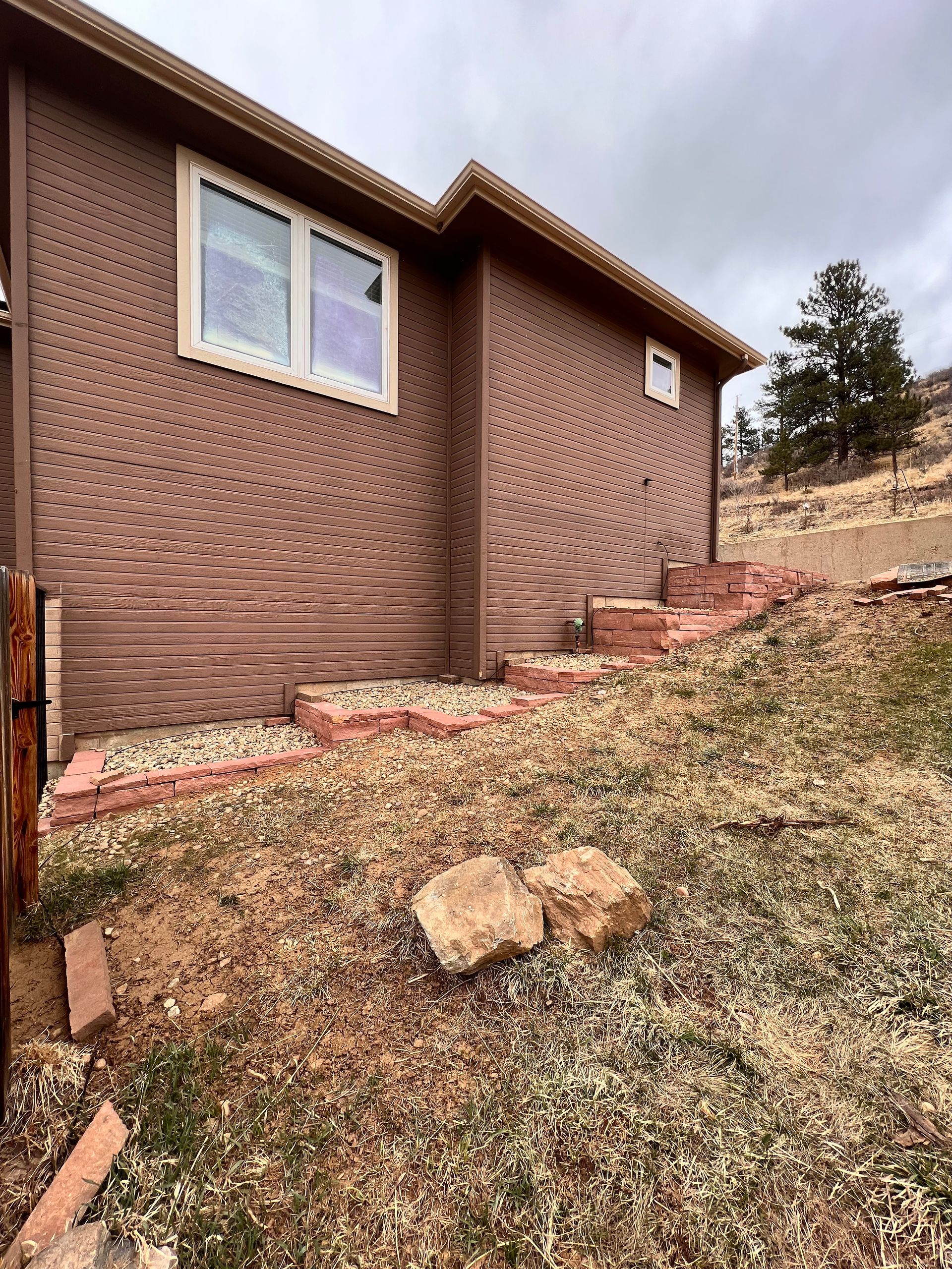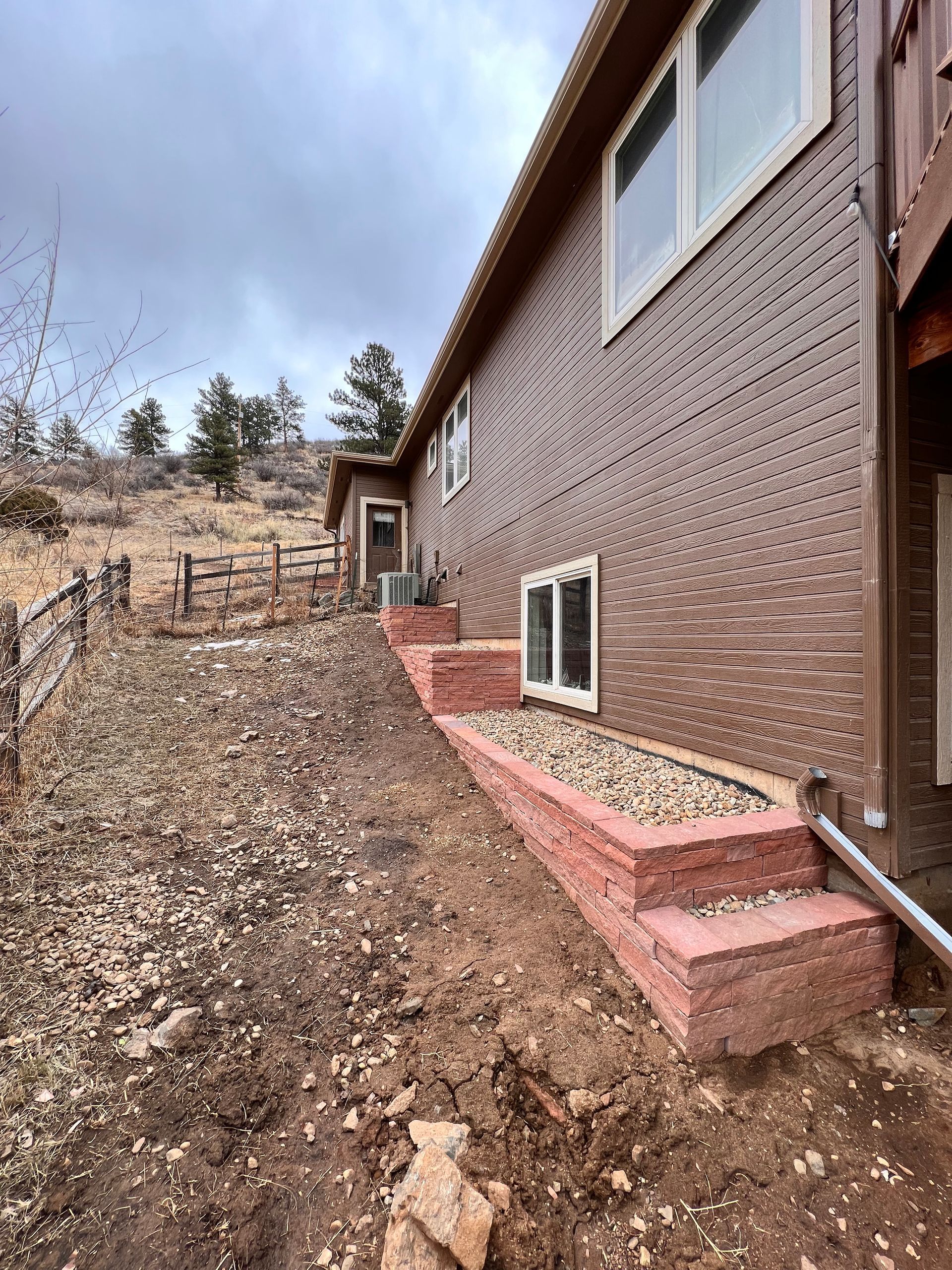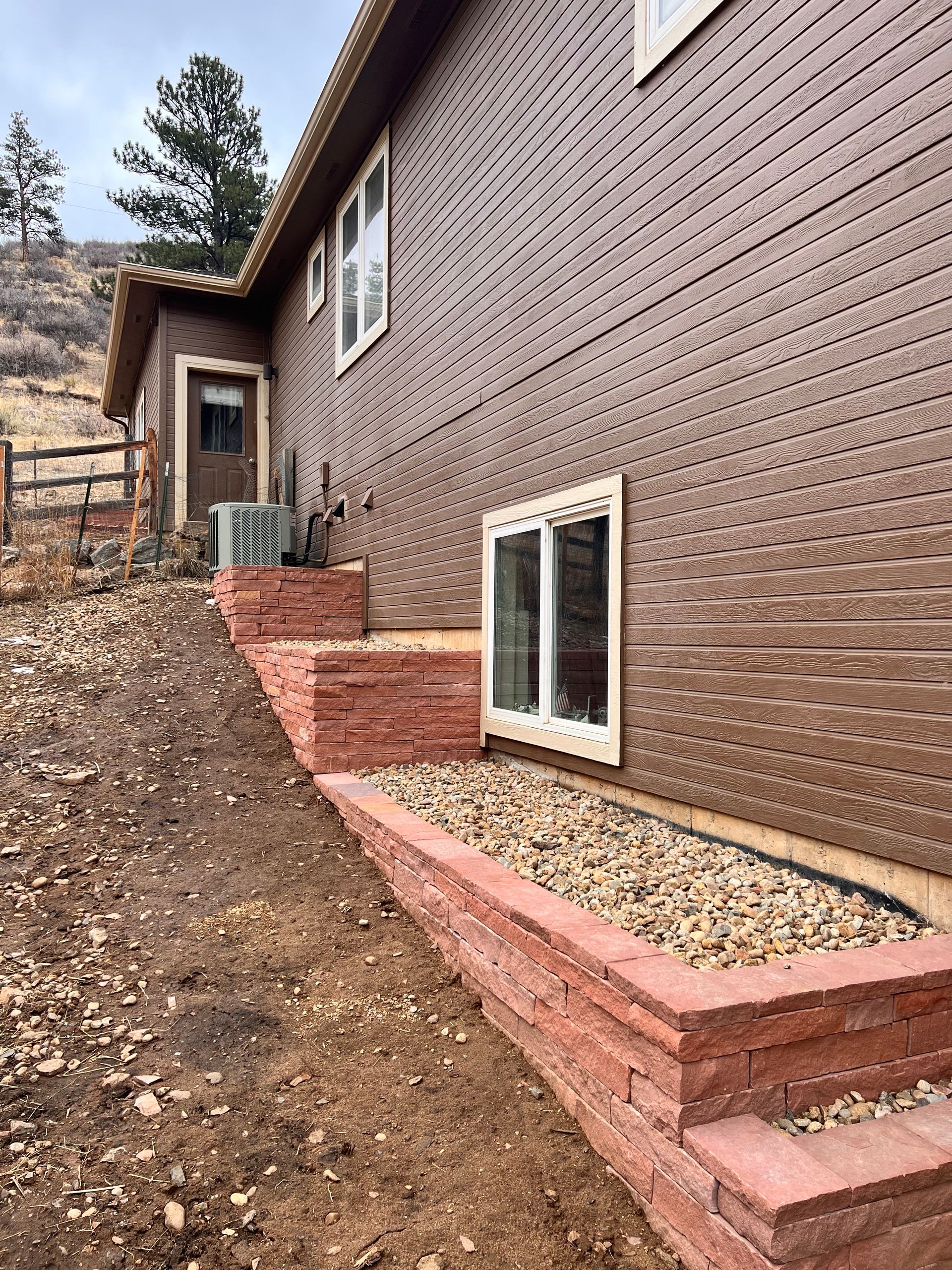 As part of fire mitigation work, Colorado red stripstone dry stacked 3' away from entire house with river rock in new beds. Boulder retaining wall also. Lyons, CO 2022