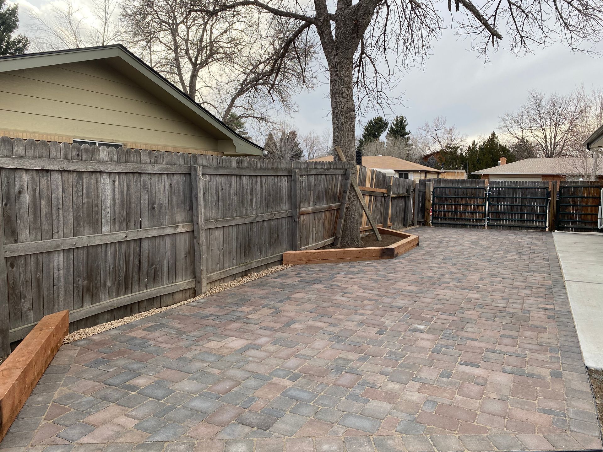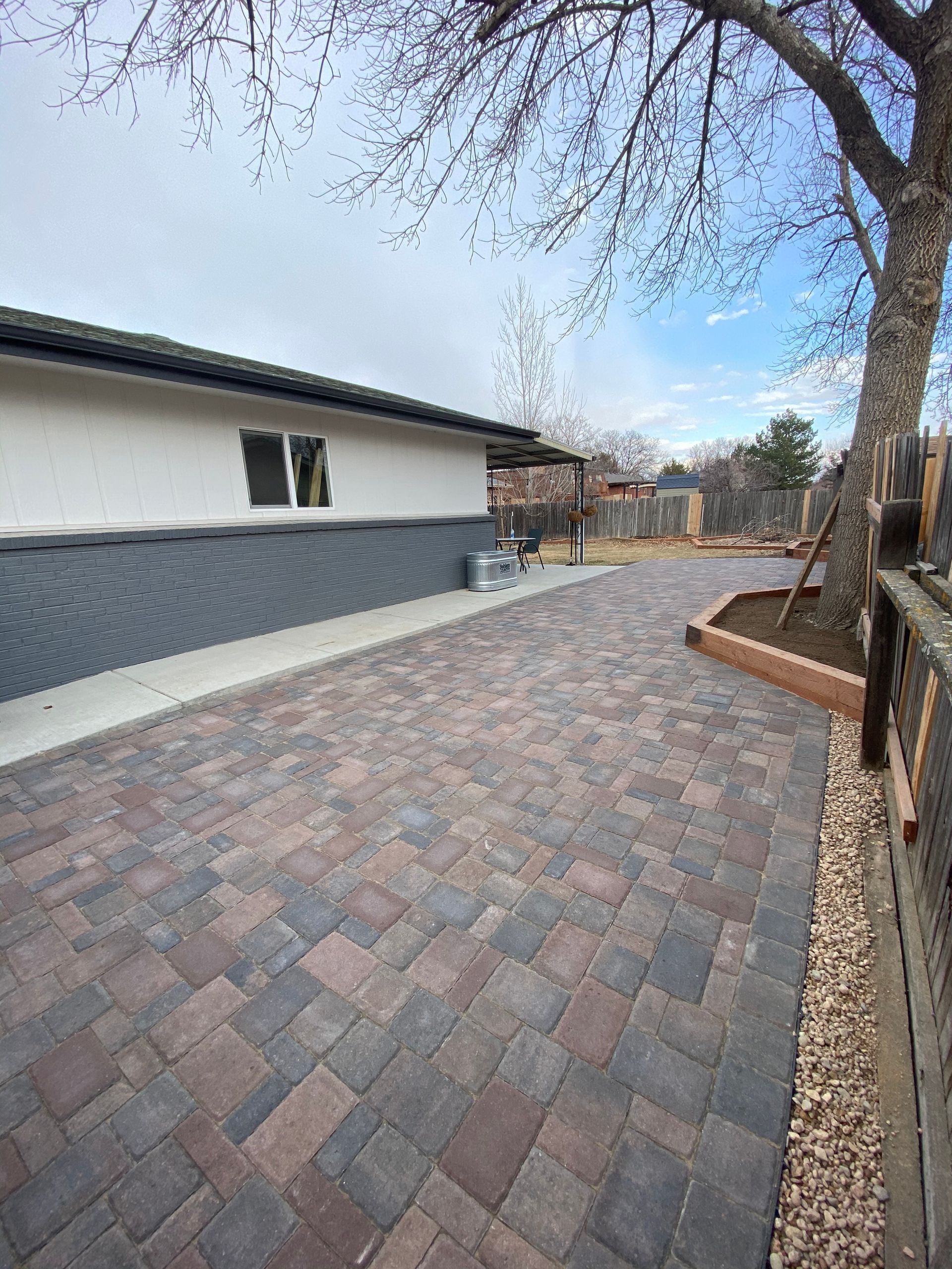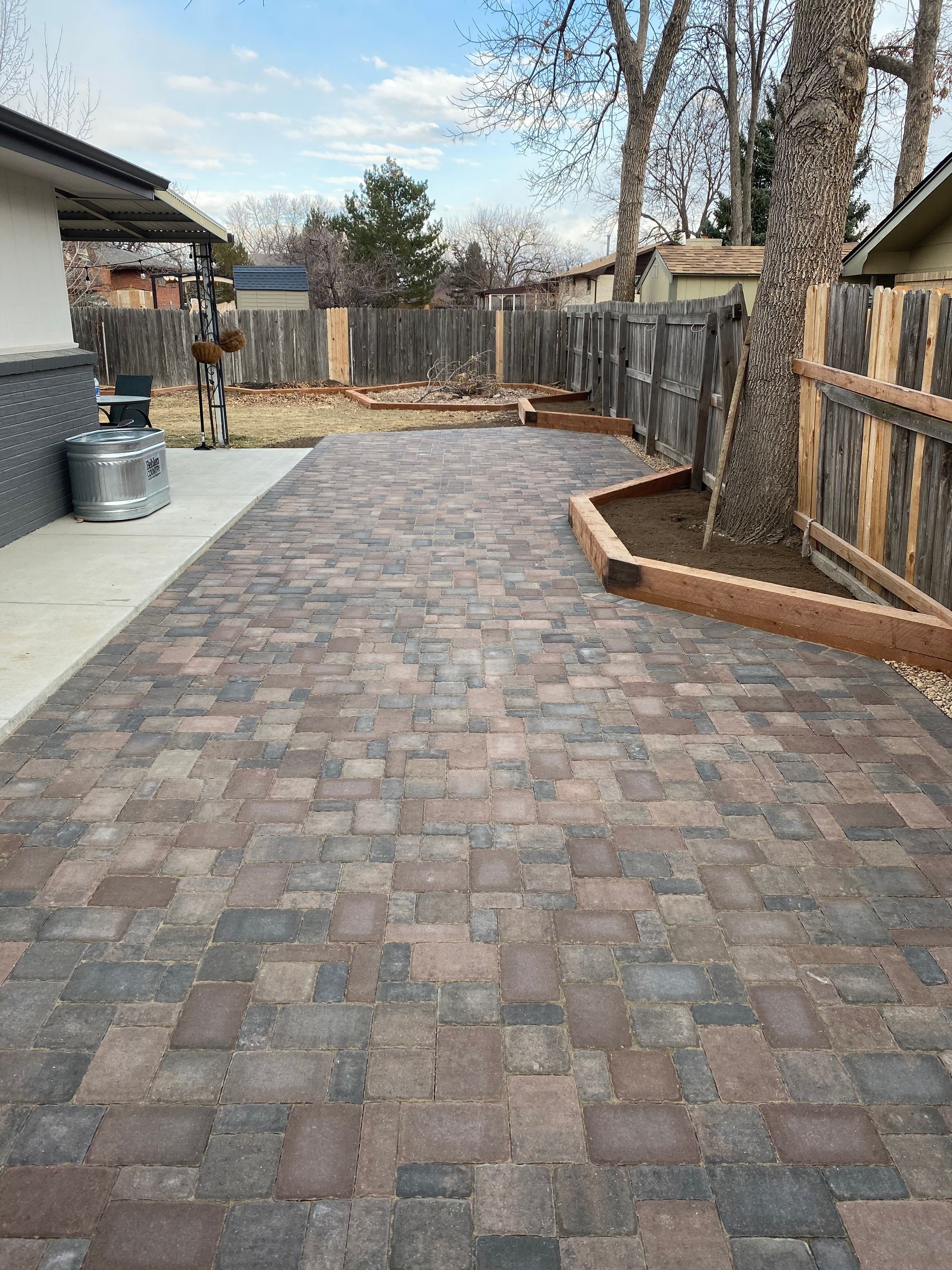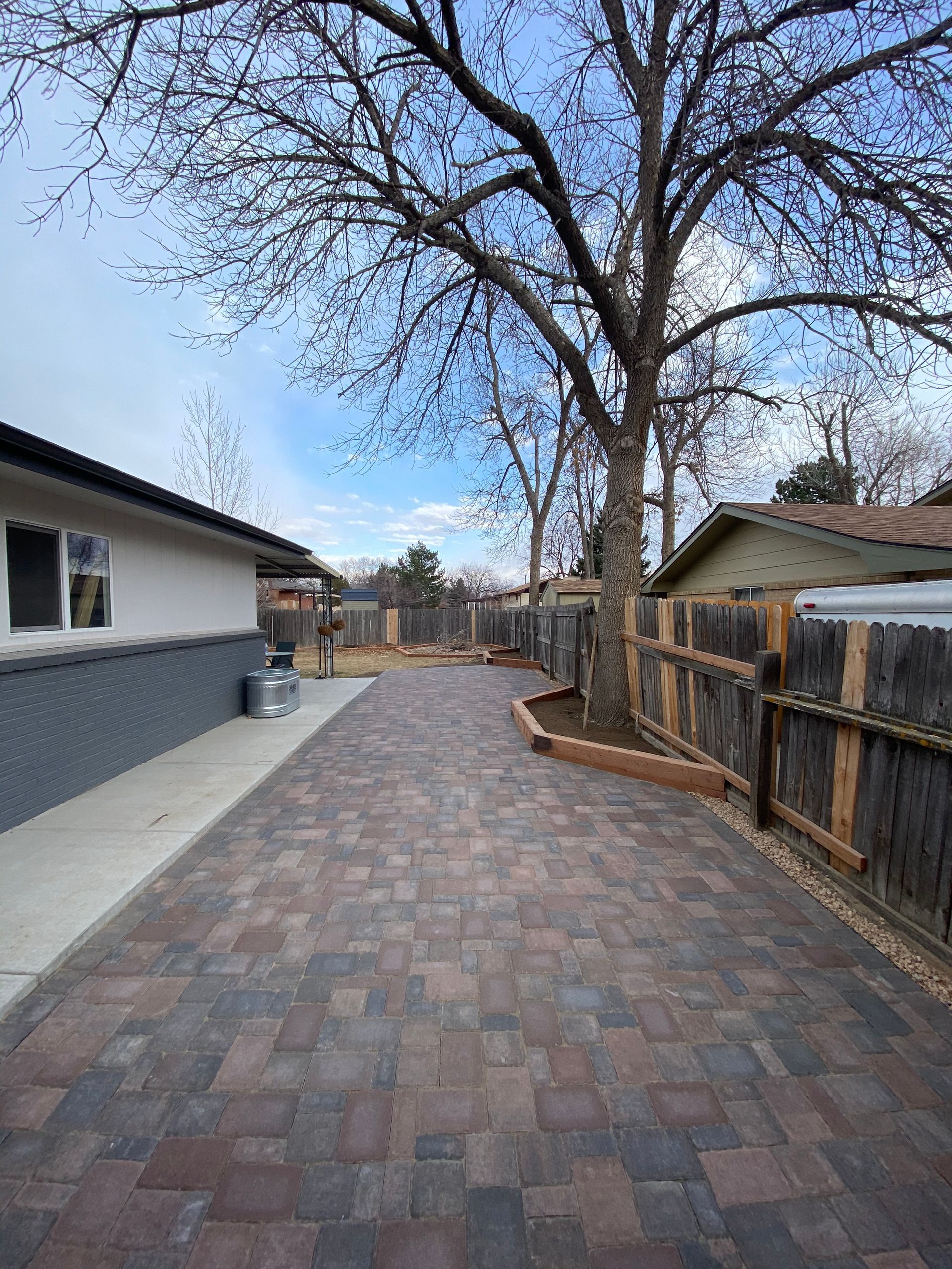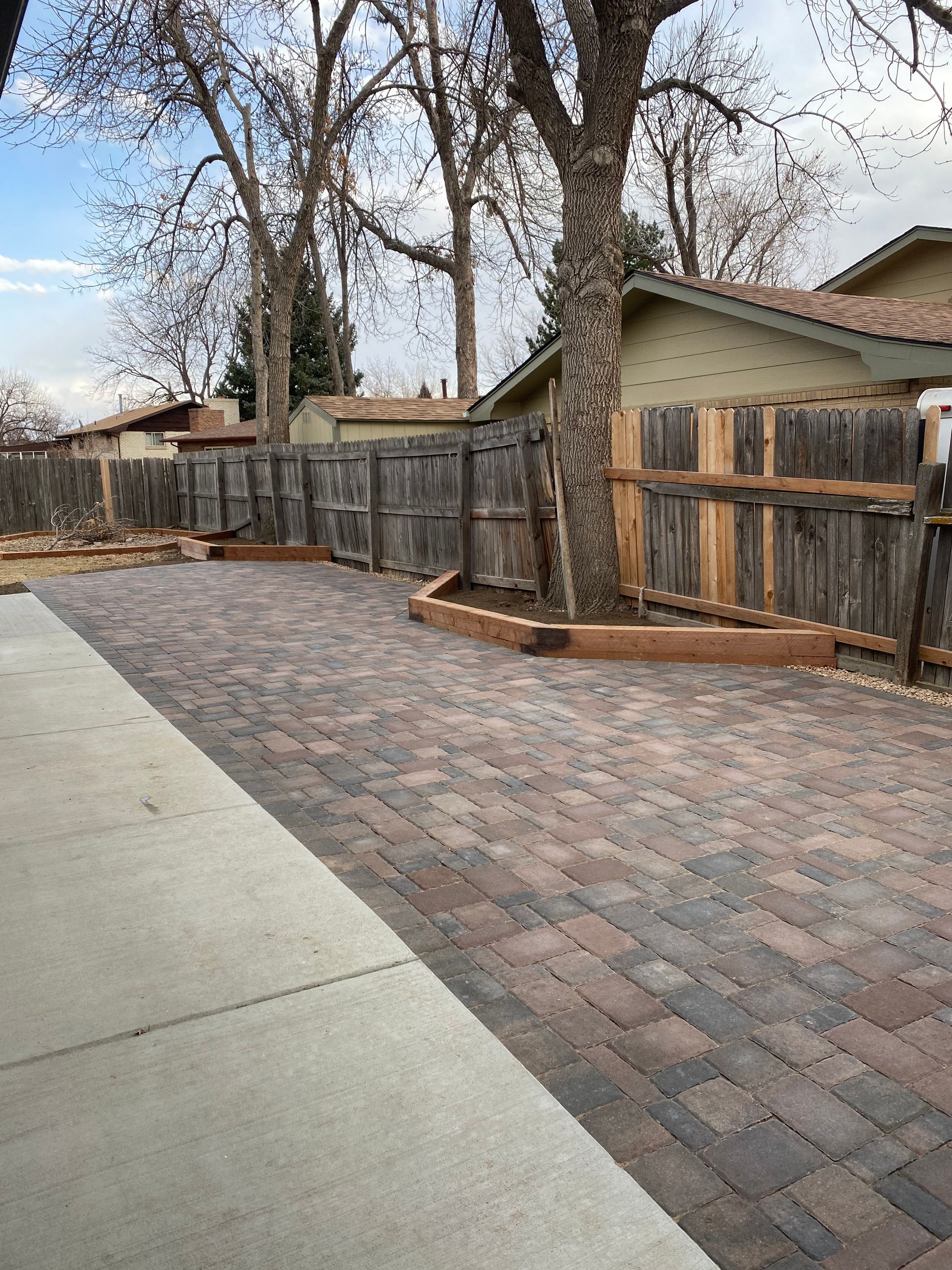 Install of paver patio and driveway that could be used for vehicular use. Planting boxes around trees using pine timbers. Planting and amending of soil areas in front yard. Longmont, CO 2021 & 2022